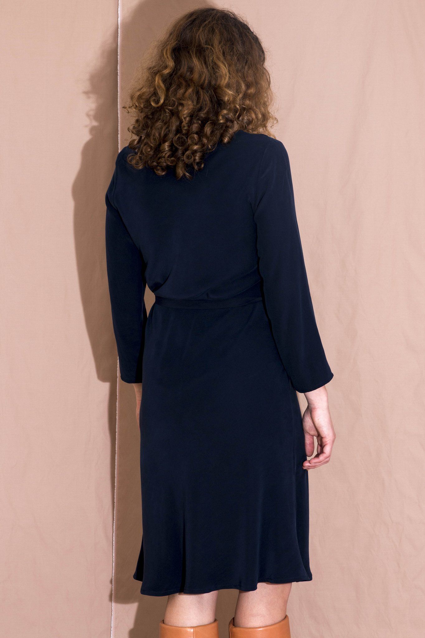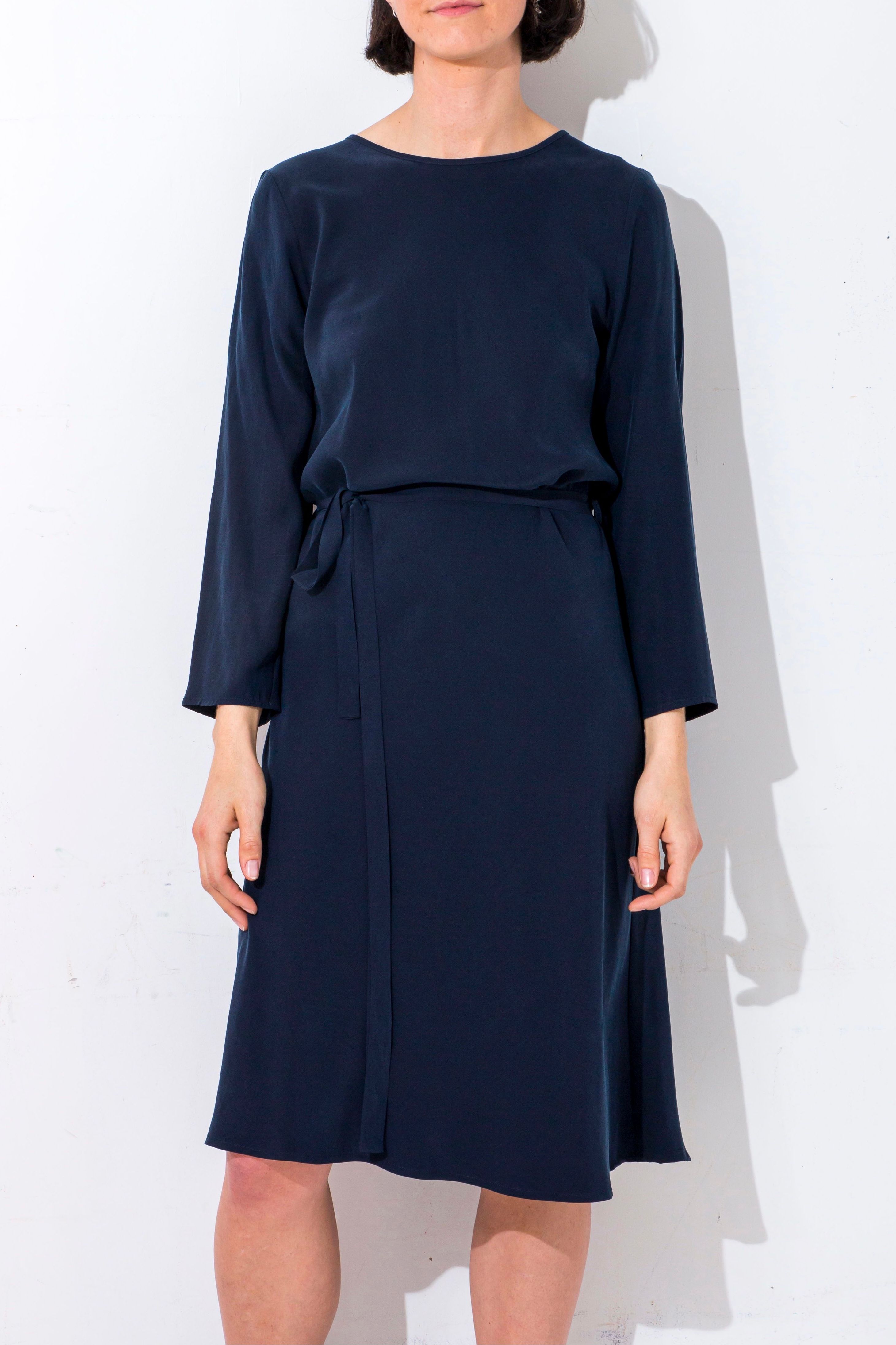 Bias cut Bound neck and tie that sits on natural waistline Dress finishes at the knee Sleeves finish below the elbow