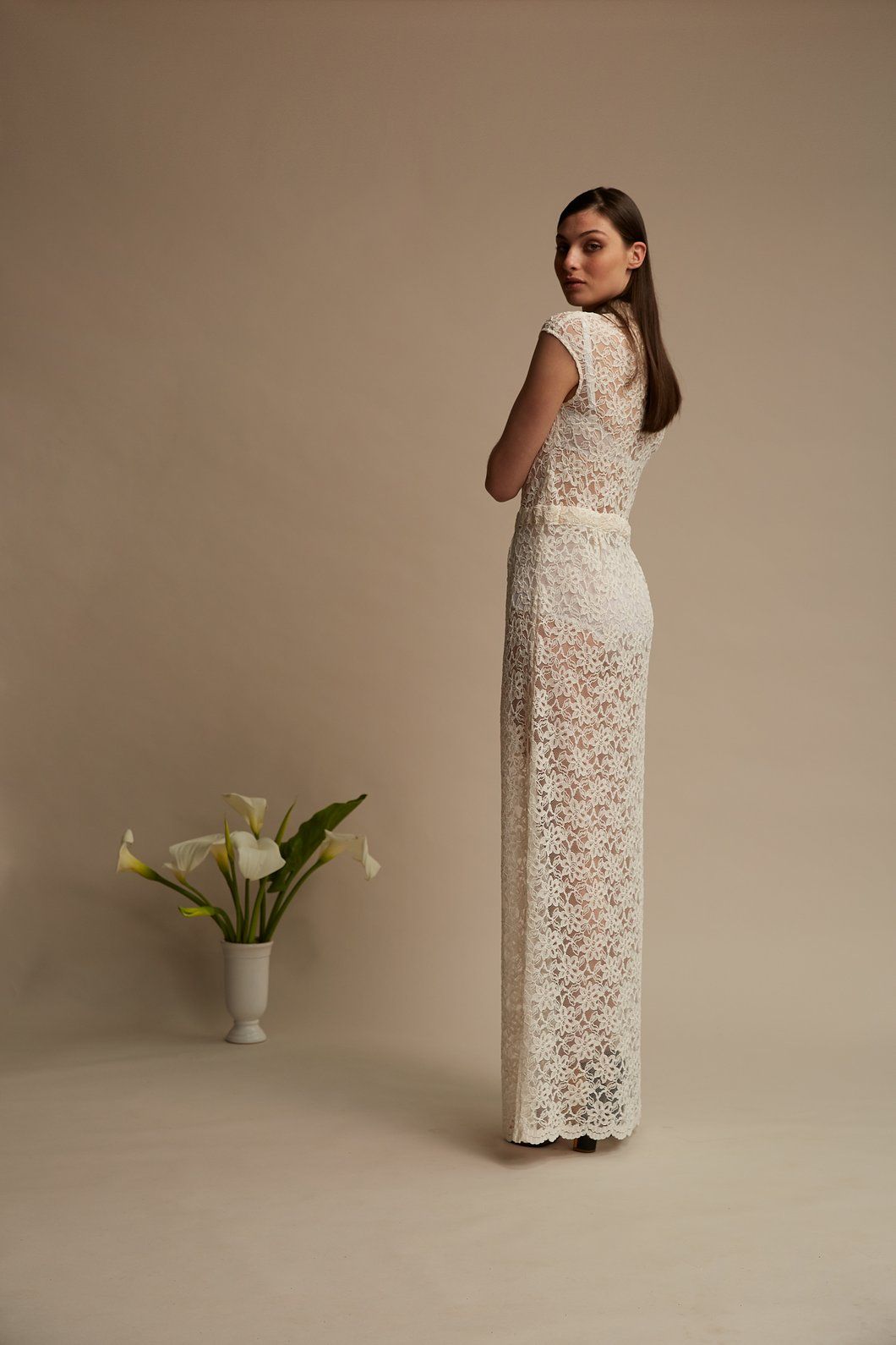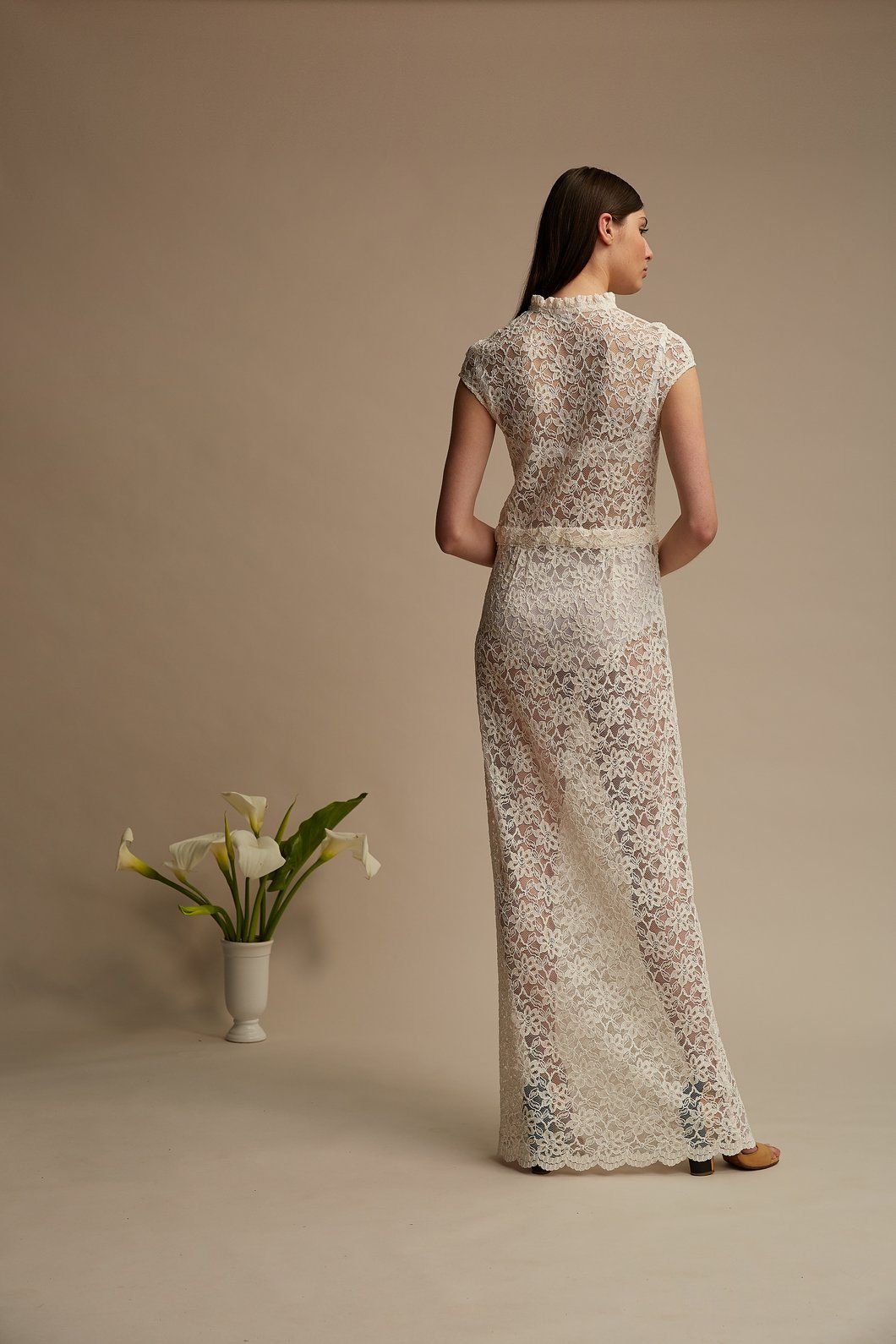 The Lilly Valley dress strikes the perfect balance of formality and ease. A delicate, softly gathered collar sits on the neck and ties to close leaving a keyhole detail. Cap sleeves hug the top of the shoulder. Draw cord through the waist can be pulled in to define, or be left loose and more relaxed. Skirt falls straight to the floor. Scalloped hem follows the natural shape of the lace.
