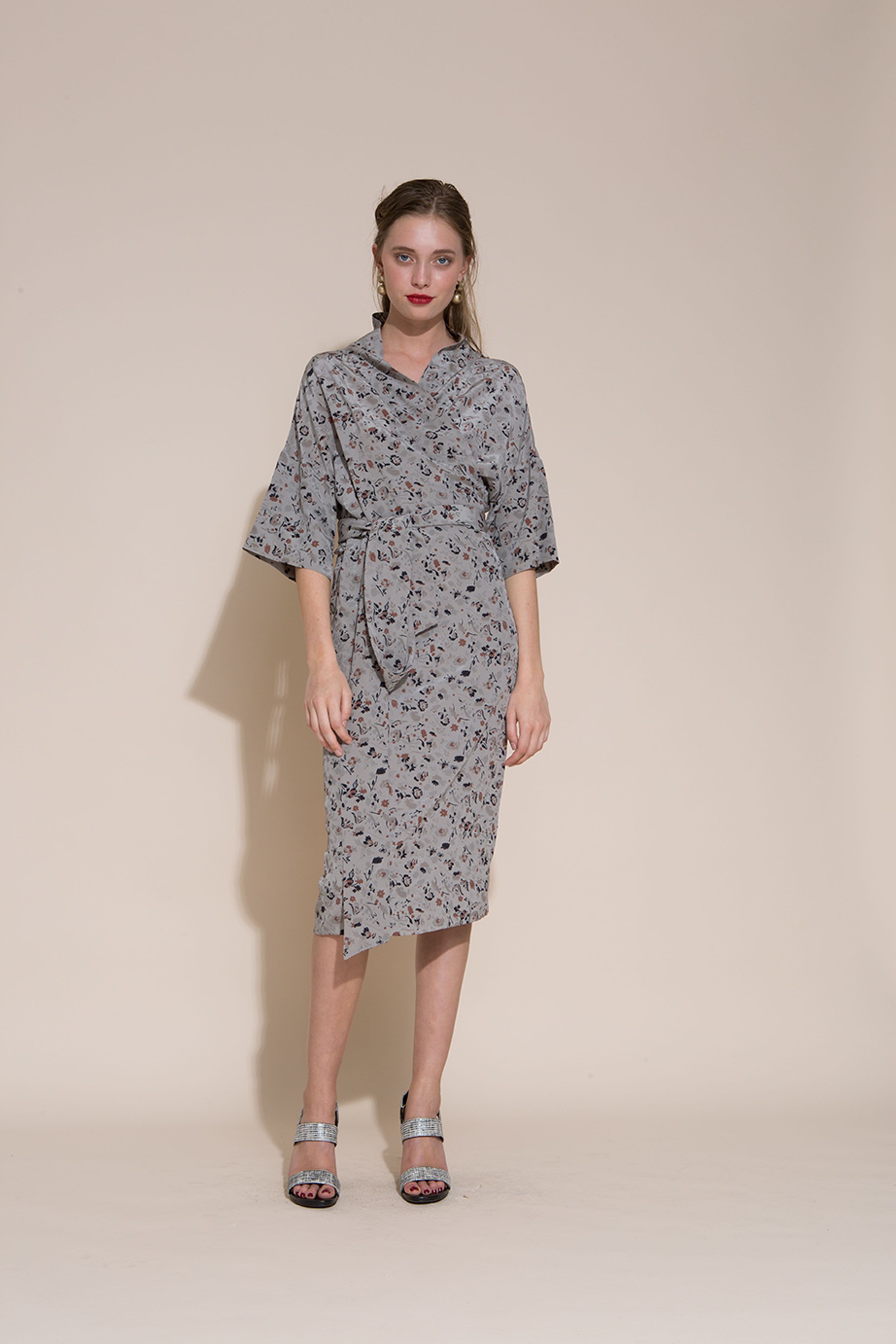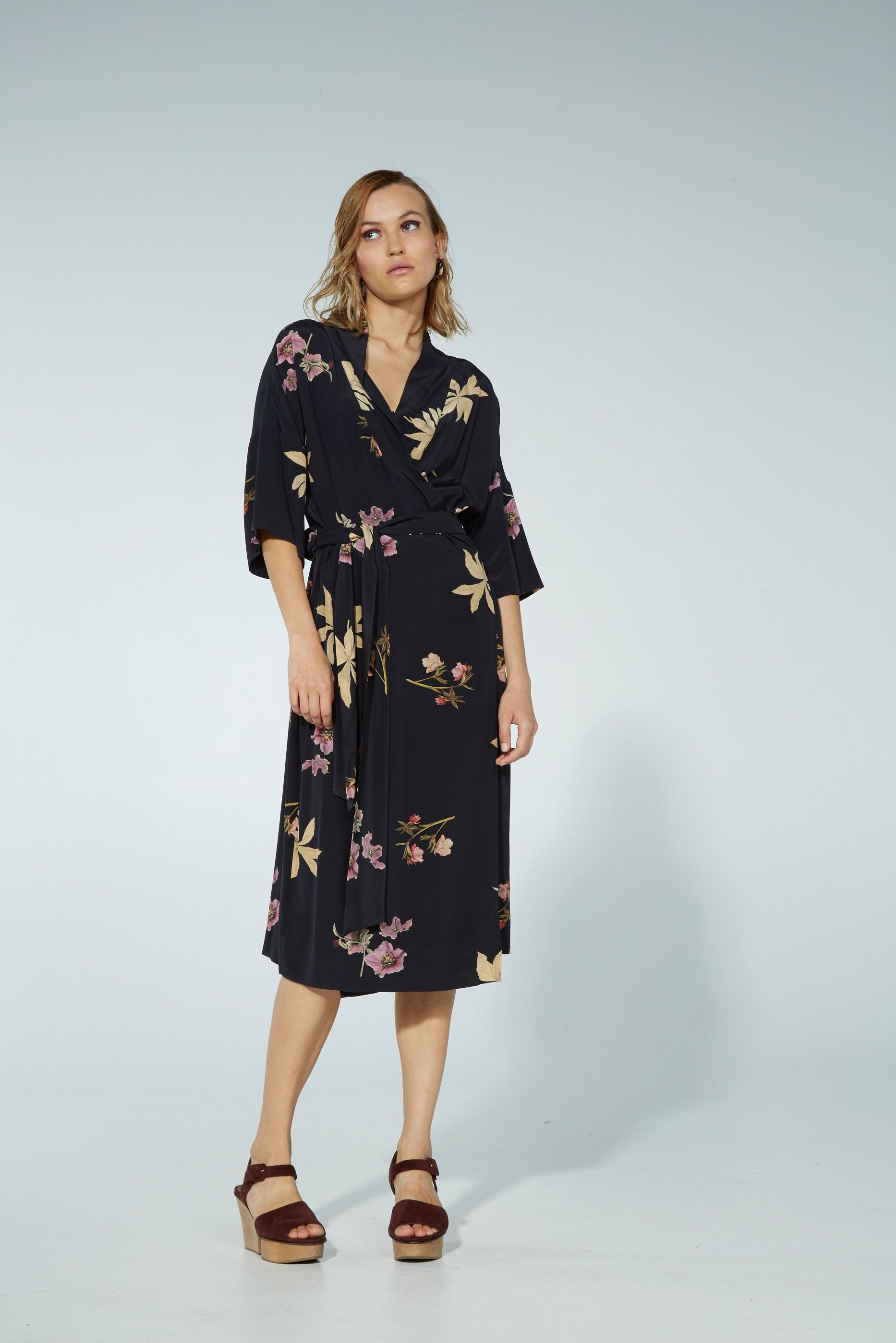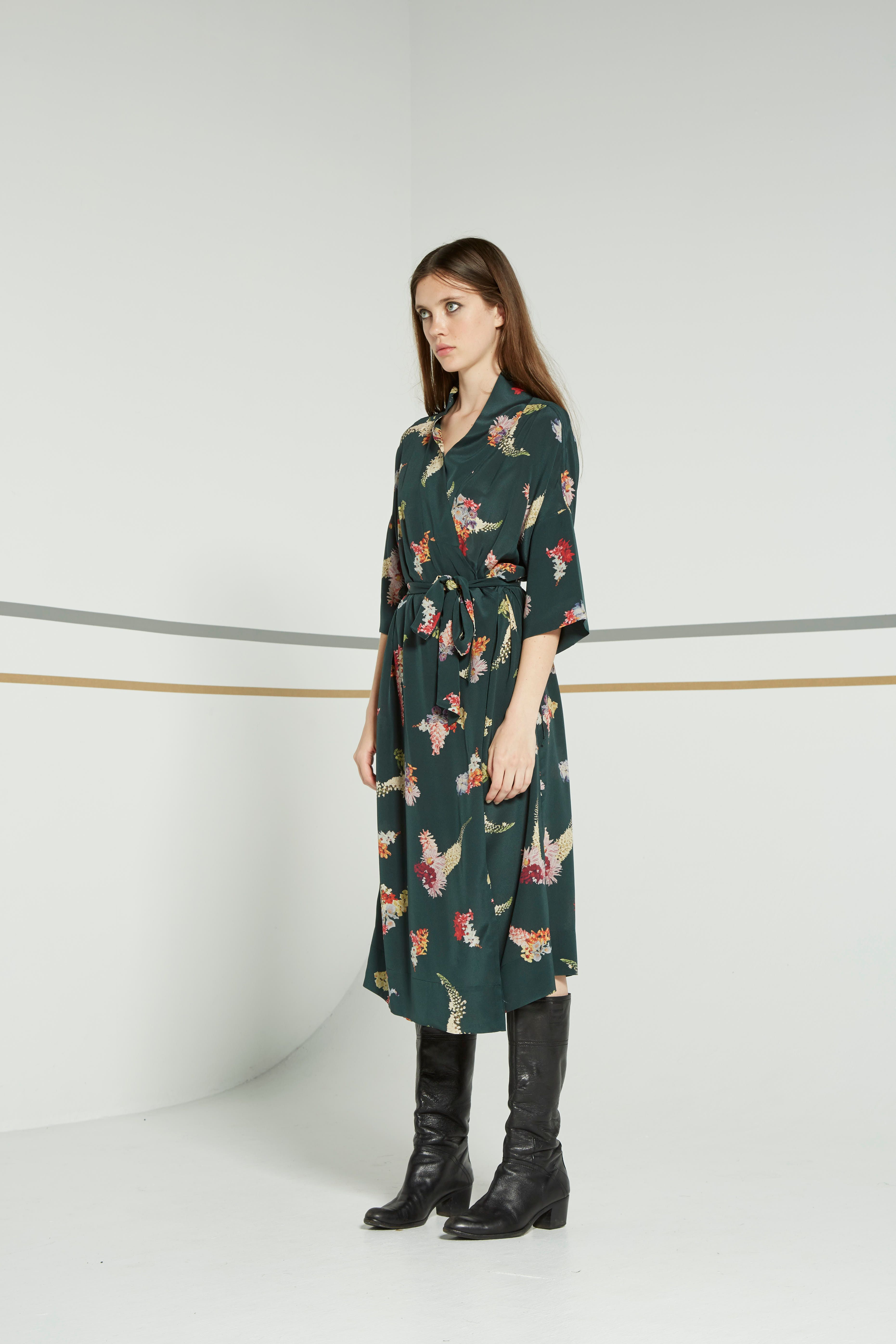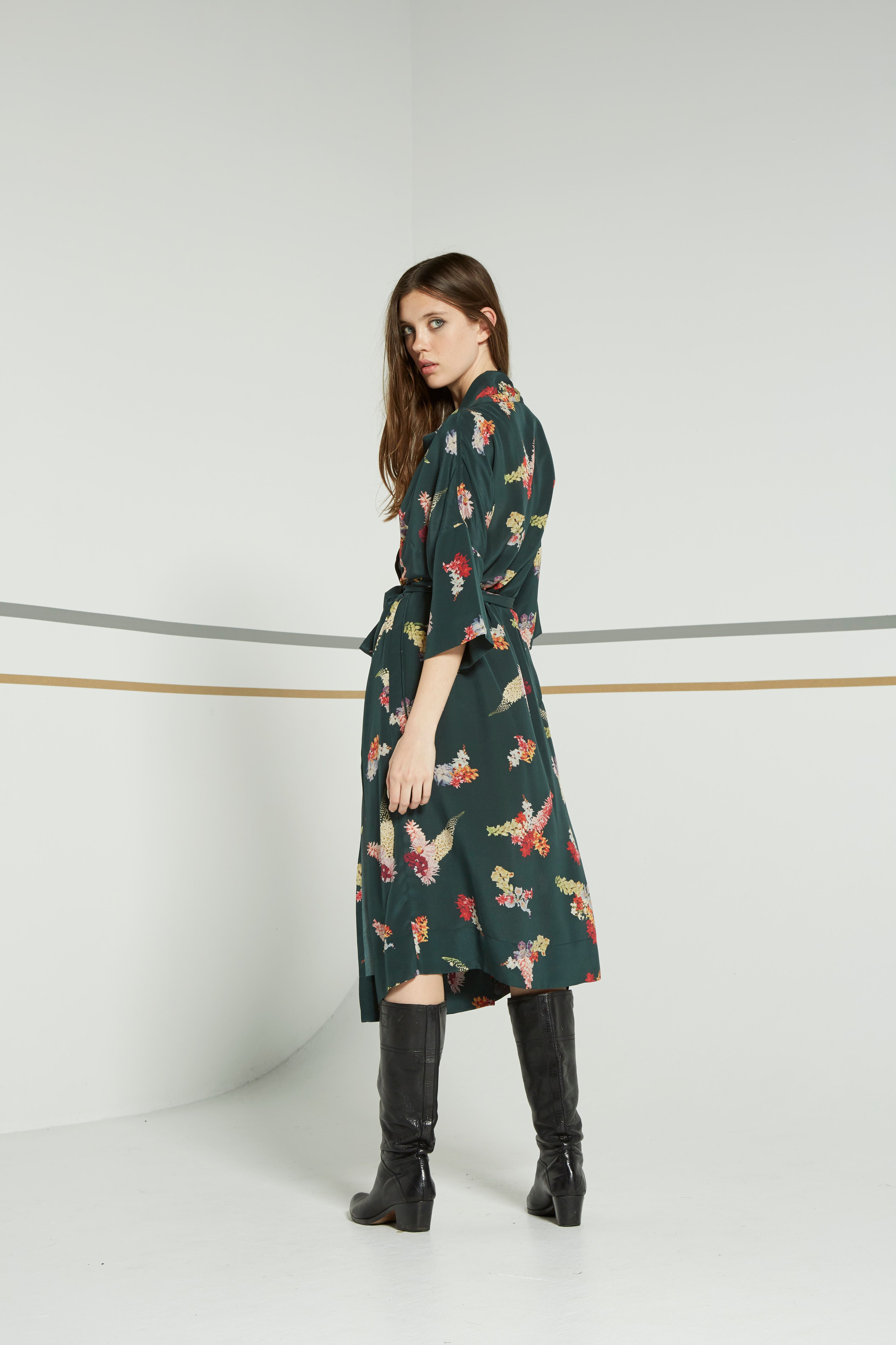 The relaxed one size Lilya dresscoat can be worn either wrapped softly across the body as a beautiful wrap dress or left open as a summer overcoat. Wide relaxed collar and a wide cuffed sleeves that reach just below the elbow. Tie at waist. Hem falls to under the knee.