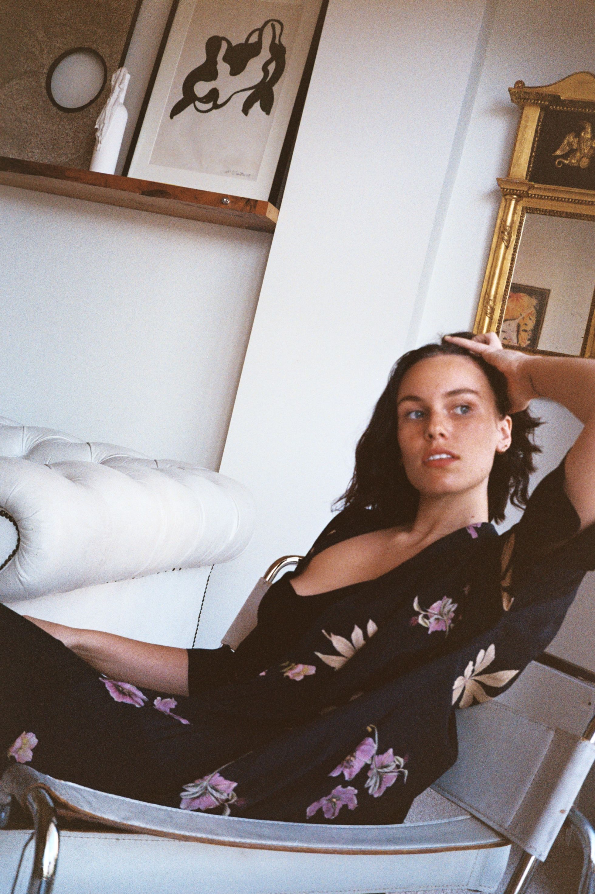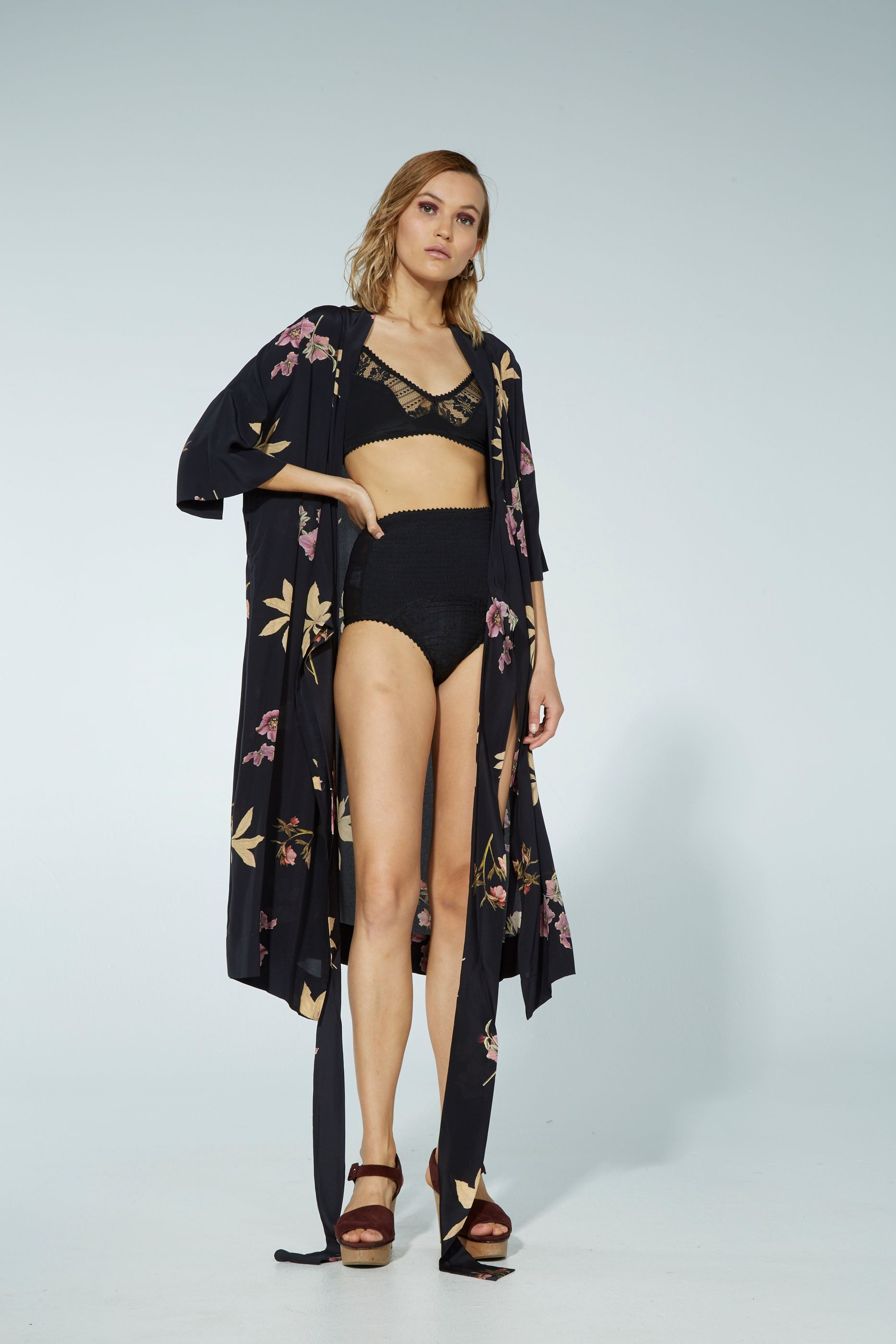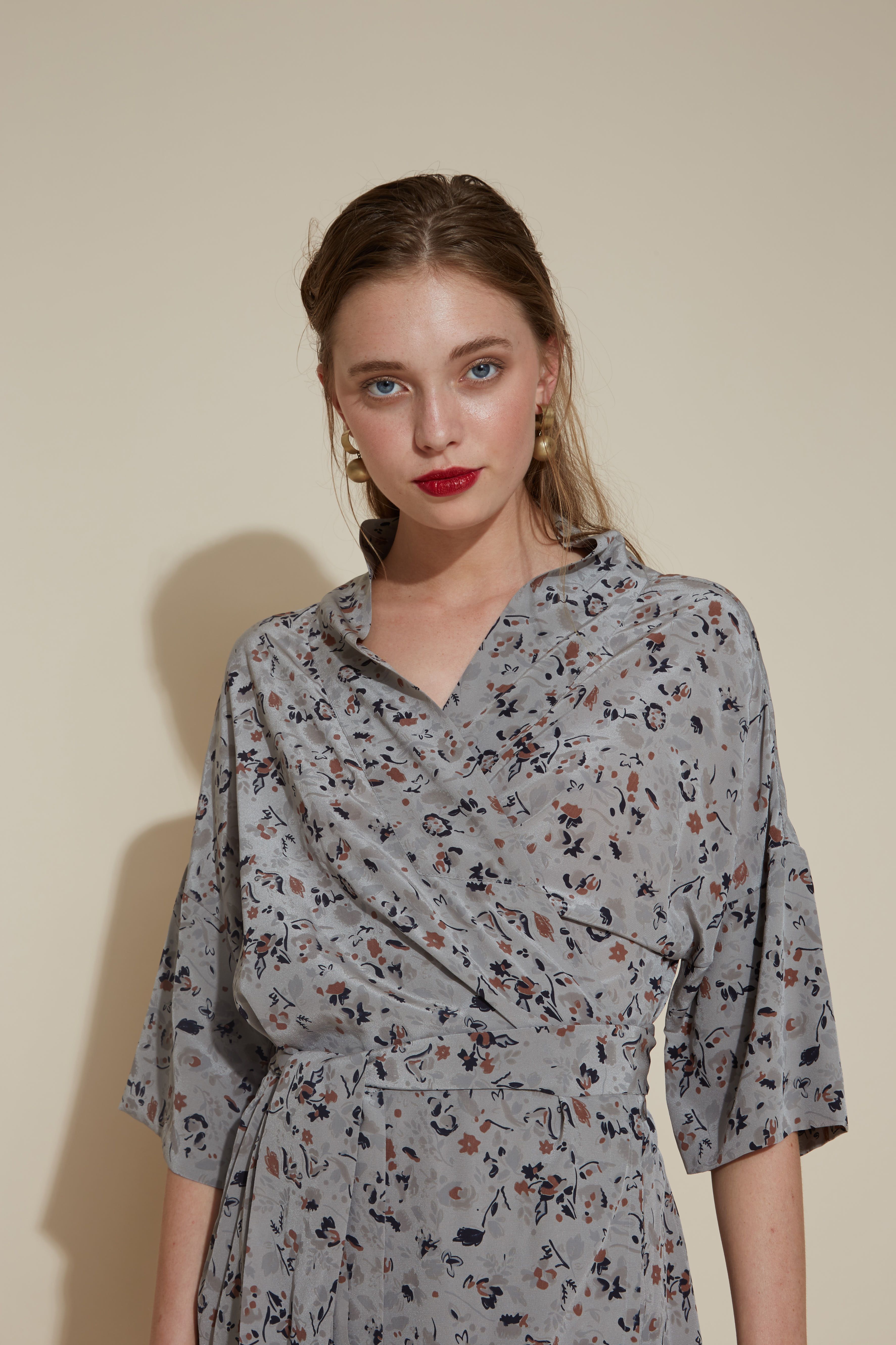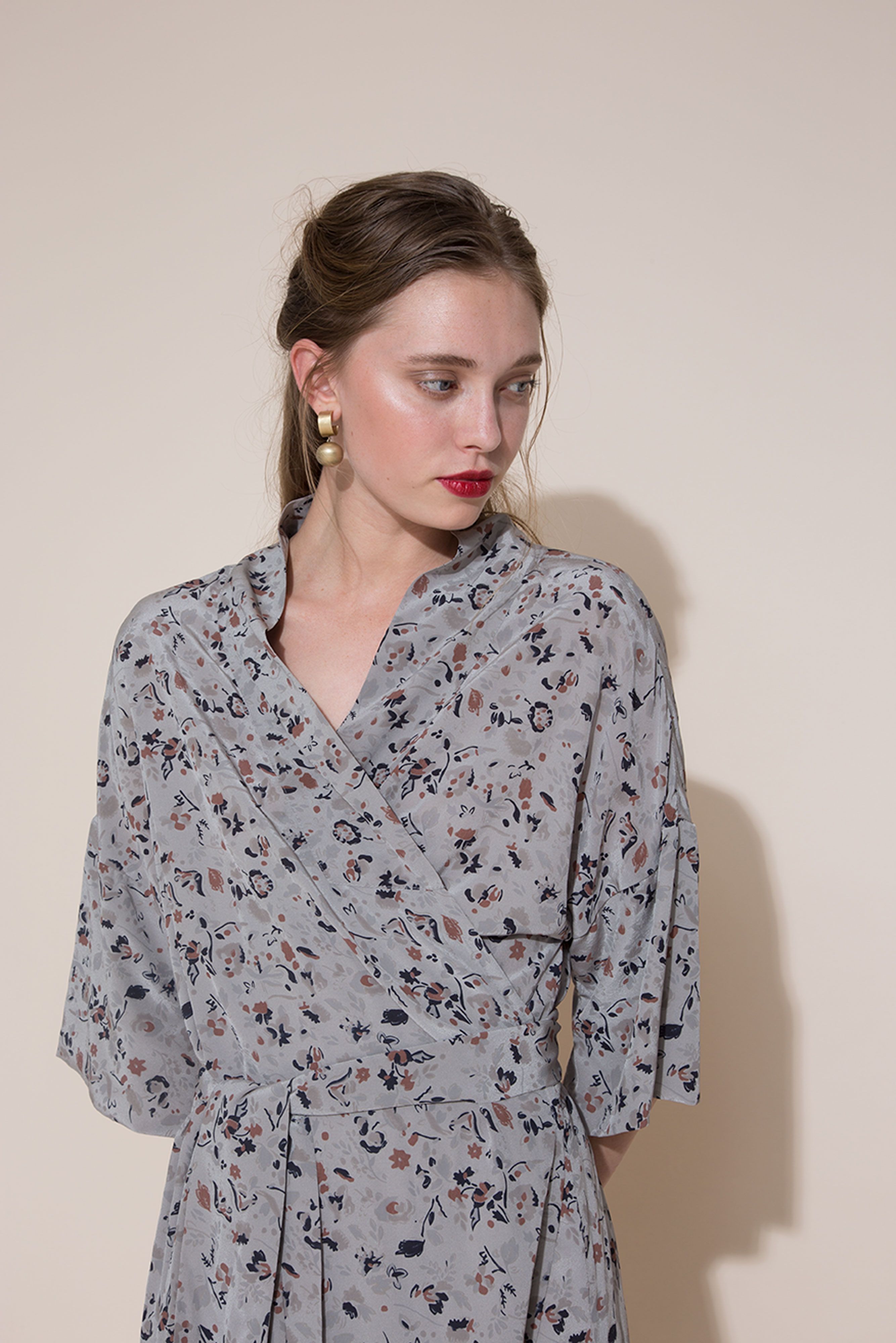 The relaxed one size Lilya dresscoat can be worn either wrapped softly across the body as a beautiful wrap dress or left open as a summer overcoat. Wide relaxed collar and a wide cuffed sleeves that reach just below the elbow. Tie at waist. Hem falls to under the knee.