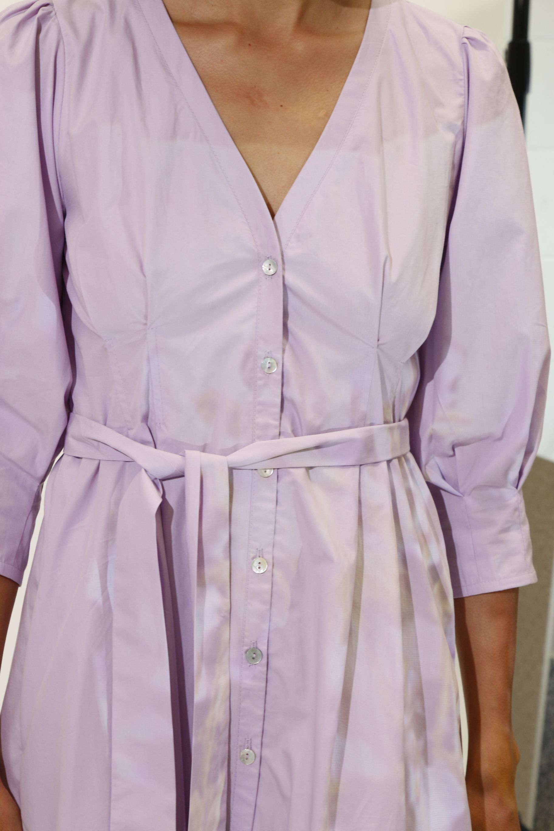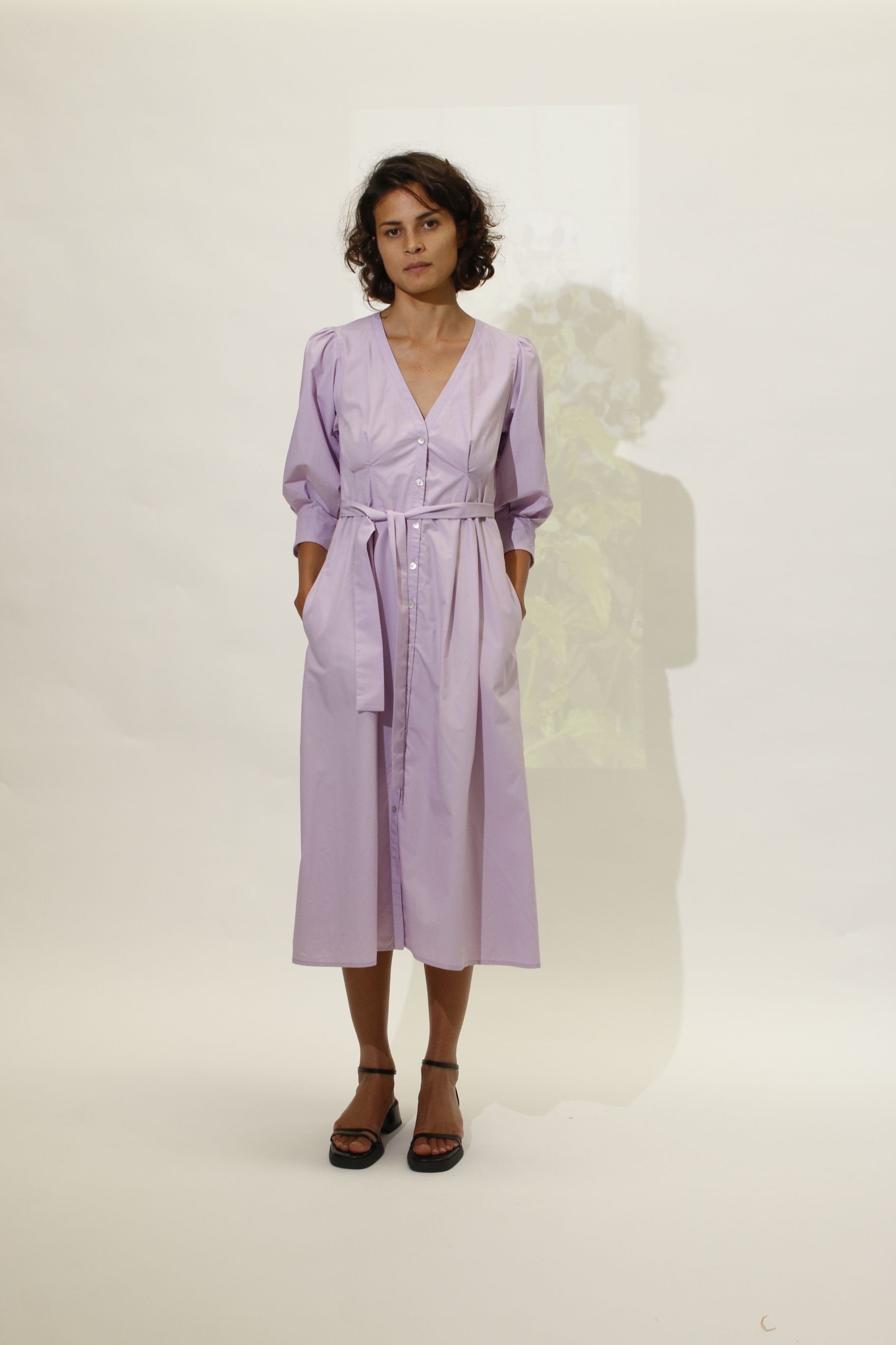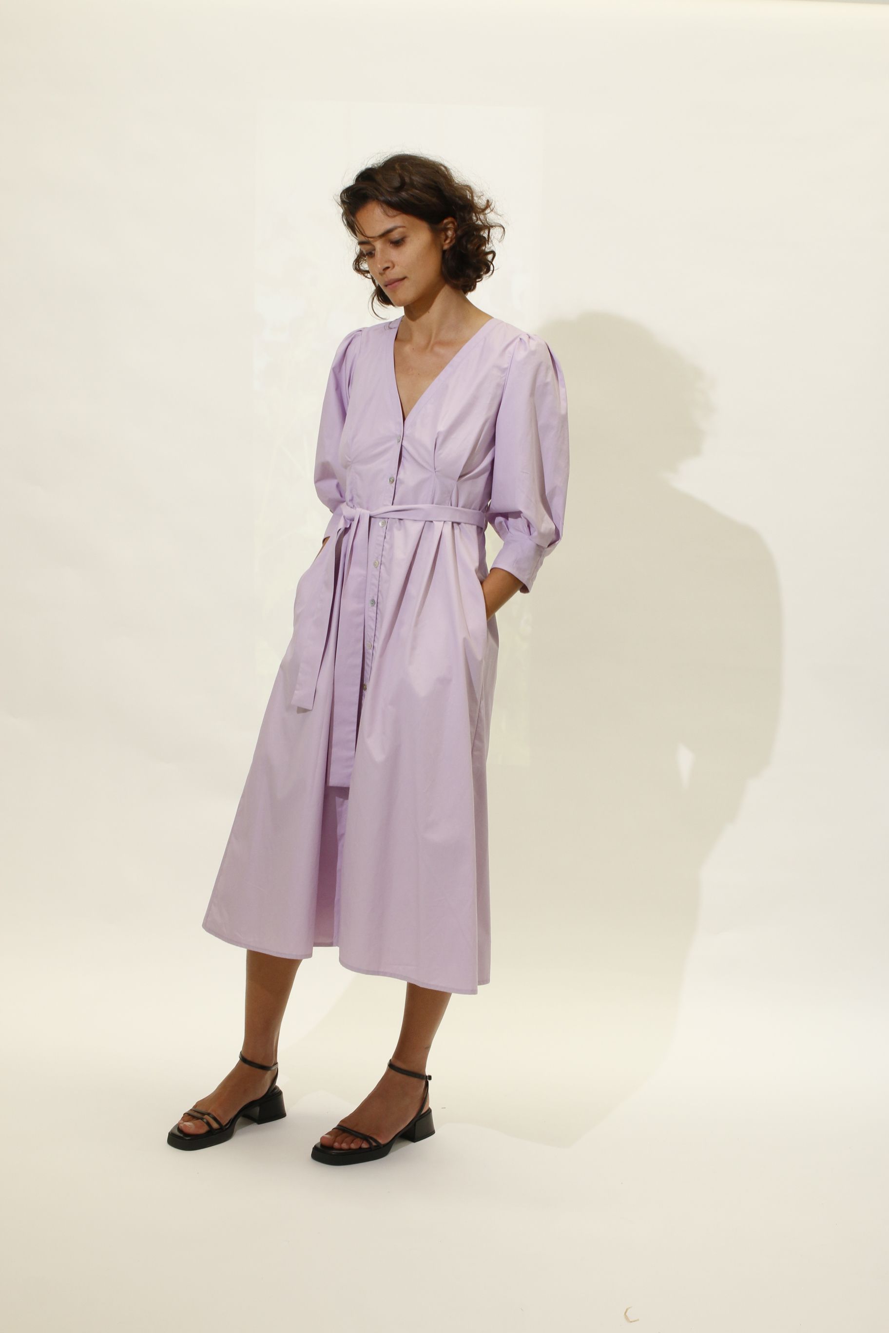 Voluminous sleeve Sewn down pleats below elbow Button closure Wear sleeves long or pushed up above the elbow Buttons down the front of the dress Pockets, deep tucks at waist, V neck Hem finishes just below knee