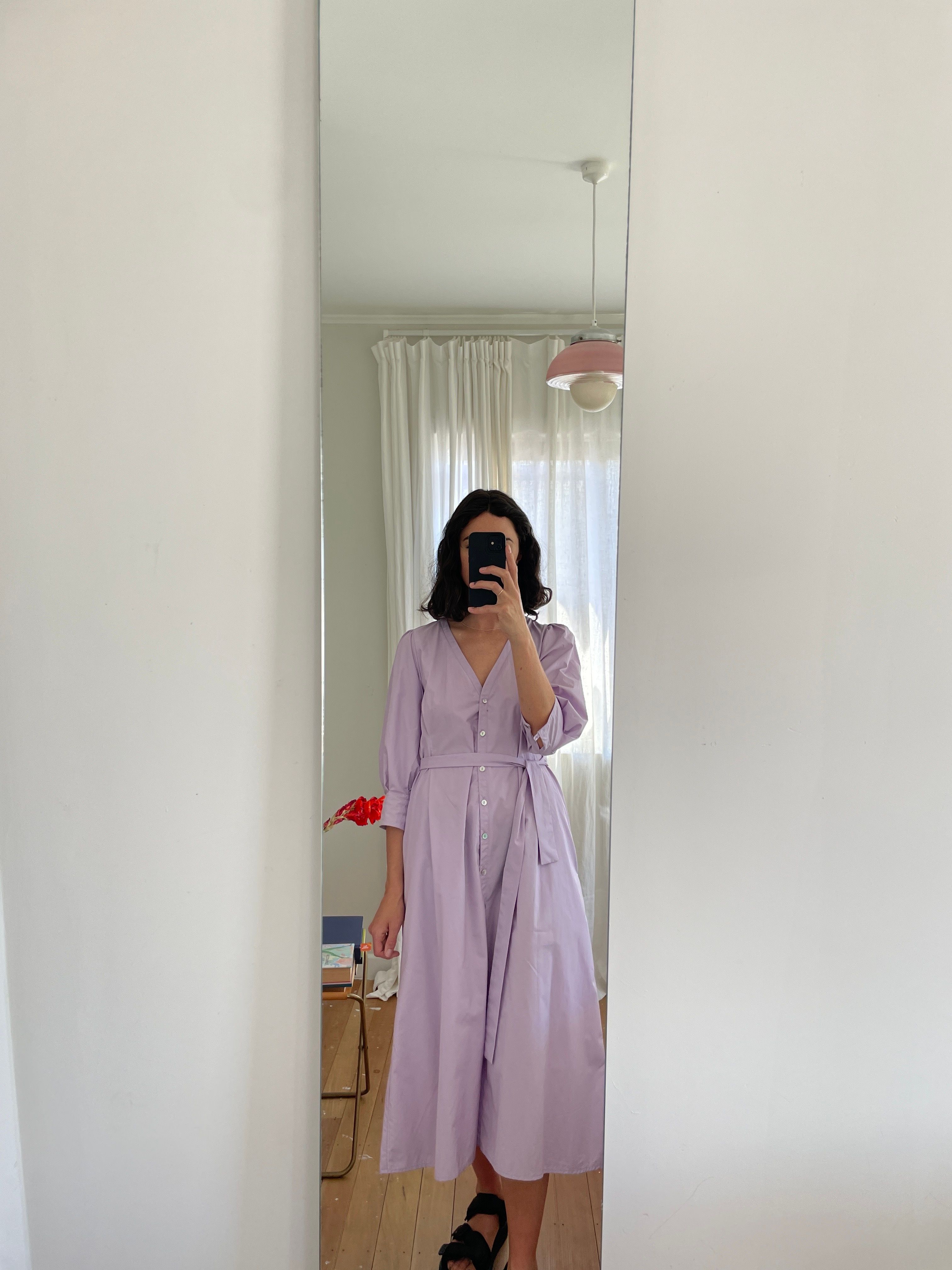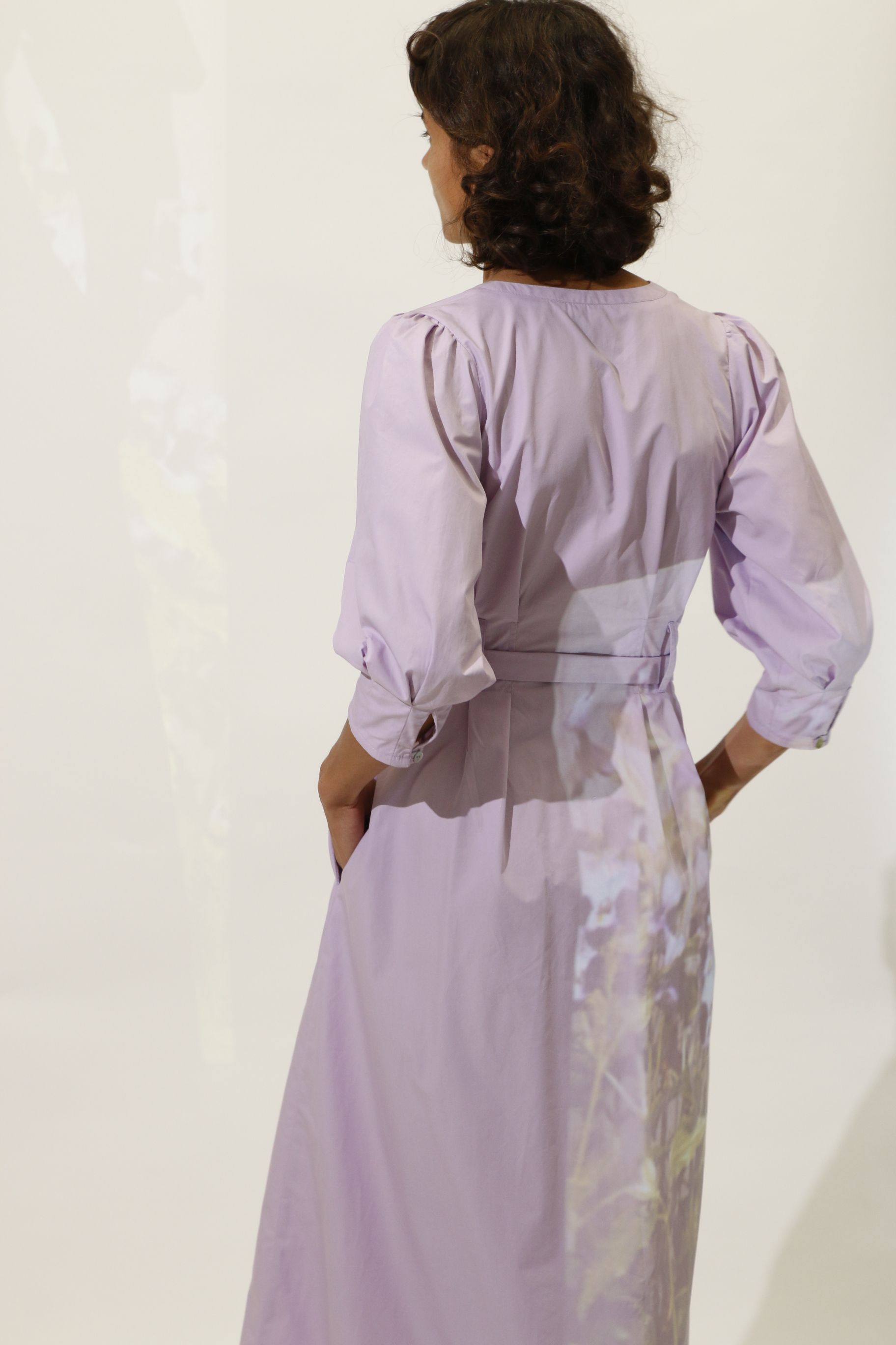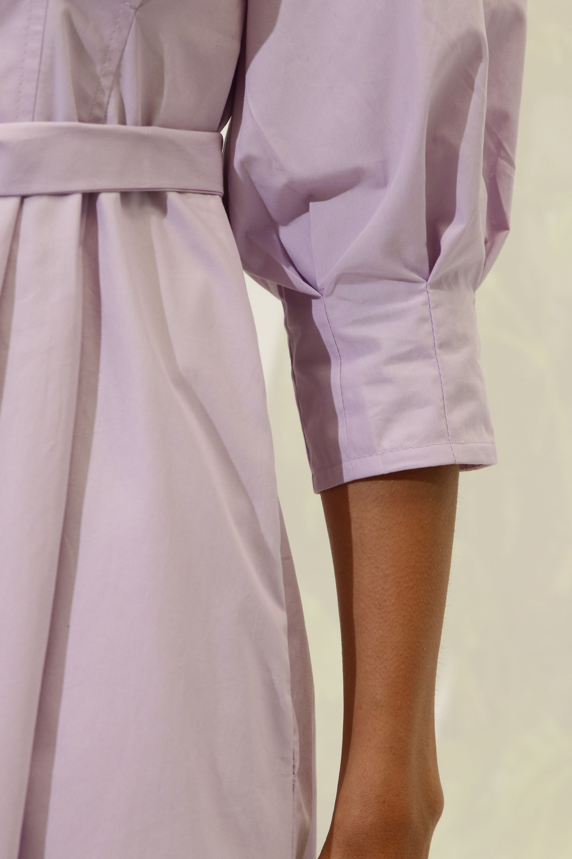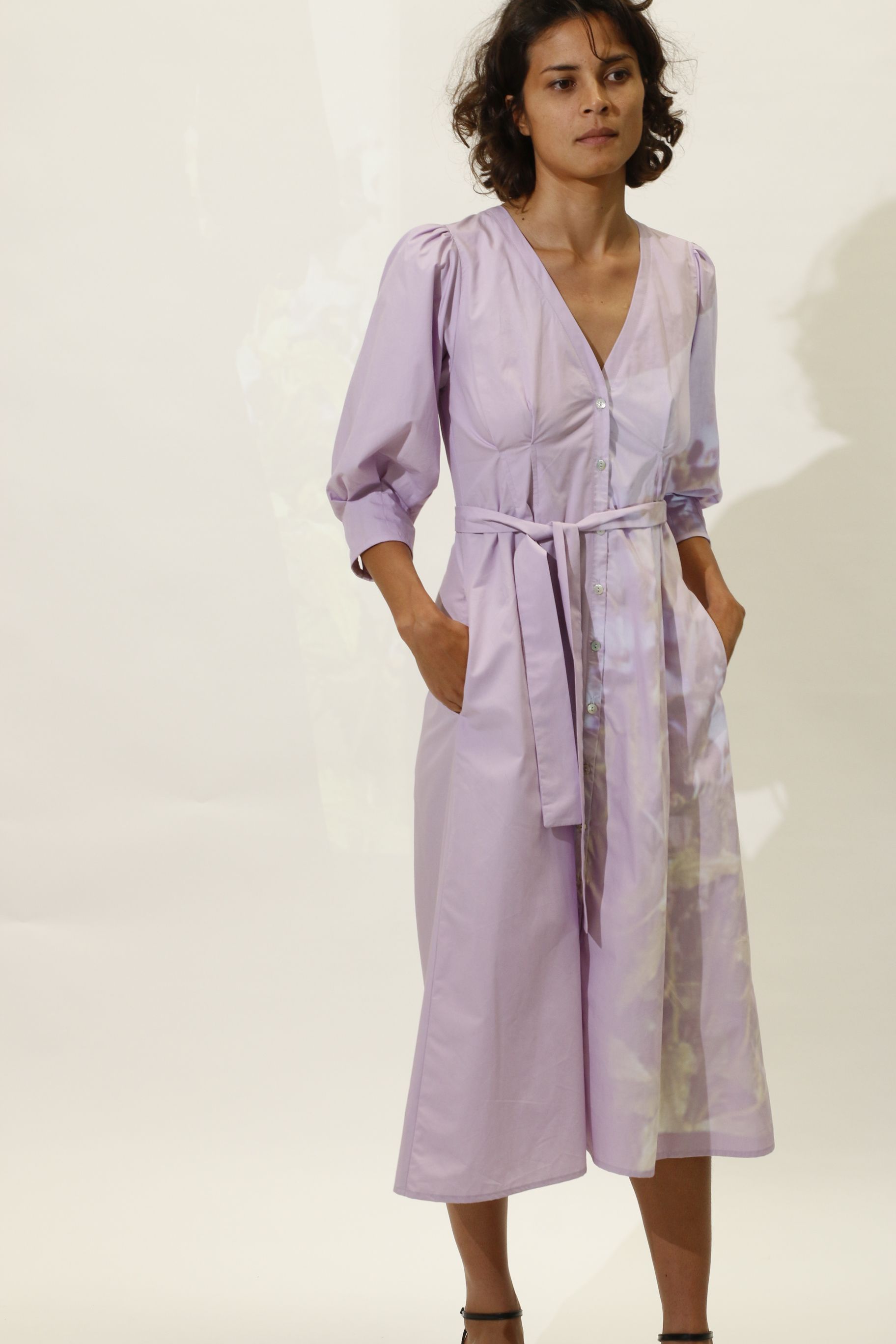 Voluminous sleeve Sewn down pleats below elbow Button closure Wear sleeves long or pushed up above the elbow Buttons down the front of the dress Pockets, deep tucks at waist, V neck Hem finishes just below knee