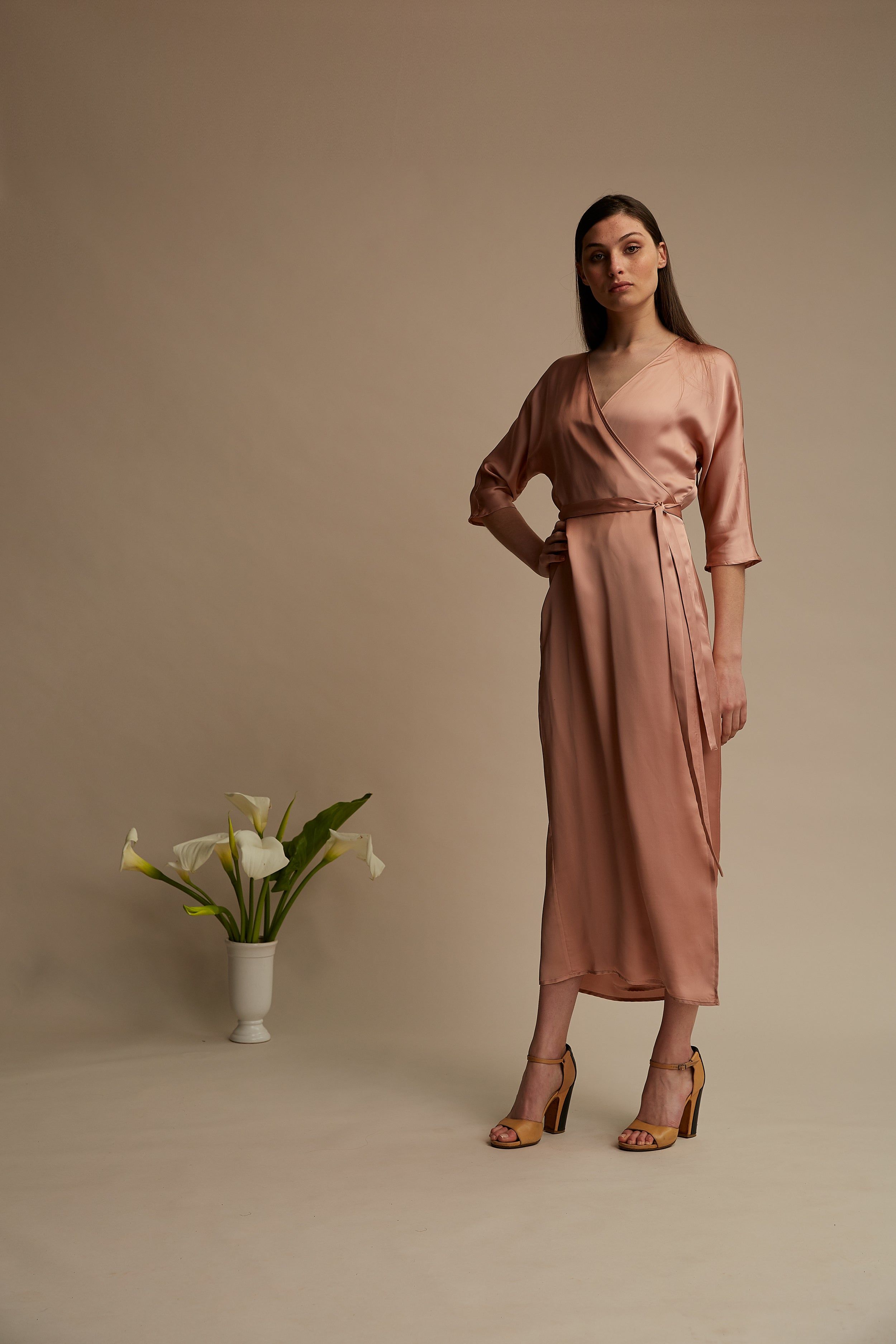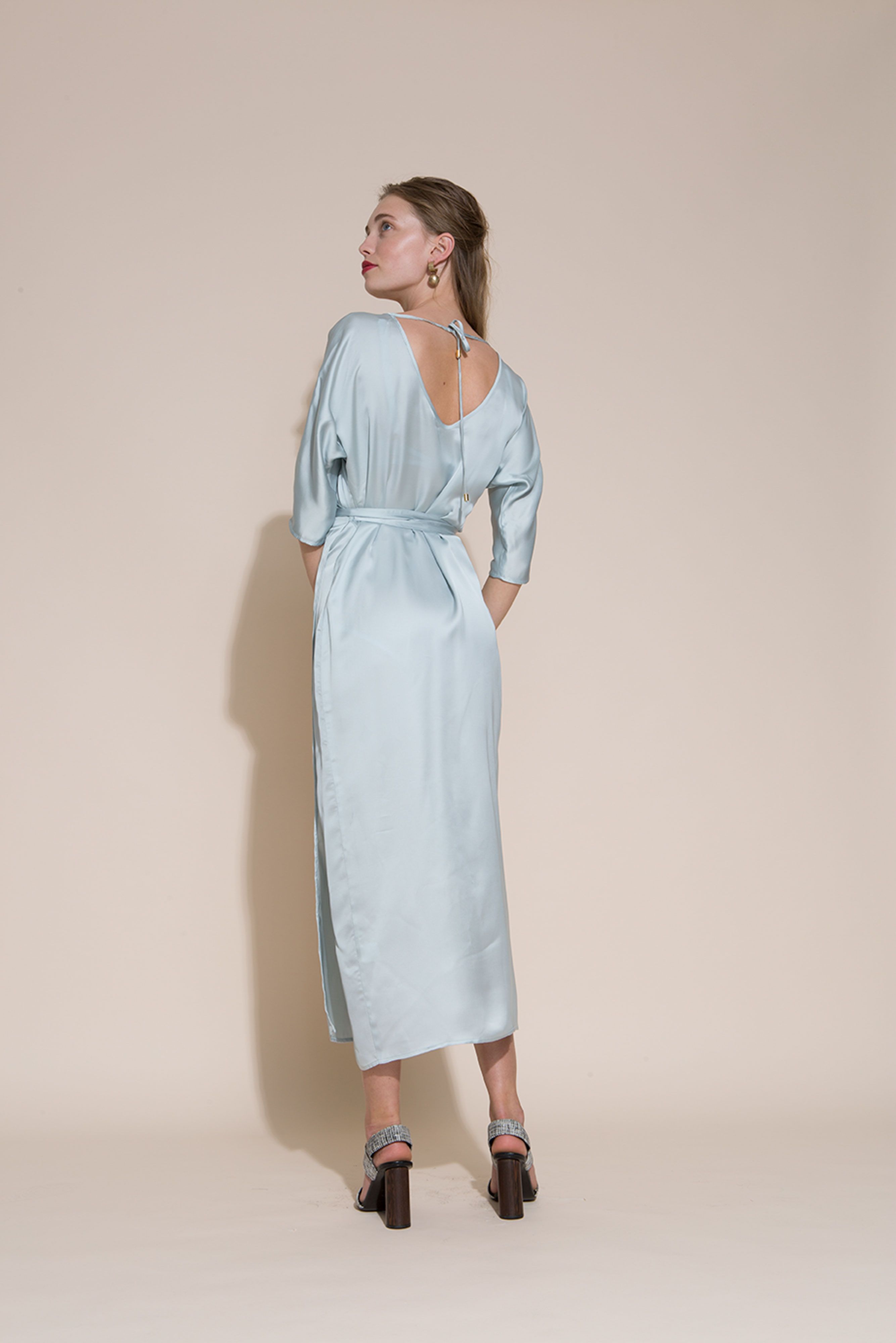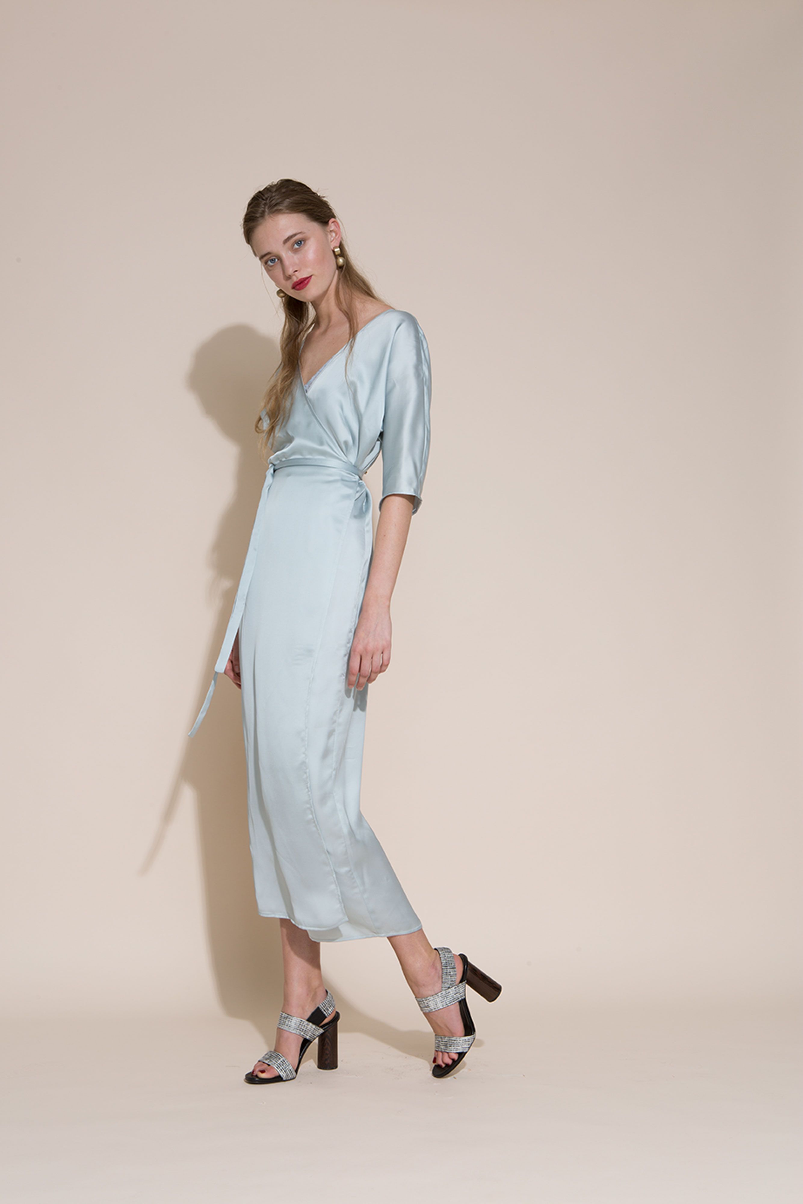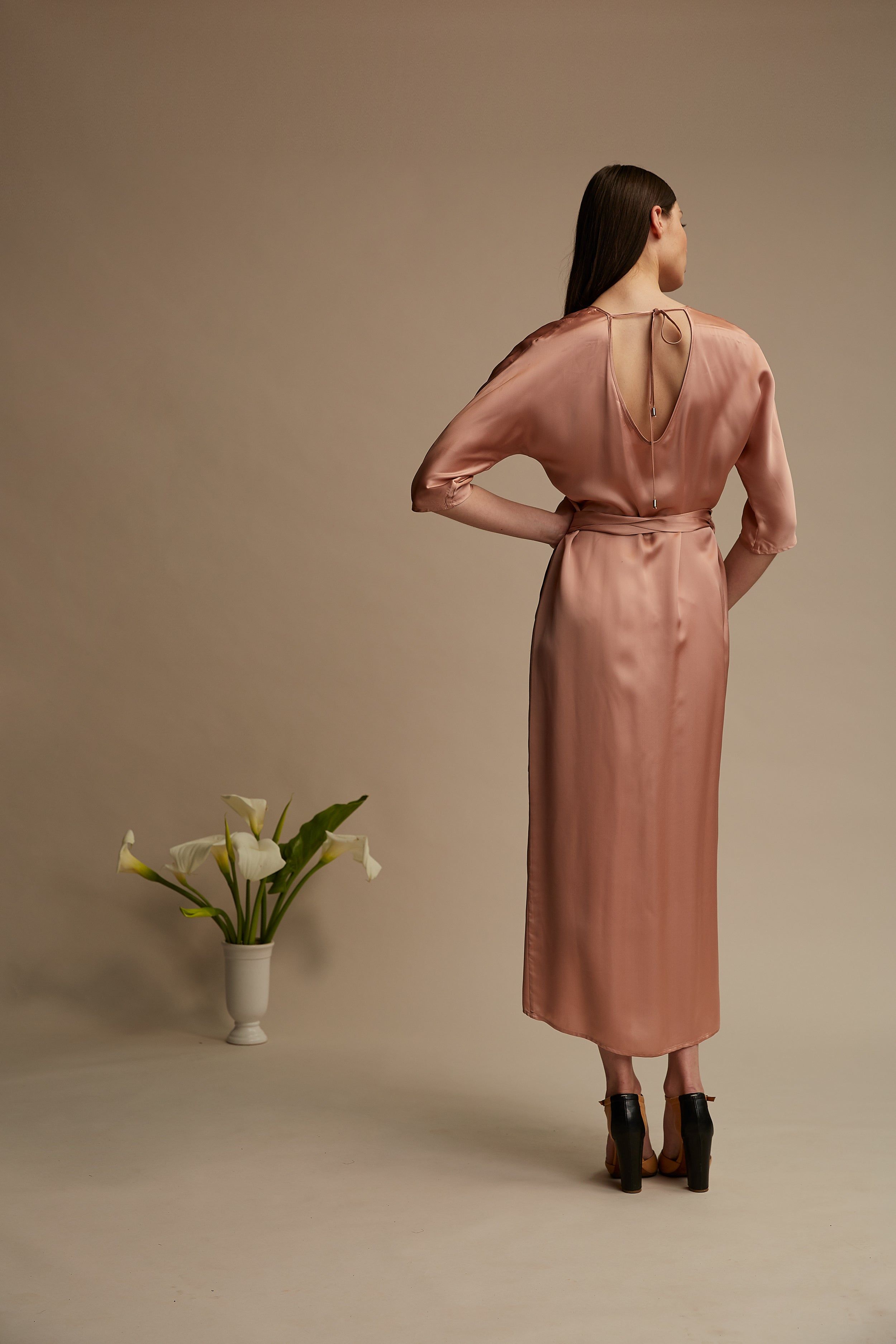 An elegant wrap dress with a low back, featuring ties at the top back neck to allow for it to be worn draped and wide over the shoulders or can be tied in to fit. Wraps at waist with a 3/4 length sleeve. The hem finishes at mid-calf.