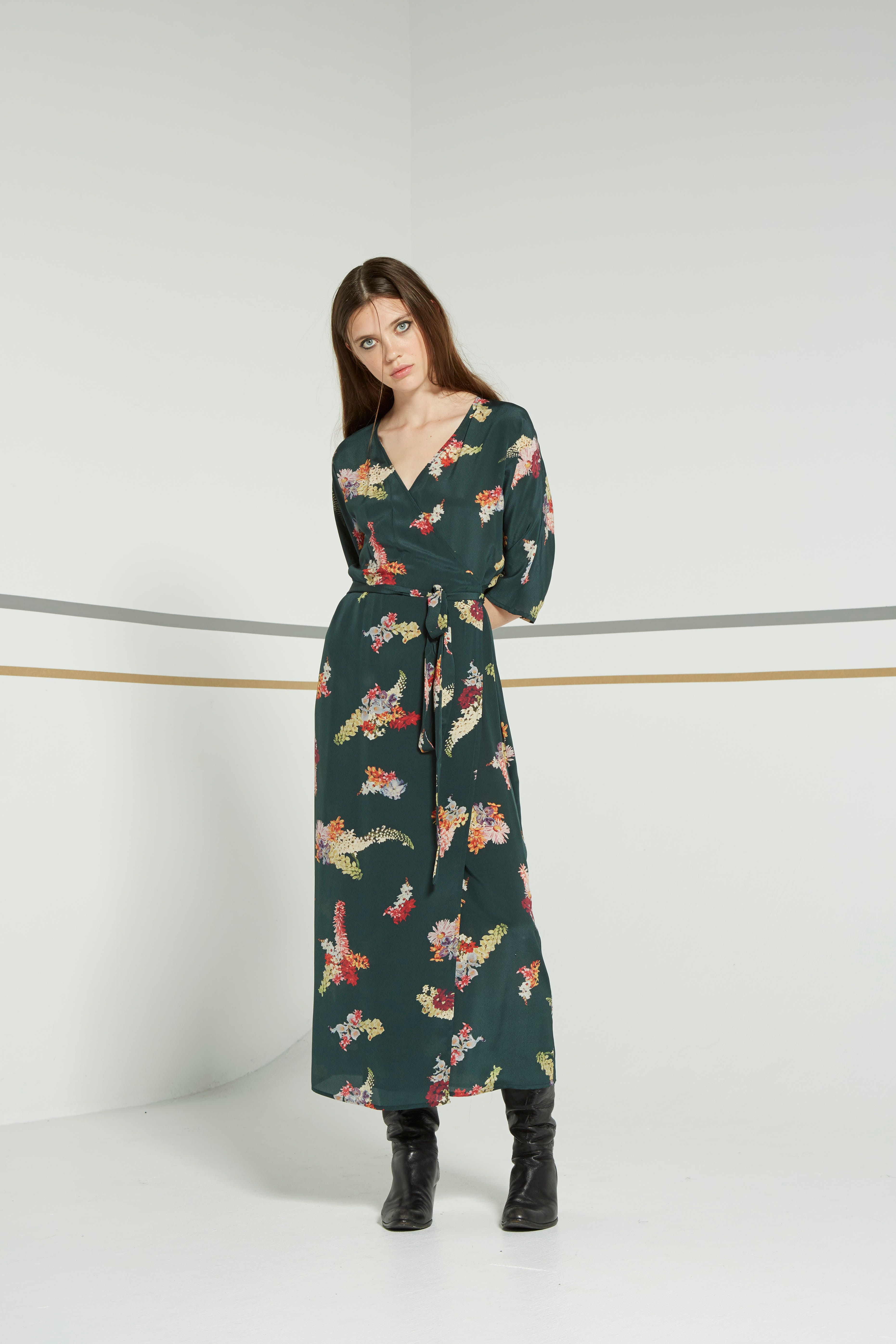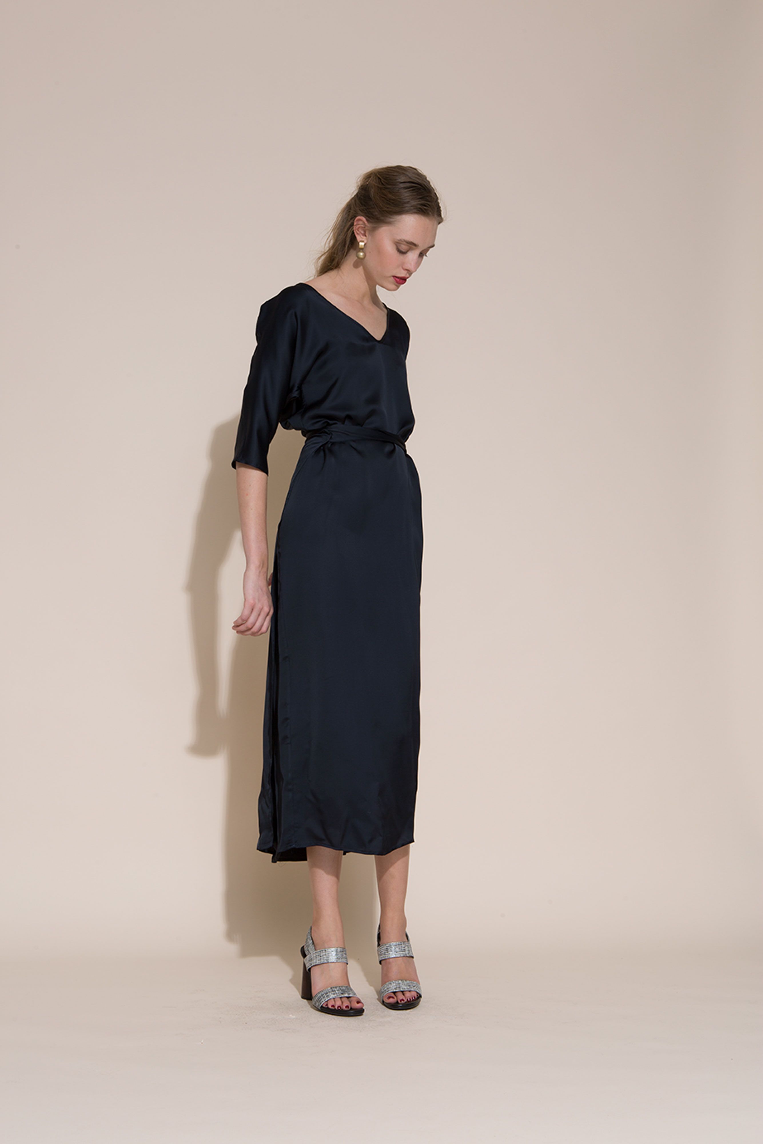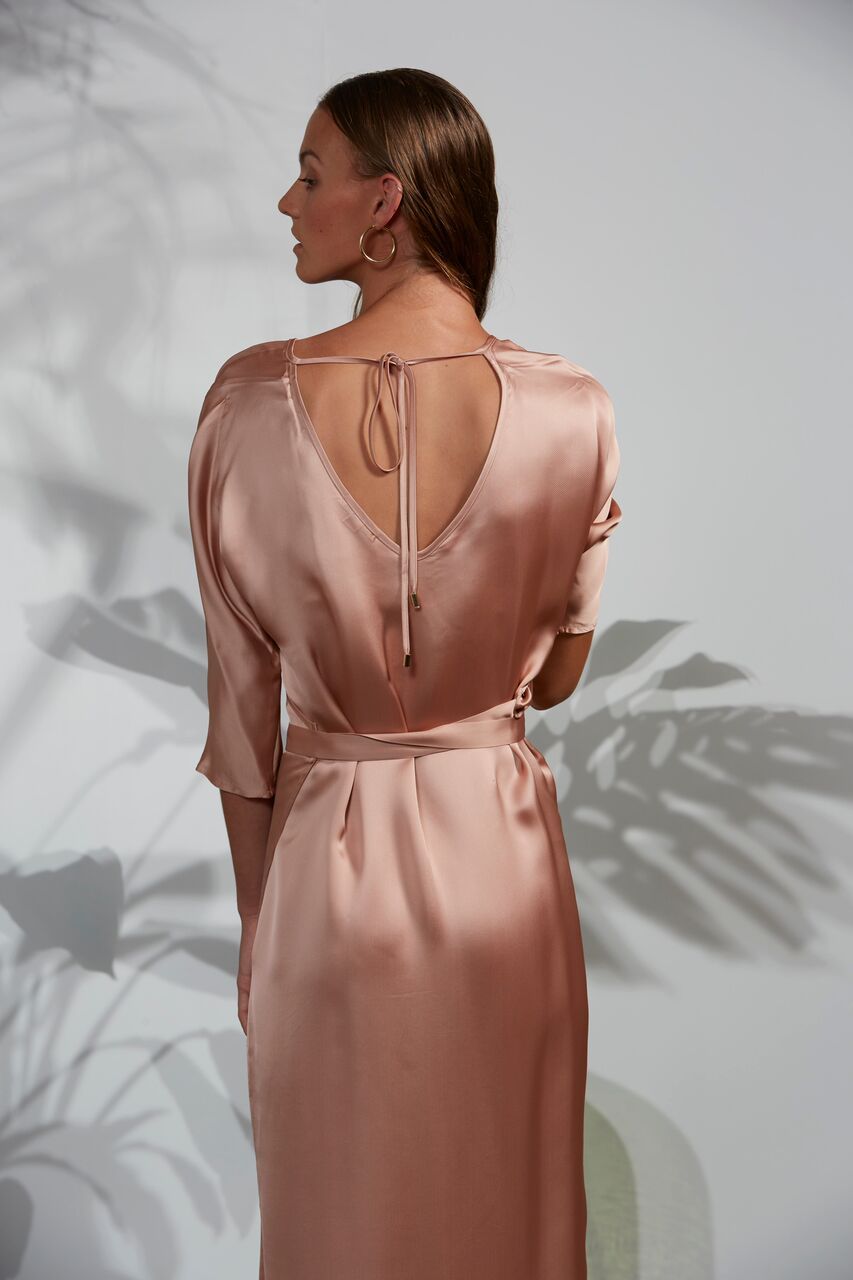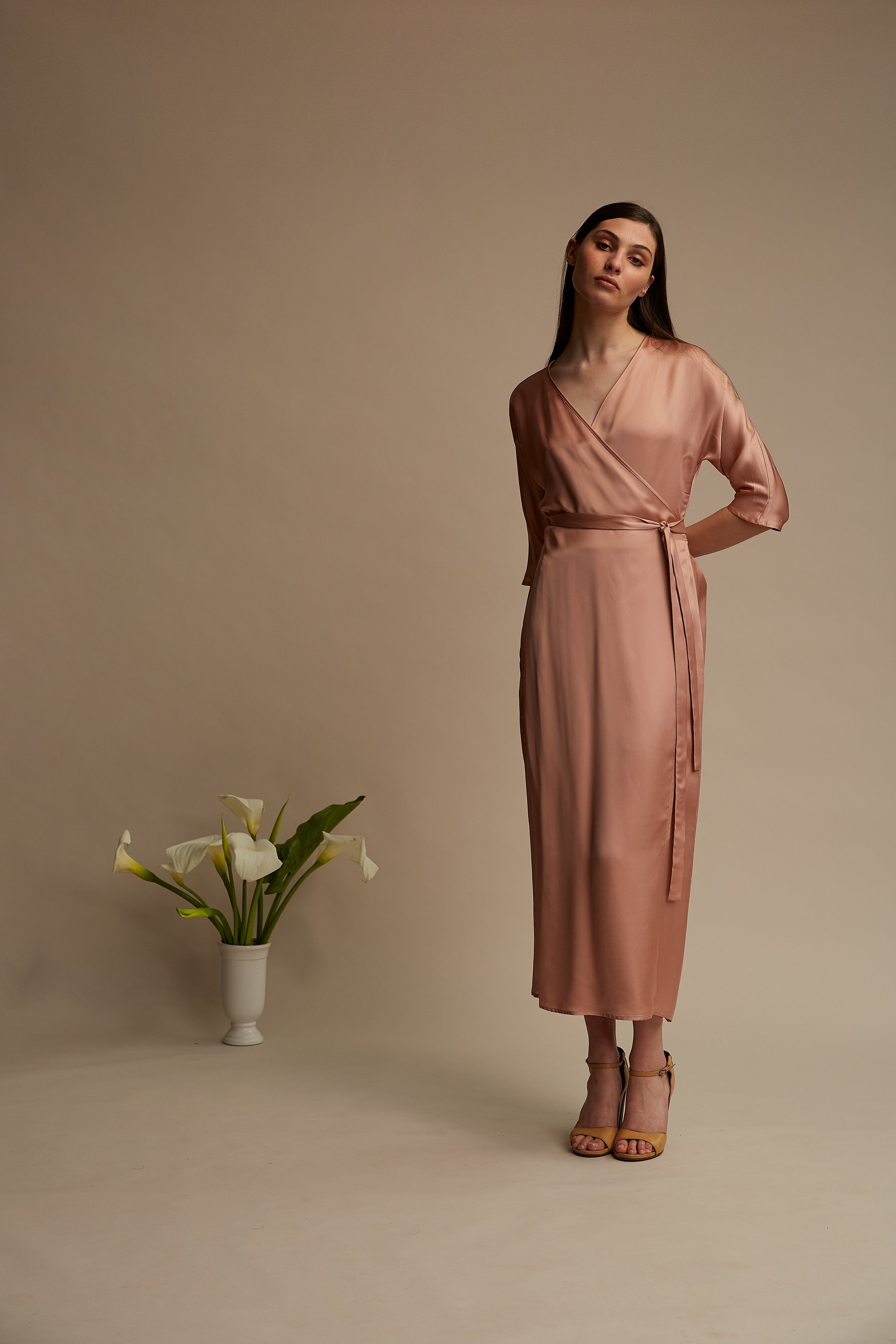 An elegant wrap dress with a low back, featuring ties at the top back neck to allow for it to be worn draped and wide over the shoulders or can be tied in to fit. Wraps at waist with a 3/4 length sleeve. The hem finishes at mid-calf.