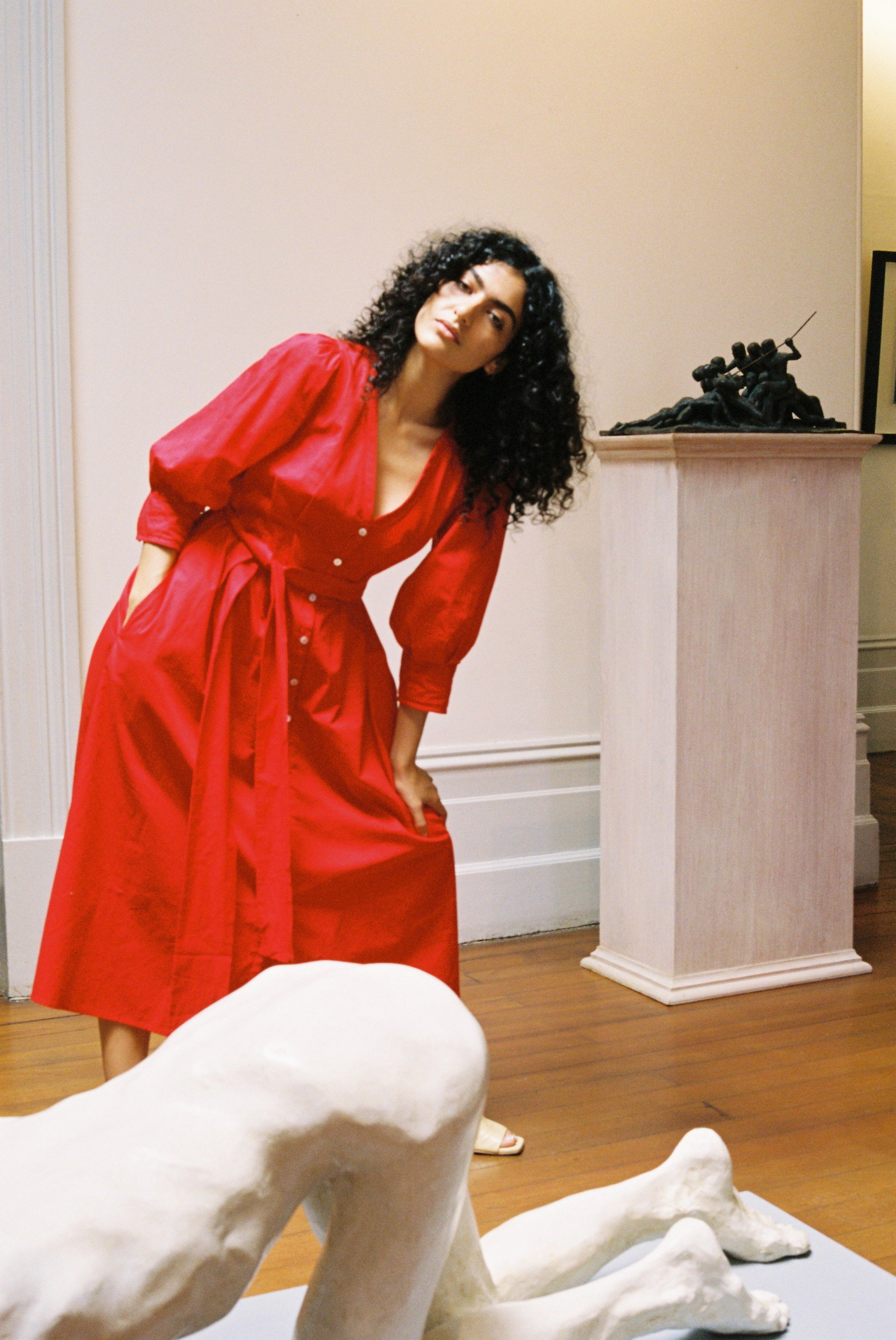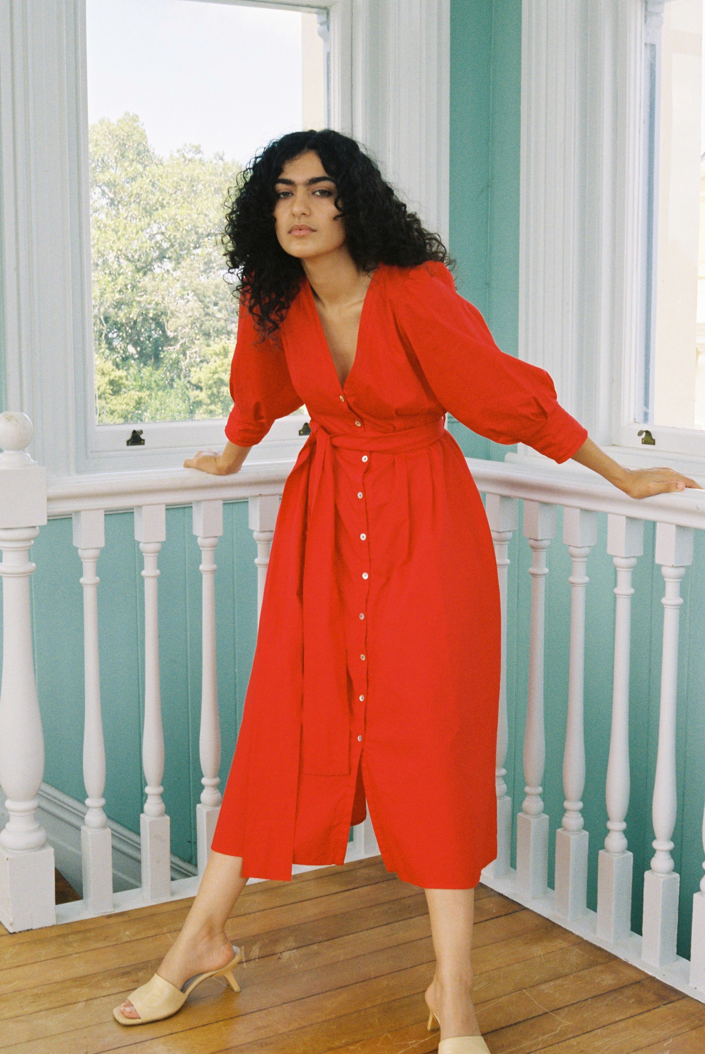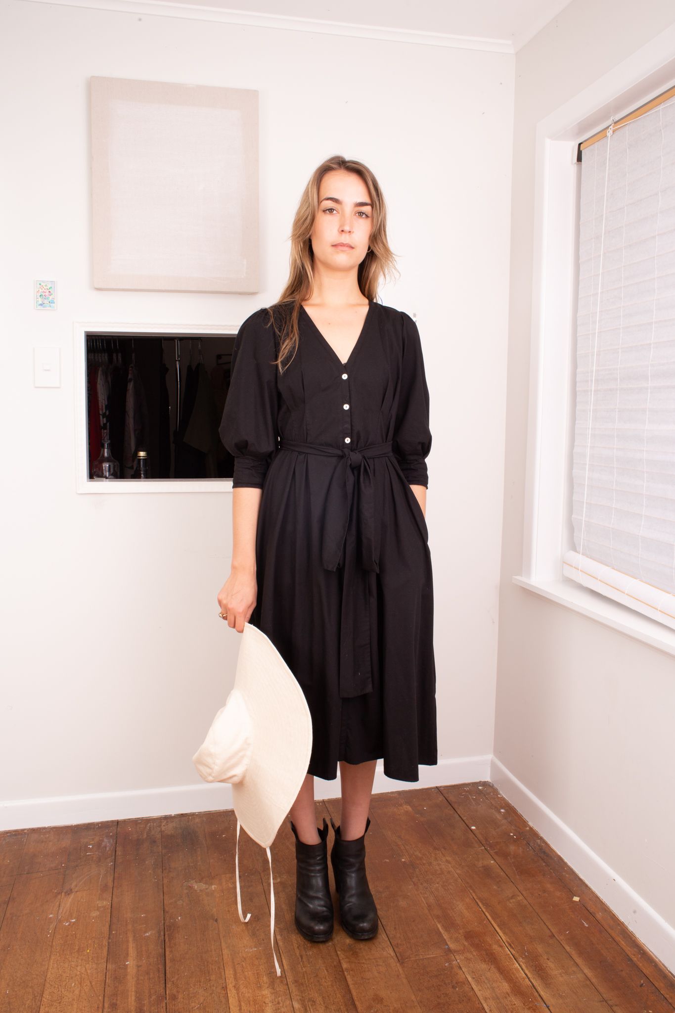 The Lular dress is a fitted relaxed shirt dress featuring tucks at waist and a belt tie. The sleeve features sewn down pleats at the elbow that billow out slightly to create a voluminous sleeve. Shell button closure down front. Side pockets and the hem finishes mid-calf.