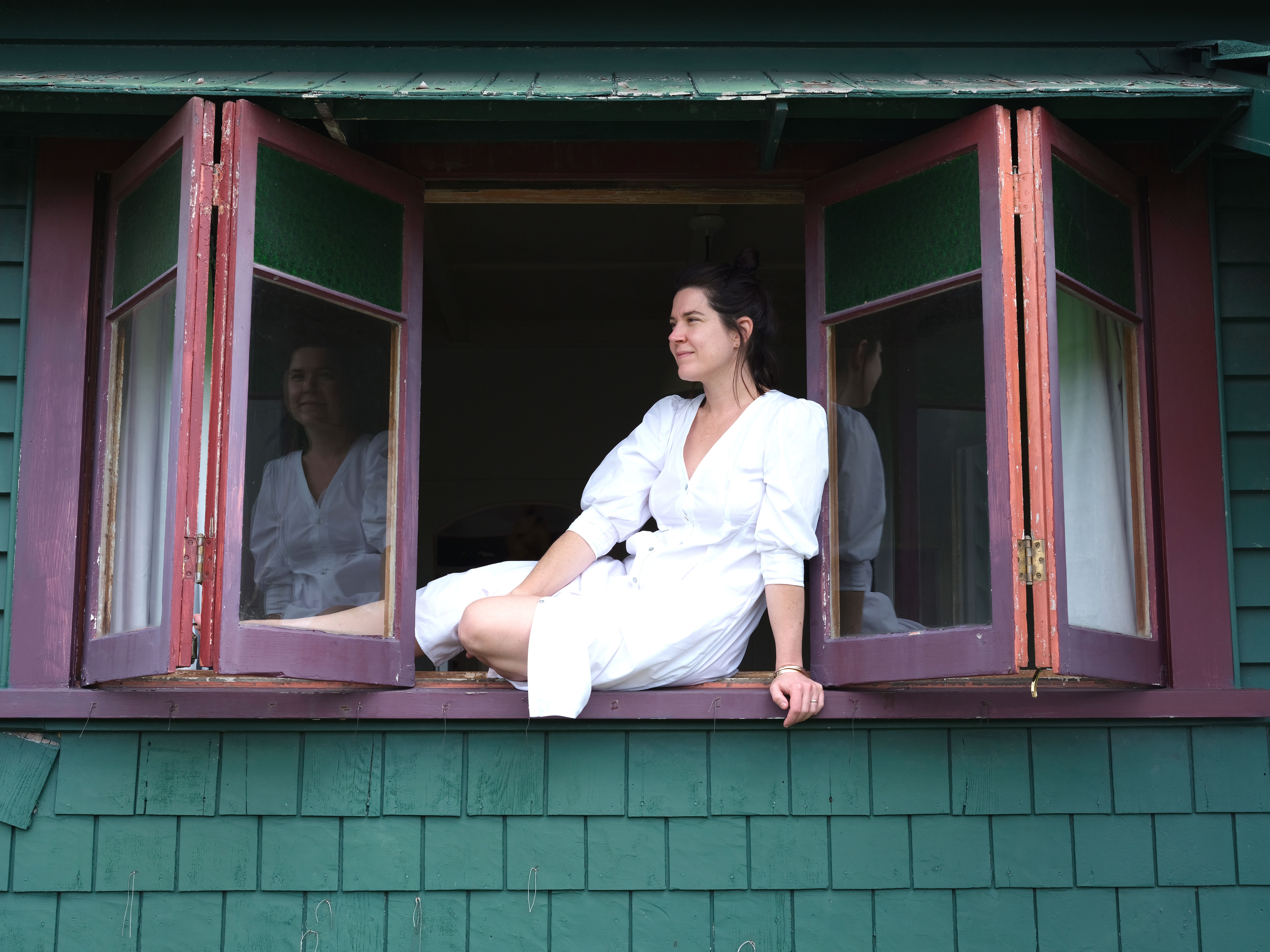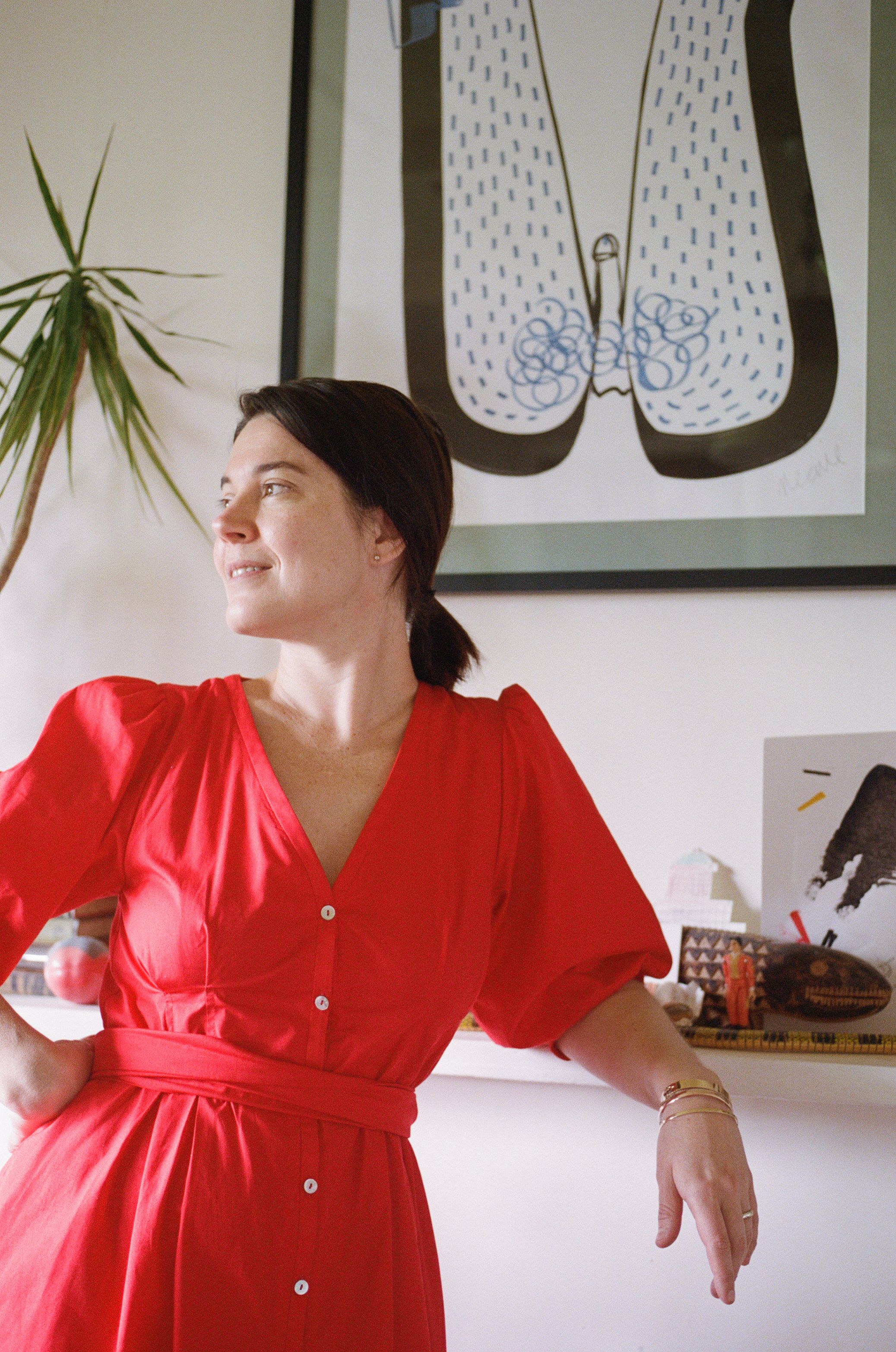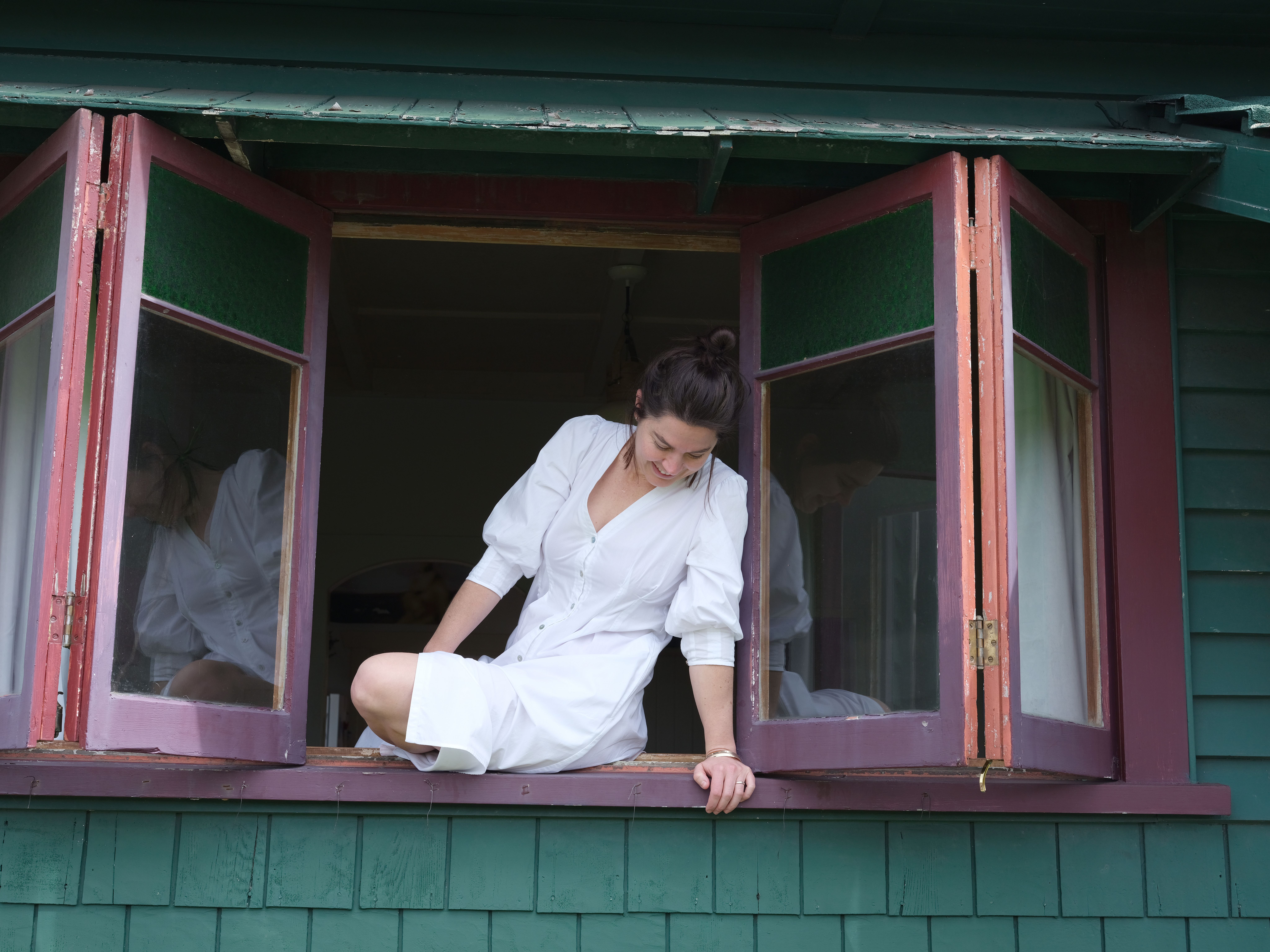 The Lular dress is a fitted relaxed shirt dress featuring tucks at waist and a belt tie. The sleeve features sewn down pleats at the elbow that billow out slightly to create a voluminous sleeve. Shell button closure down front. Side pockets and the hem finishes mid-calf.