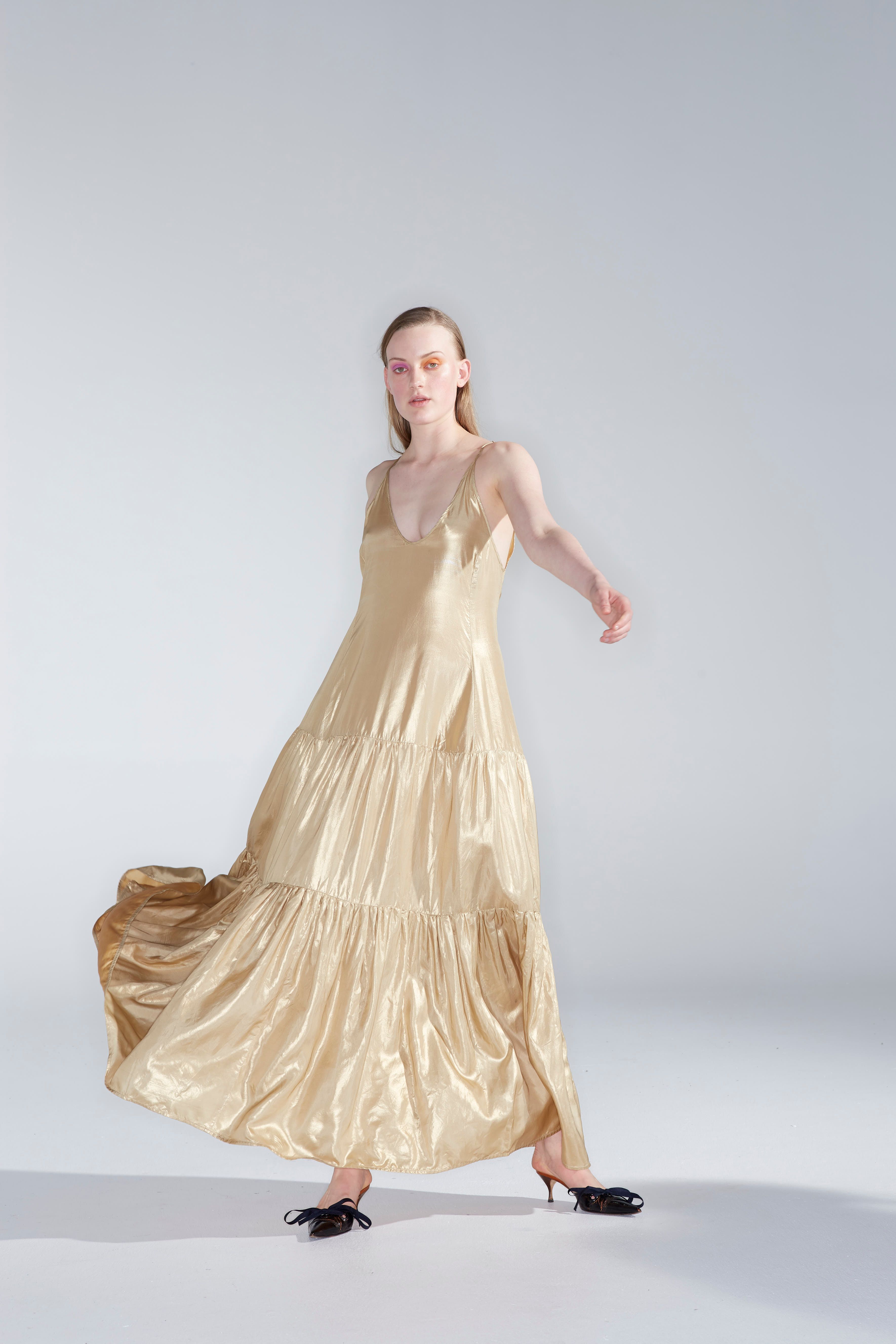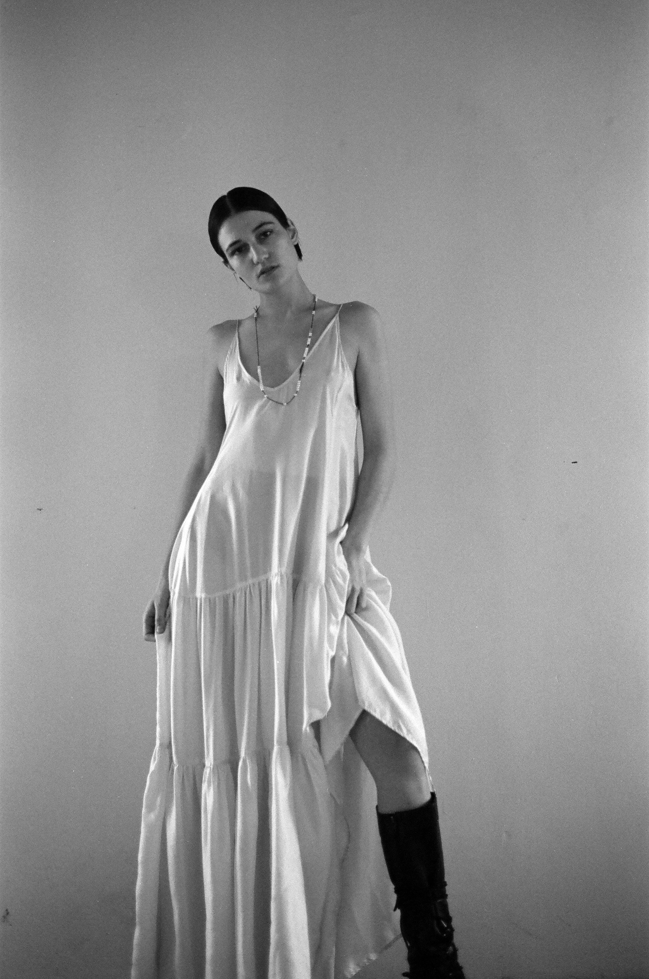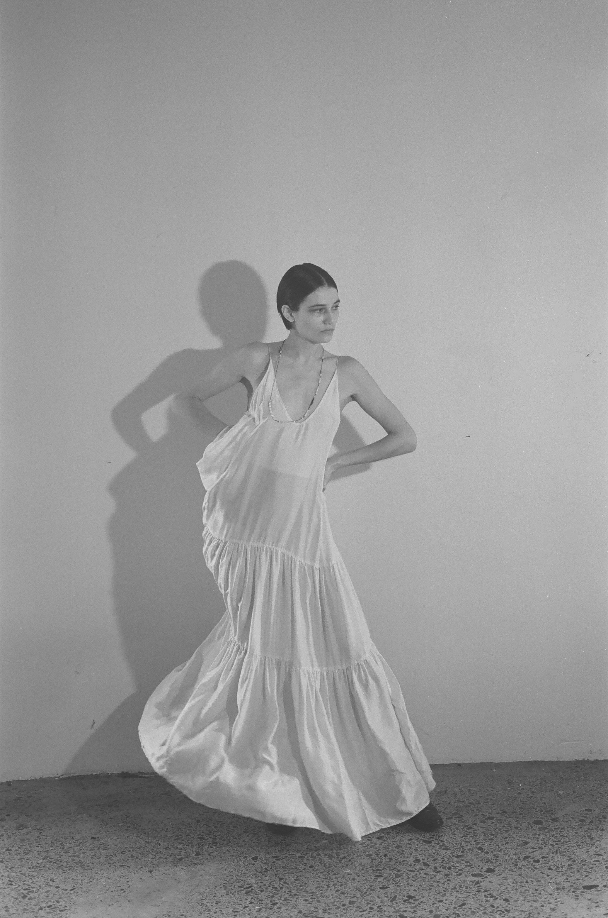 A full length tiered floating dress, features thin adjustable straps with a delicate scoop neck. Skirt starts from low waist and flows to the floor.