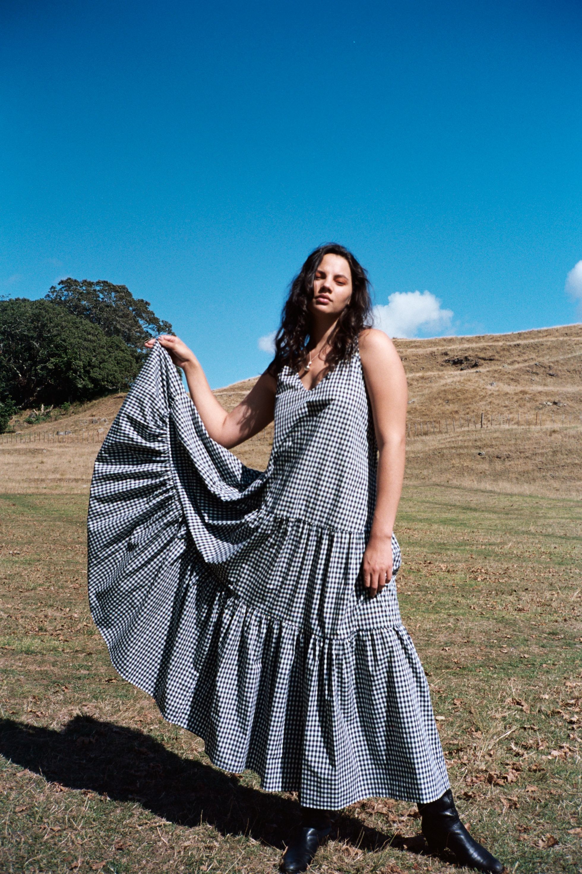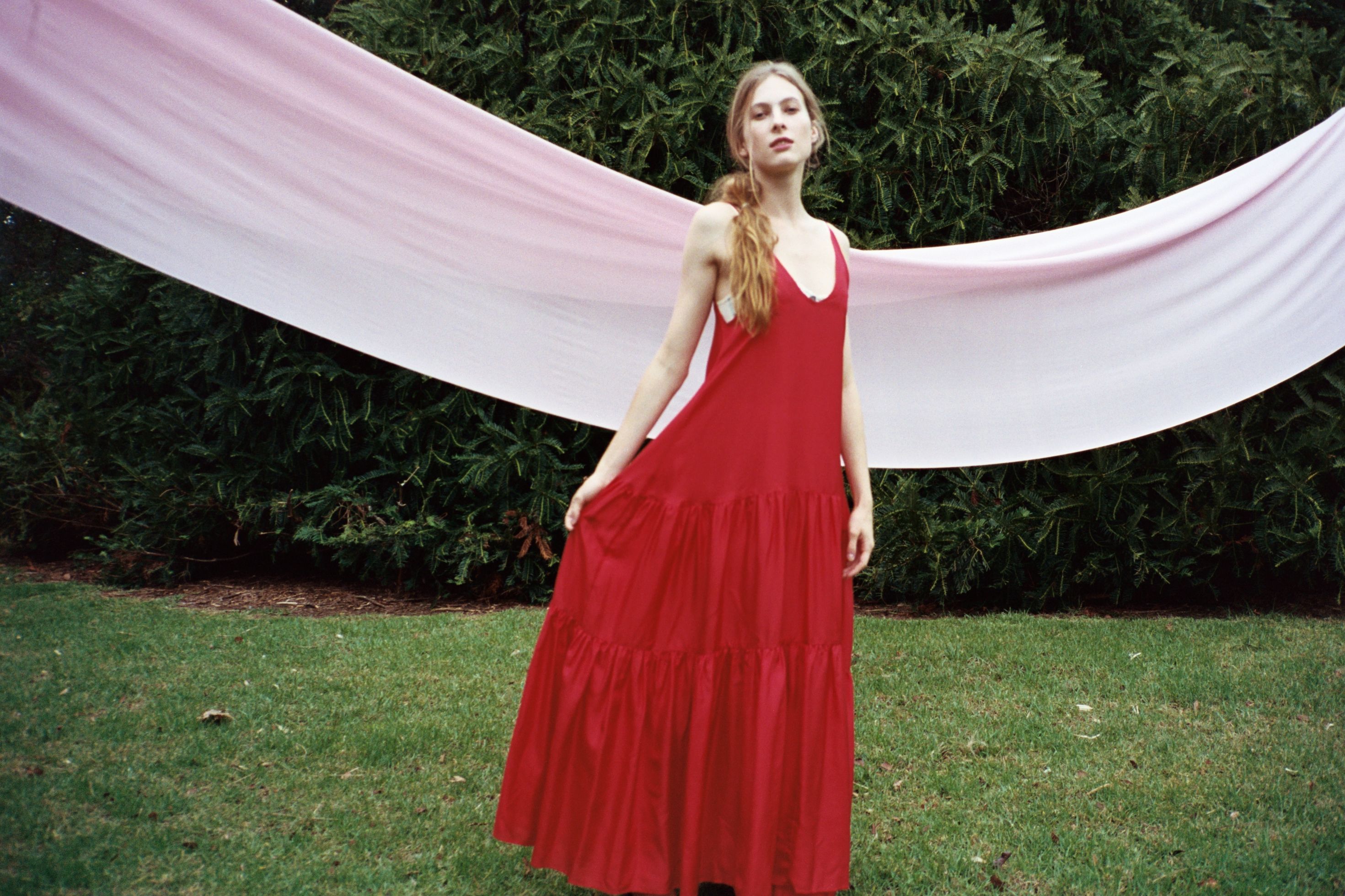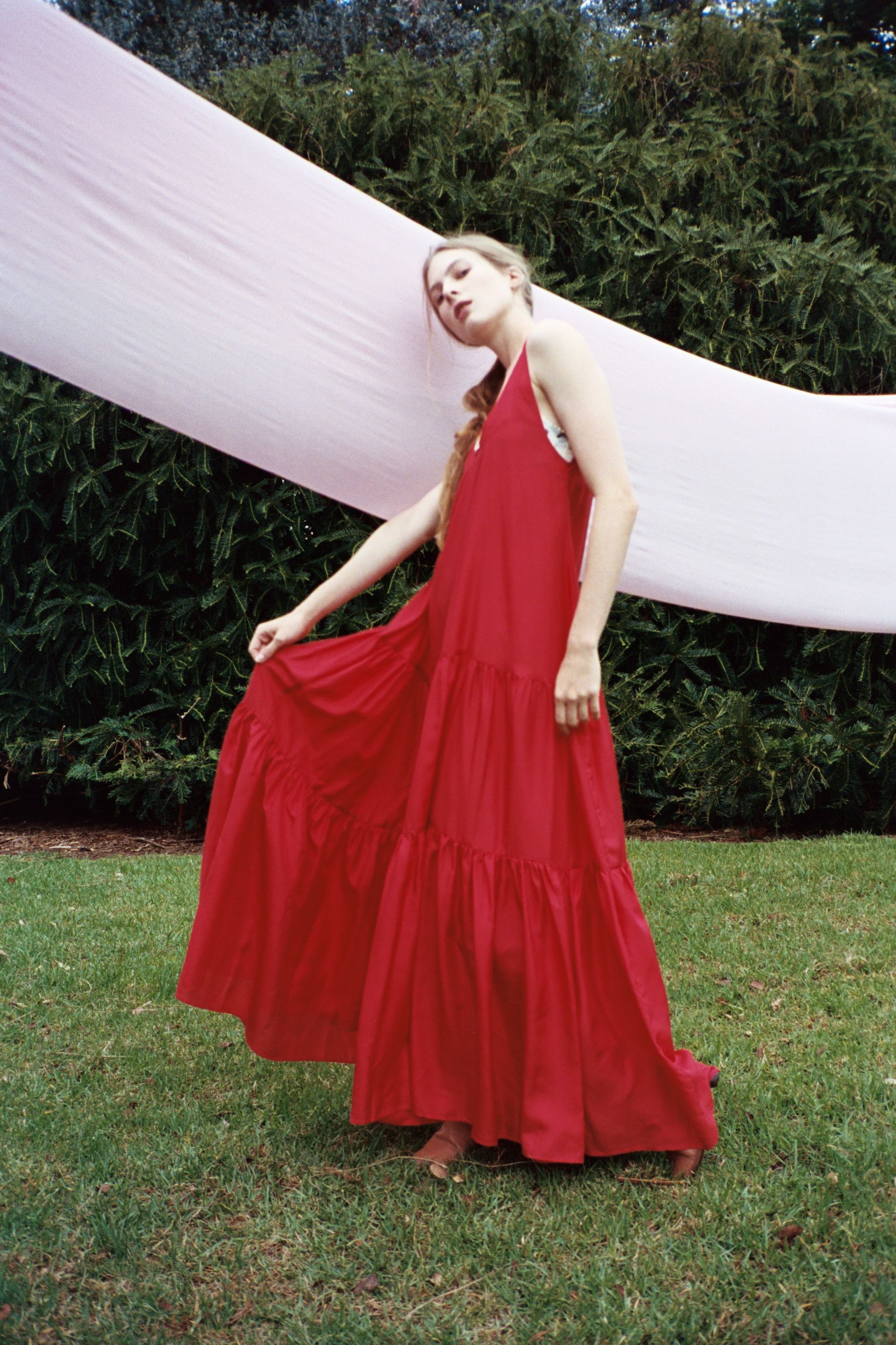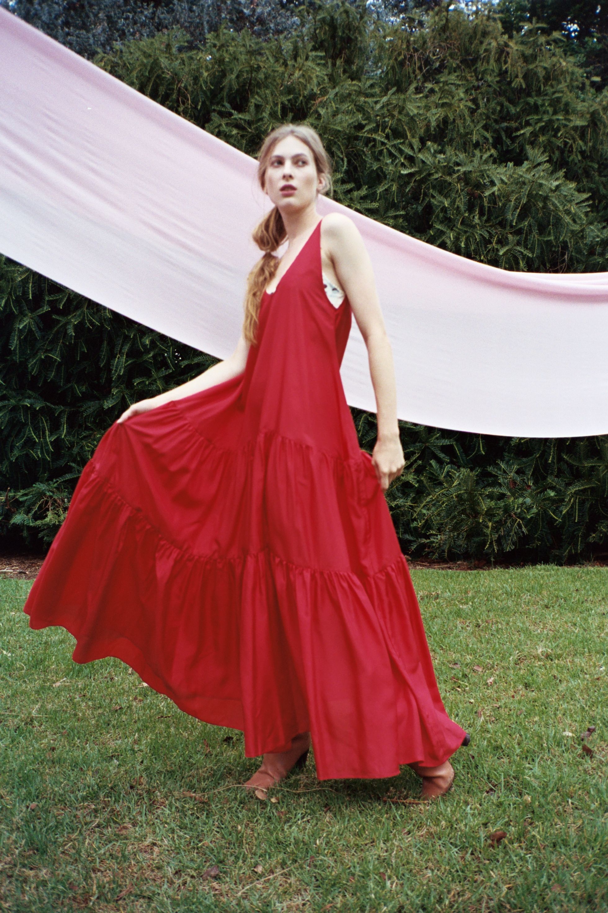 A full length tiered floating dress, features thin adjustable straps with a delicate scoop neck. Skirt starts from low waist and flows to the floor.