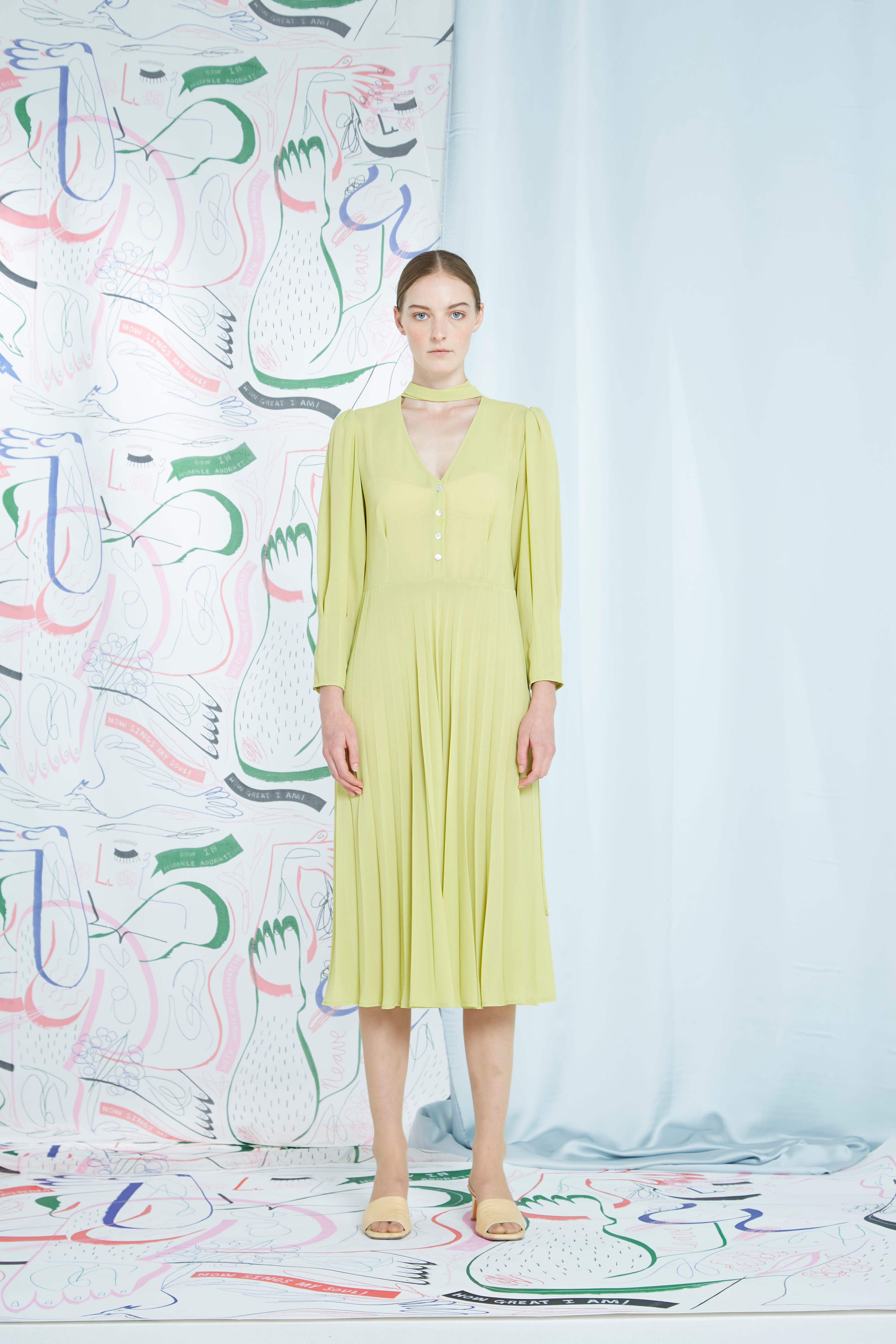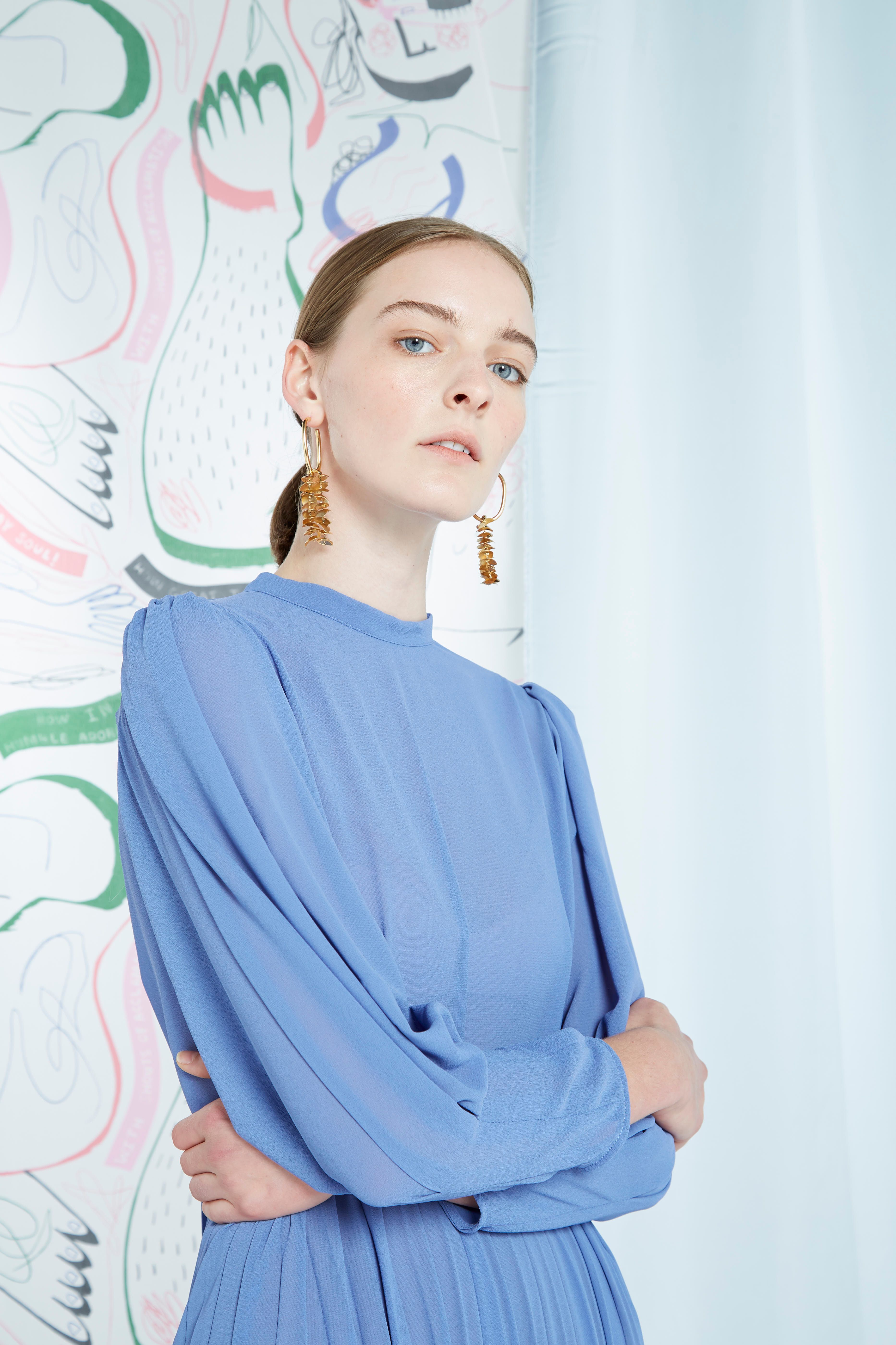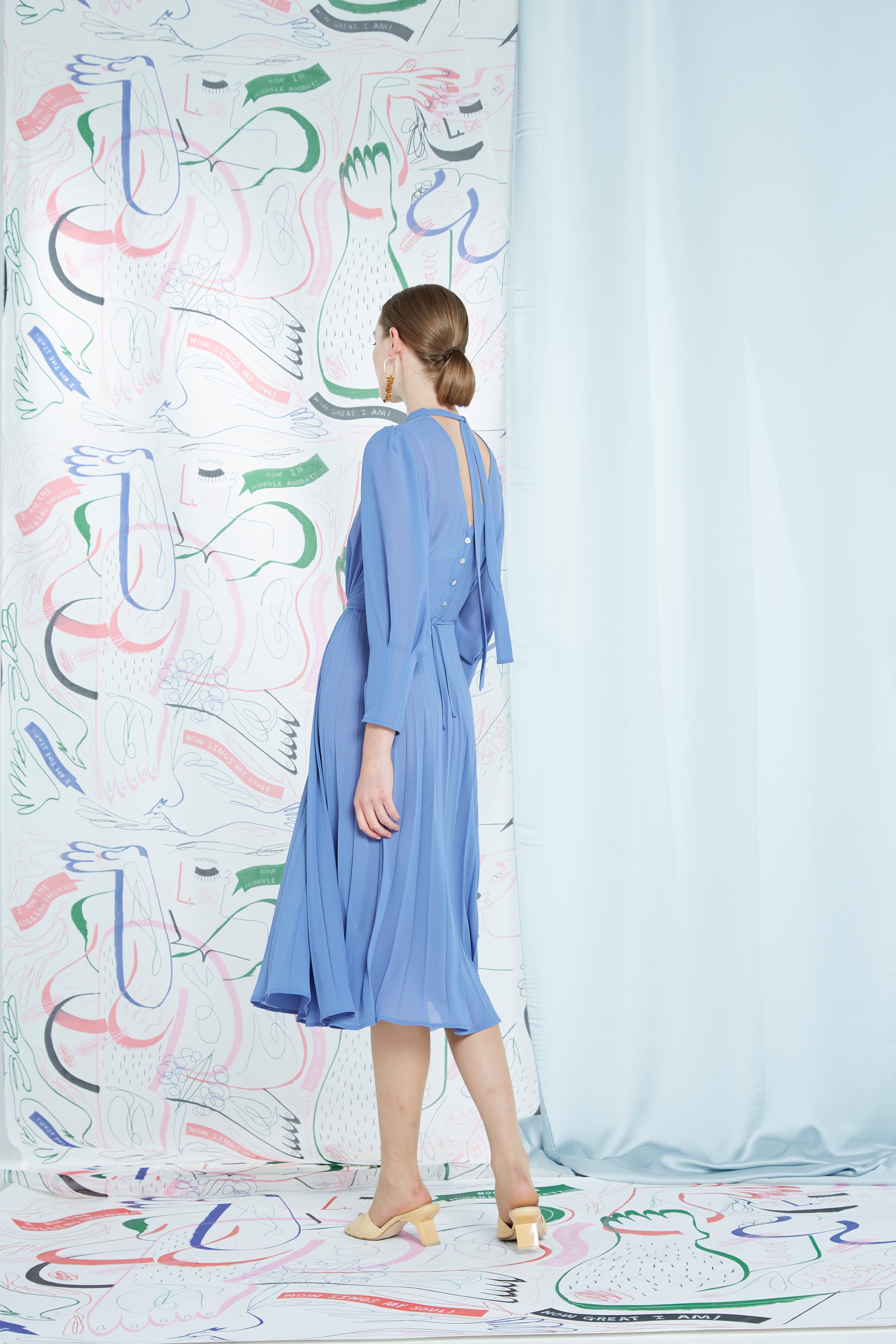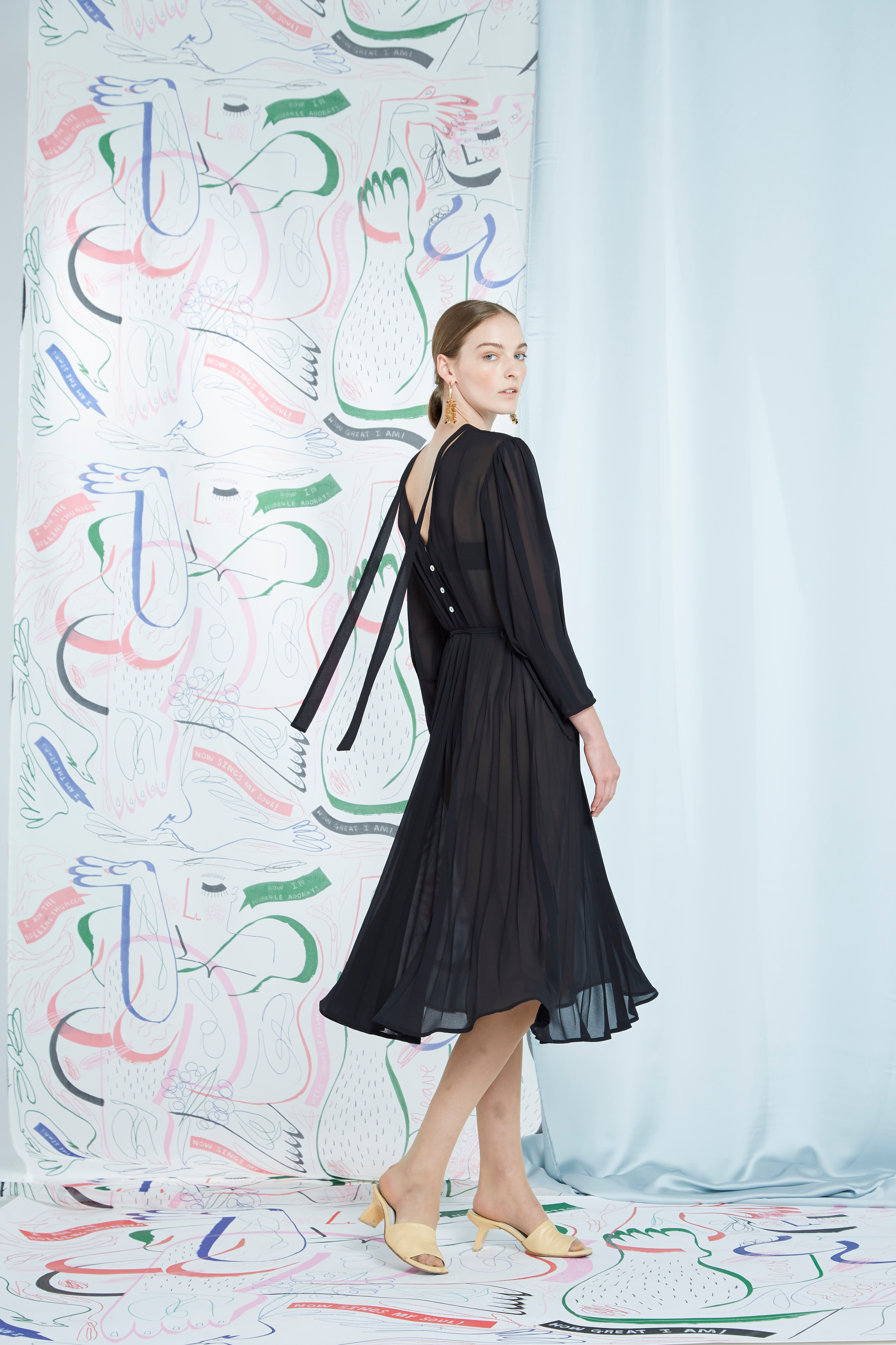 An elegant and flattering full circle skirt sunray pleated reversible dress, featuring a V neck shell button closer that can either be worn to the front or back. Ties come from top the shoulder and can be worn loosely tied and draped or wrapped around the neck. Tucks at waist and thin ties that wrap around to the front or back. Voluminous sleeve, sewn down pleats below elbow with a shell button and loop closure.