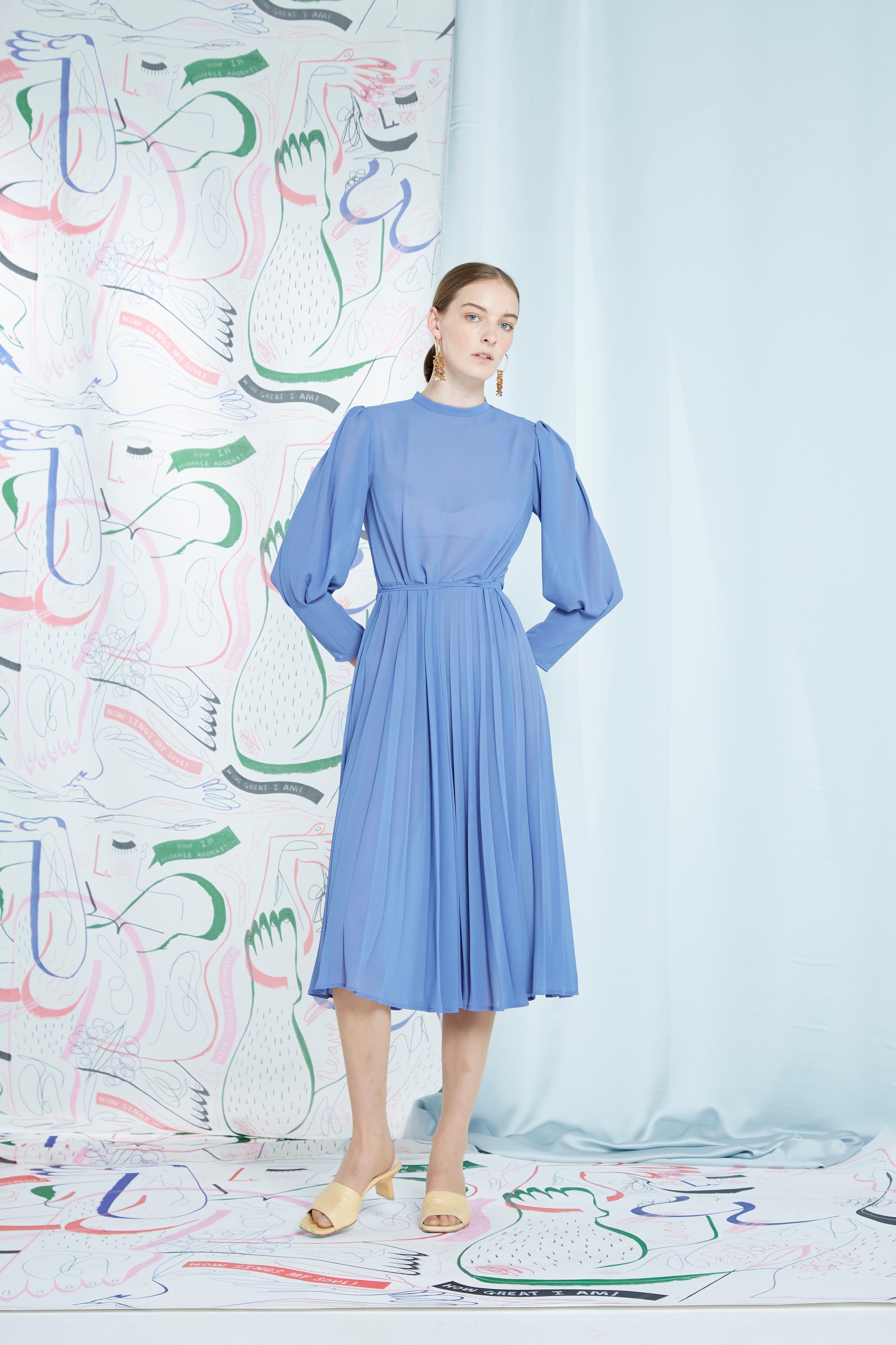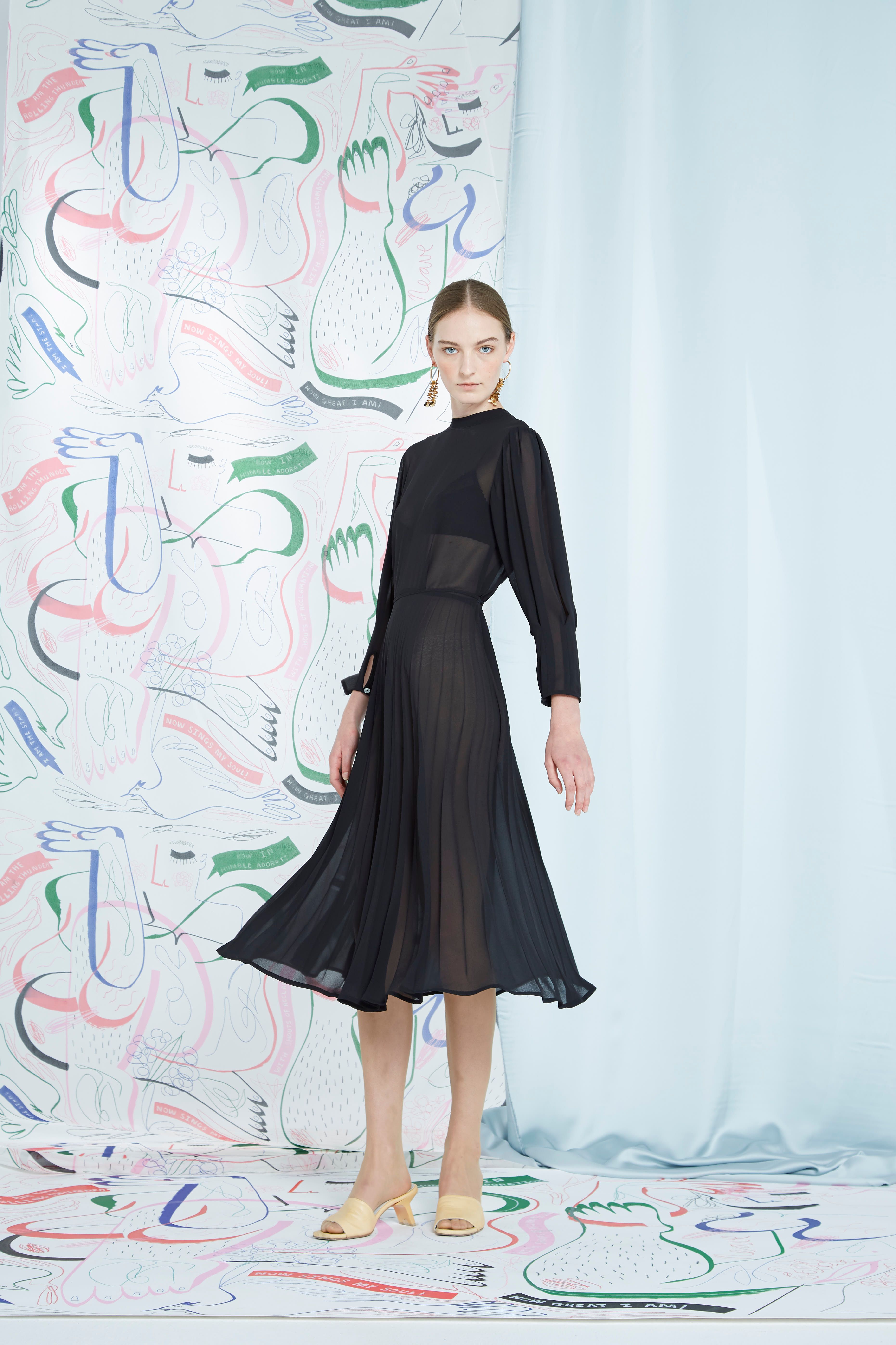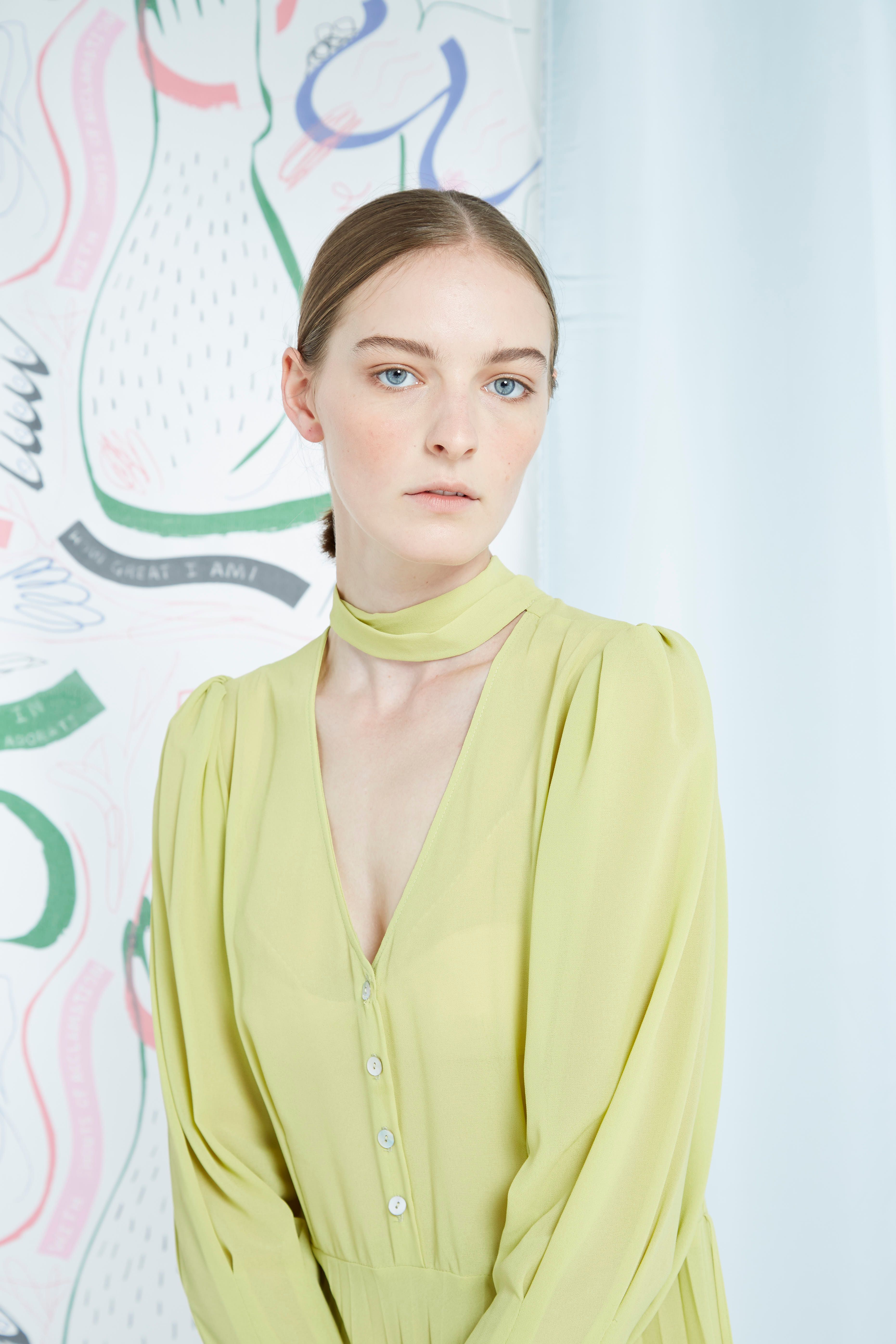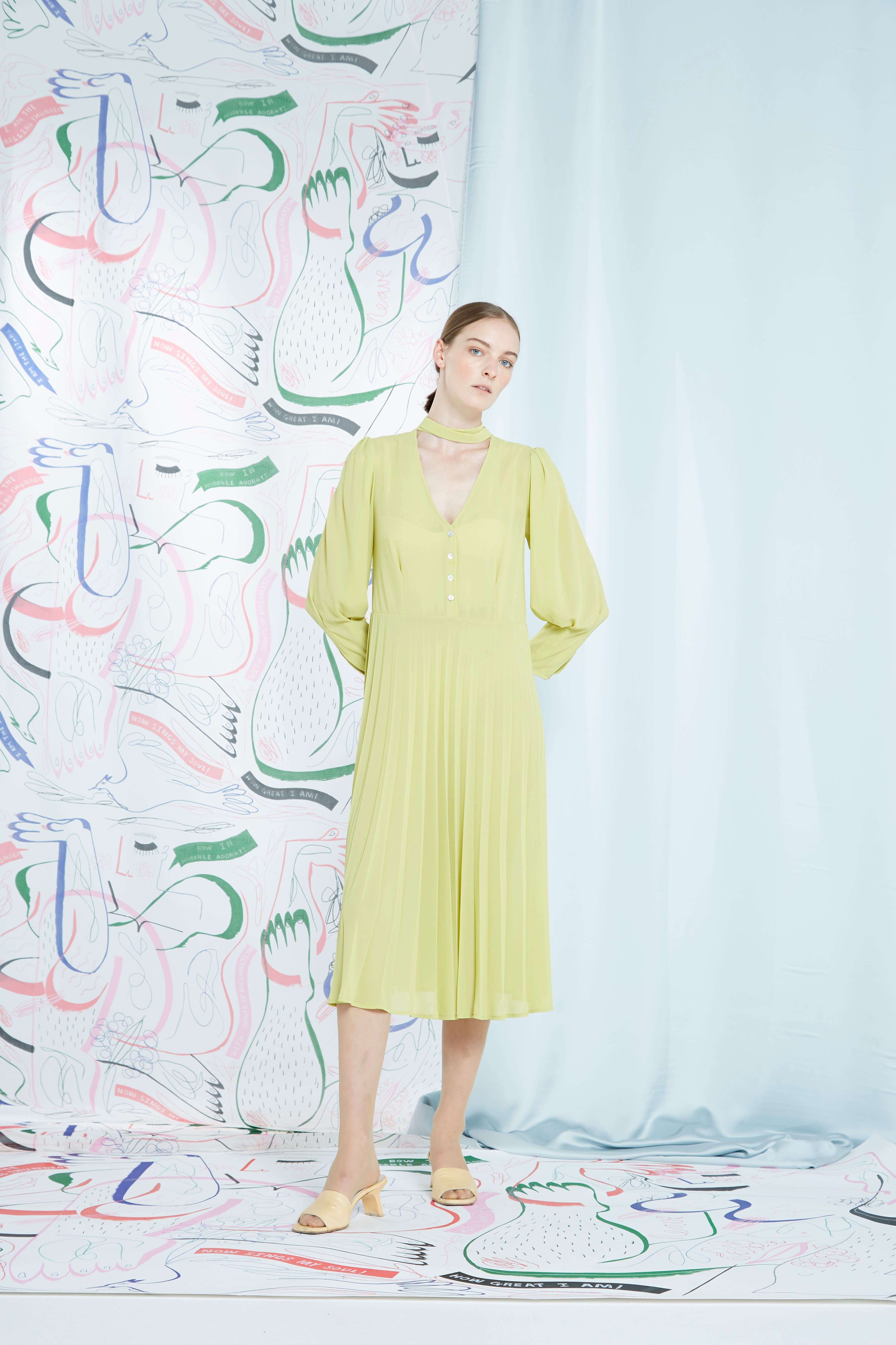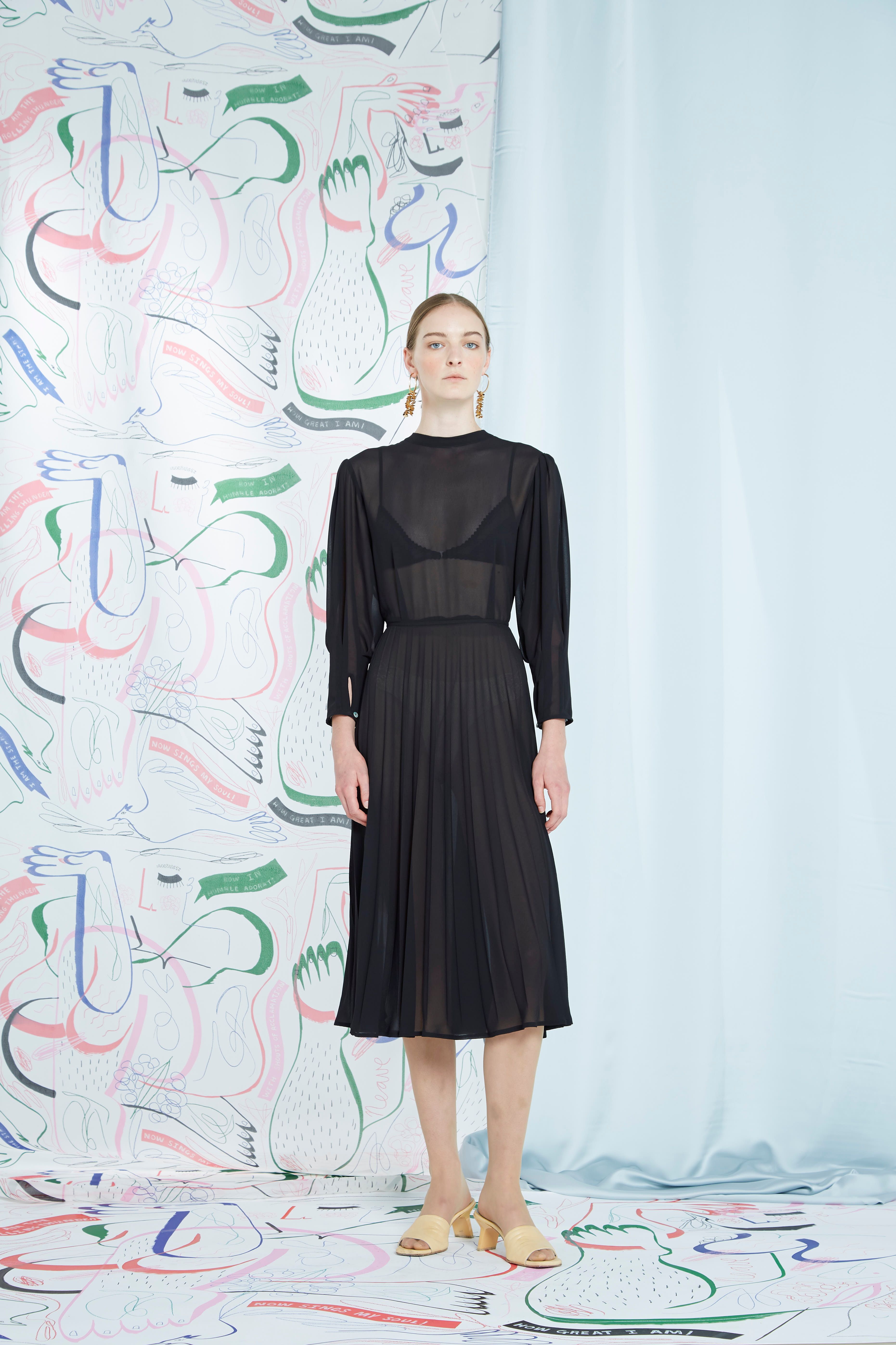 An elegant and flattering full circle skirt sunray pleated reversible dress, featuring a V neck shell button closer that can either be worn to the front or back. Ties come from top the shoulder and can be worn loosely tied and draped or wrapped around the neck. Tucks at waist and thin ties that wrap around to the front or back. Voluminous sleeve, sewn down pleats below elbow with a shell button and loop closure.