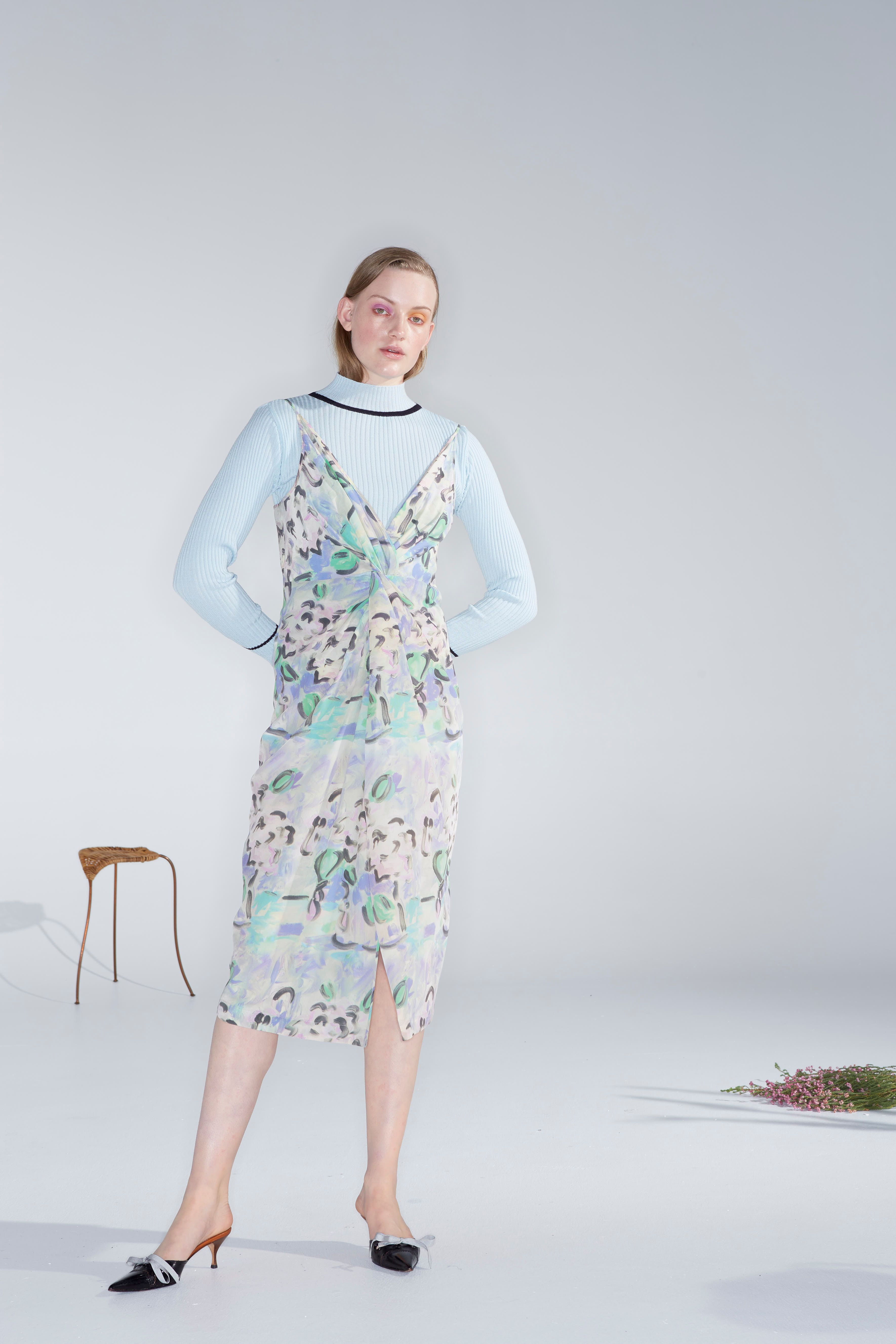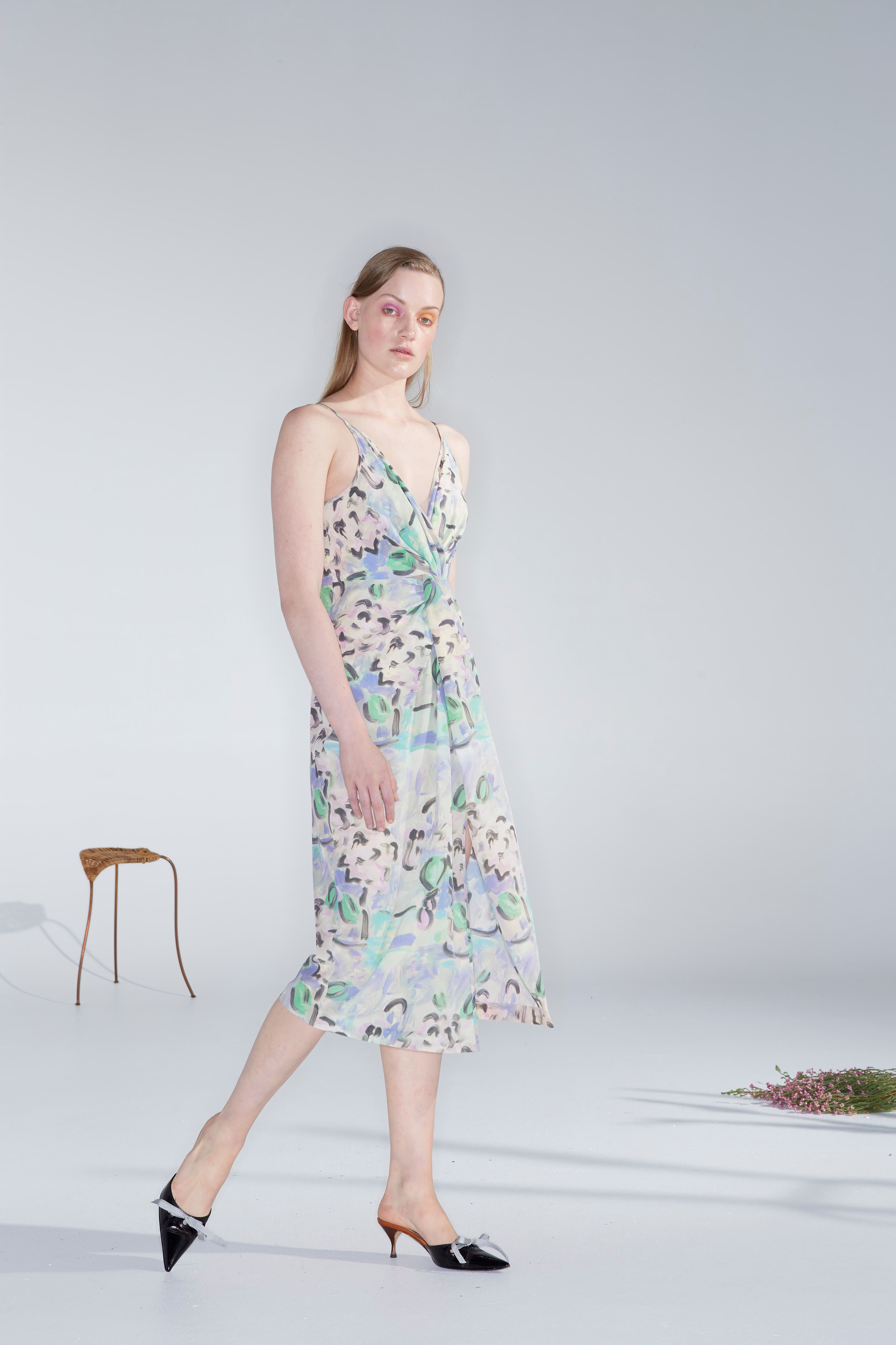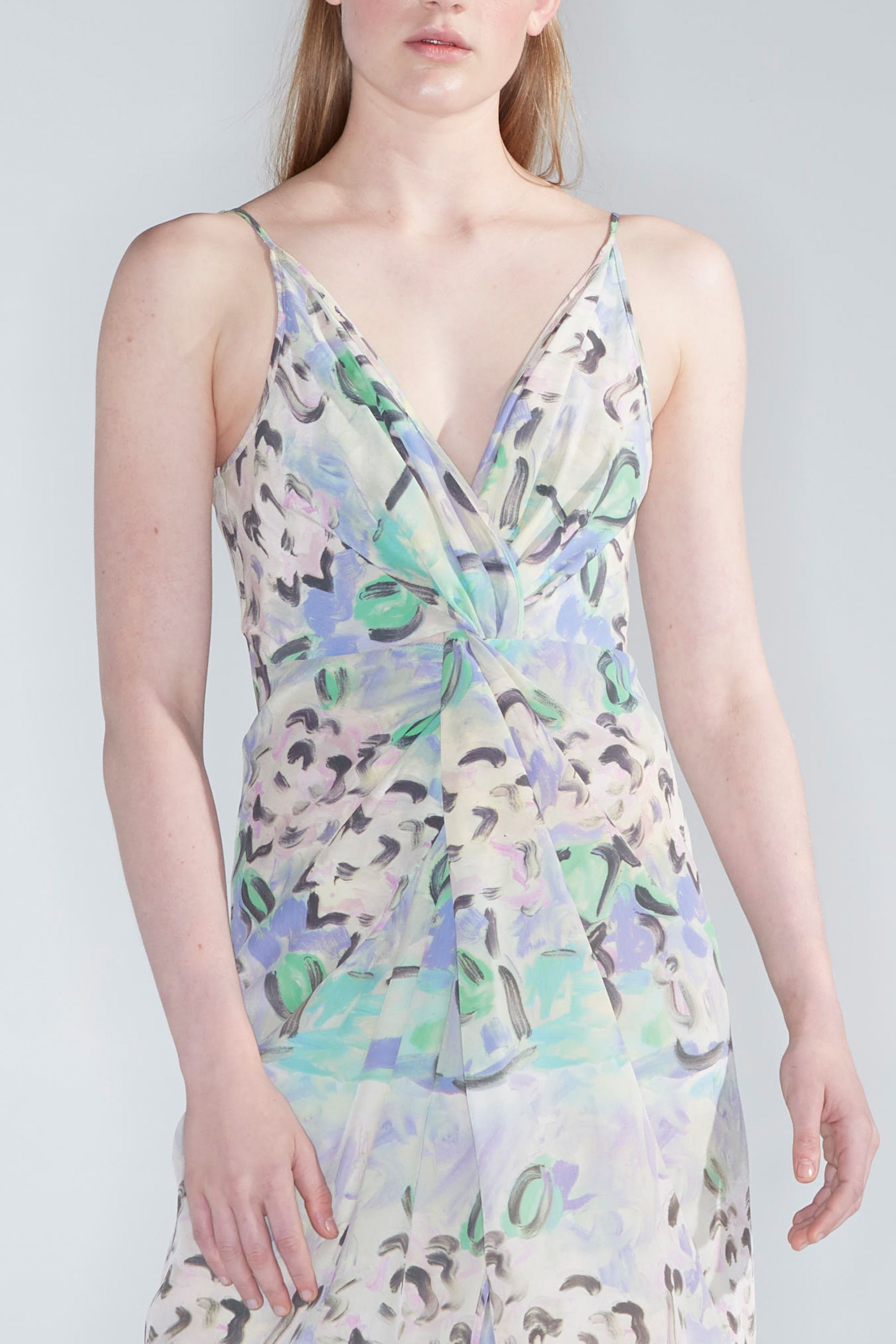 Romantic draping and classic elegance. Thin straps over the shoulders with cross over detailing at the chest. Silk drapes to meet at the centre waist in a knot. Skirt falls over the hips and reaches below the knee. Shallow split up the centre of the skirt.