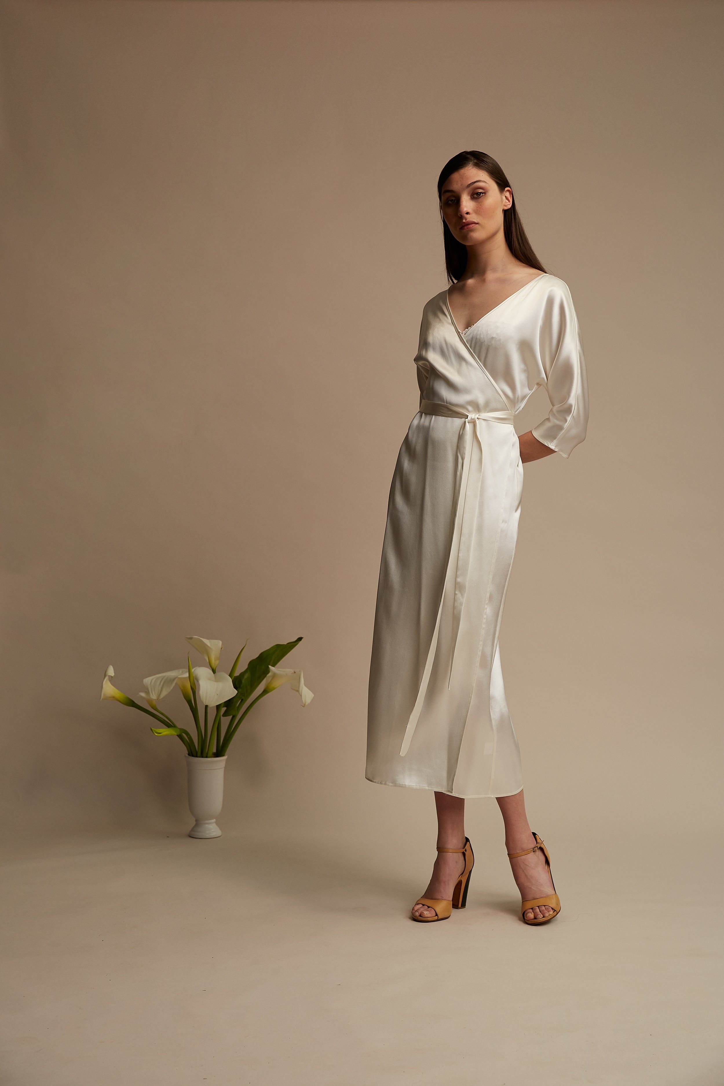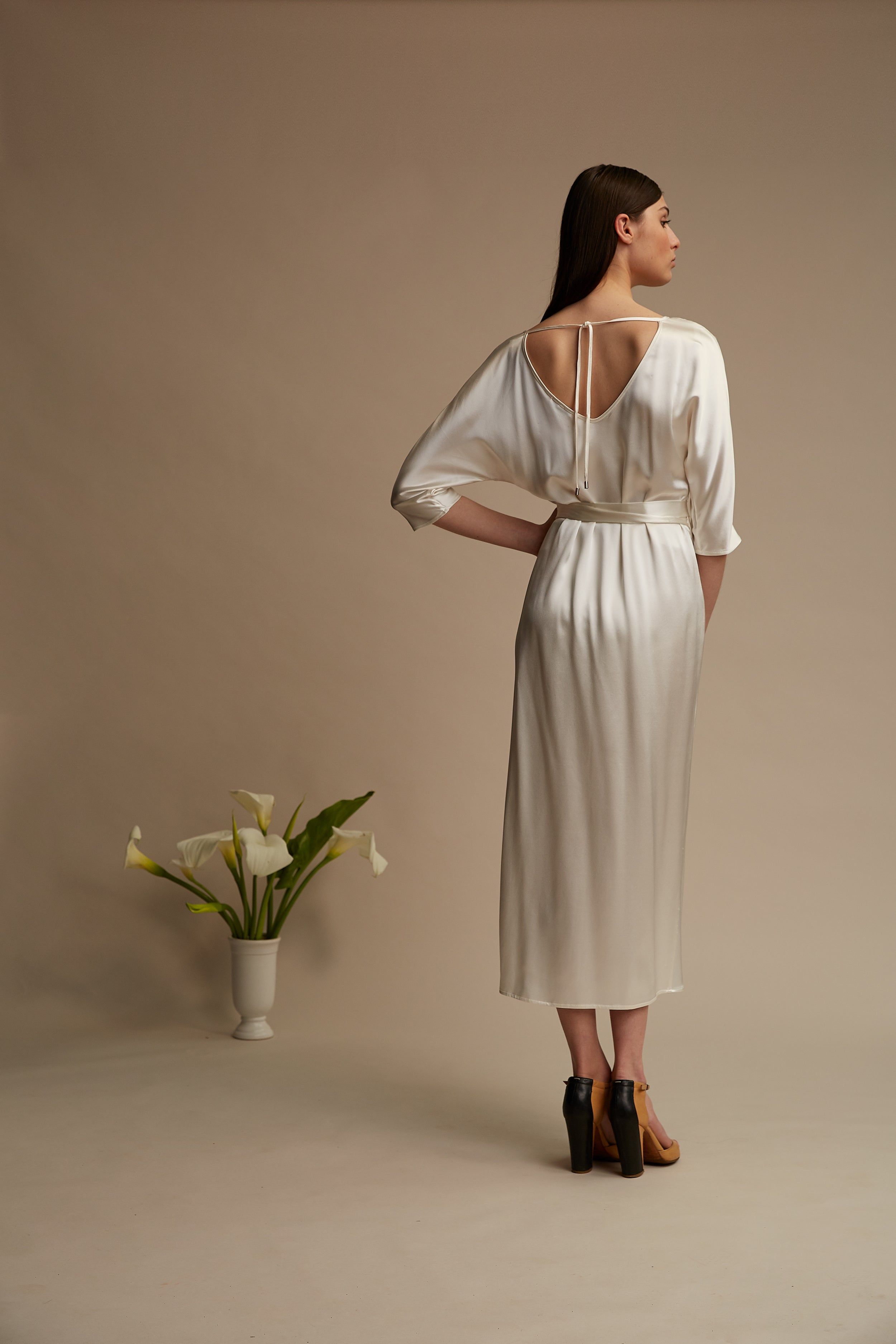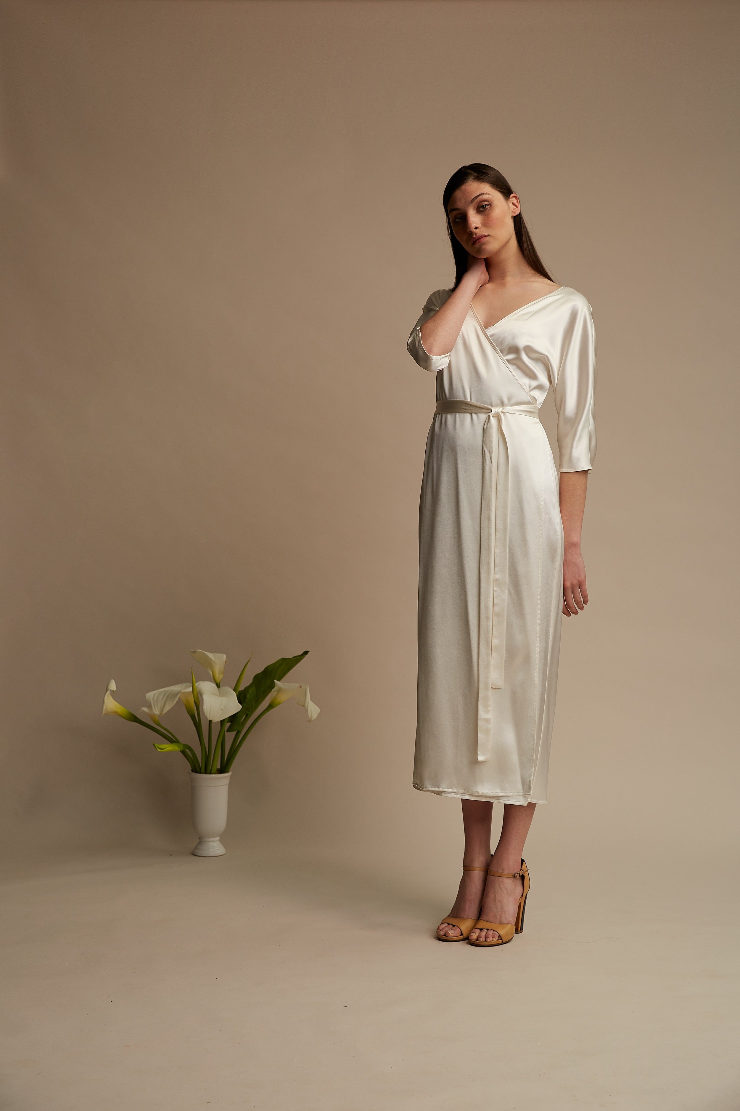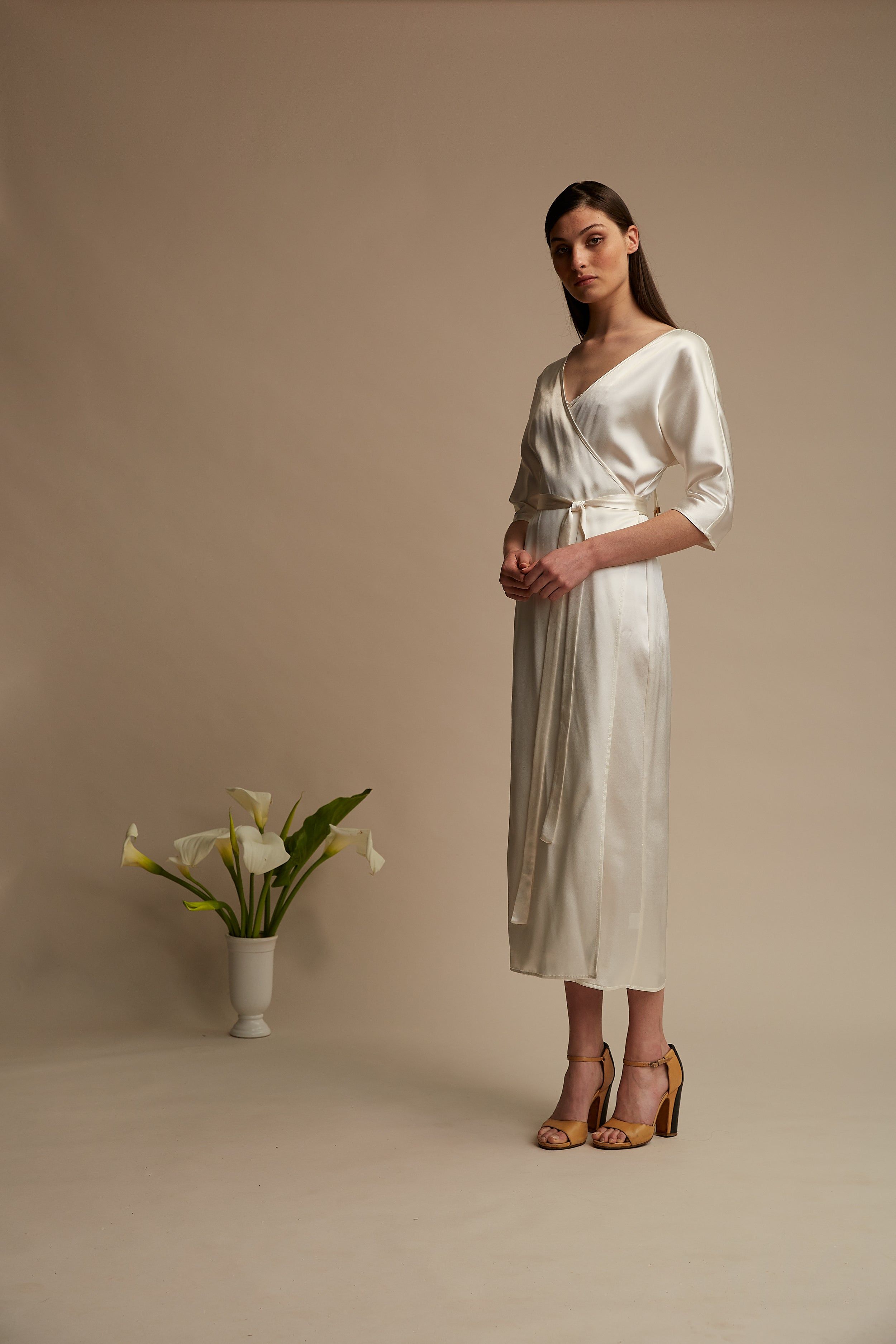The Magnolia dress wraps in a lustrous, heavy satin silk. Refined glamour and simplicity. Reversible dress that can be worn crossing over at the front or back. The reverse features a plunging V-line and ties to secure at the shoulder. Wraps and ties at the waist. Sleeves fall to ¾ length. The hem finishes at mid calf.