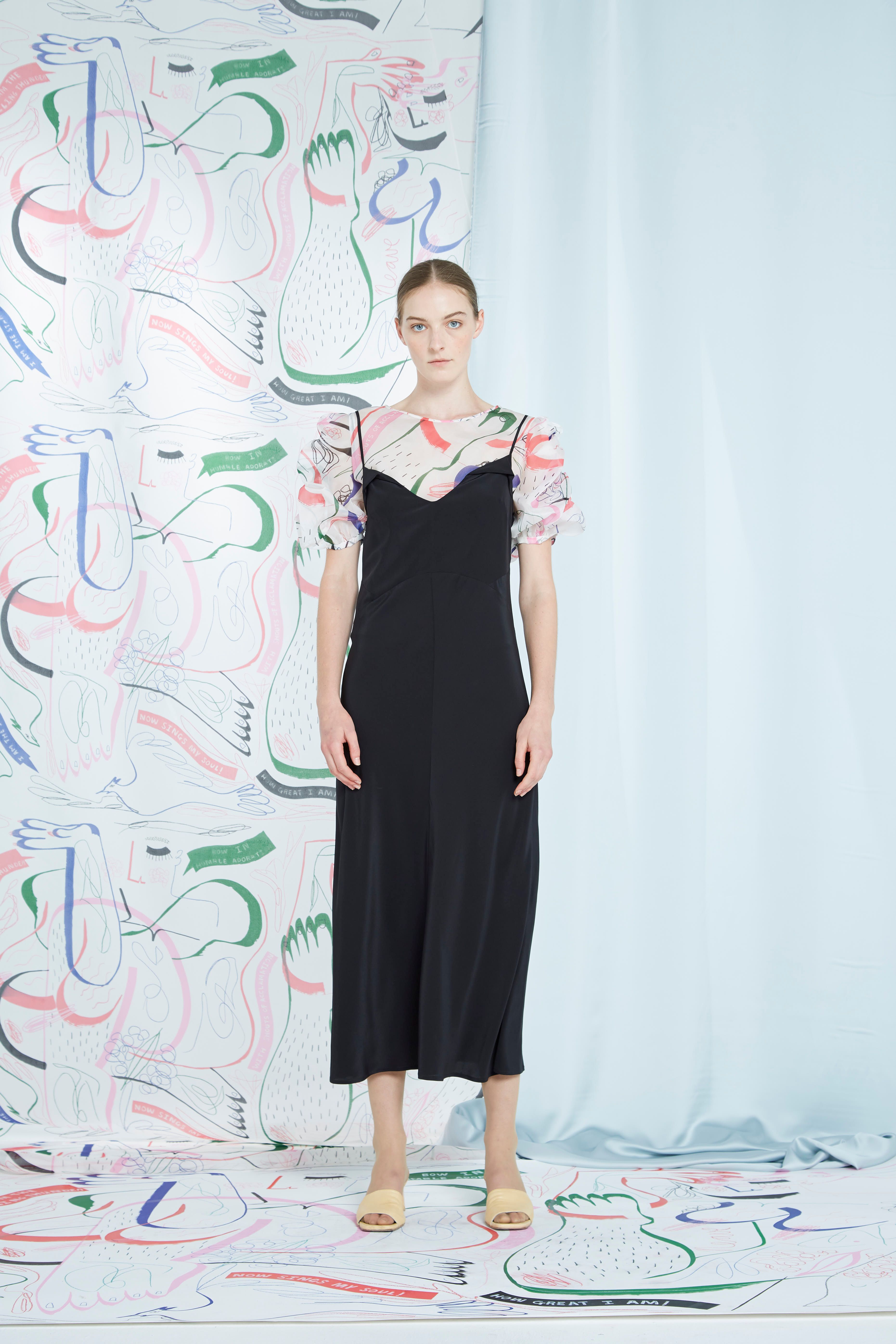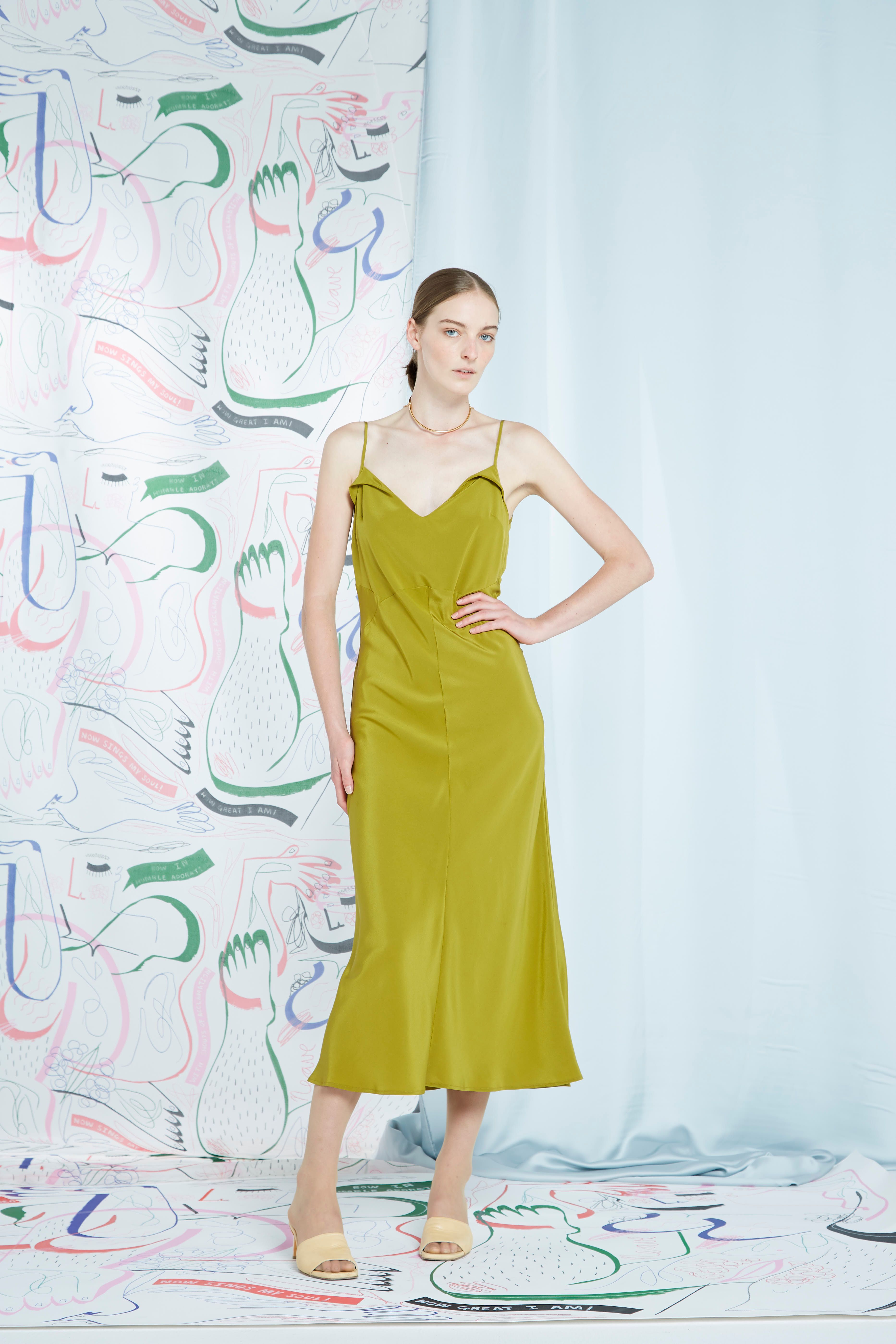 An ankle length bias cut slip dress, featuring triangular puzzled panels. Thin adjustable straps with a unique fold over detail at top of strap. Seams run down the center front and back of the slip.