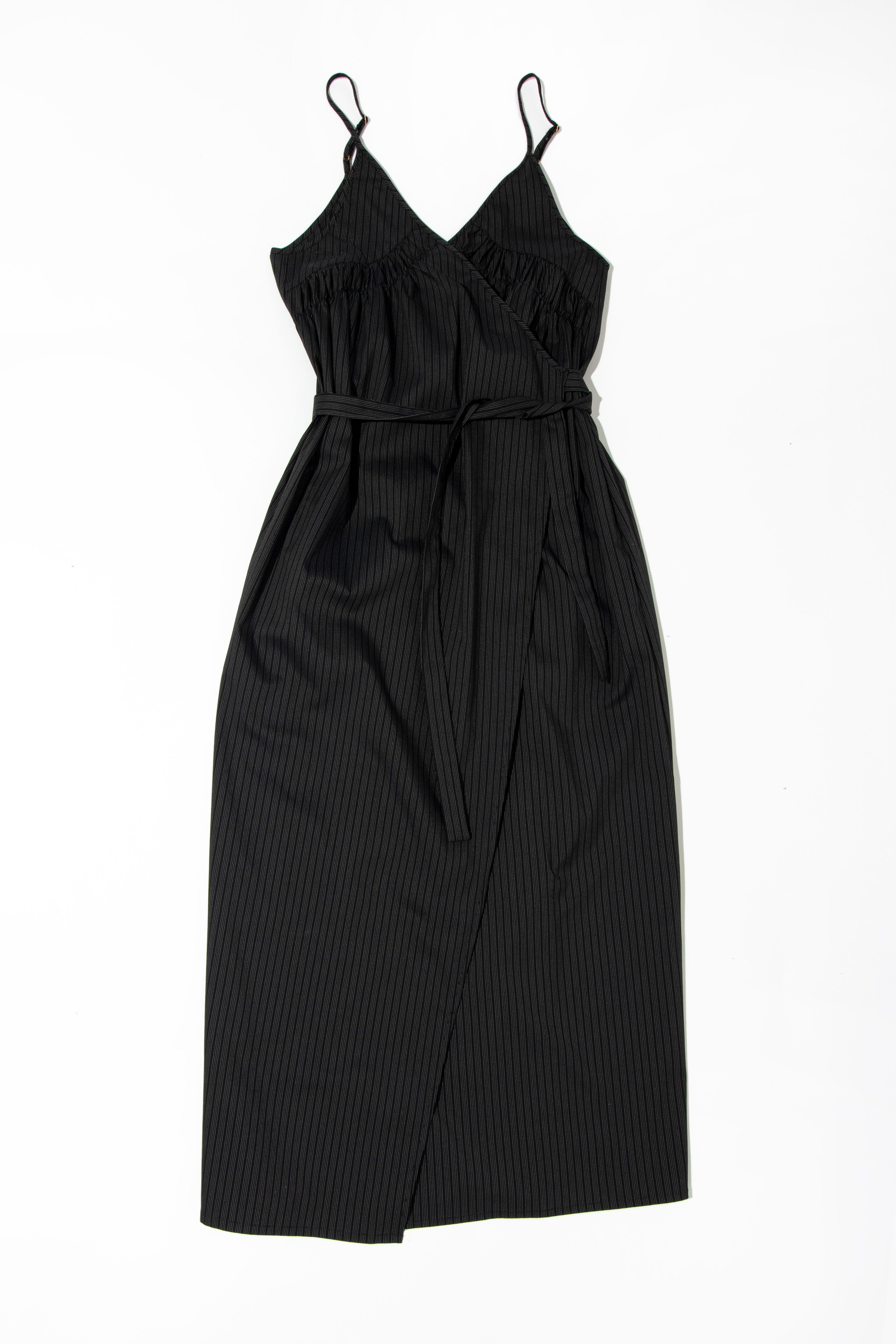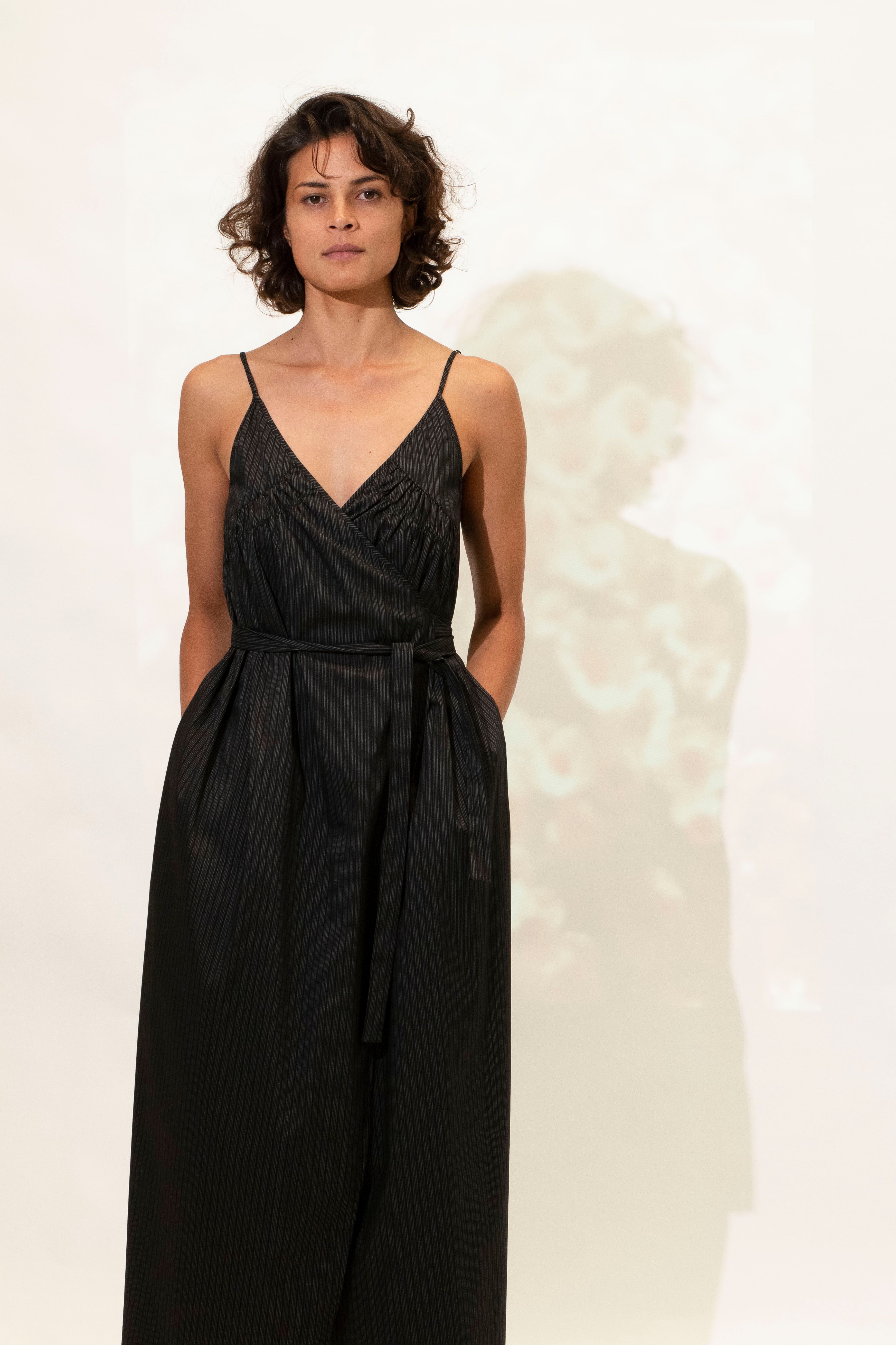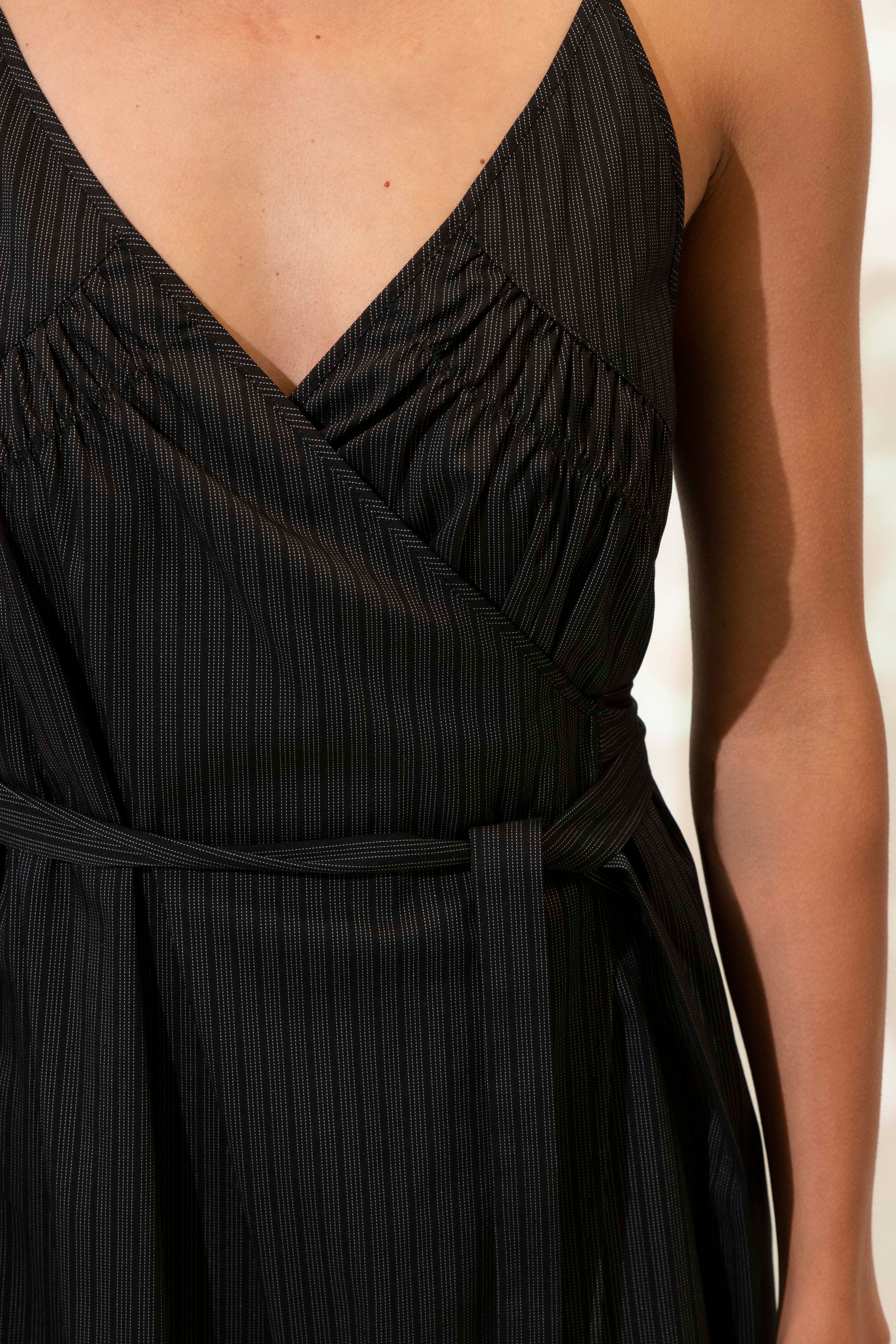 Fine, adjustable straps. Wraps to create V neck. Ties at the waist to create shape. Skirt follows a petal-like shape and wrap creates a natural split in the skirt.