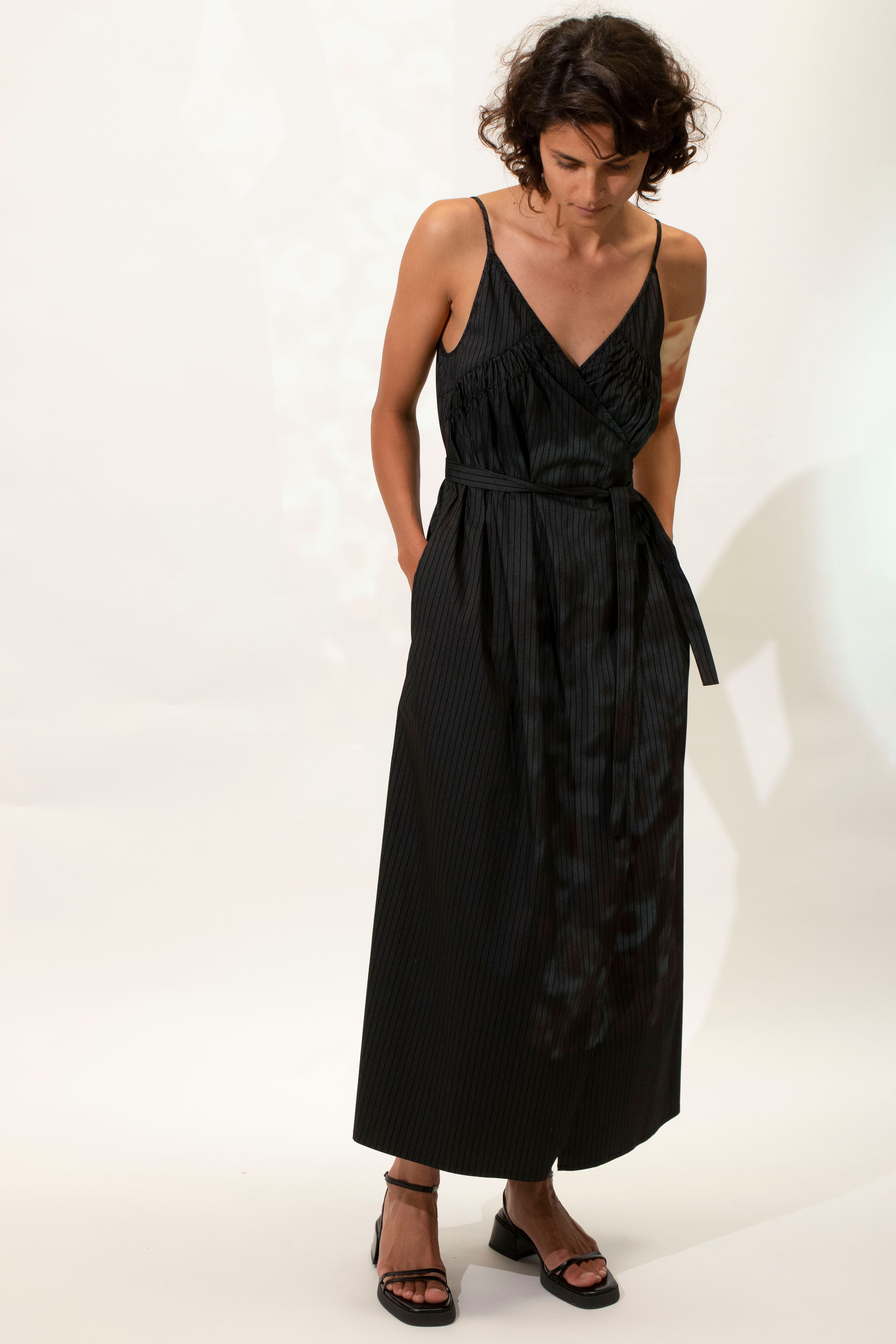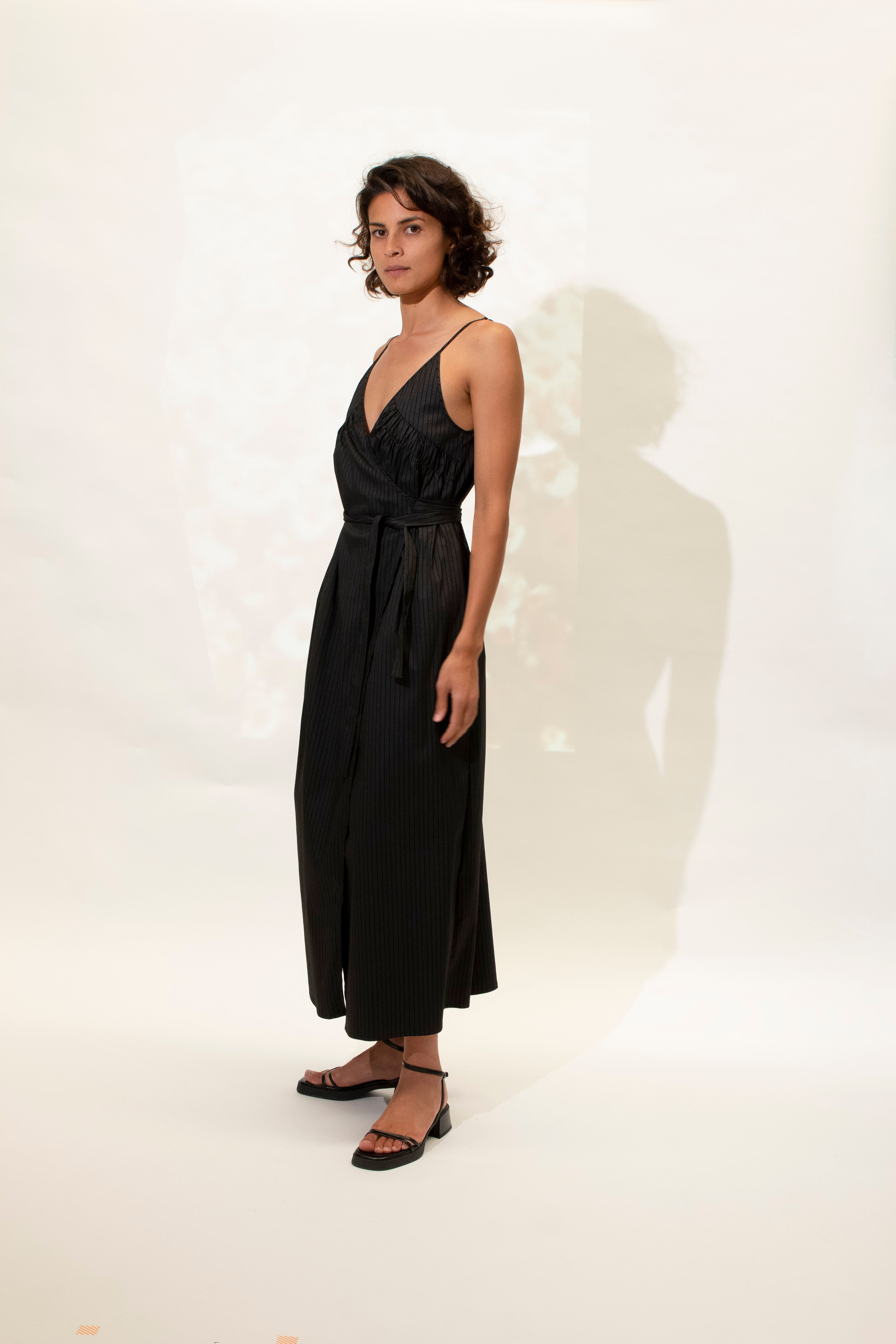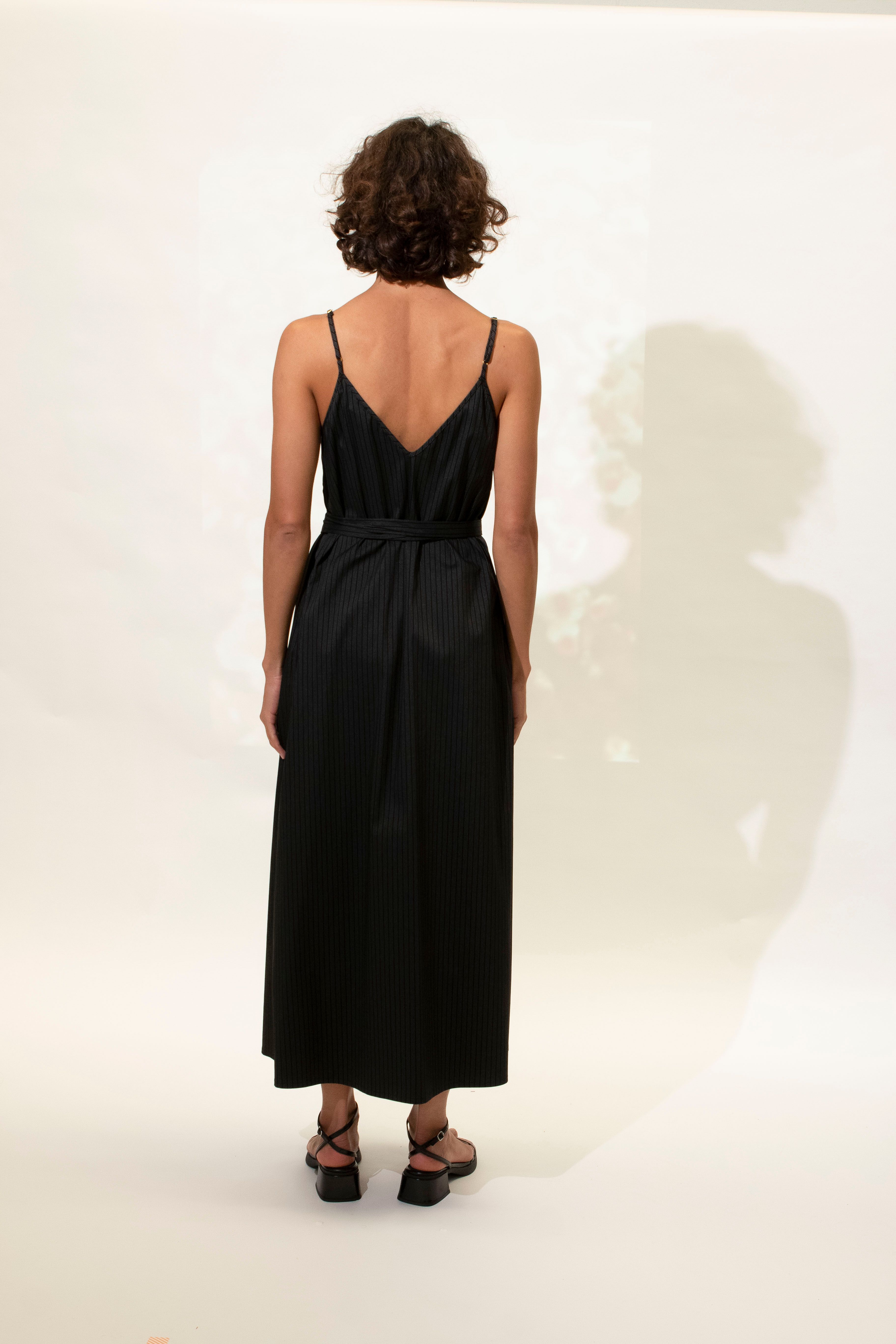 Fine, adjustable straps. Wraps to create V neck. Ties at the waist to create shape. Skirt follows a petal-like shape and wrap creates a natural split in the skirt.