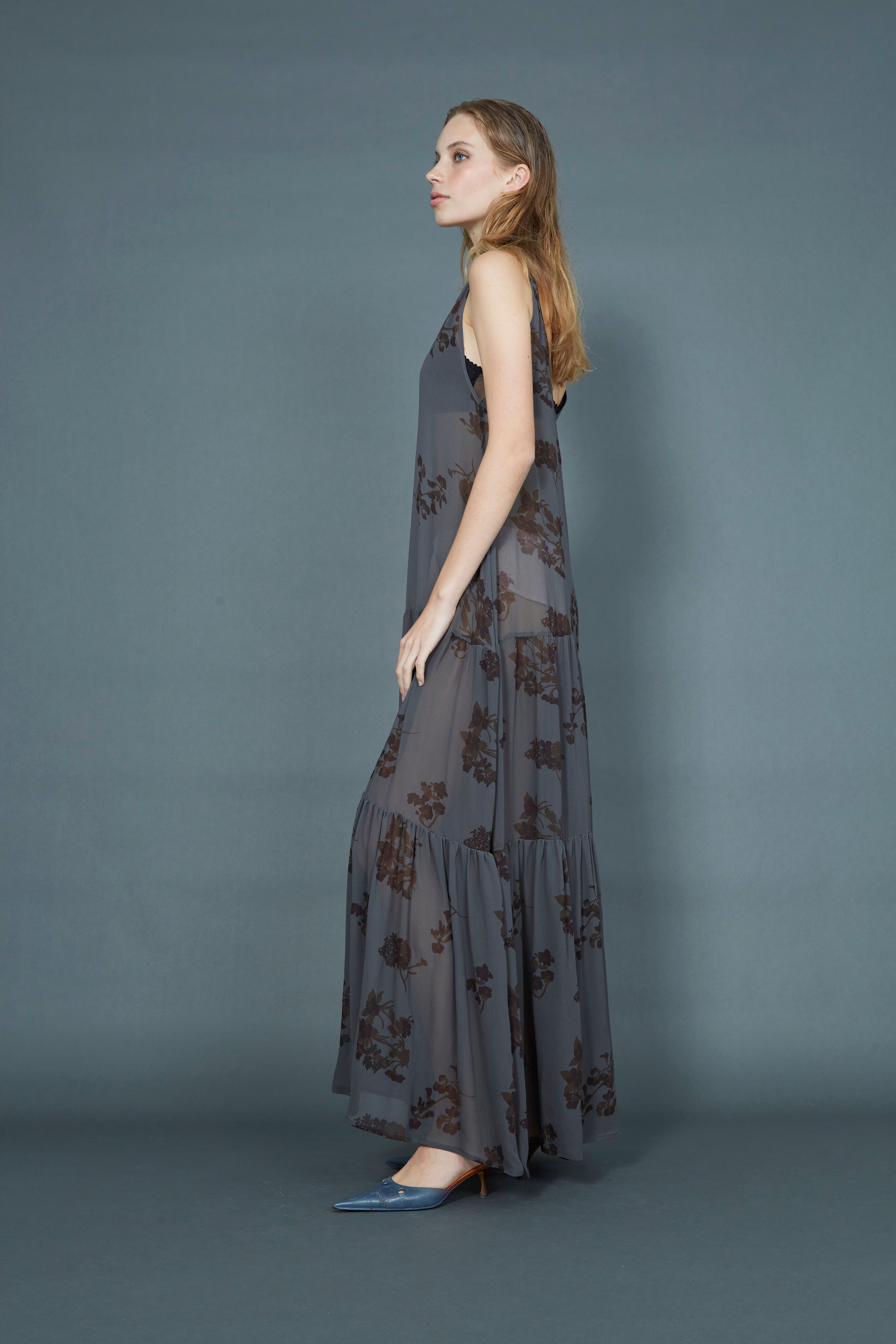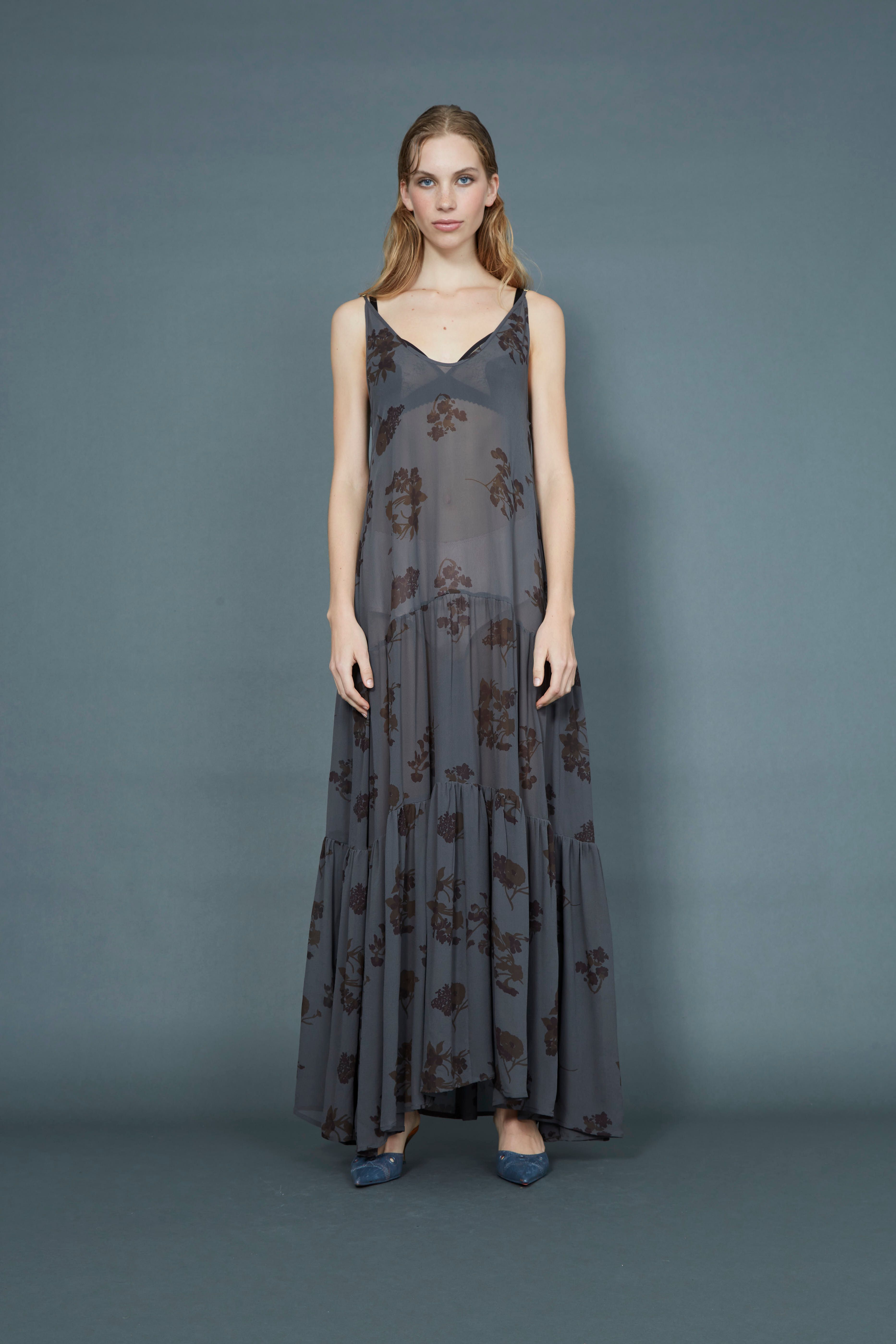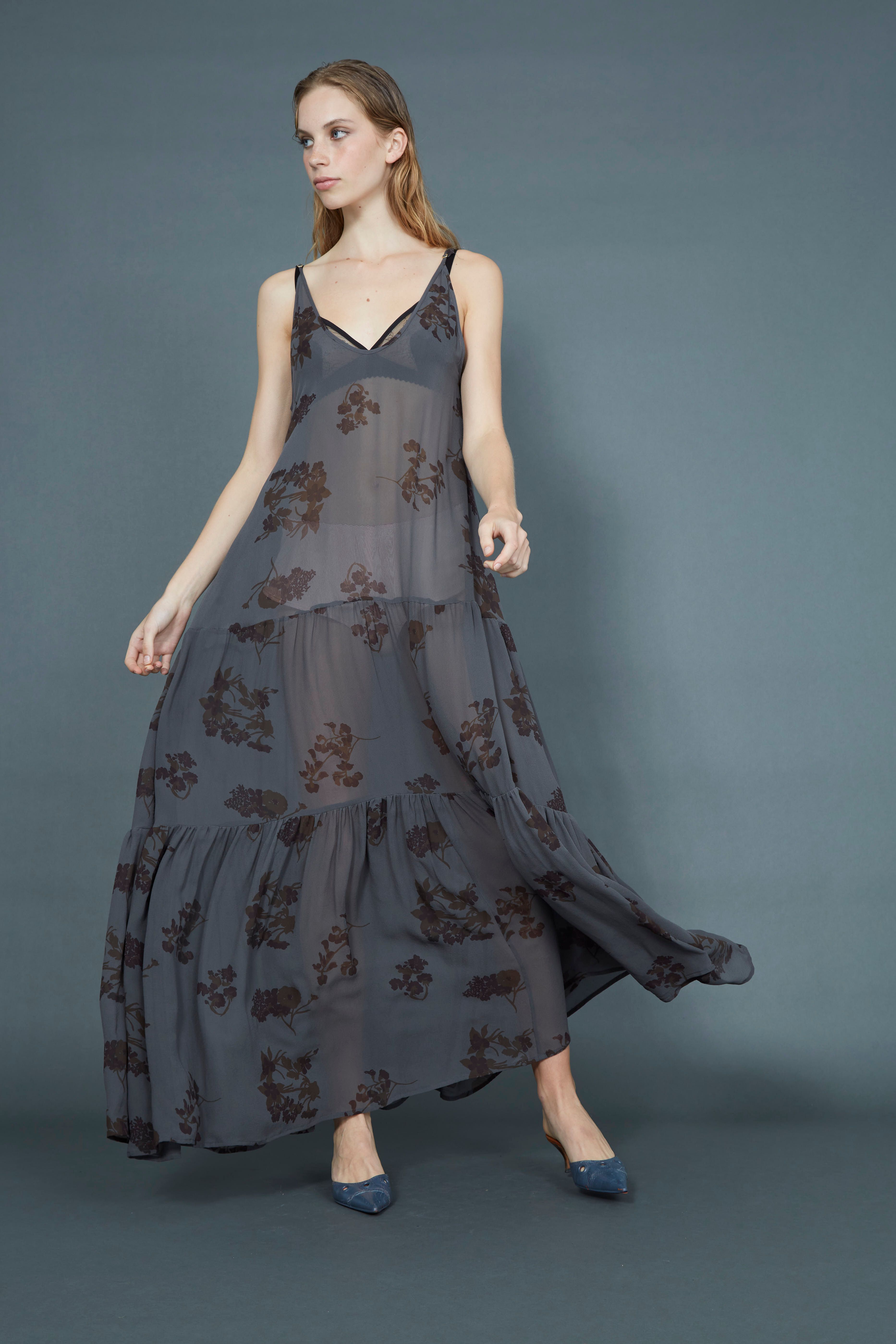 Fine, adjustable straps Tiered, gathered skirt begins from the low waist Floor length