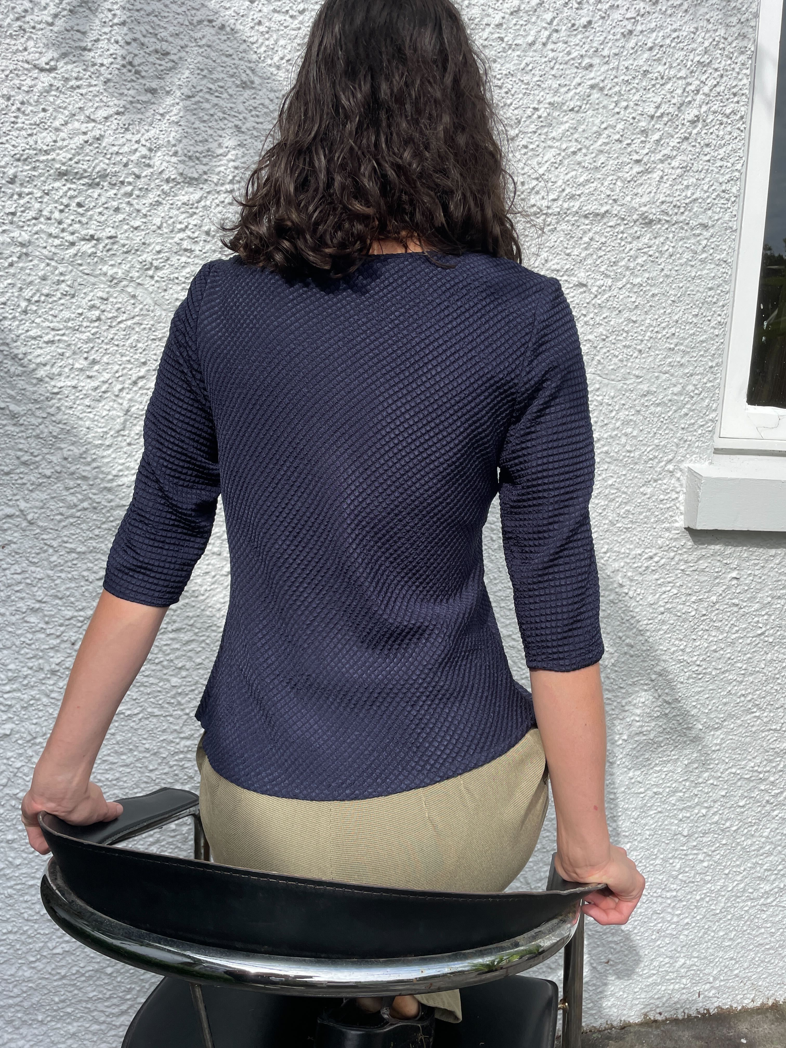 Bias cut finishing at the hip Sleeves skim the elbow French seamed inside Bound neckline