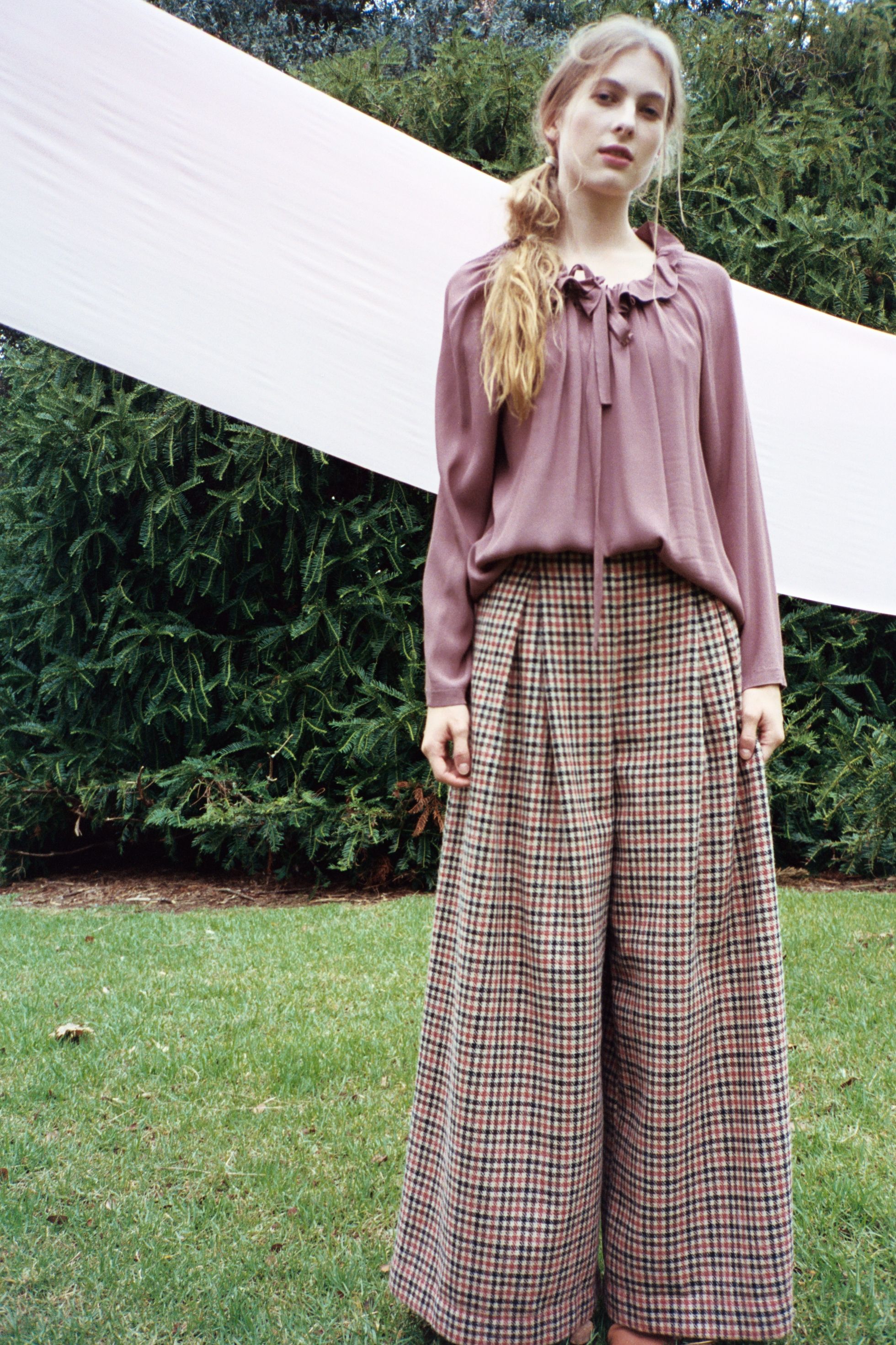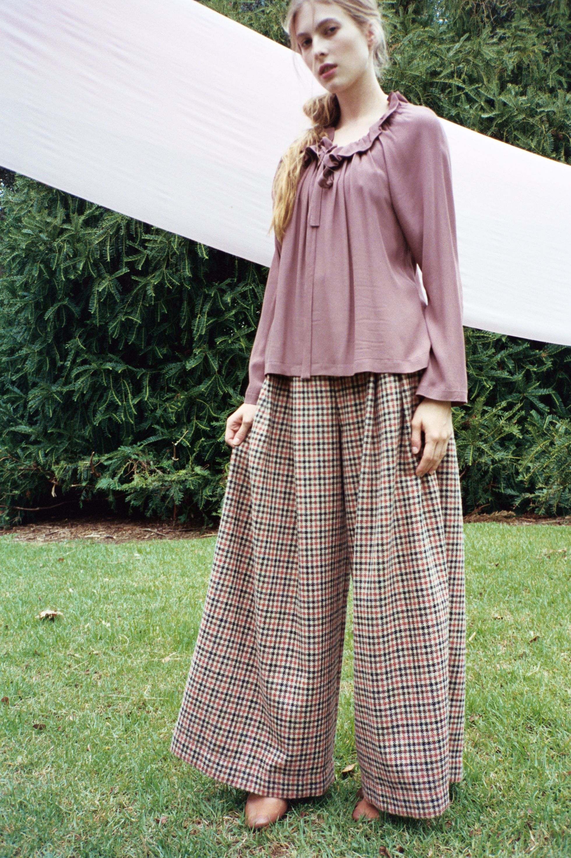 Voluminous and drapey, the Nettle top a dream to wear in a soft viscose. Relaxed, feminine shape. Drawcord neck can be worn pulled in or wide across the shoulders. Tie to reveal keyhole detail or leave loose. Long straight cut sleeves and boxy through the body. Hem finishes at hips.