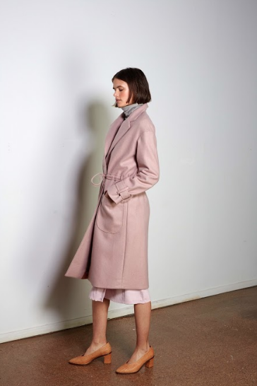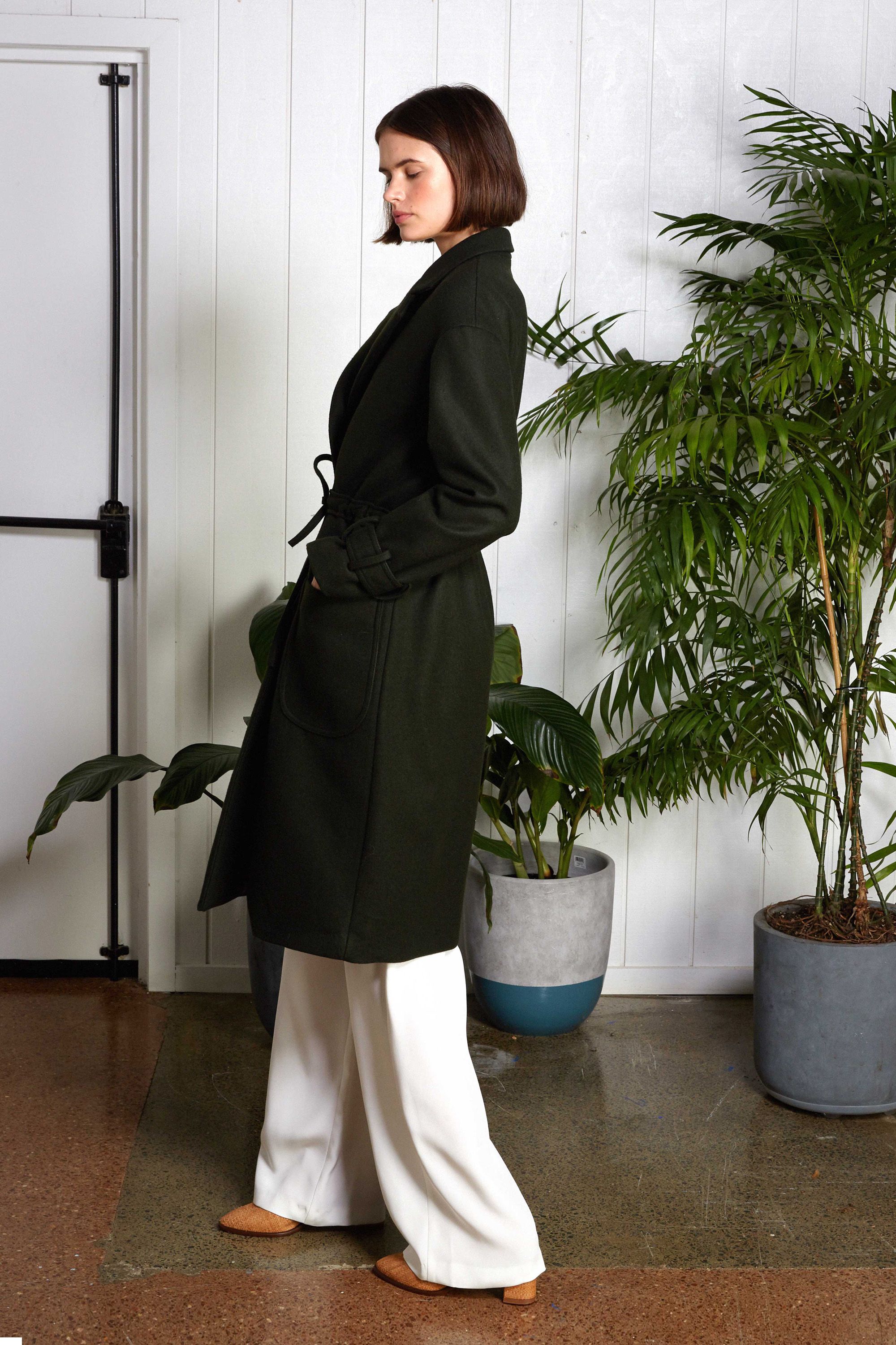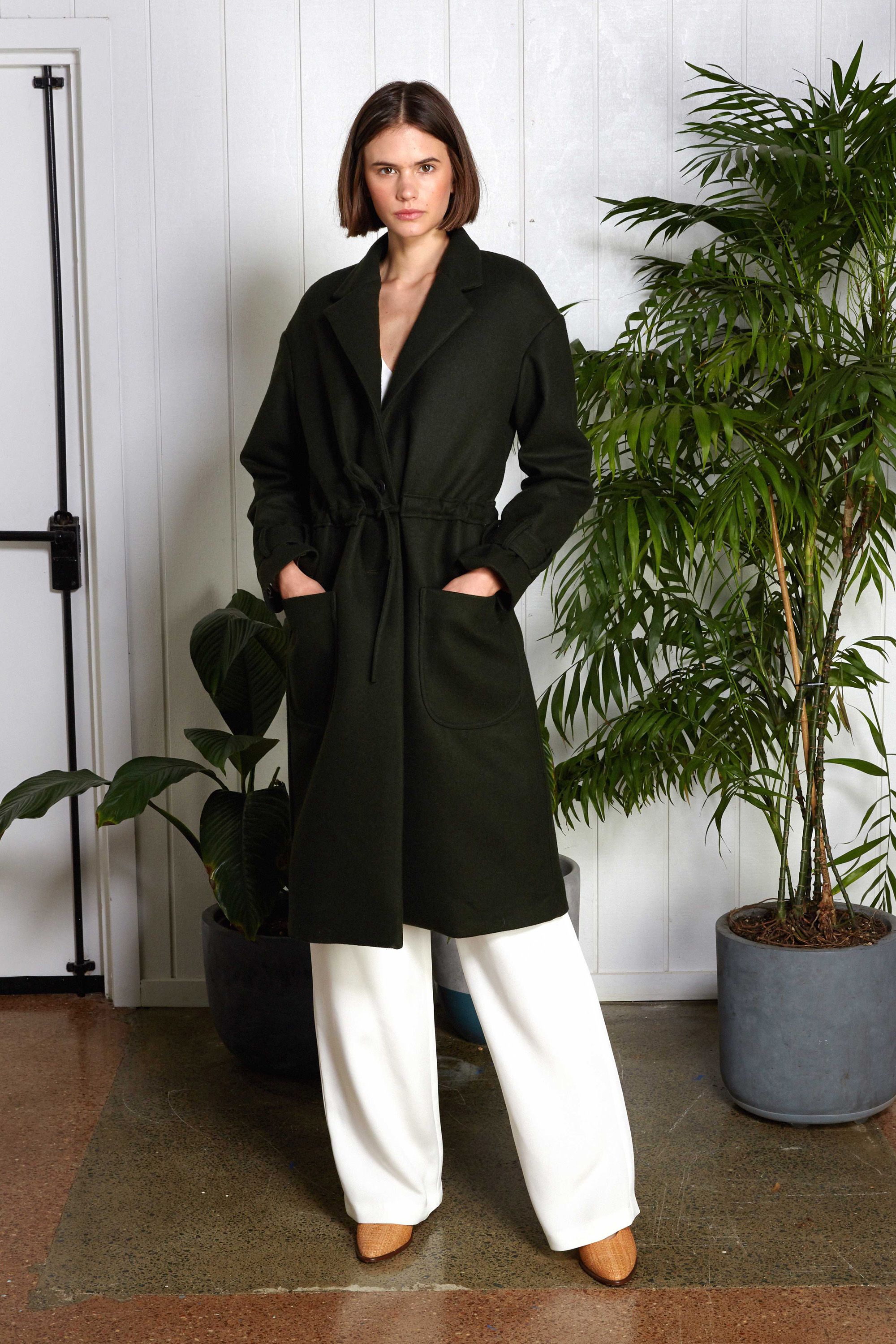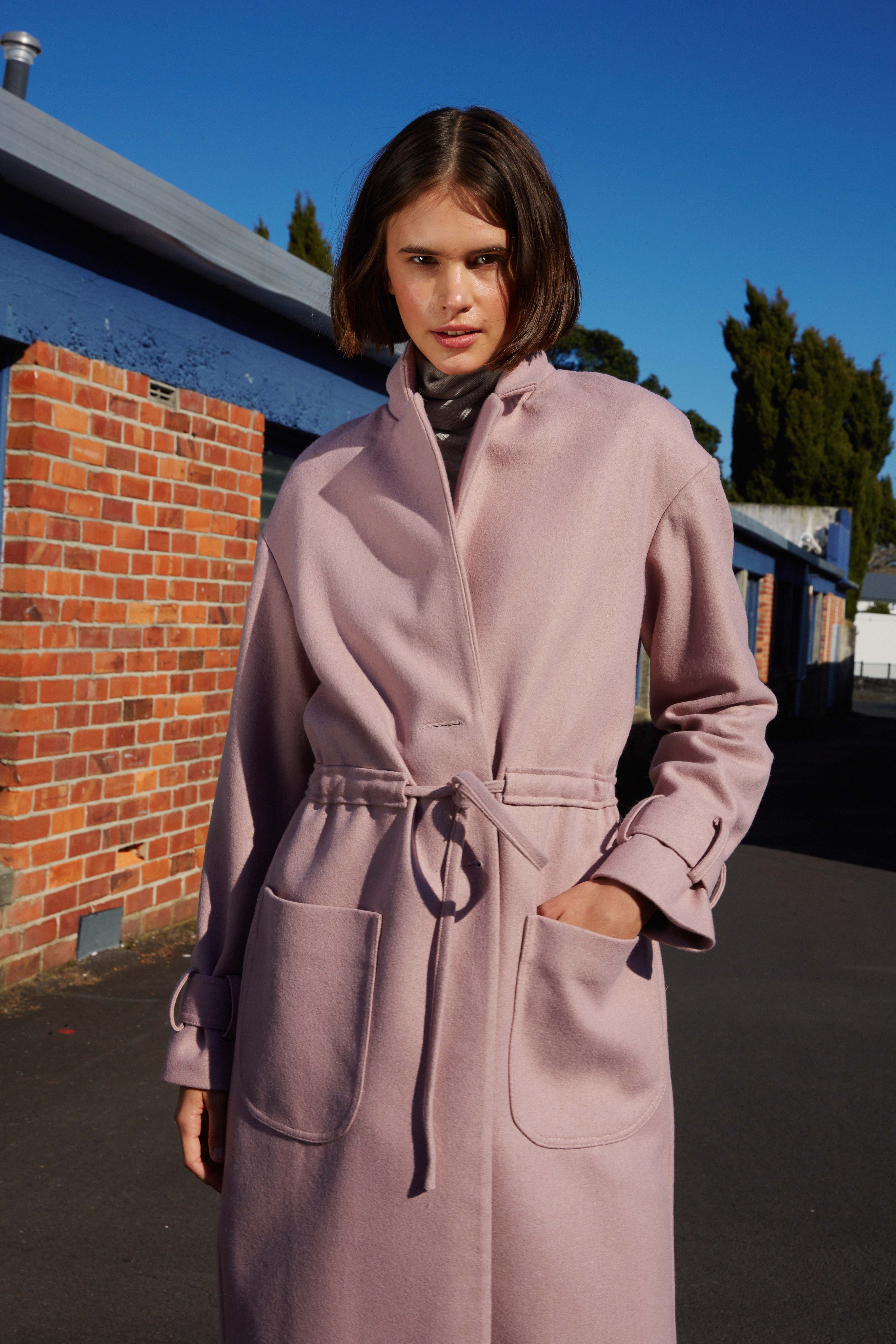 Slim collar traces to close at waist with singular button. Waist tie can be cinched to create shape or left straight through the waist. Dropped shoulders and full length sleeves finish with wide wrist tie and button detail. Rounded pockets at either side of hips. Hem finishes above the knee.