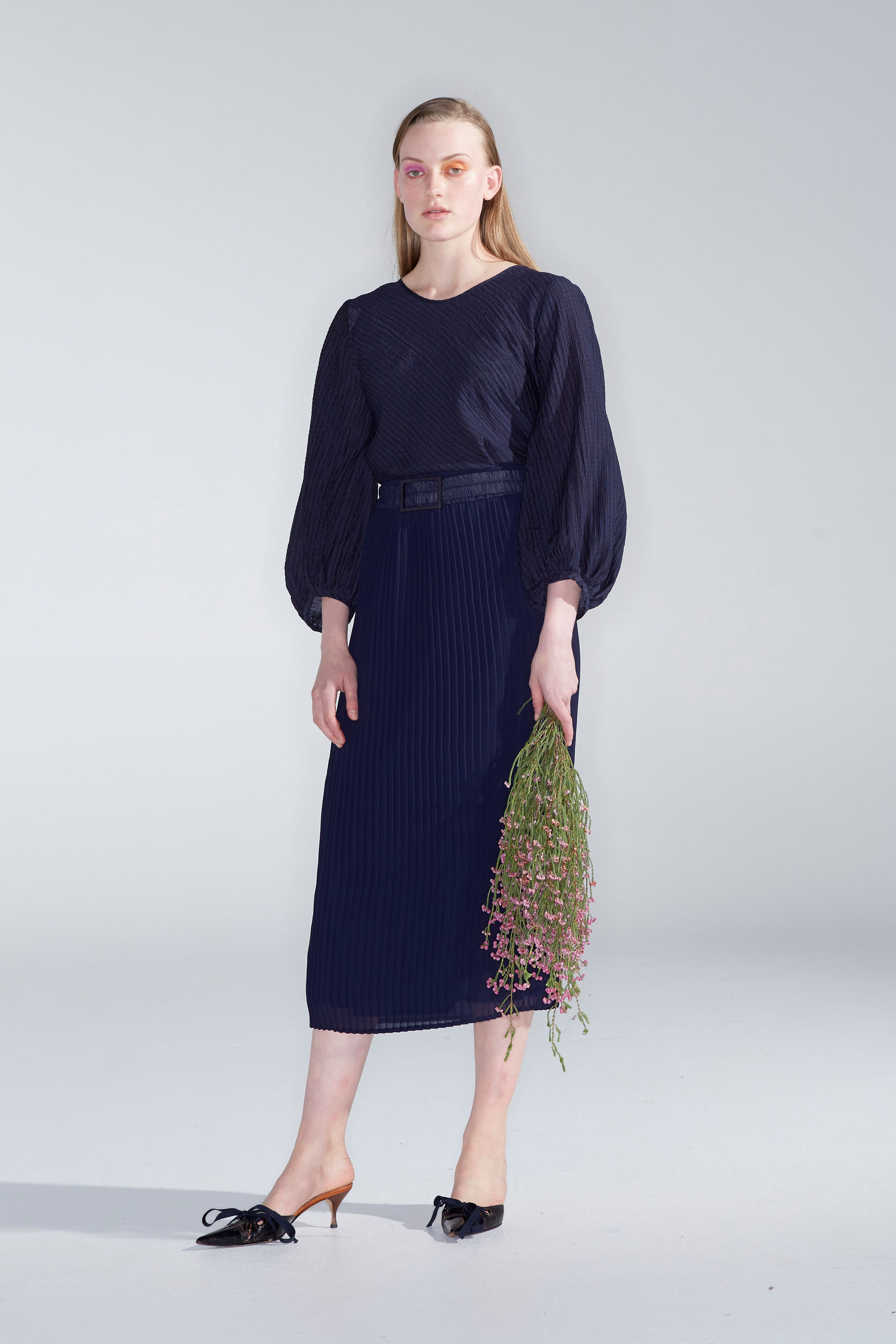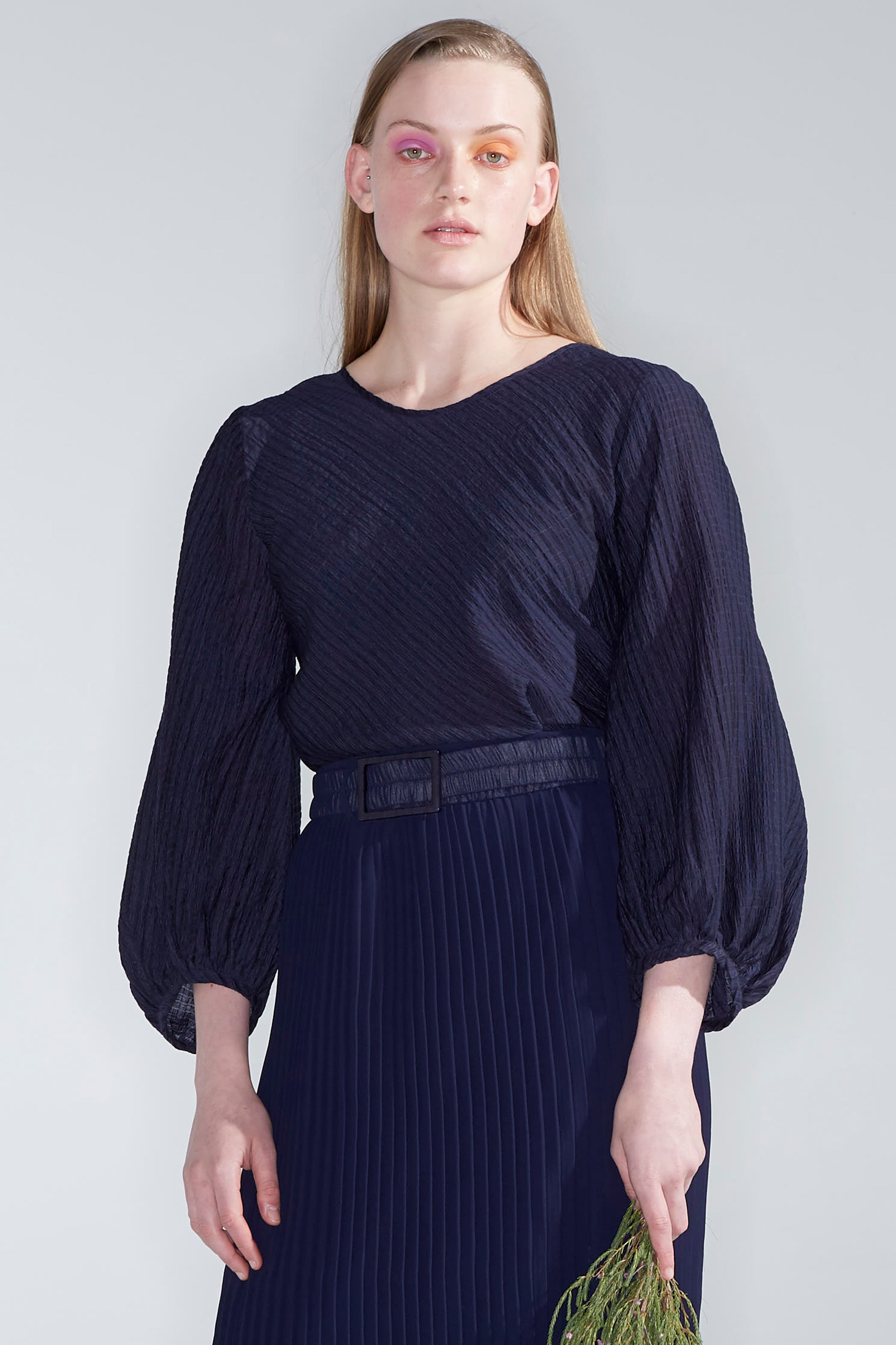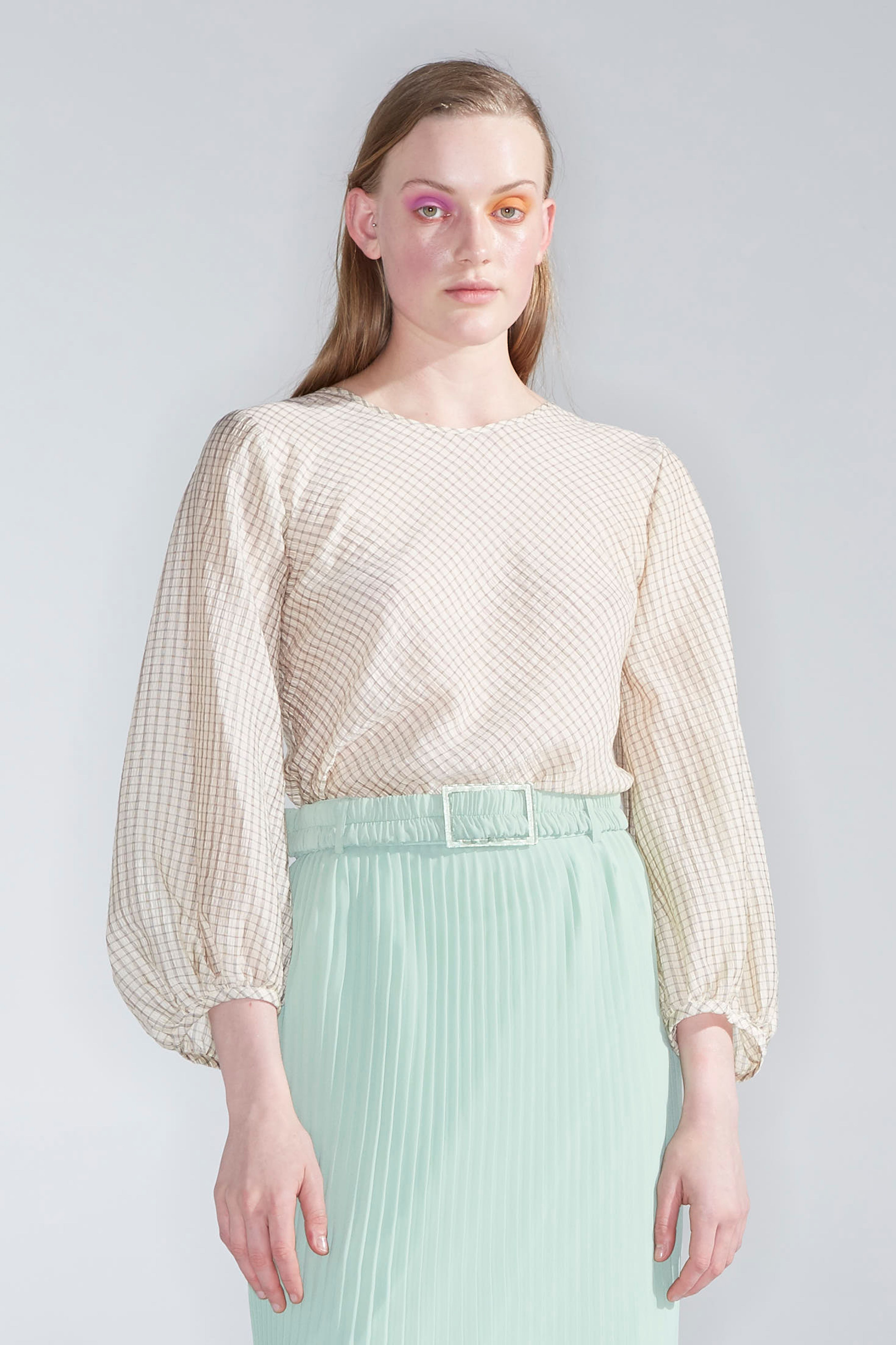 A lightweight textured check fabric, ever so slightly sheer and easy to care for. Rounded neckline, sitting below the collarbone, neat on the shoulder with the back neckline scooping lower. A versatile style with the option to wear reversed. Bias cut through the body for a flattering fit. With sleeves that beautifully billow at the bottom and gather at the cuff, also known as a bishop sleeve. Hem finishes at the hips.