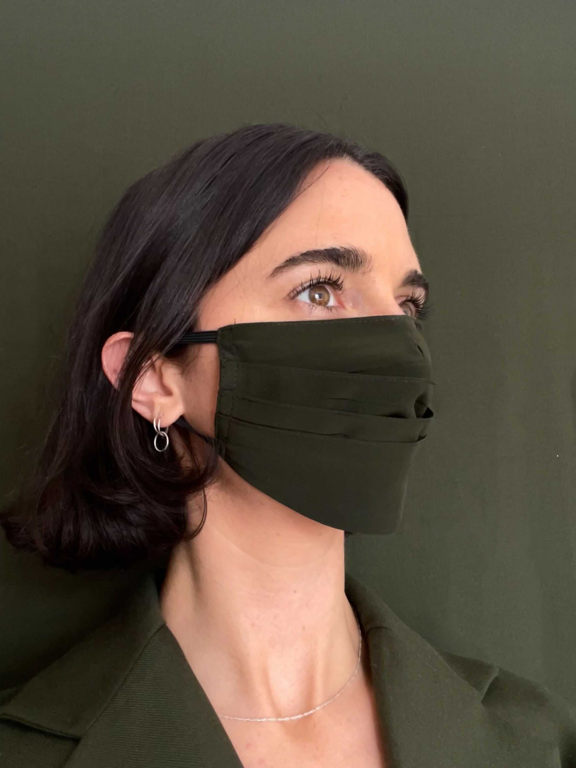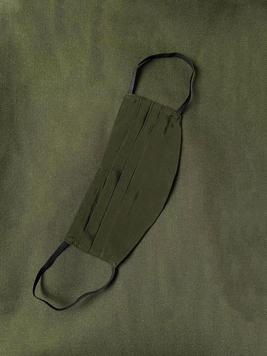 Accordion pin-tucked reusable mask. Has elastic loops for comfort and ease.