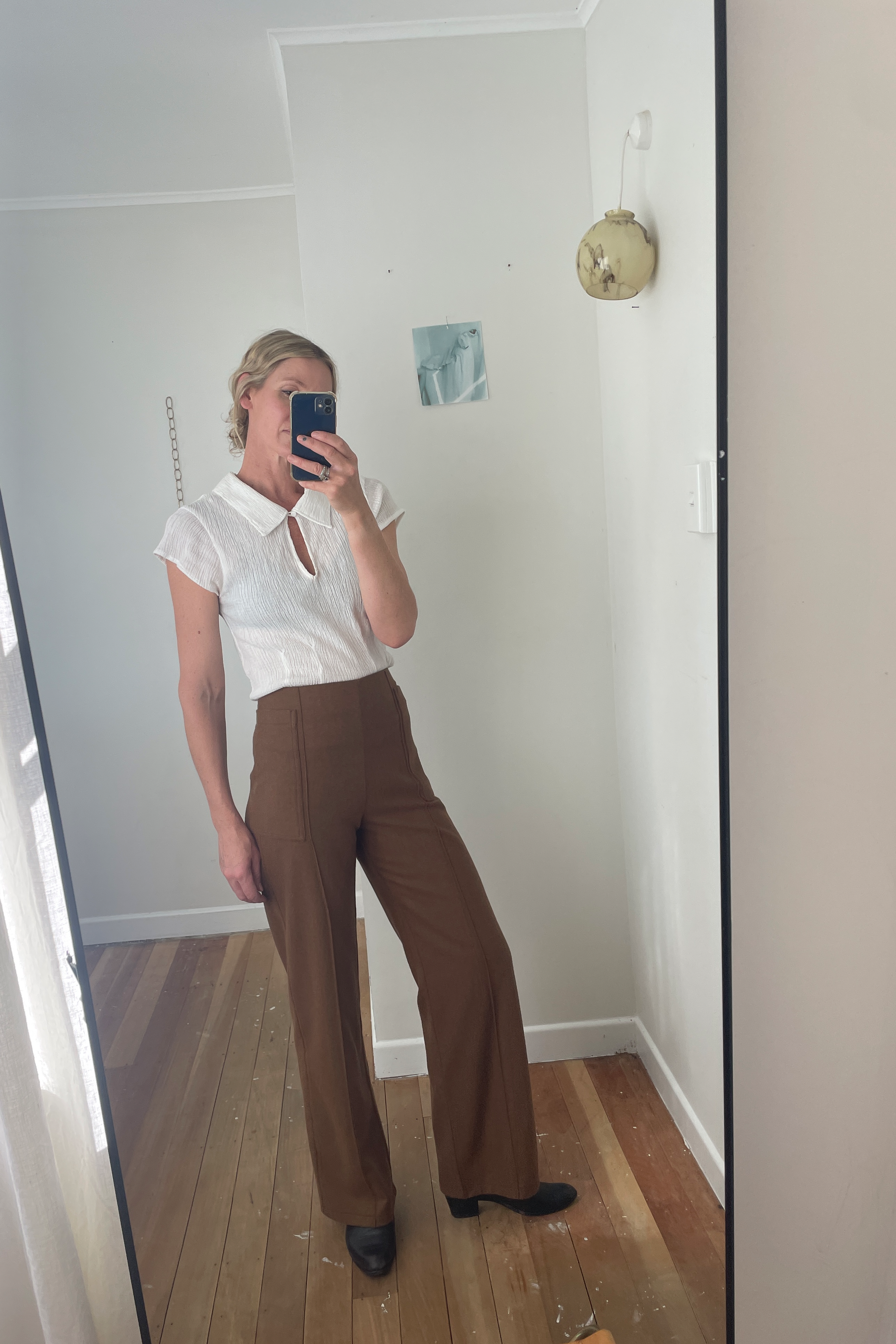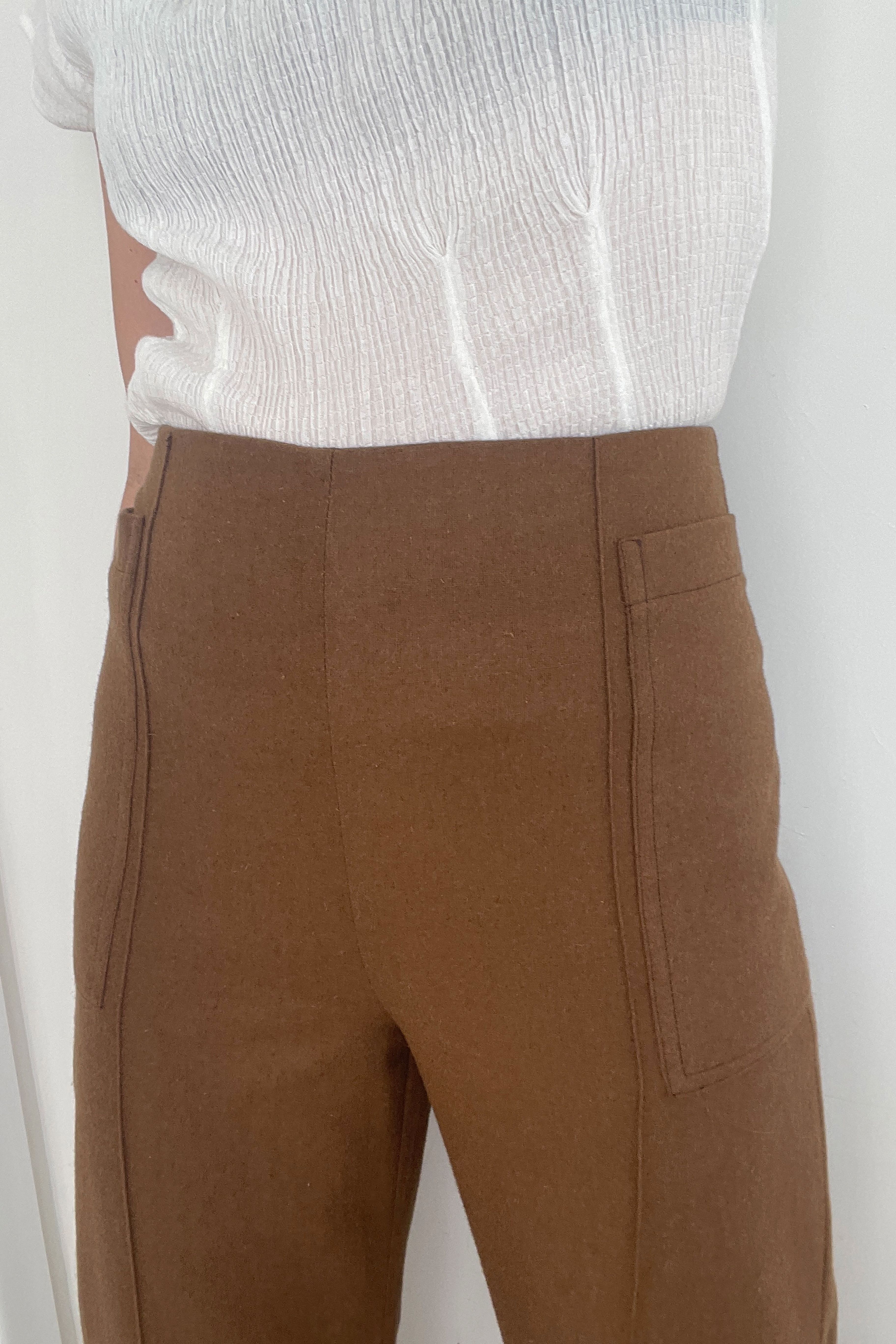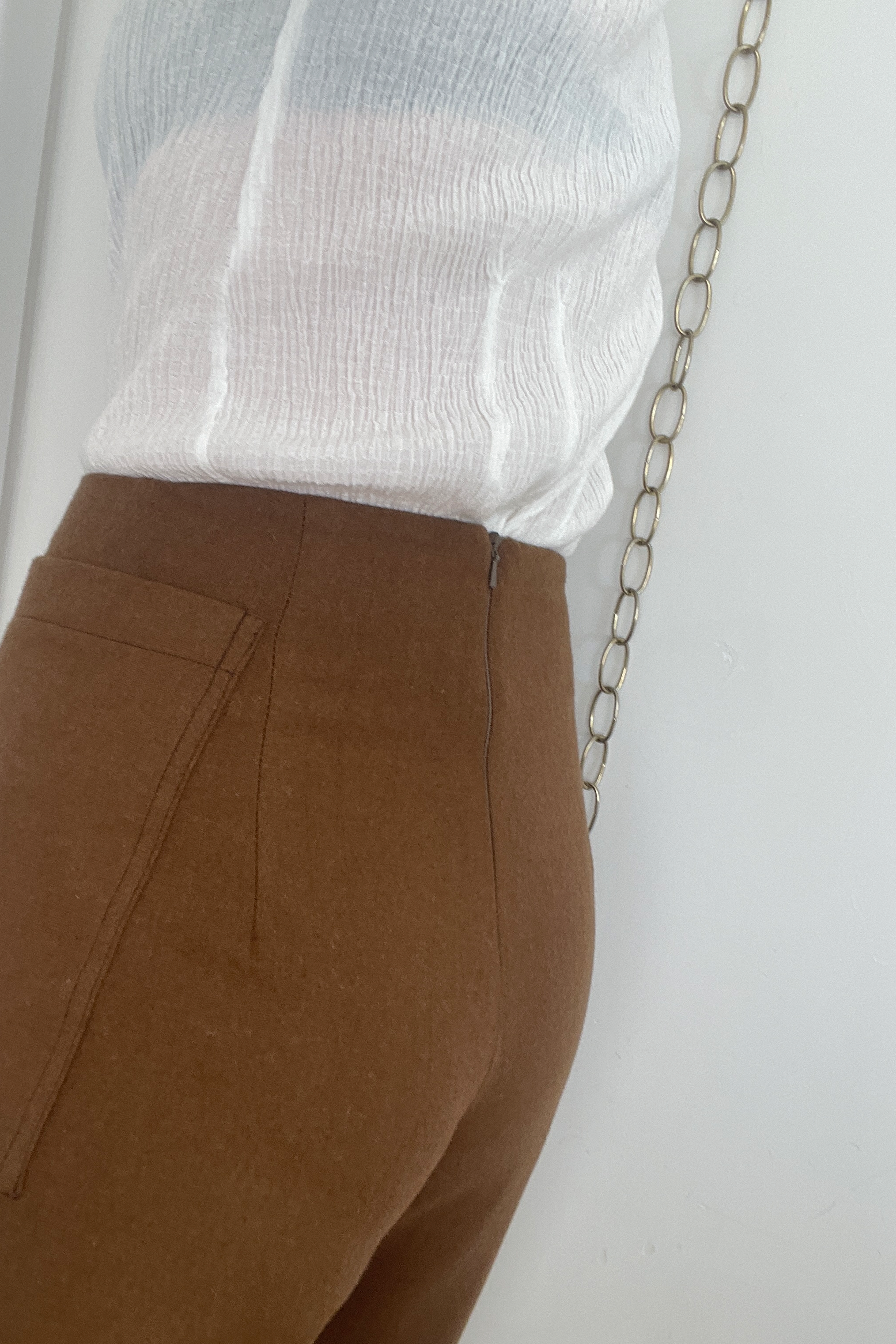 Features pin stitch through center front, patch pockets on front sides. Invisible zip closure through center back