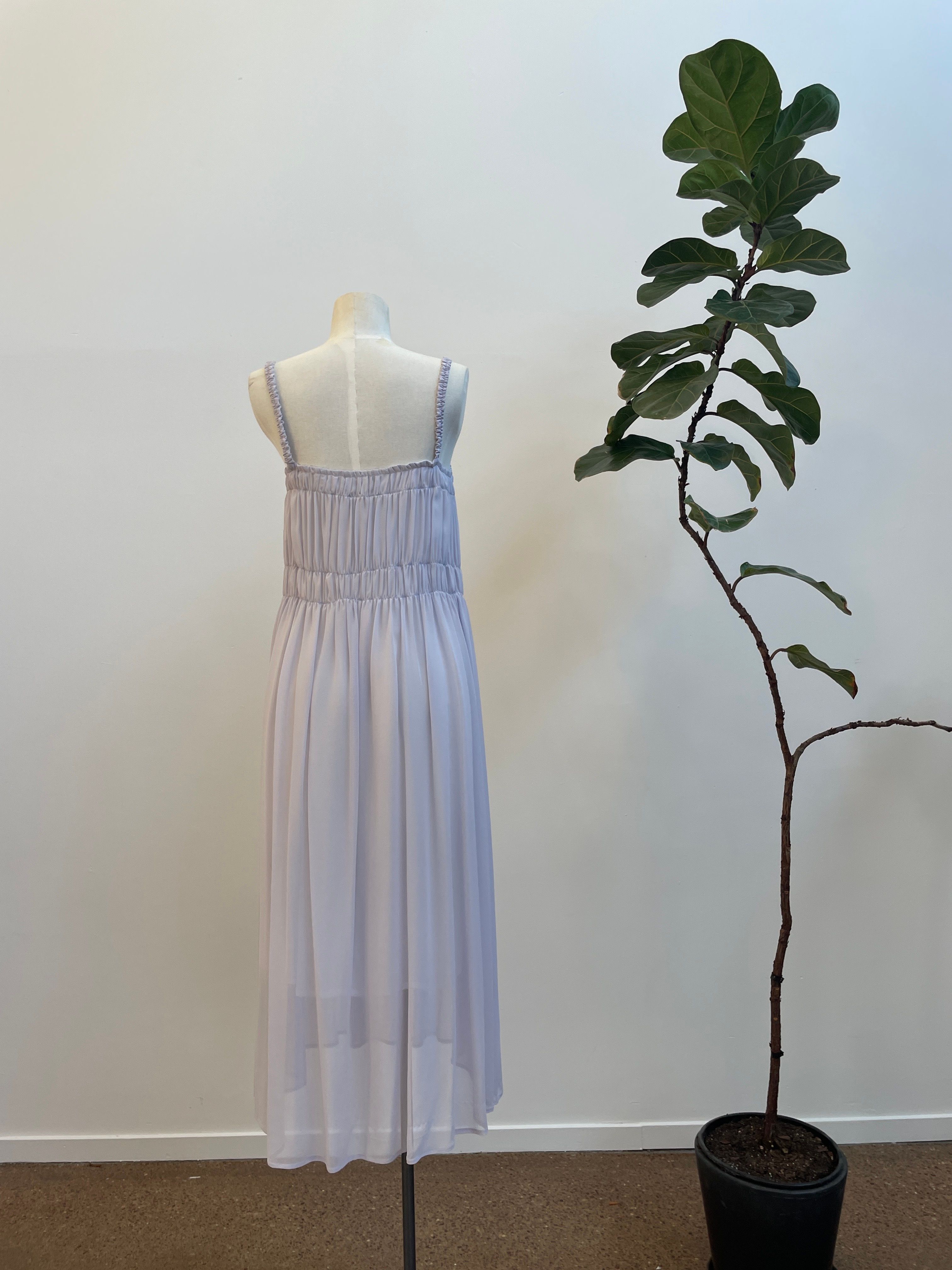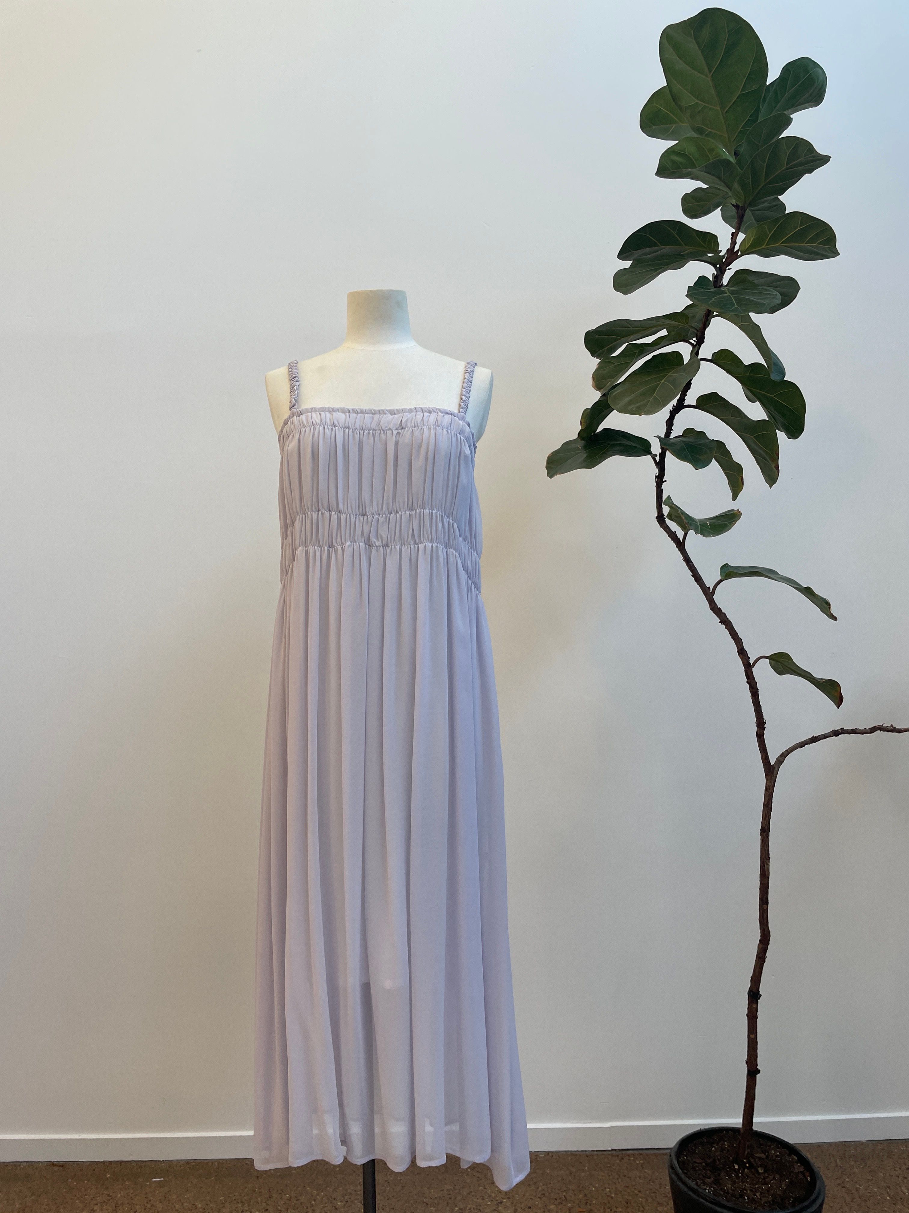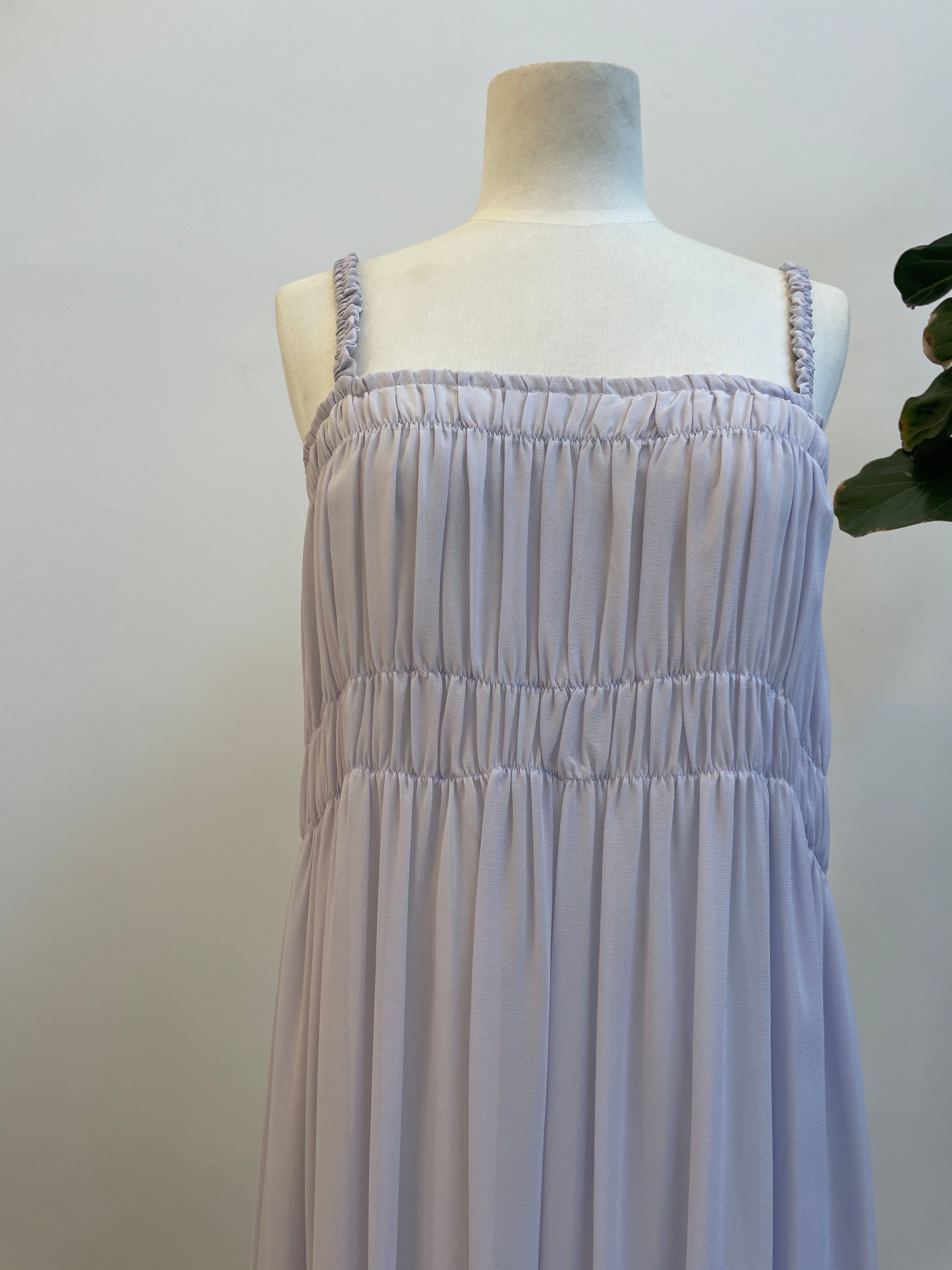 Metres of silk chiffon gathered over pure cotton. Shirred thin straps over the shoulder. Square neckline and double layered elasticated gathers above and below bust. Finishes mid-calf