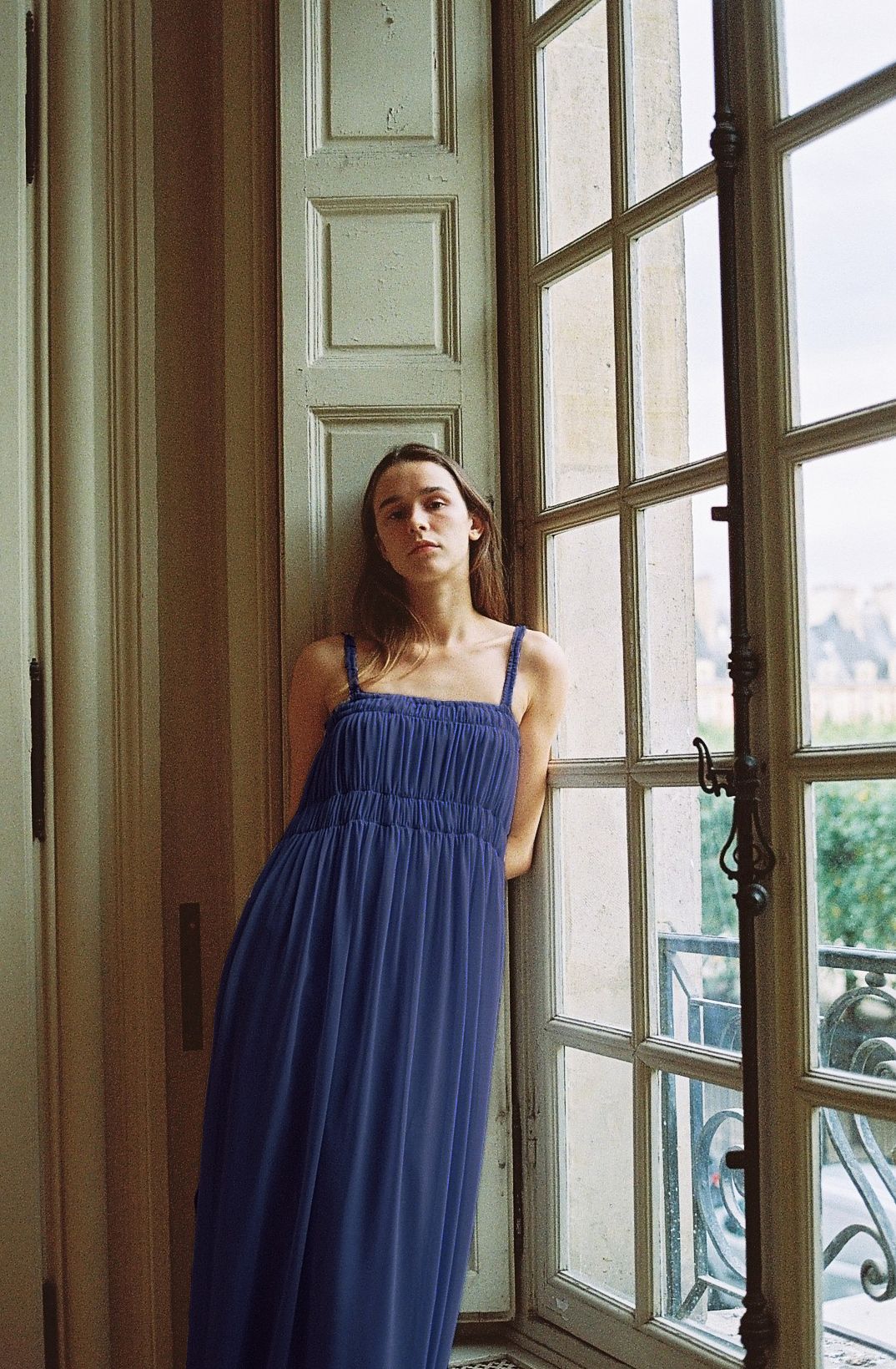 Metres of silk chiffon gathered over pure cotton, full-length lining. Shirred thin straps over the shoulder. Square neckline and double layered elasticated gathers above and below bust. Full length skirt.