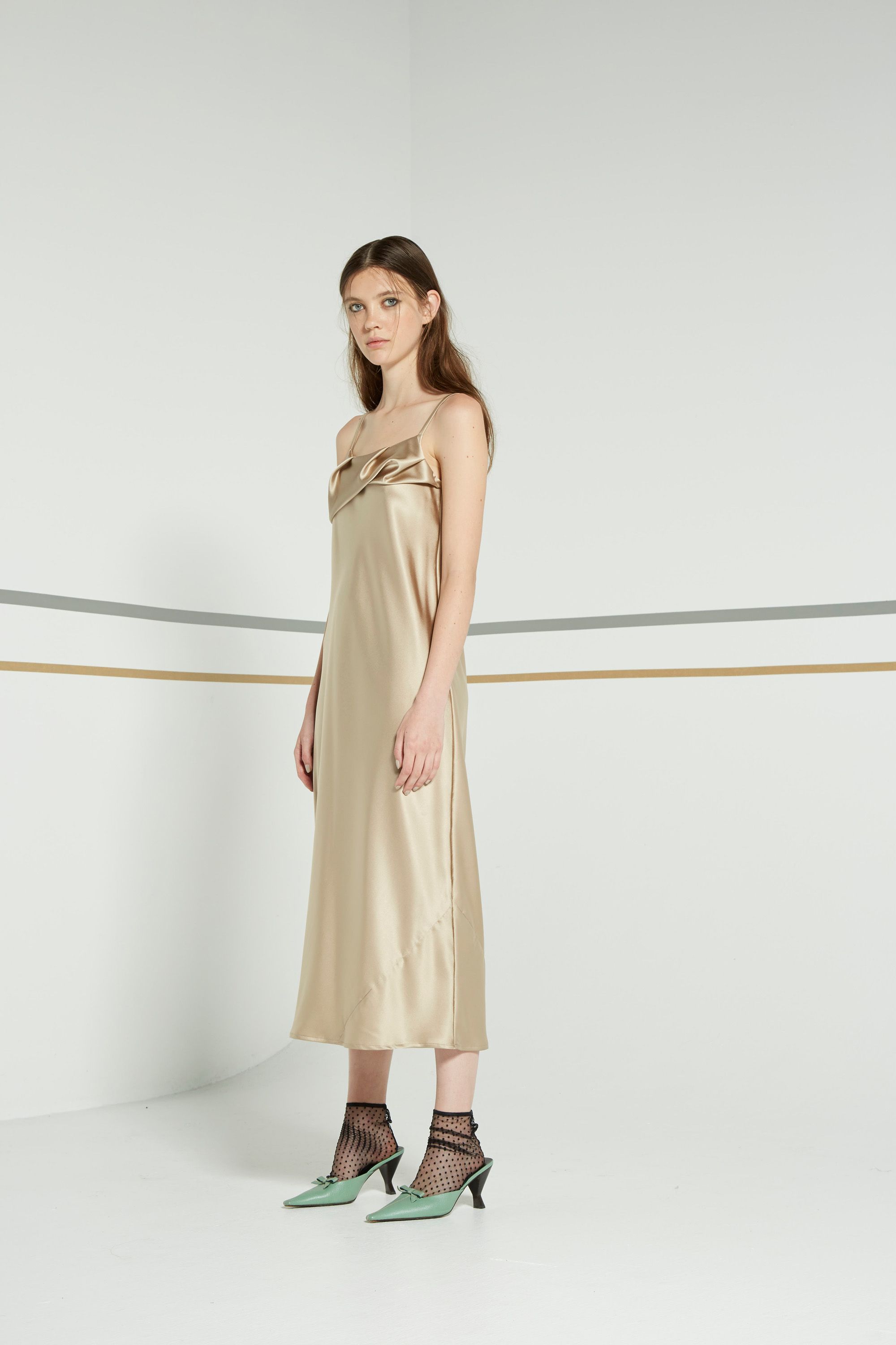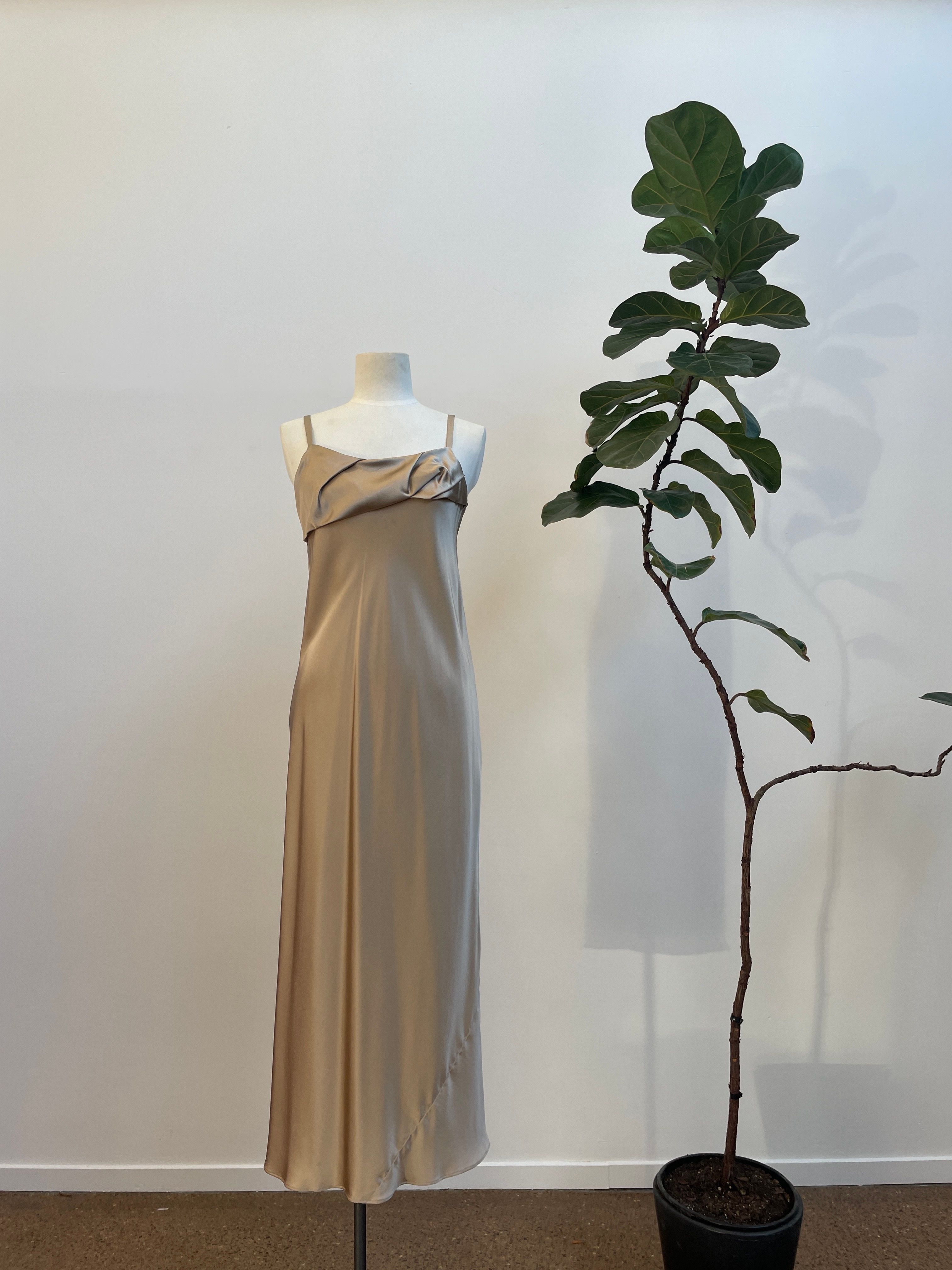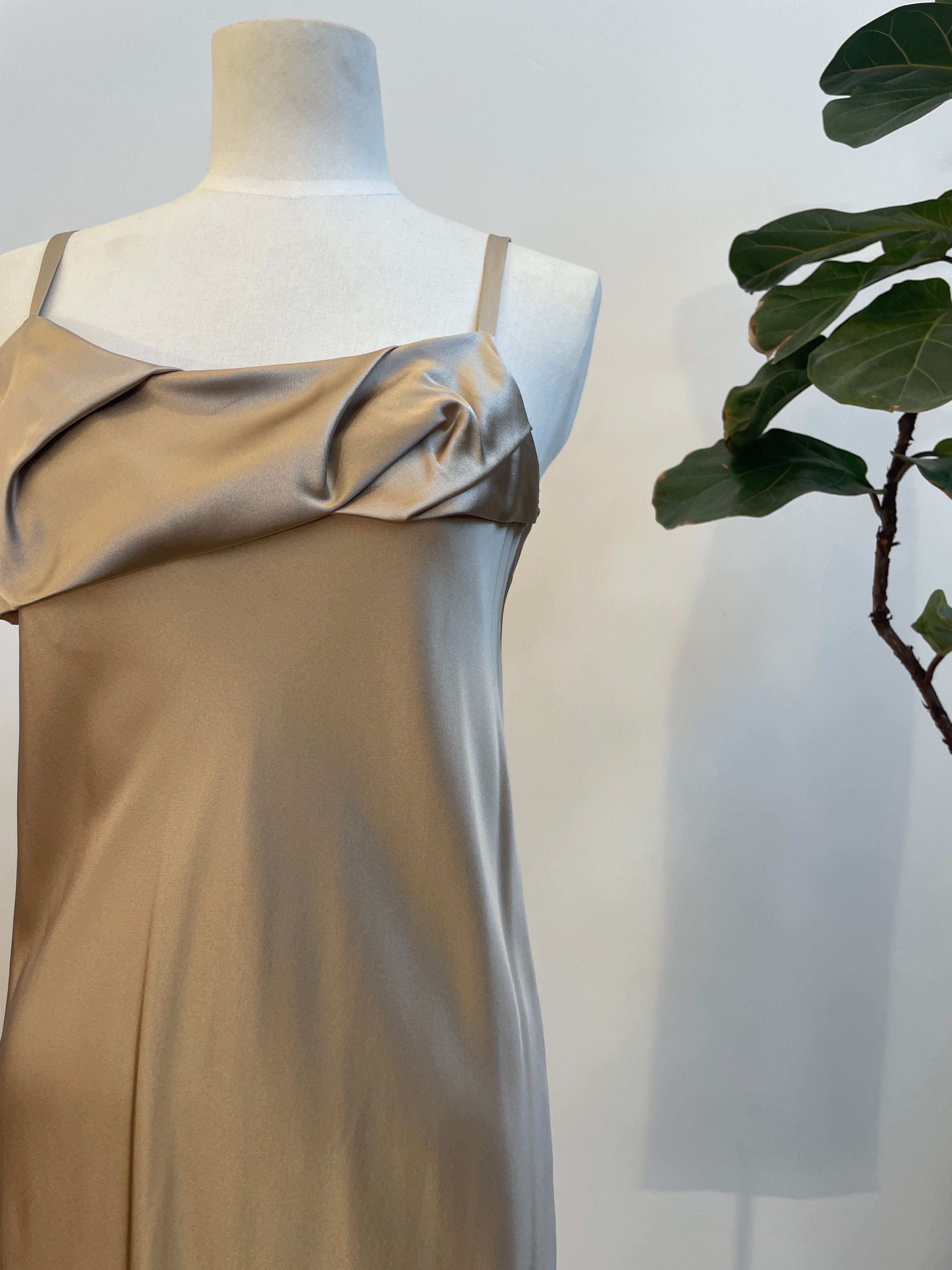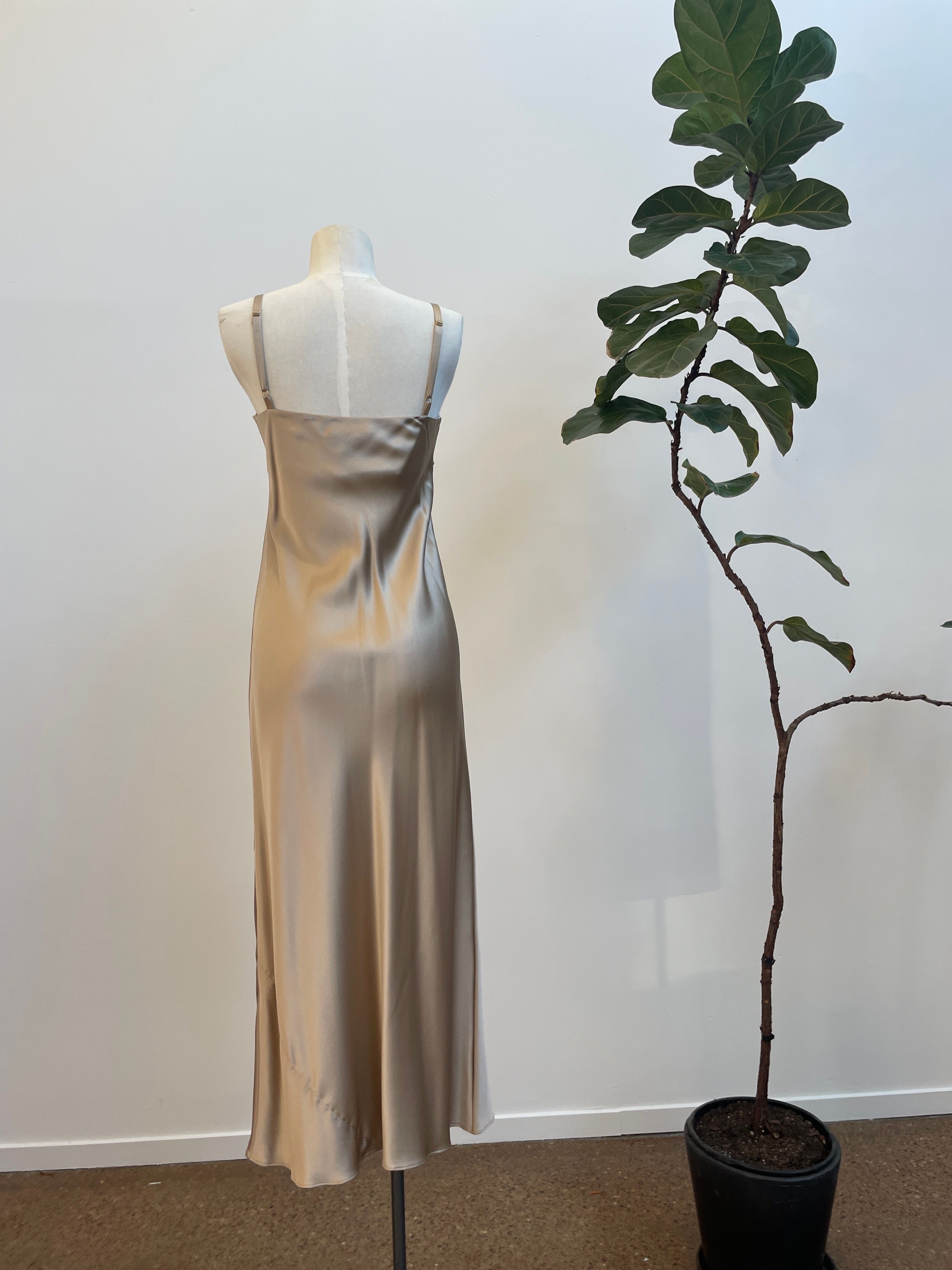 Sleek, pared-back elegance with the Otherness Dress. Fine, adjustable spaghetti straps, this bias-cut silk skims the body gently with hem falling to the mid shin. Folded bias fabric detailing at the bust.