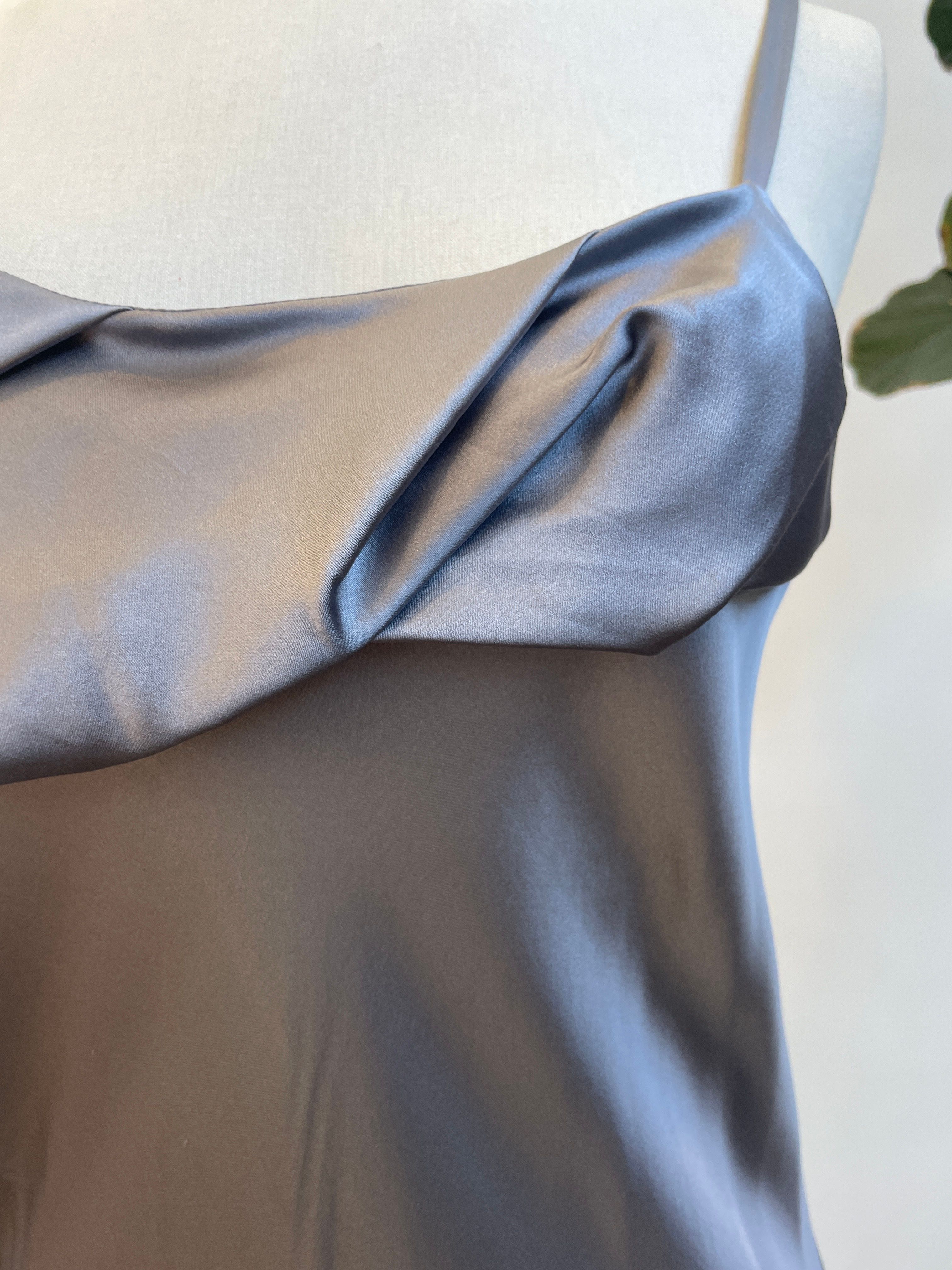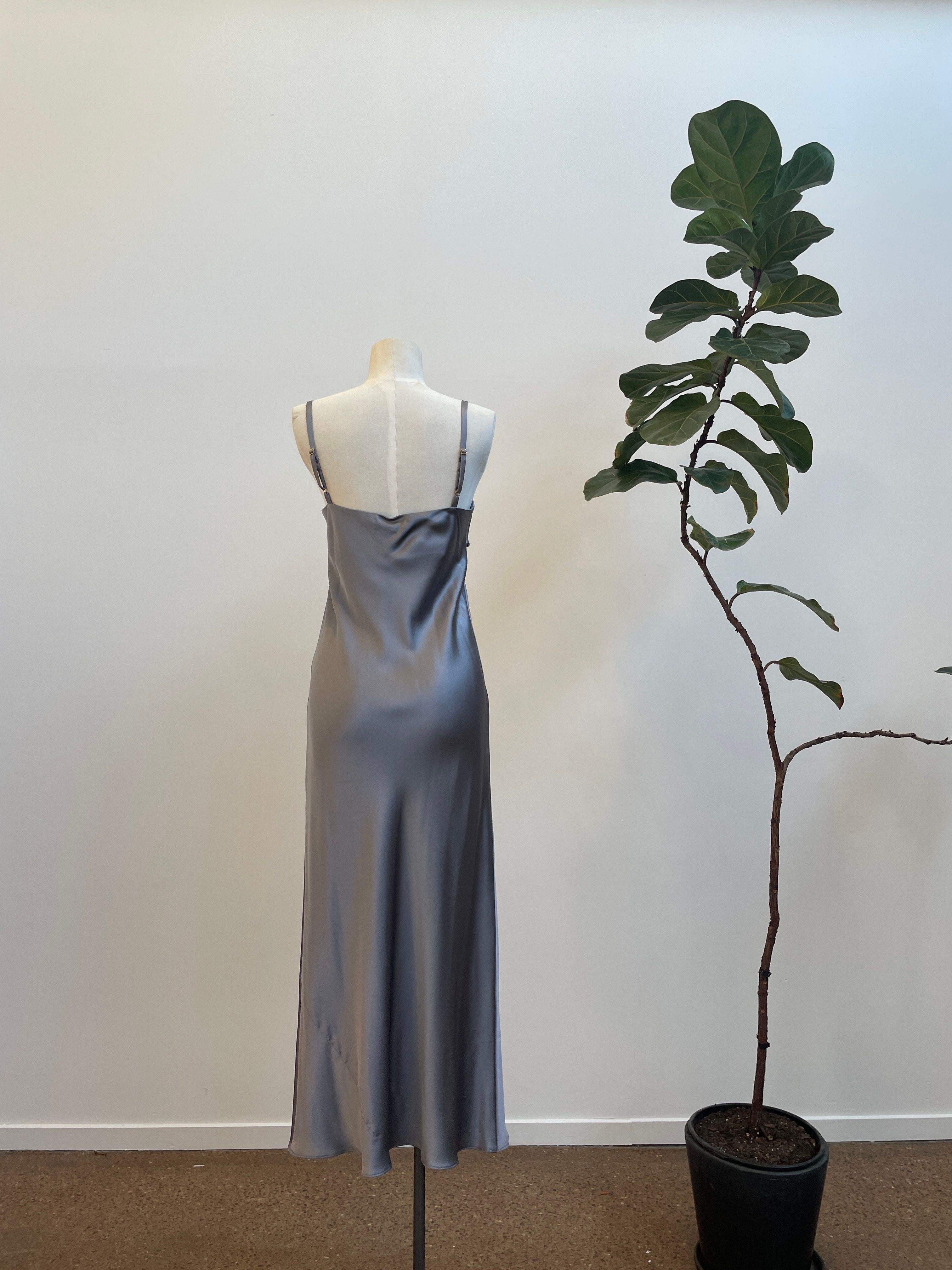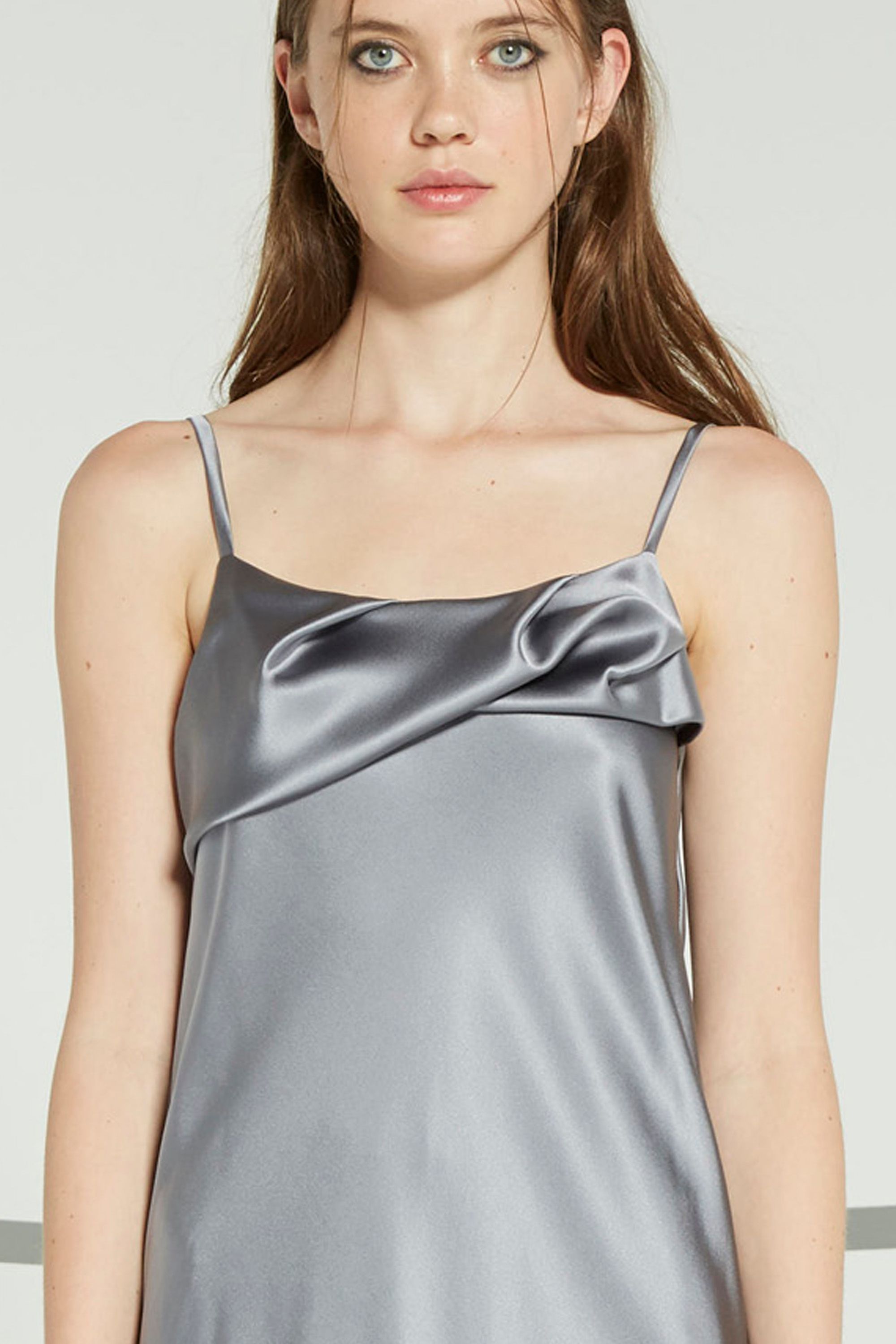 Sleek, pared-back elegance with the Otherness Dress. Fine, adjustable spaghetti straps, this bias-cut silk skims the body gently with the hem falling to the mid-shin. Folded bias fabric detailing at the bust.