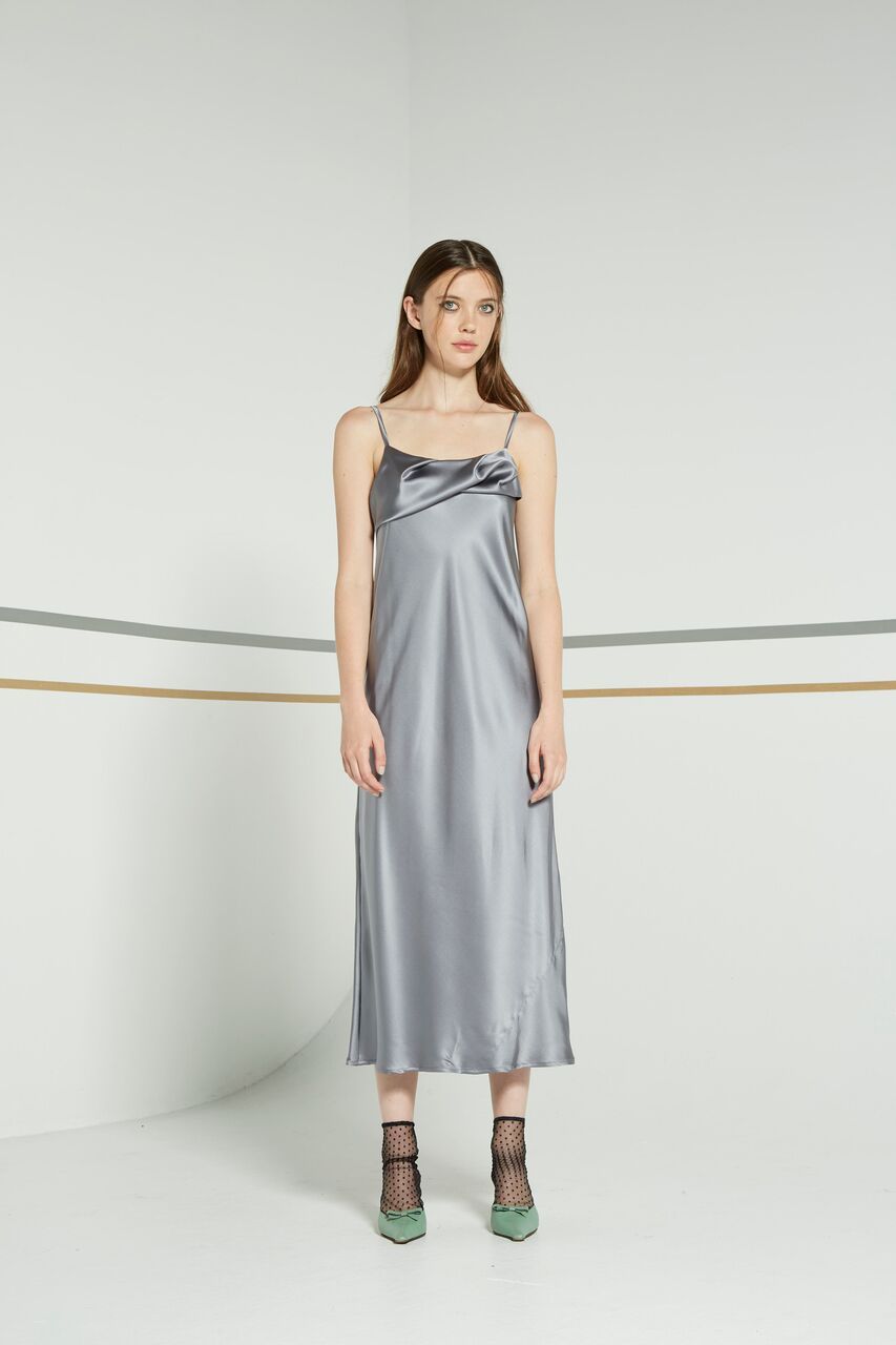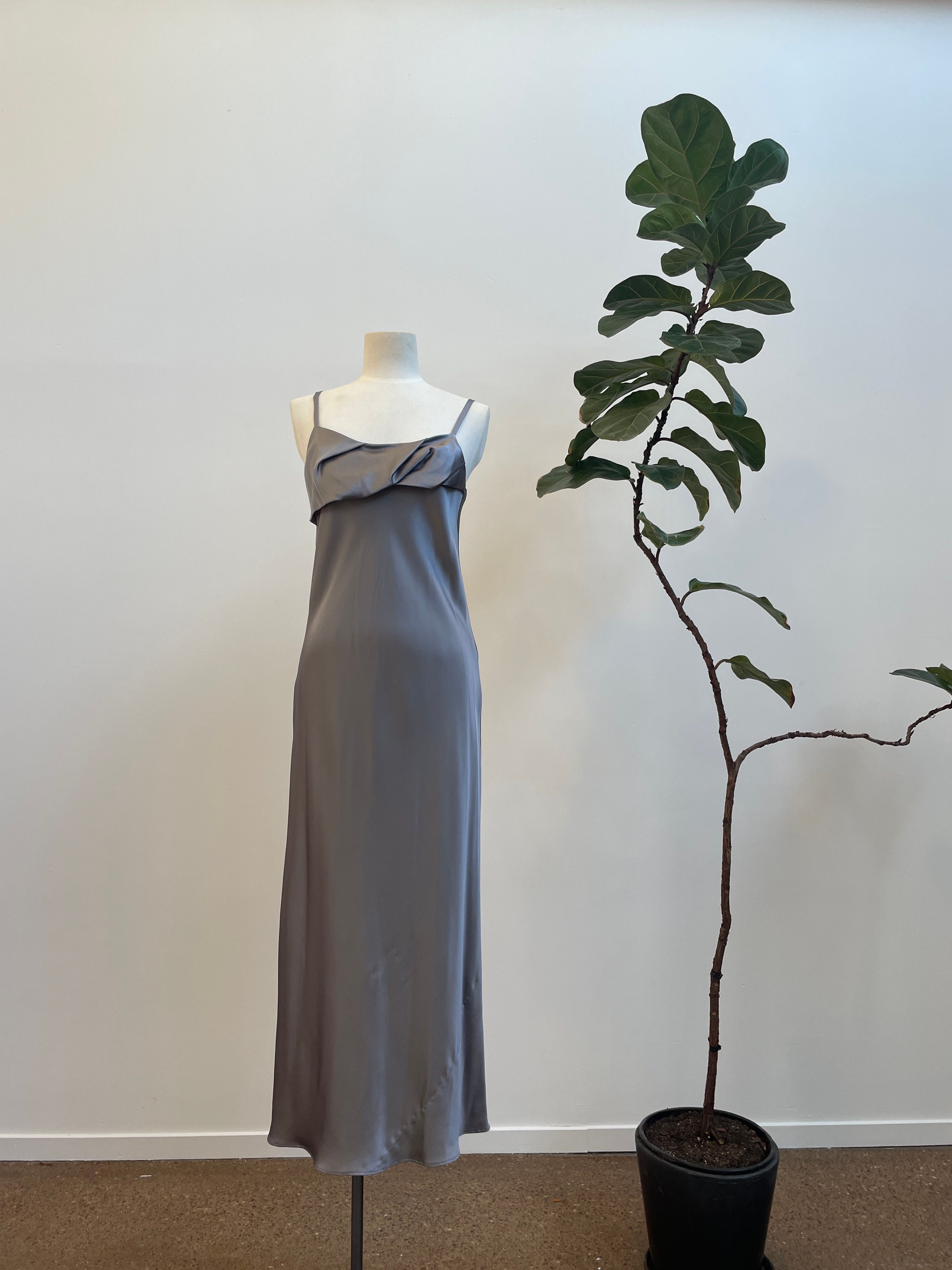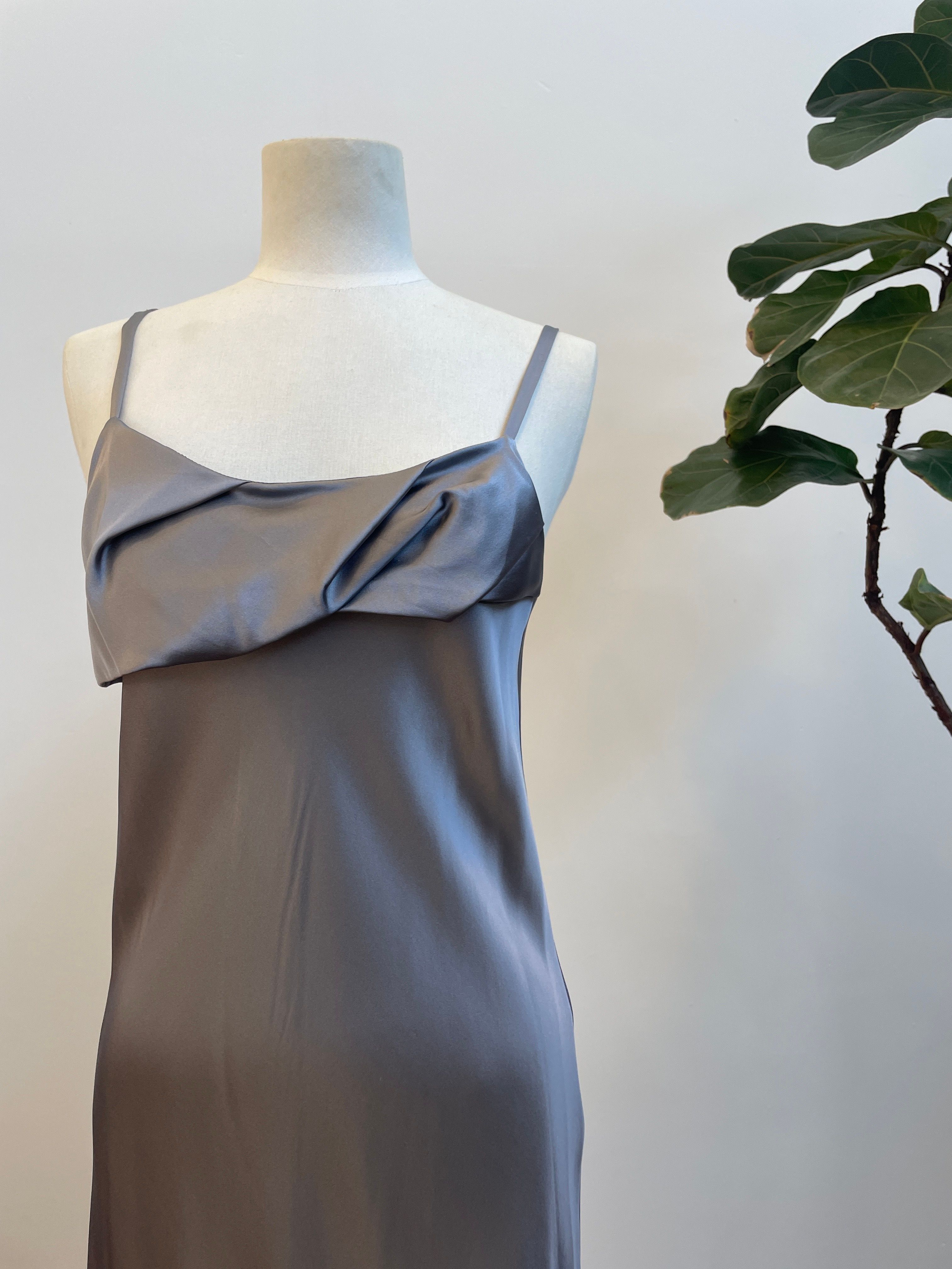 Sleek, pared-back elegance with the Otherness Dress. Fine, adjustable spaghetti straps, this bias-cut silk skims the body gently with the hem falling to the mid-shin. Folded bias fabric detailing at the bust.