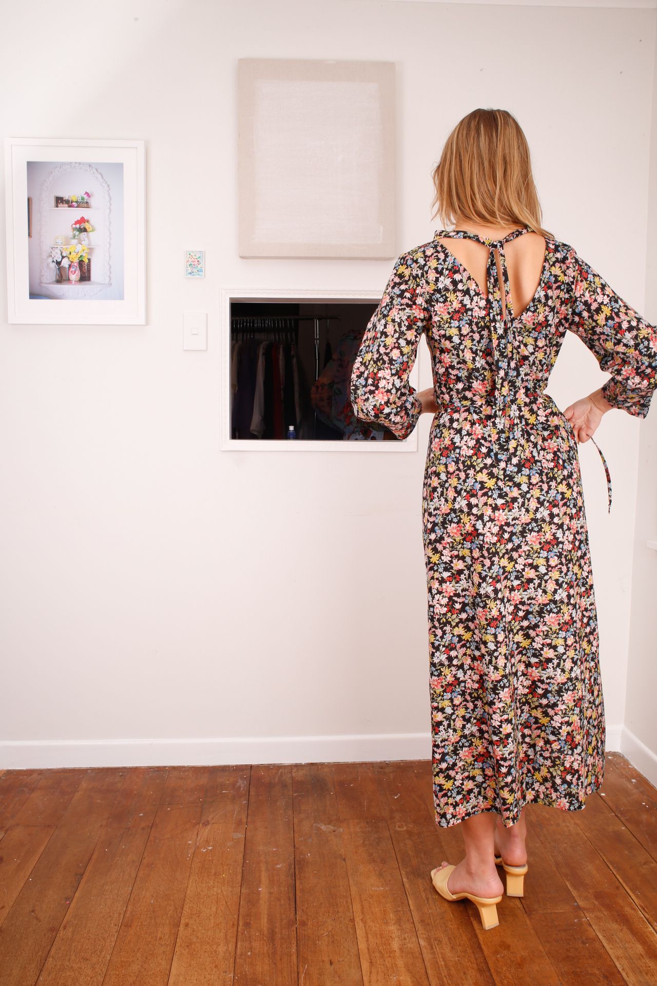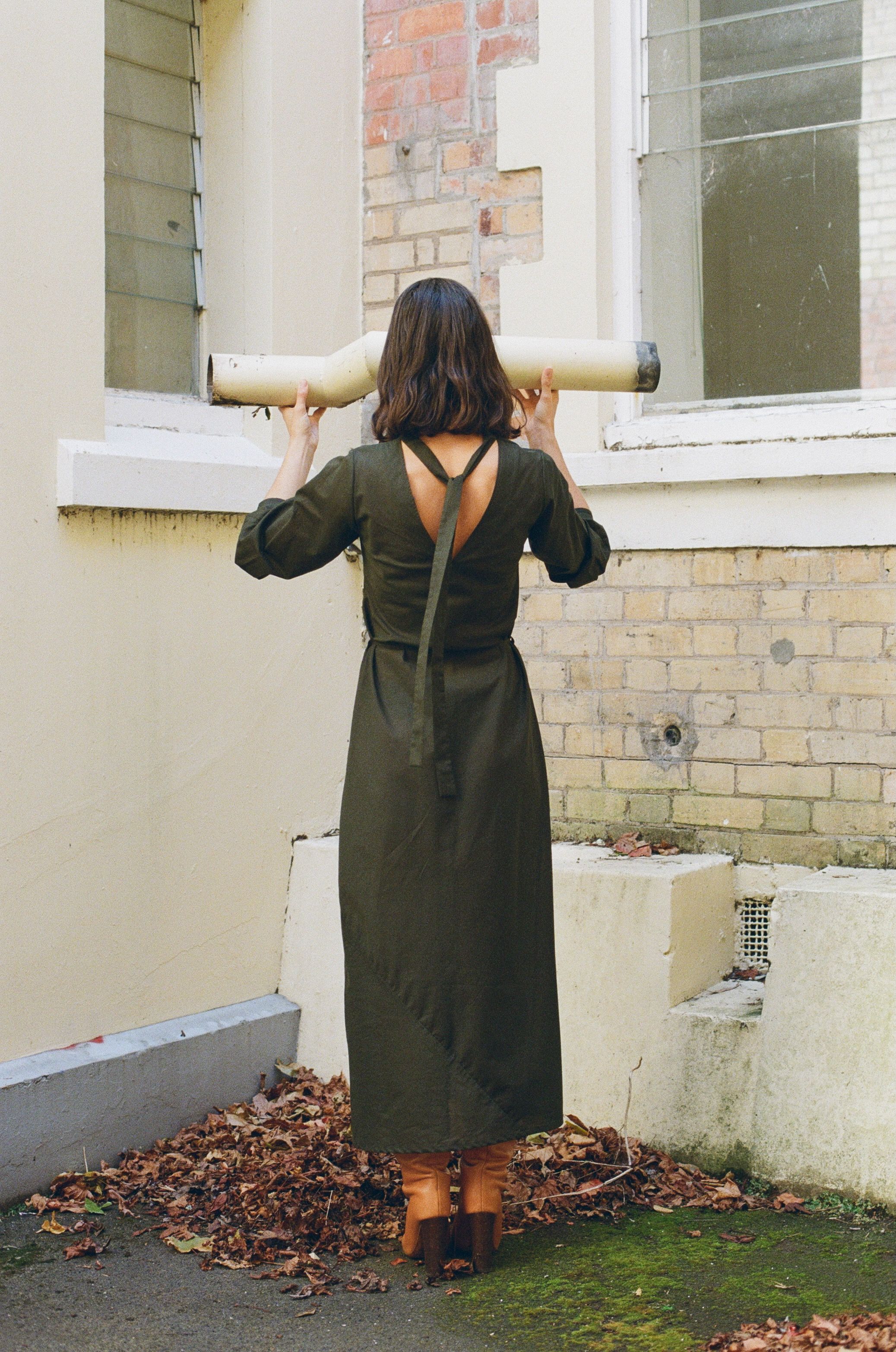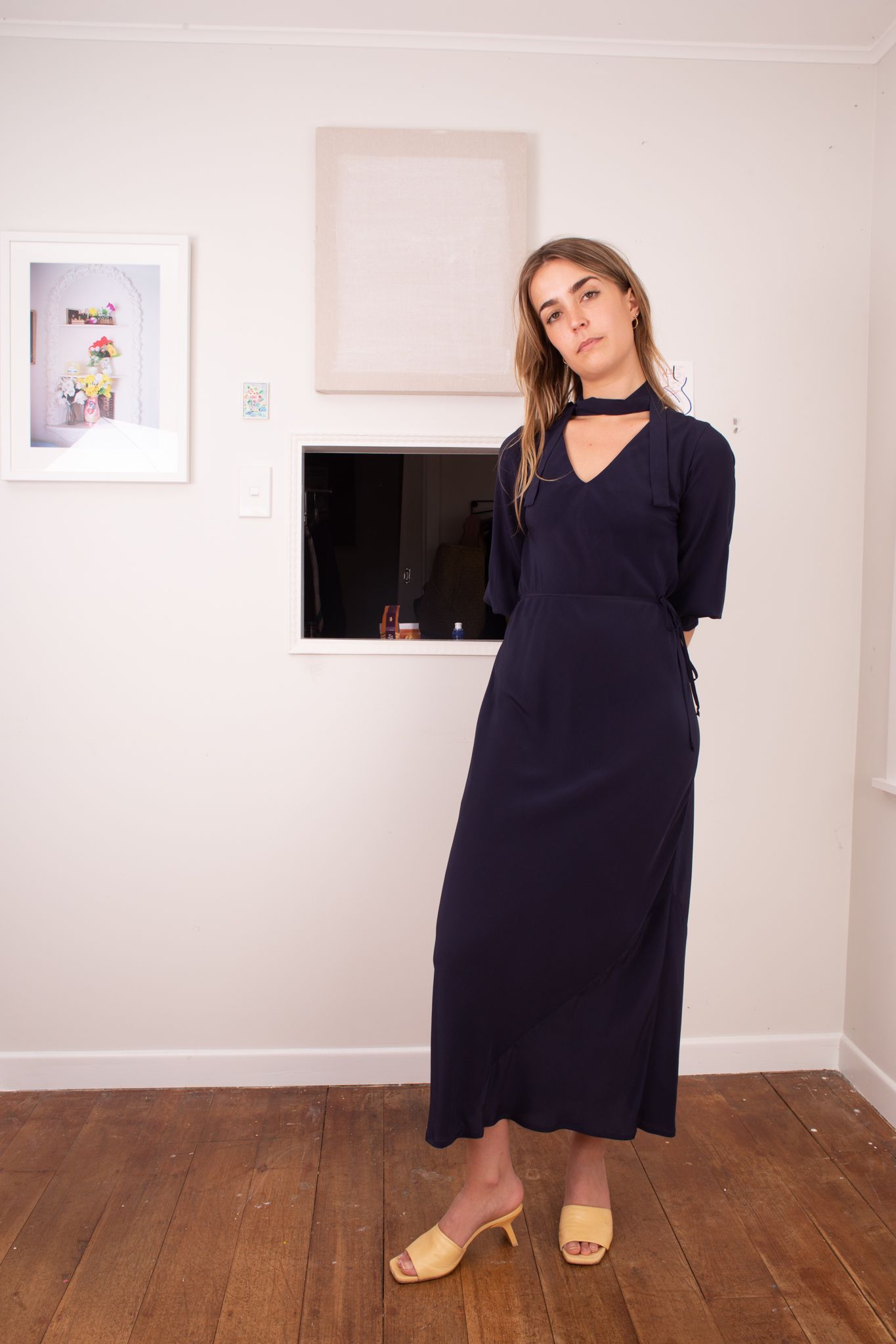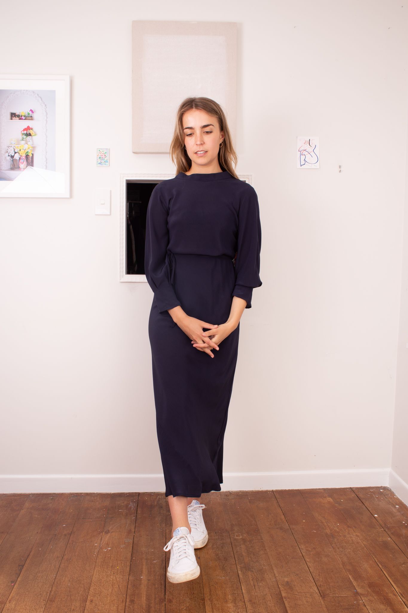The Parade dress a full length bias-cut, reversible dress. A flattering silhouette that features a thin tie at waist with a 3/4 sleeve. The sleeve has tucked detail and the neck features a soft tie that can be worn around the neck or hanging loose.