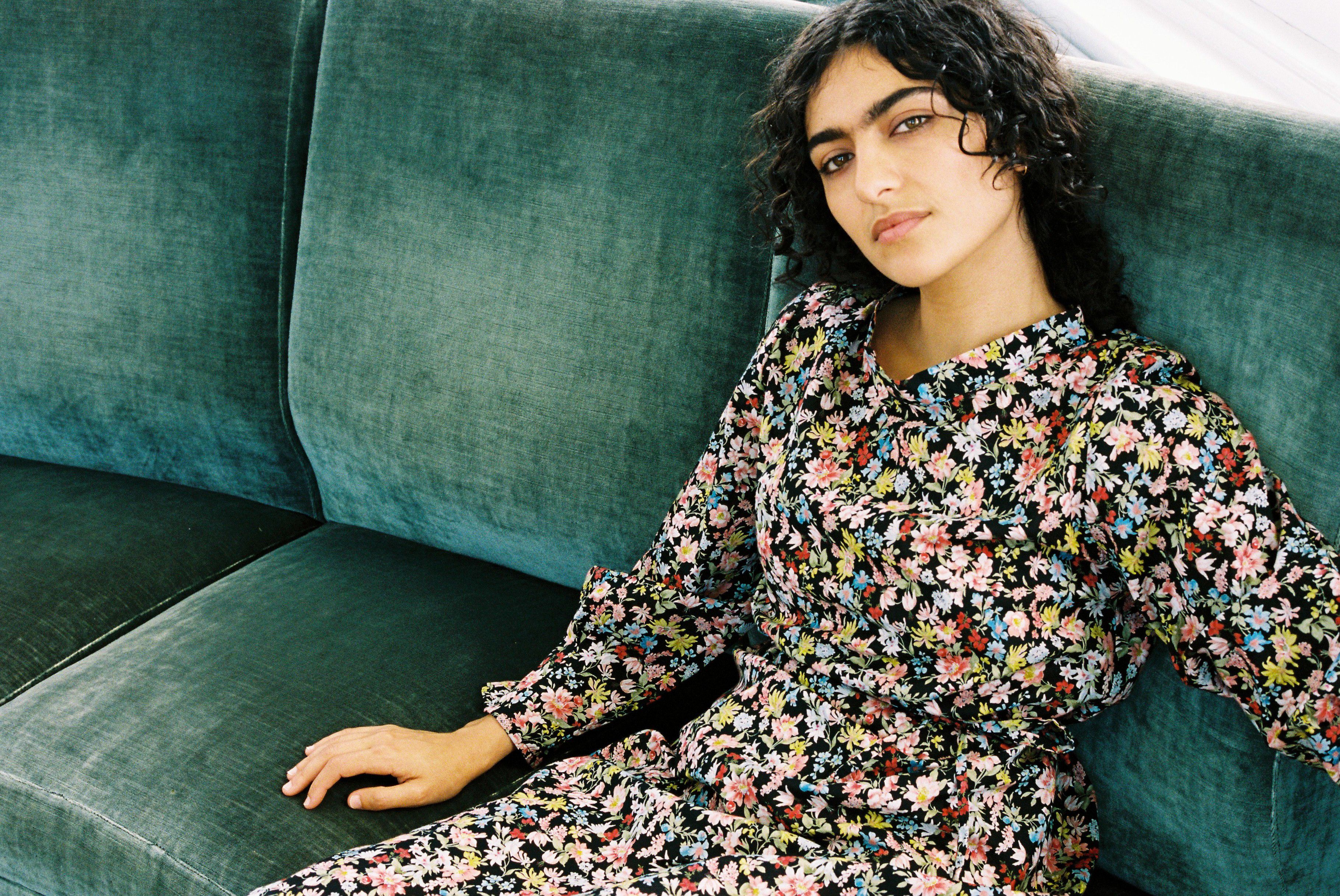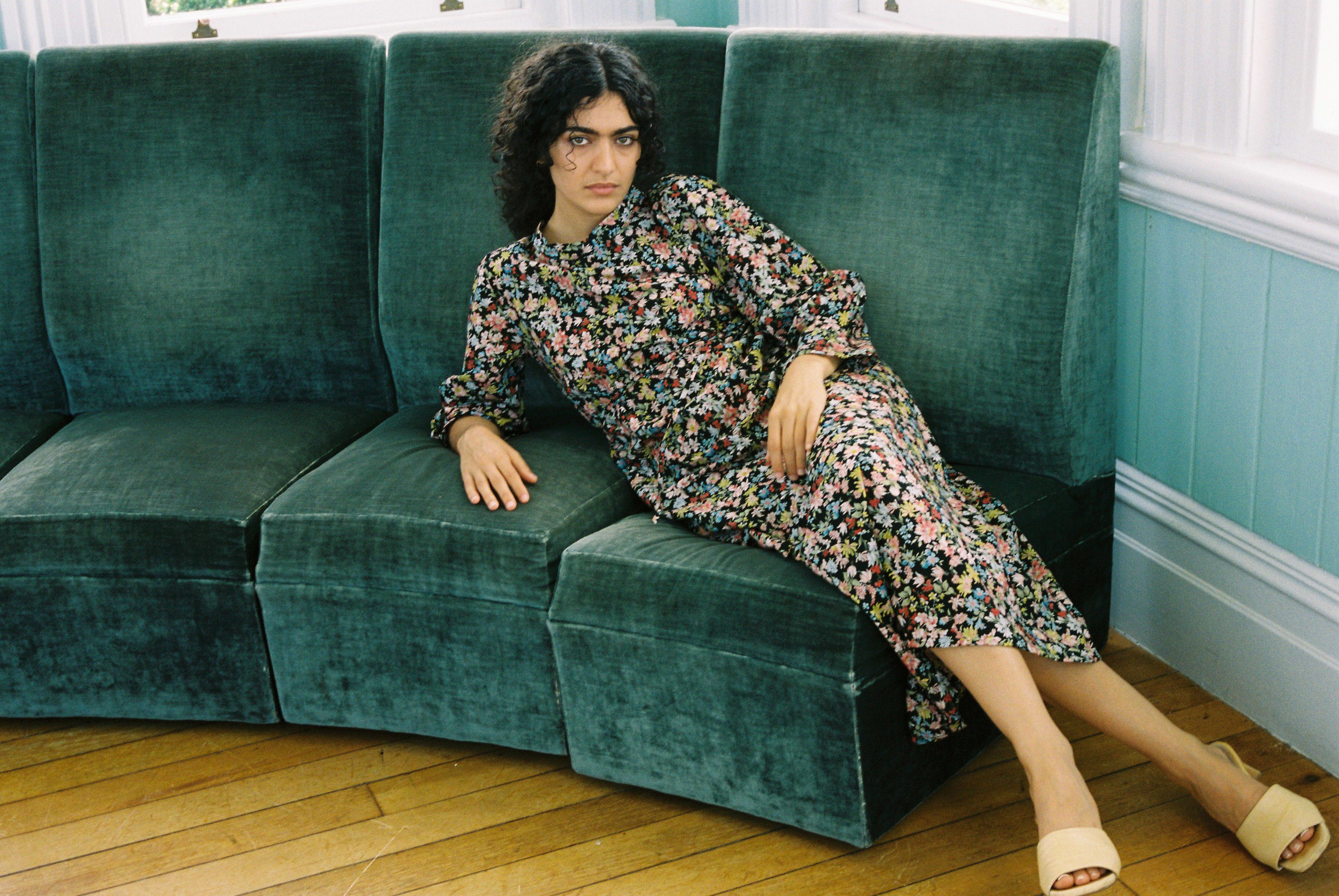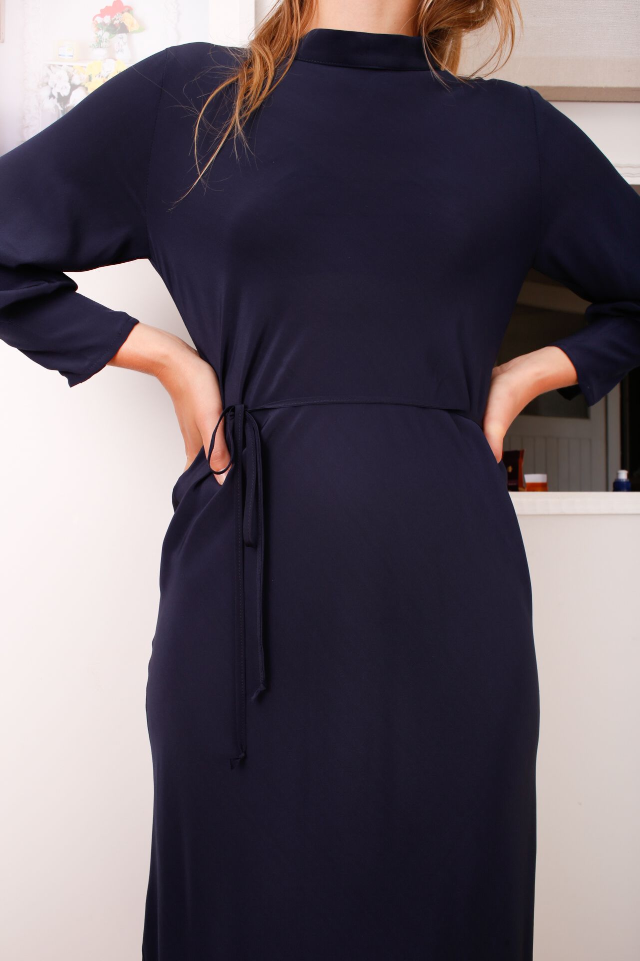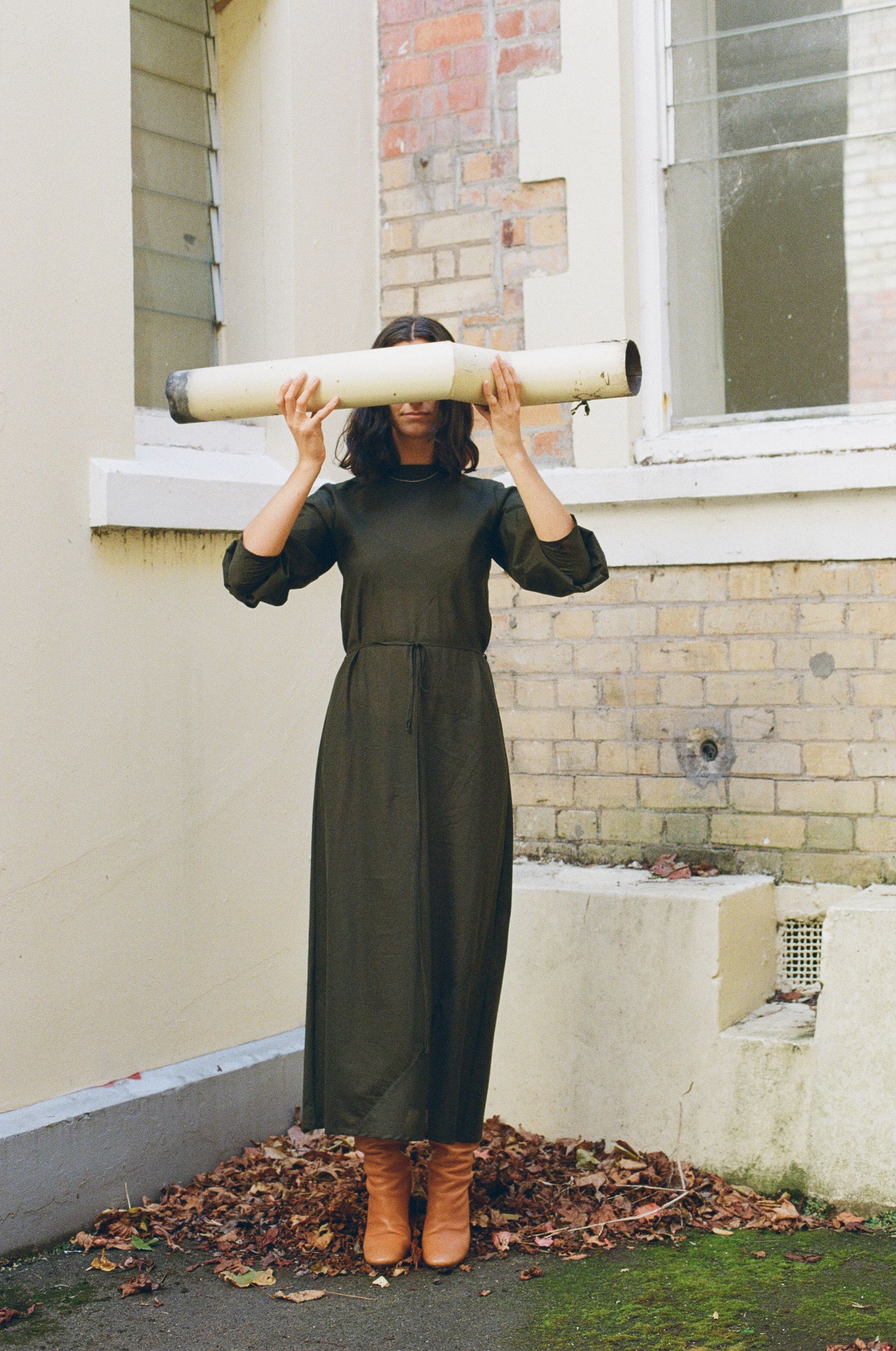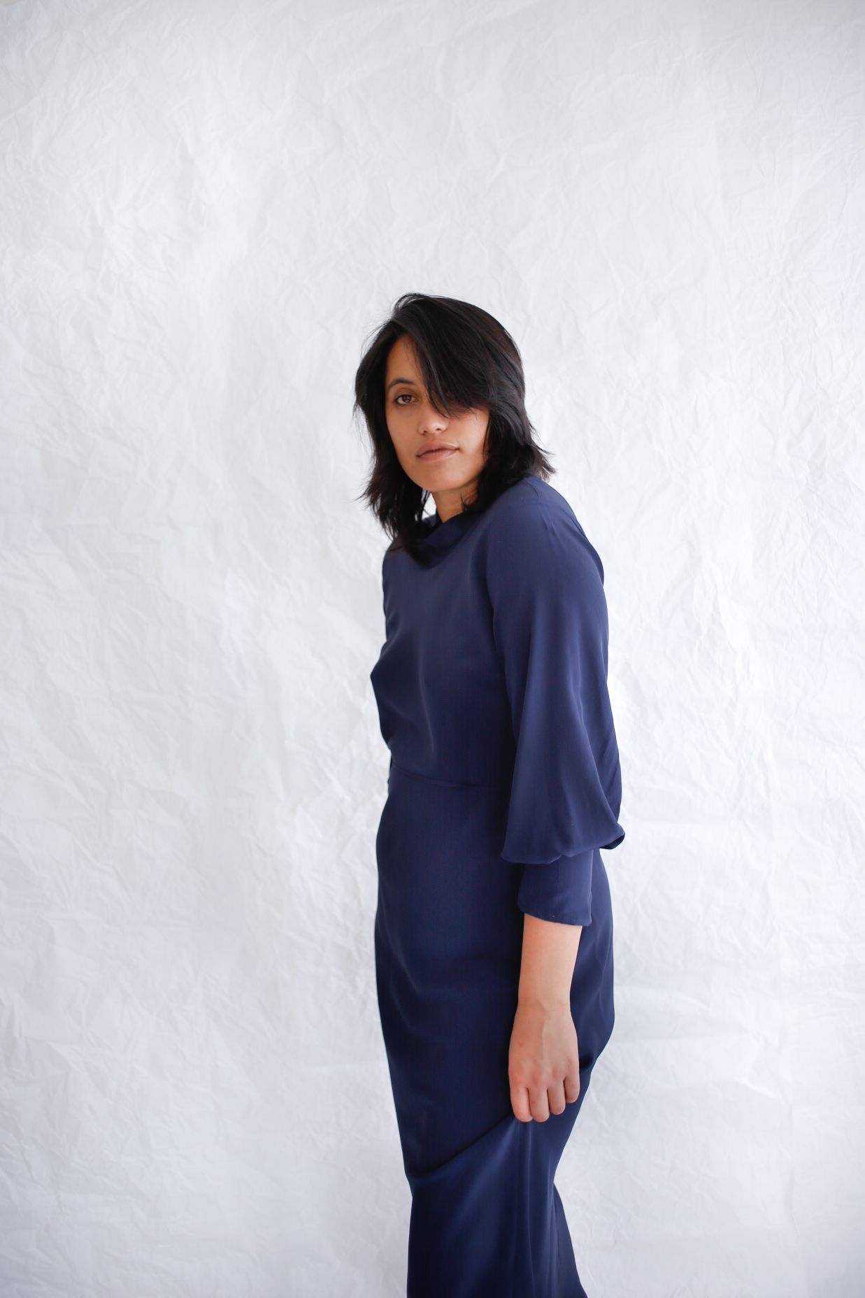 The Parade dress a full length bias-cut, reversible dress. A flattering silhouette that features a thin tie at waist with a 3/4 sleeve. The sleeve has tucked detail and the neck features a soft tie that can be worn around the neck or hanging loose.
