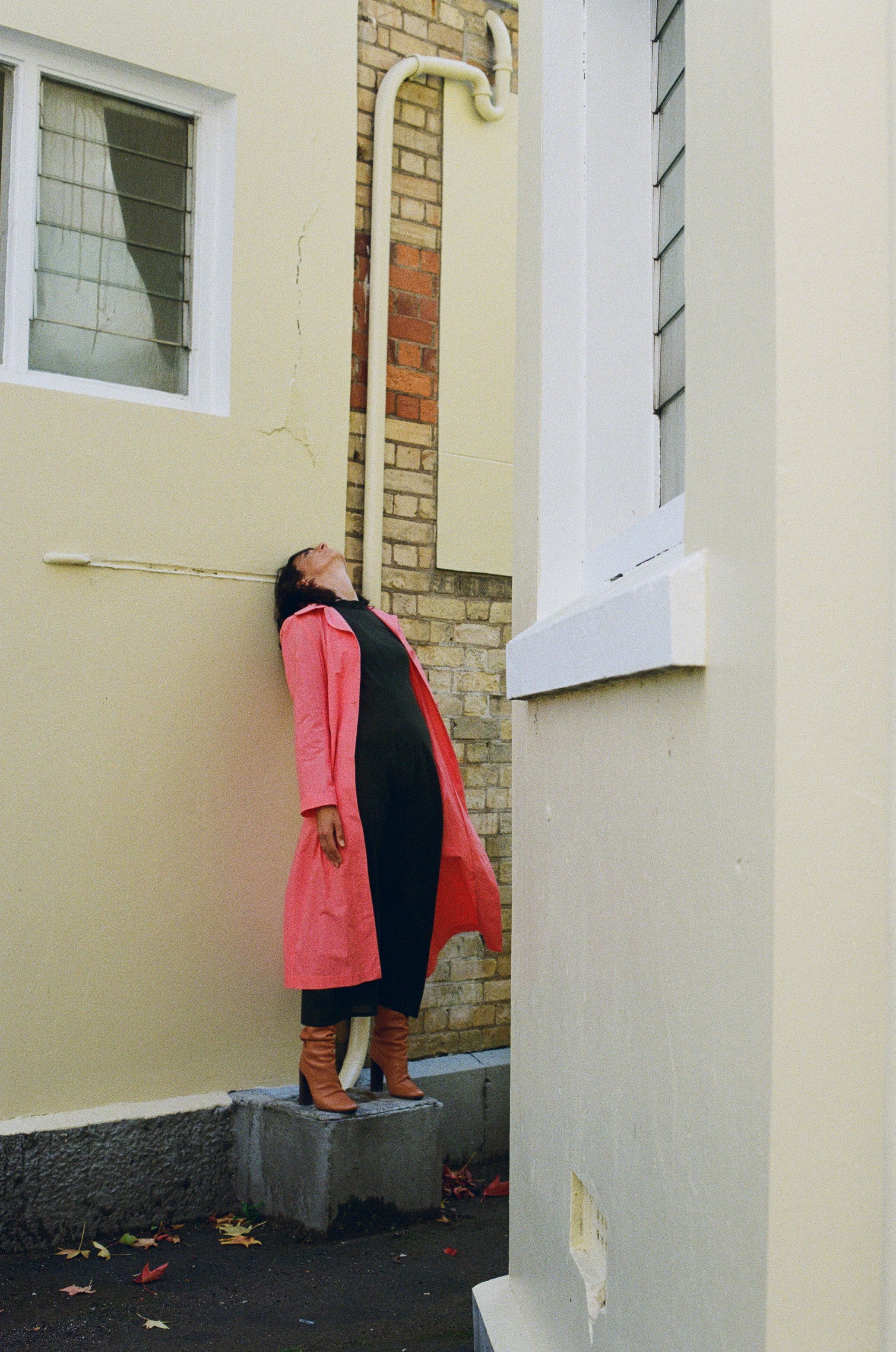 Bias cut Full length Reversible Wear with V neck and tie at front or high neck as front Voluminous sleeve, sewn down pleats below elbow Triangular puzzled detail at hem