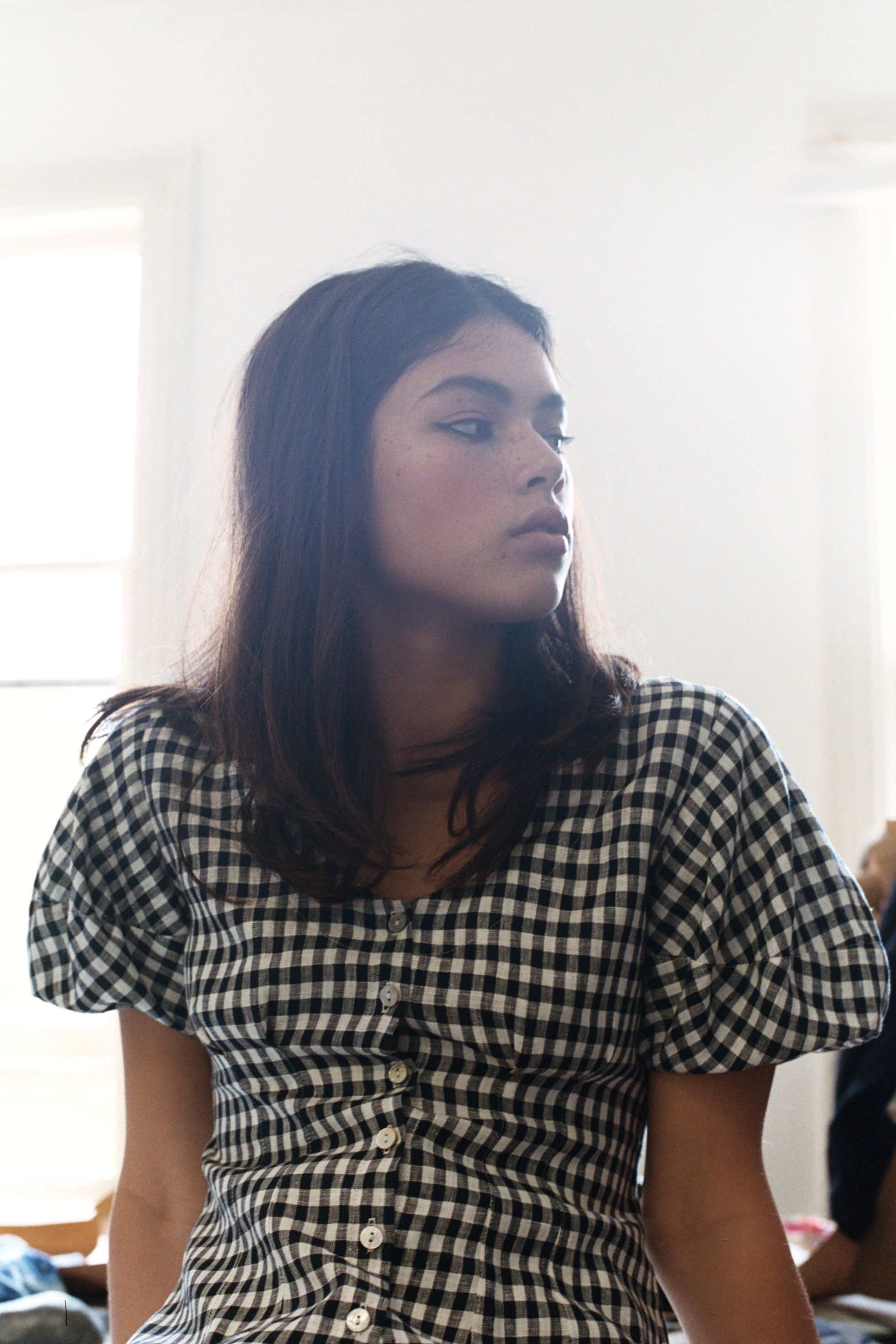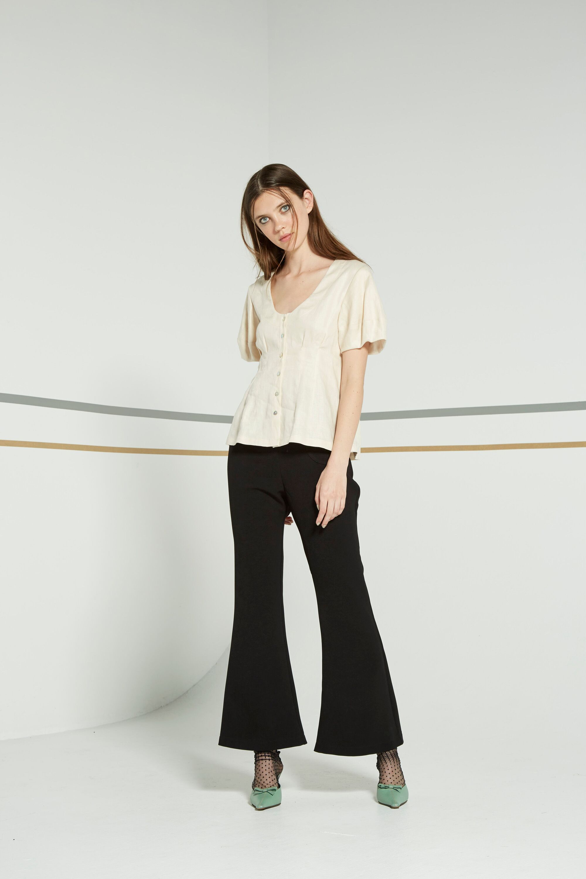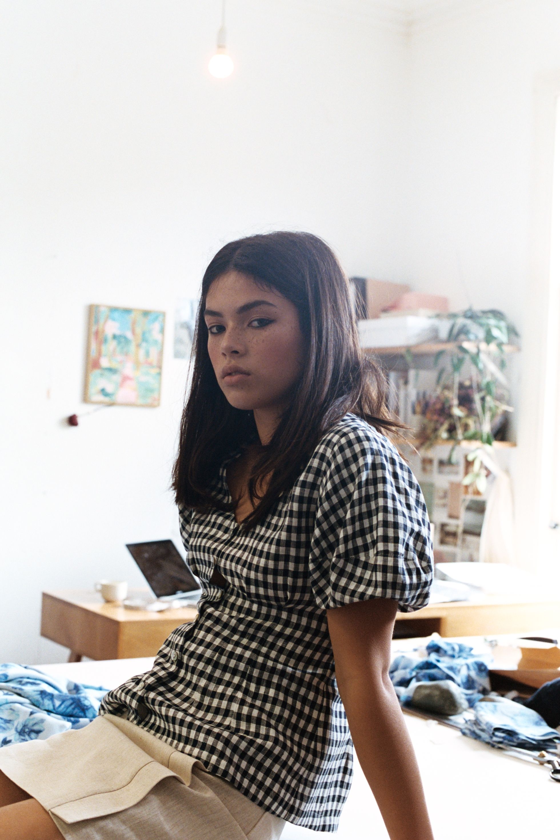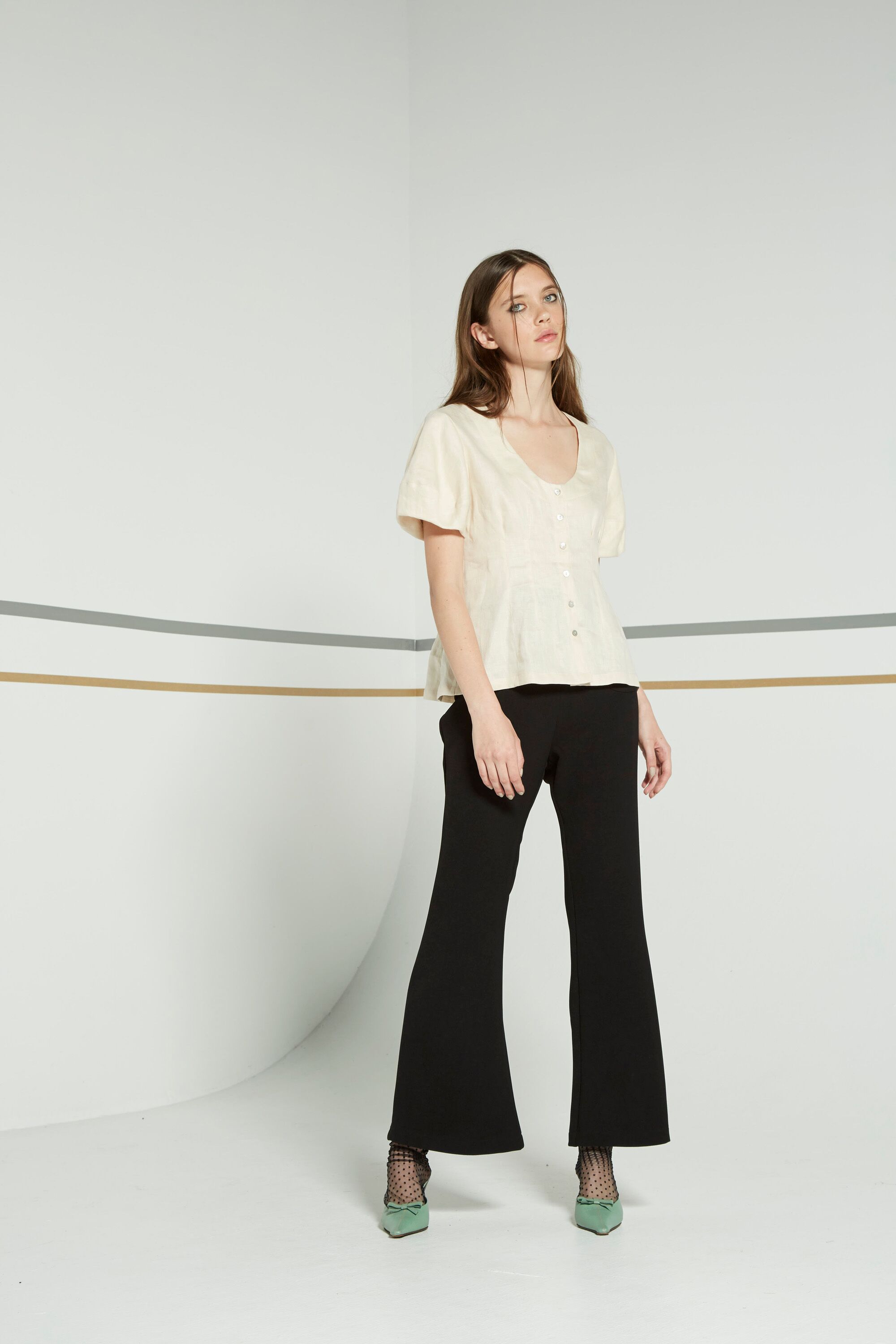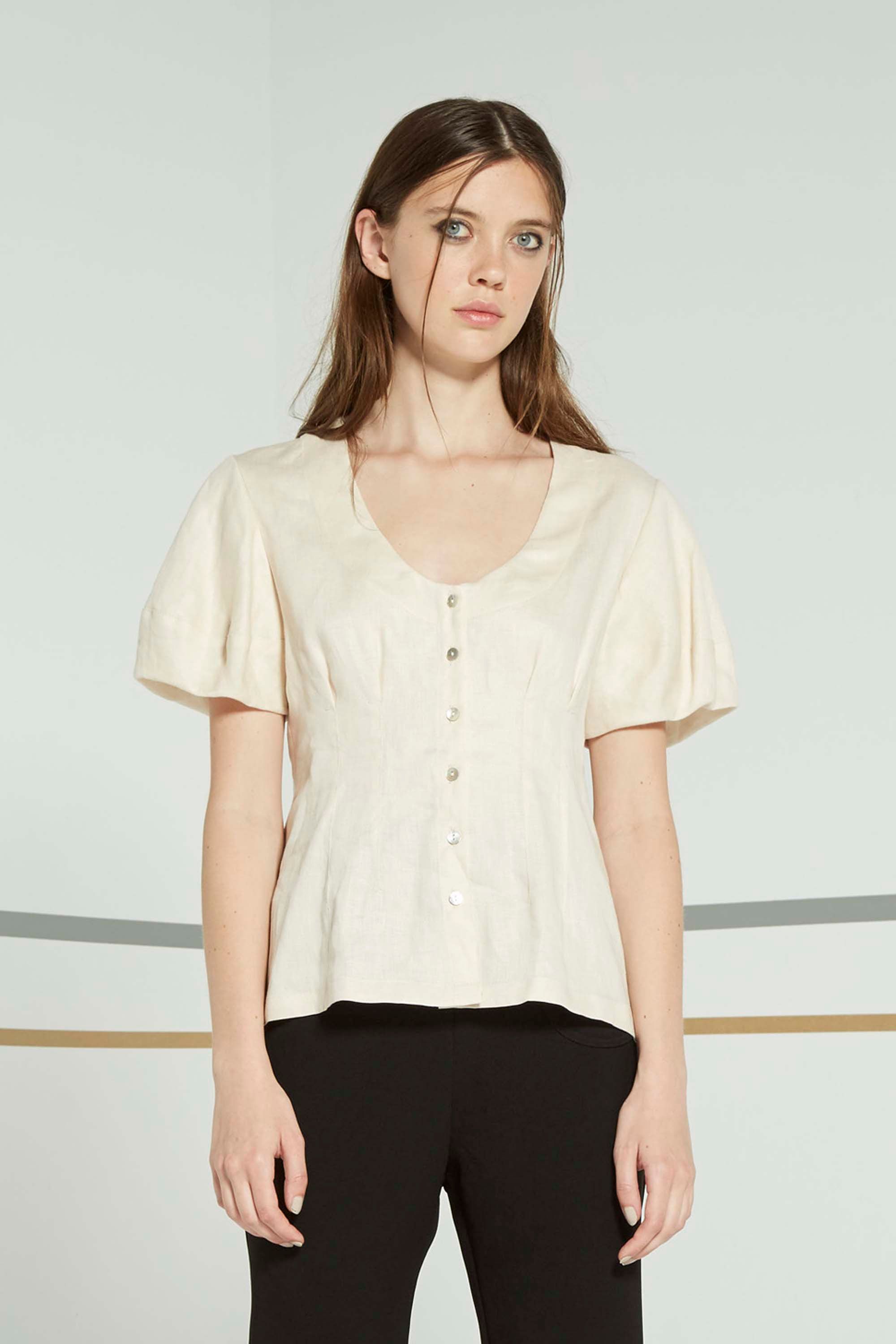 The Pearl top. The cutest gathered bubble short sleeve. Sits neatly in the shoulder. Round scooped neckline follows the delicate shell button up fastening at the centre front. Darts under bust and slight shaping in the bodice. Hem finishes hips.