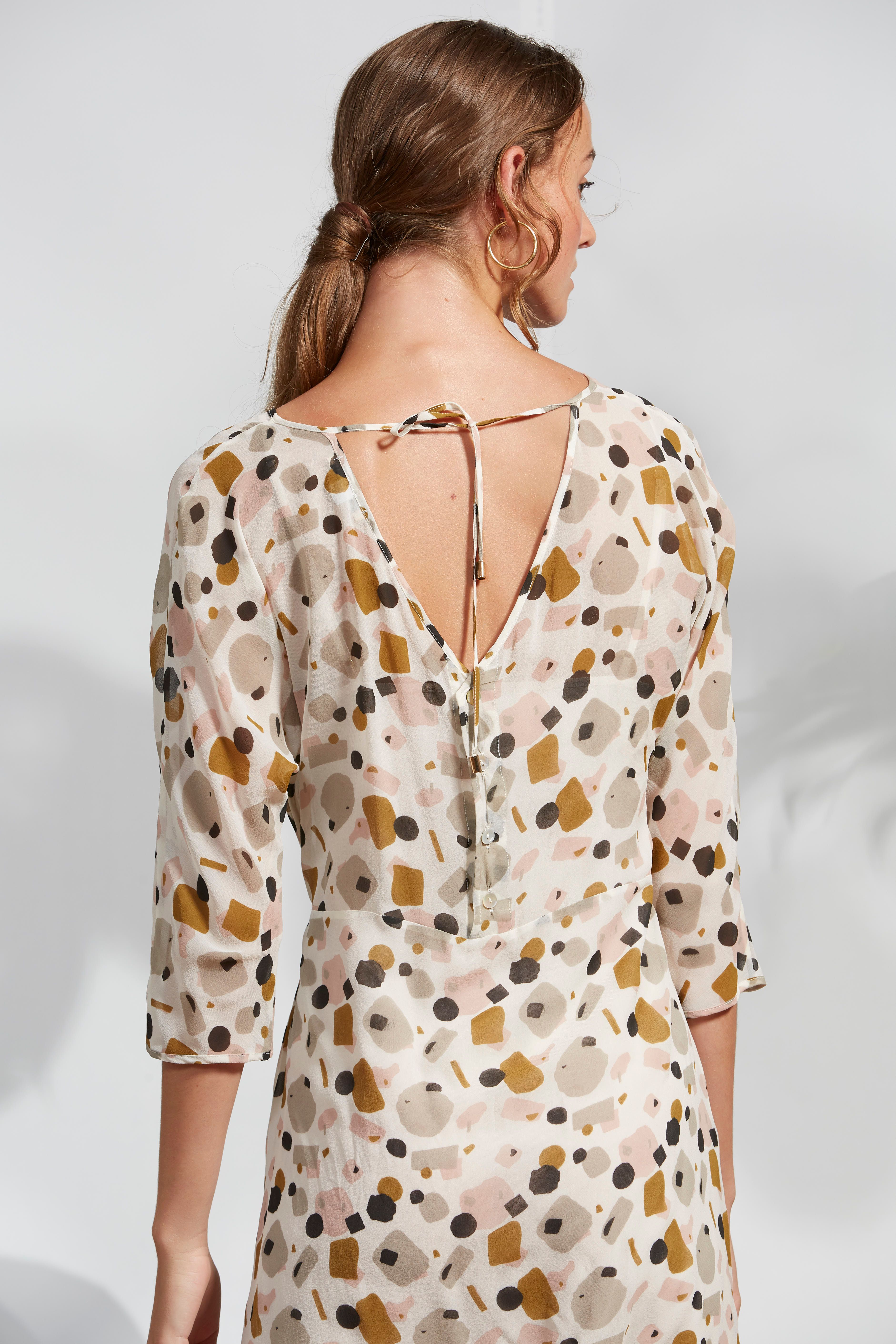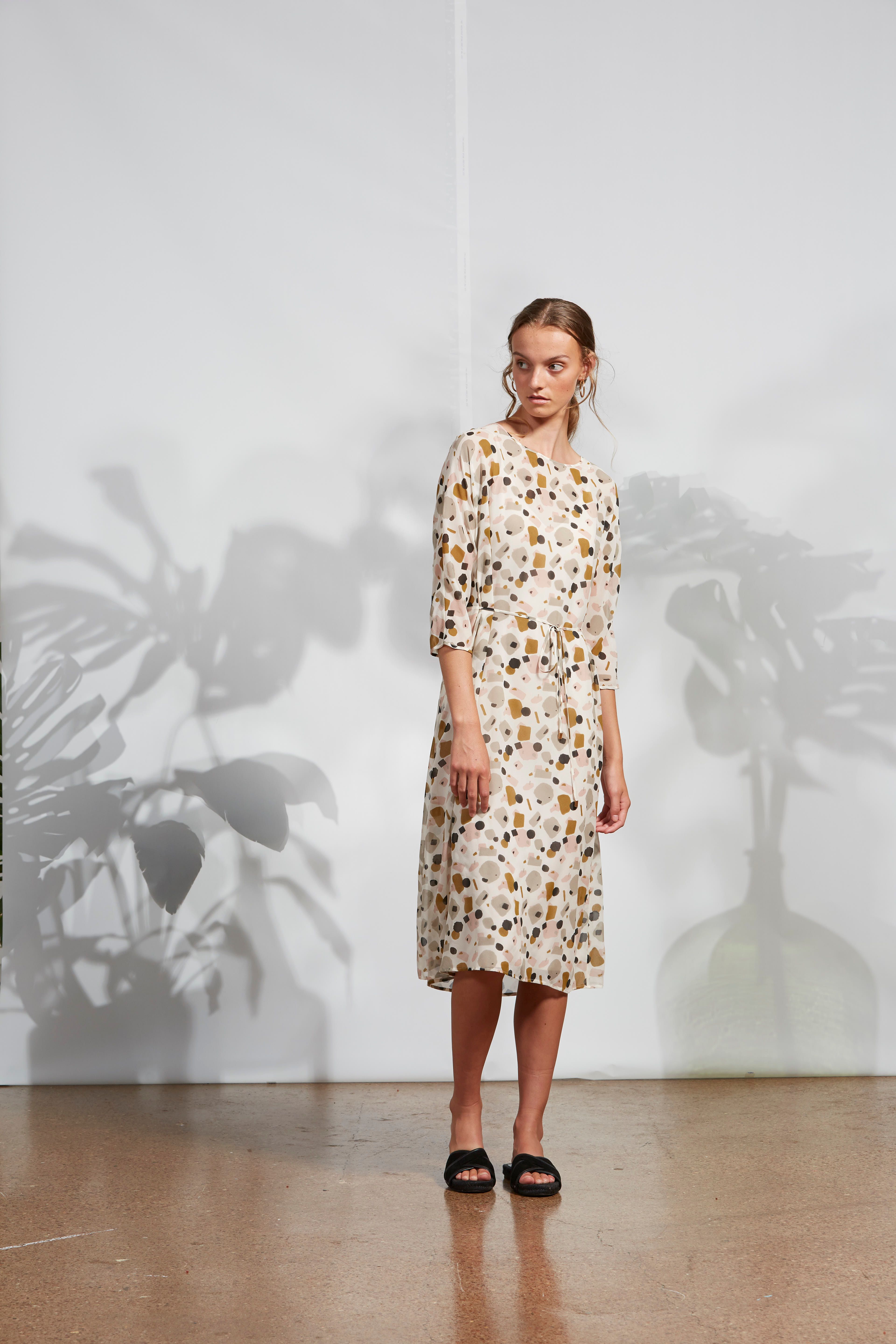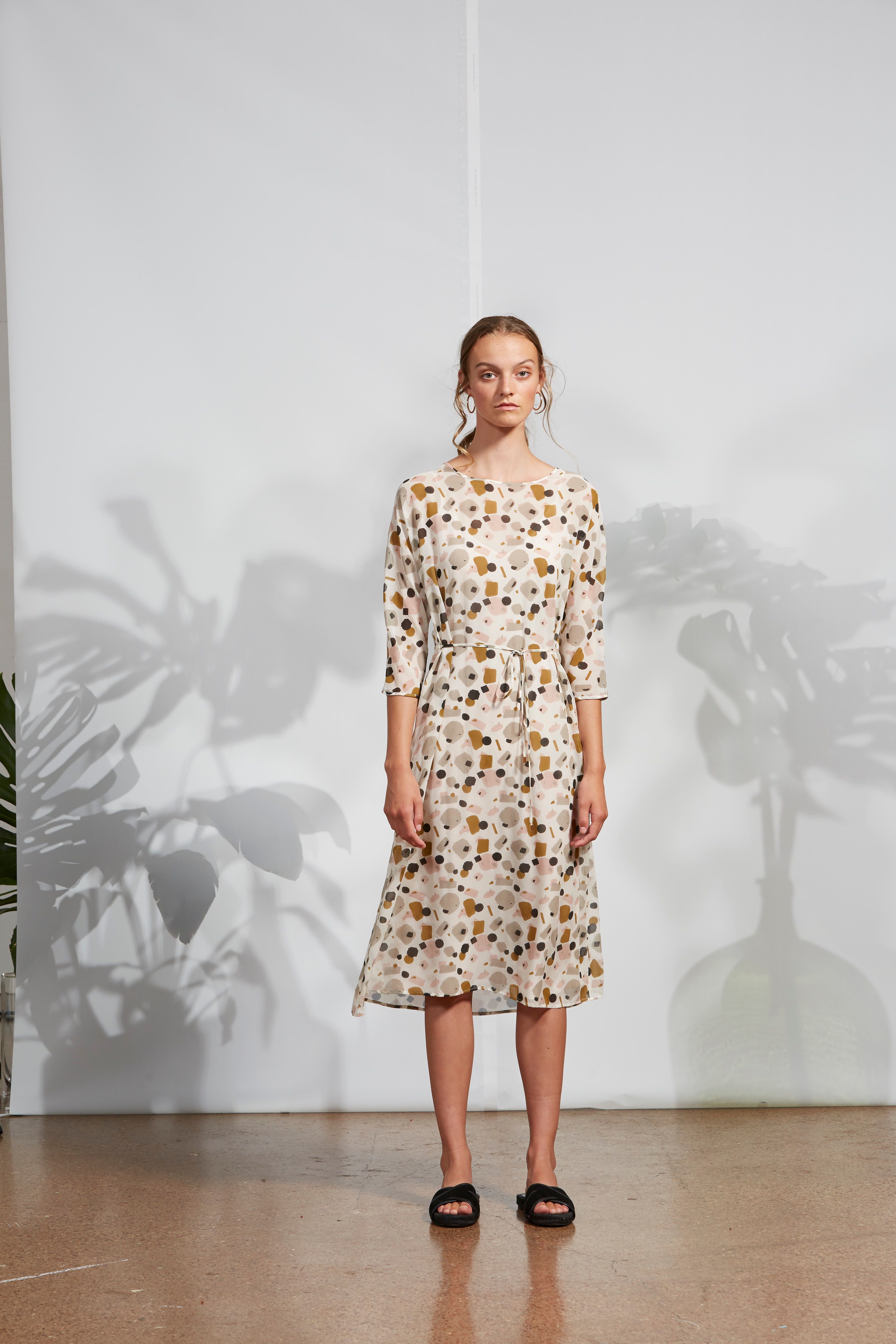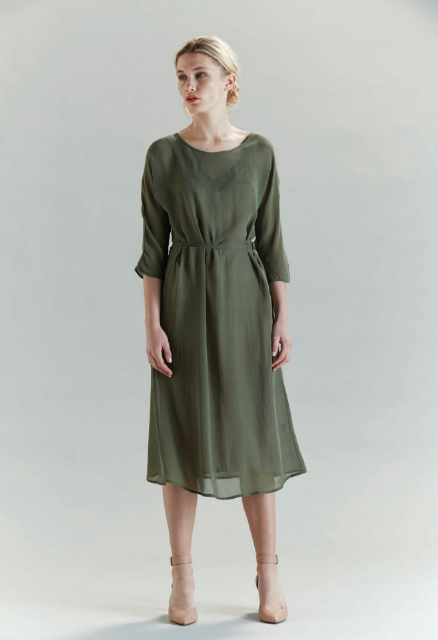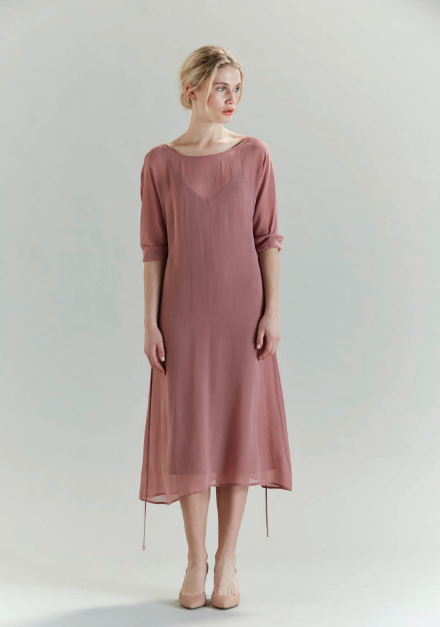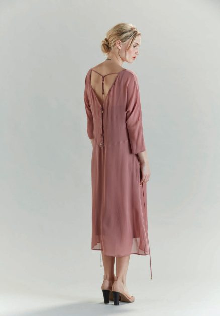 A reversible relaxed everyday dress, features a crew neck and soft raglan style sleeves that skim the elbow. A fine neck tie extends from the top of the shoulders that can be used to draw in and create shape or be left loose to create a relaxed look. A low V-shape can be worn to the back or front with shell buttons down to waist seam. Hem falls to just below the knee.