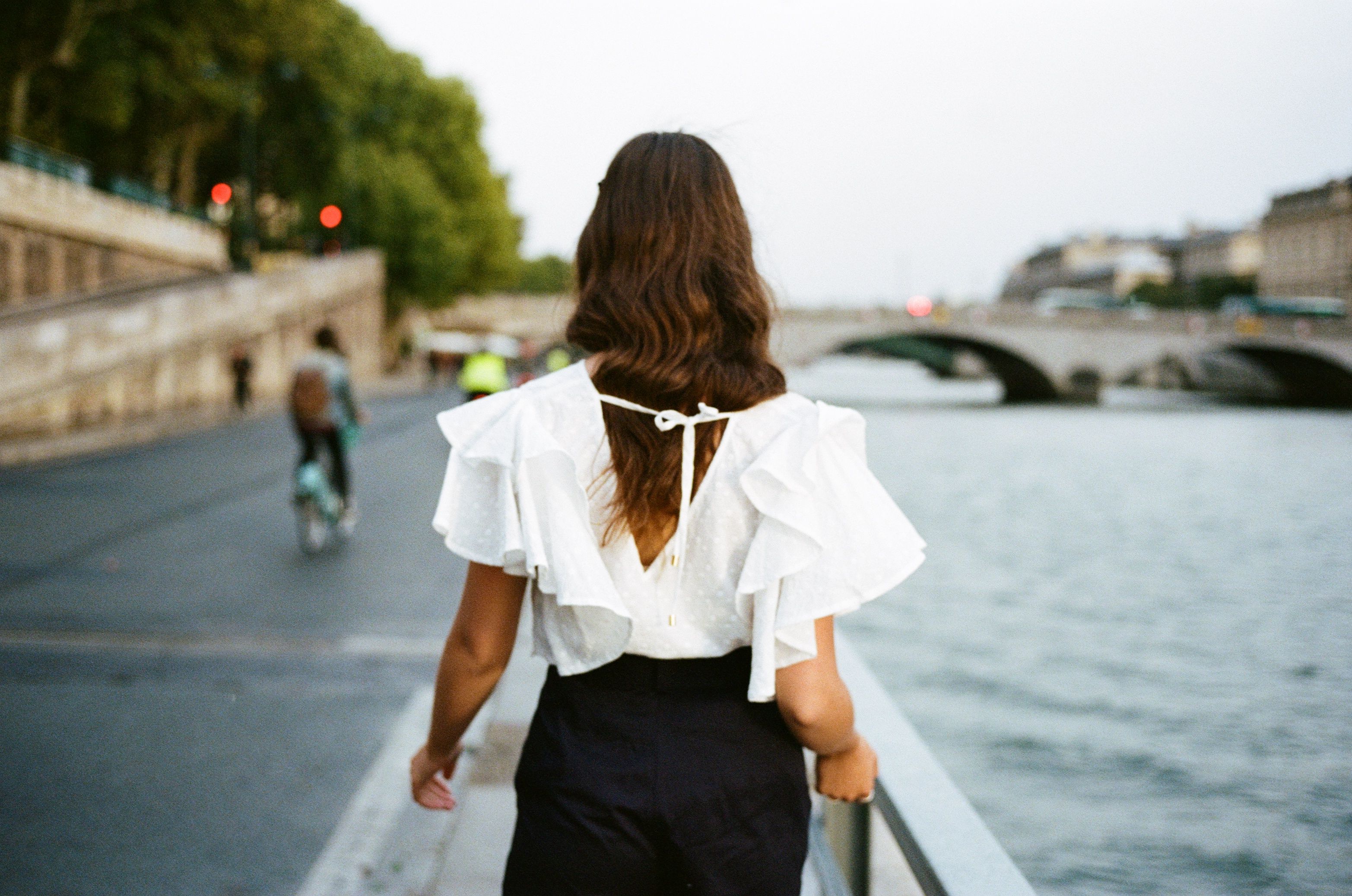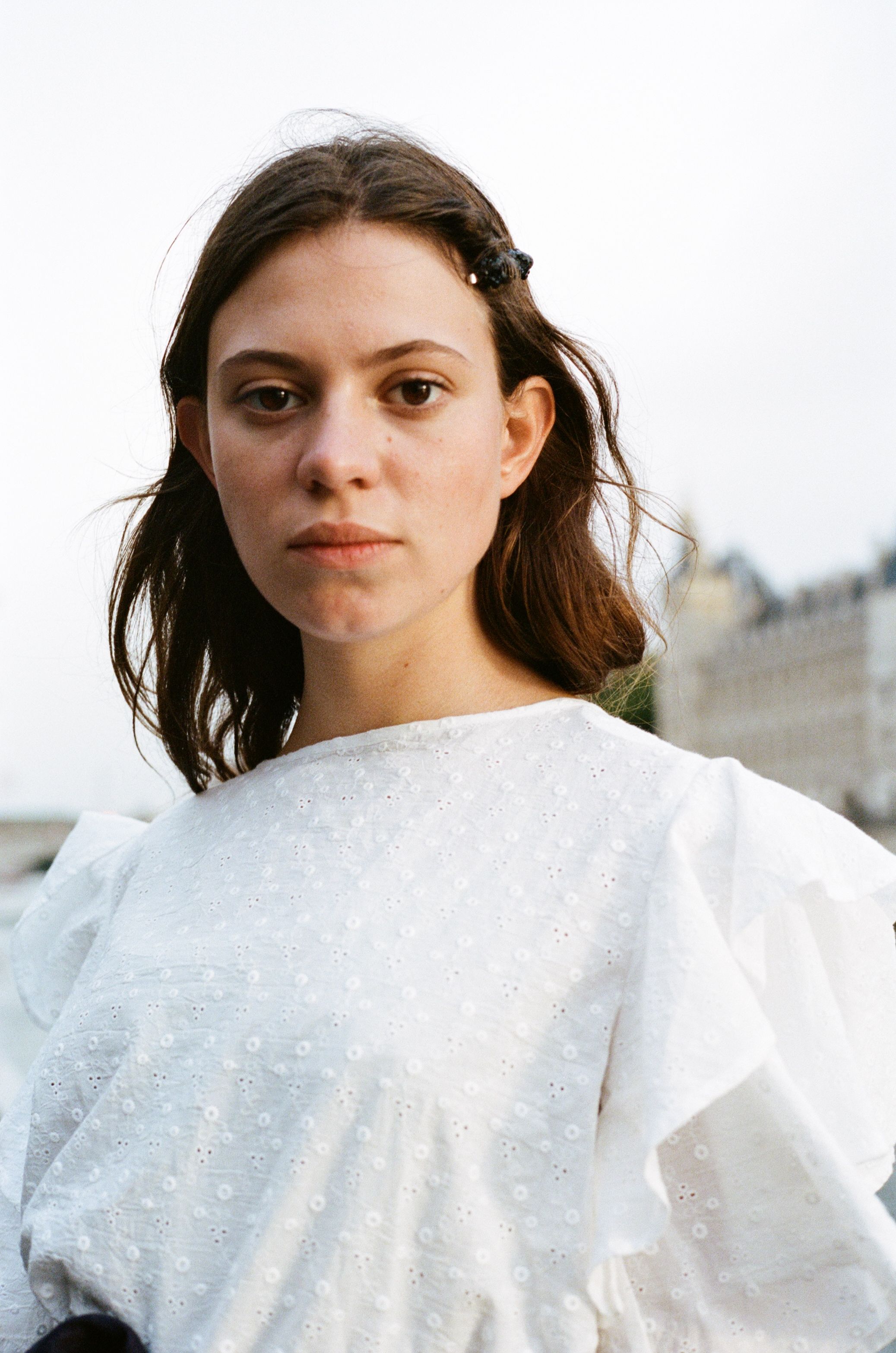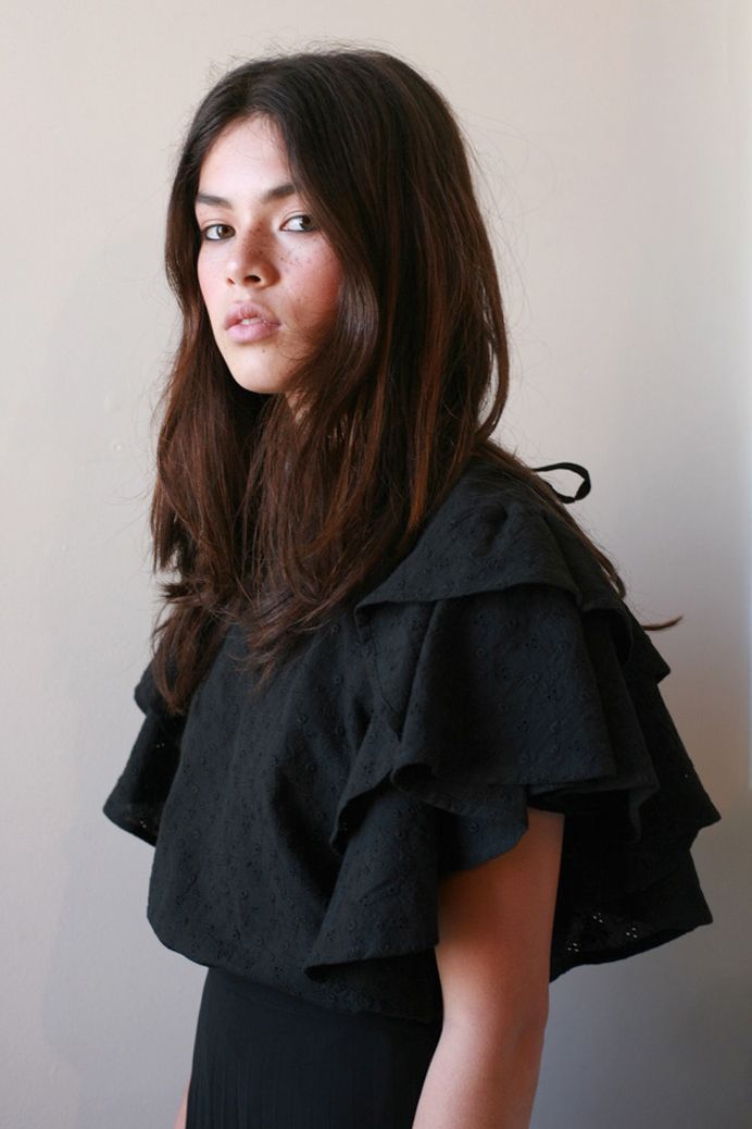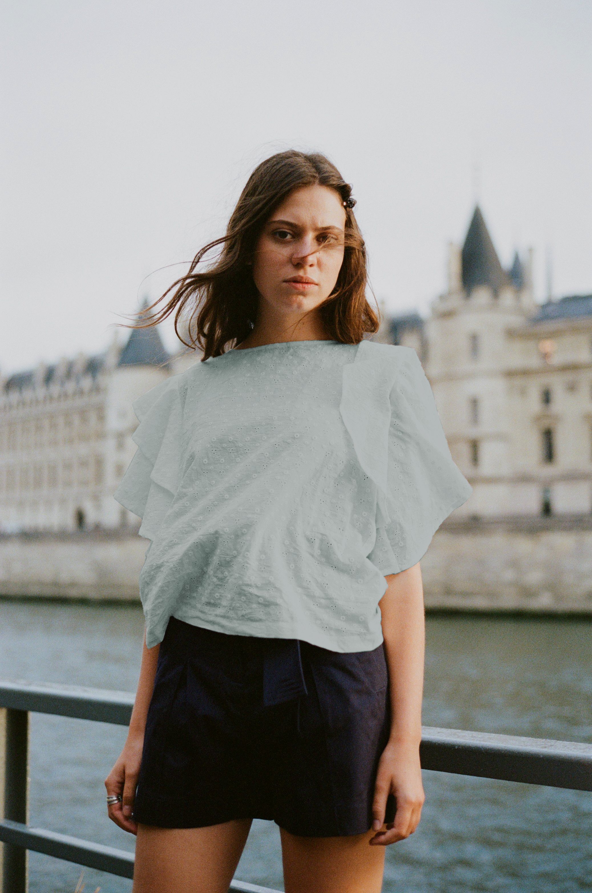 With a frill layer short sleeve, relaxed fit in the body and in a beautiful cotton broderie, creates a perfect top for summer days. Open V-back with tie across shoulders. Hem finishes at hips.
