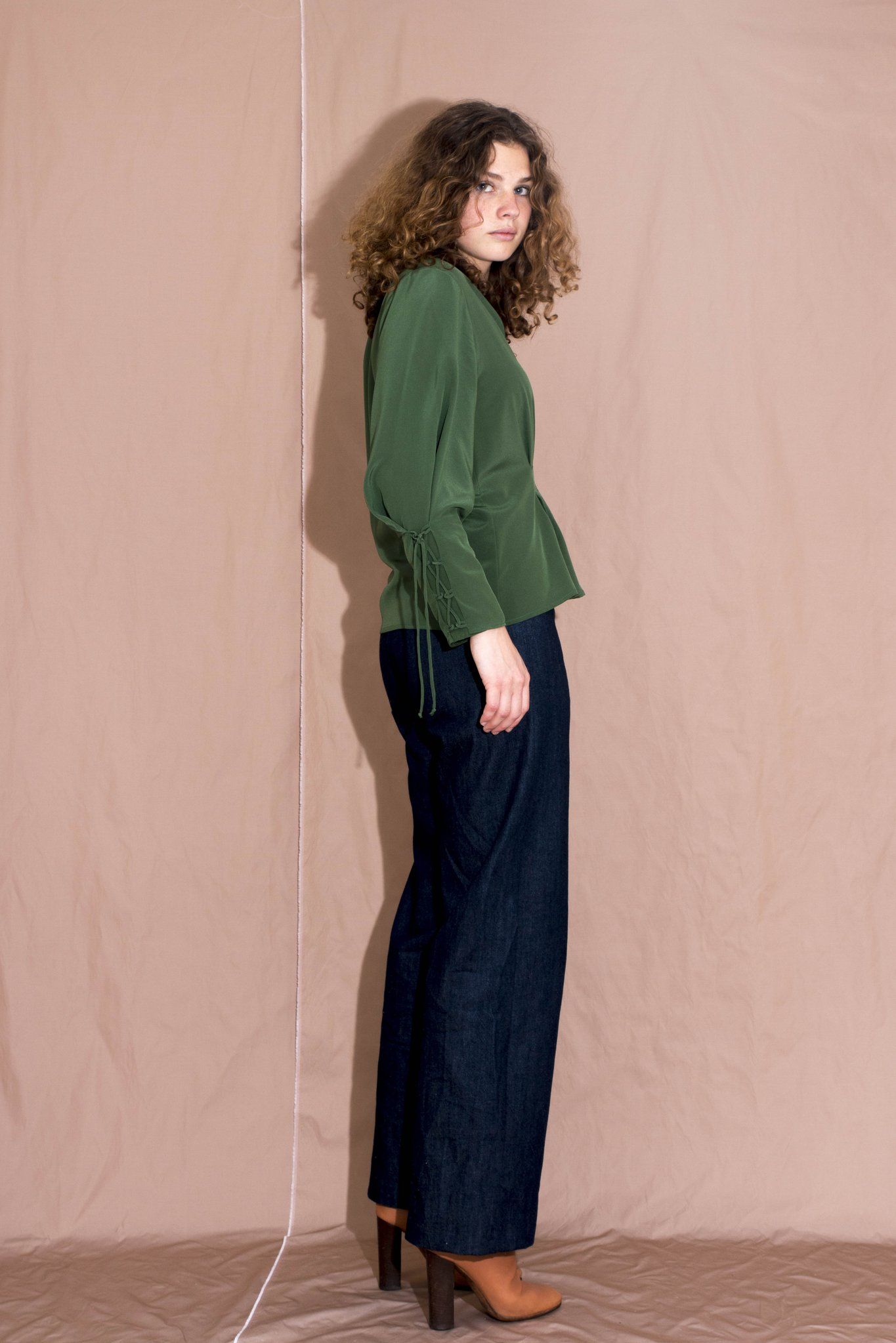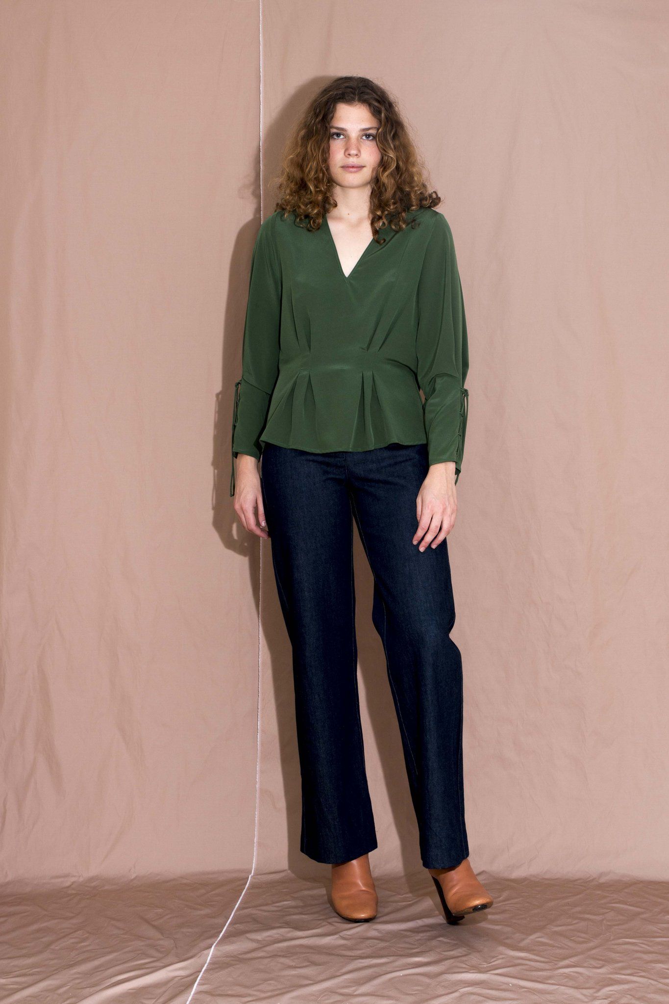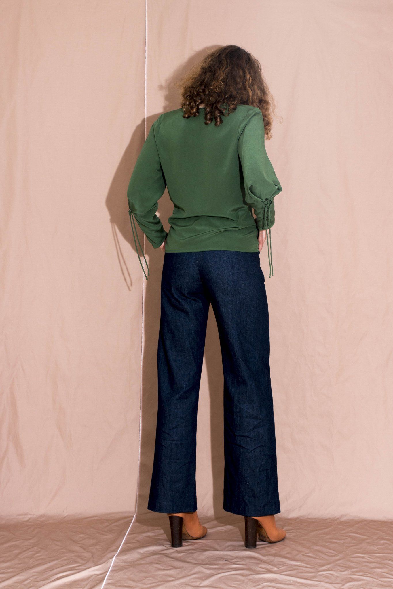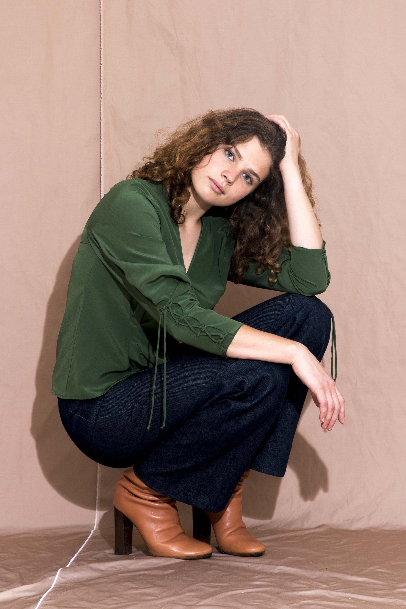 Lace-up sleeve detail Double tucks at front of the body Hem finishes at the hip V-neck