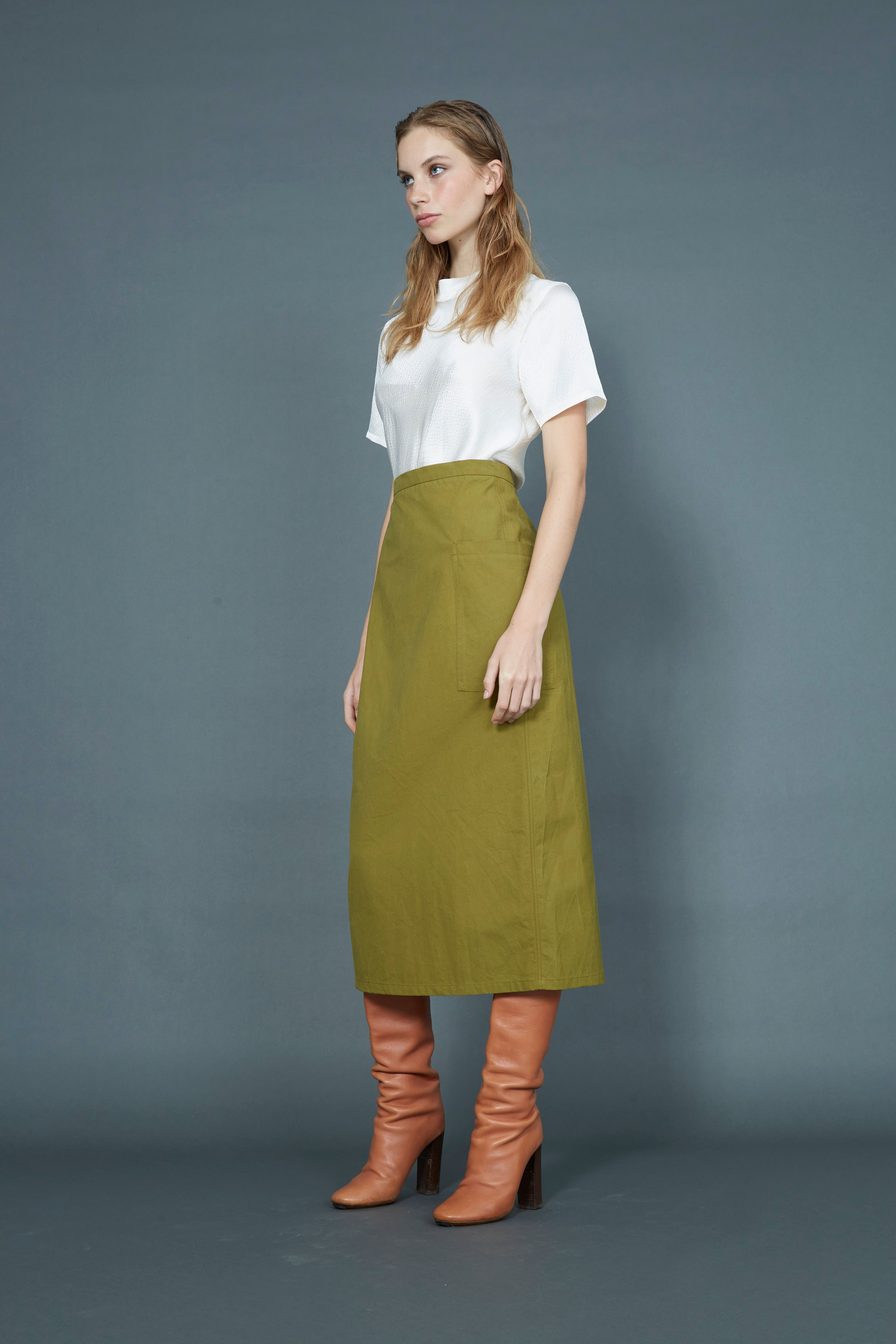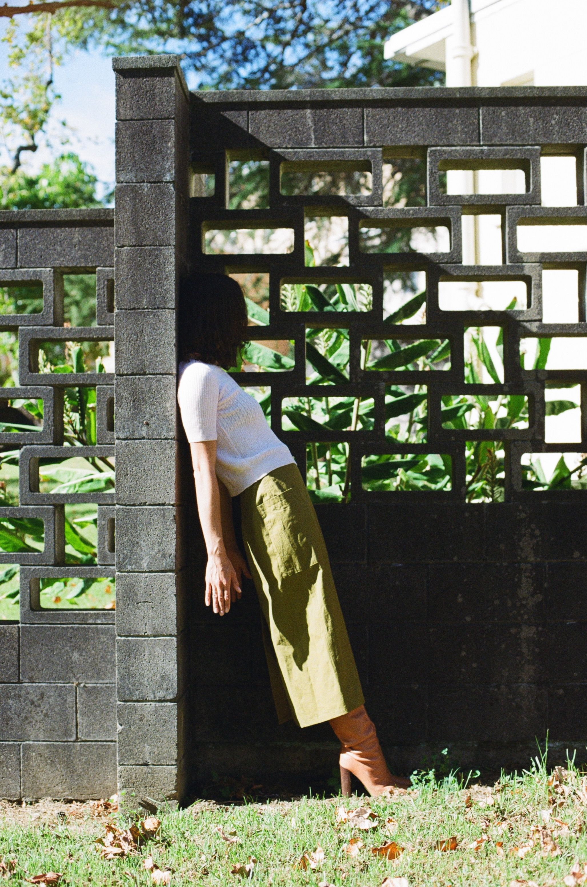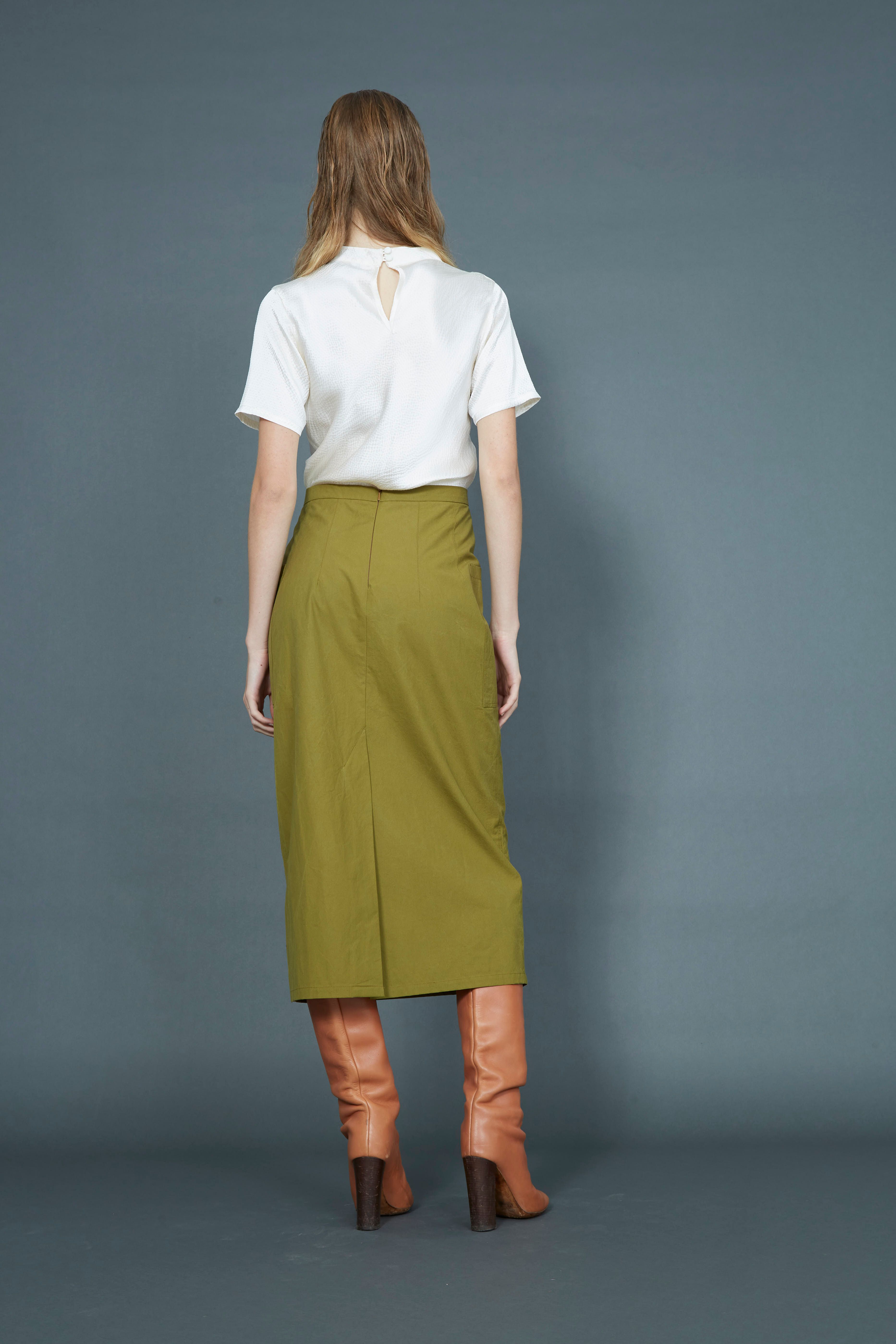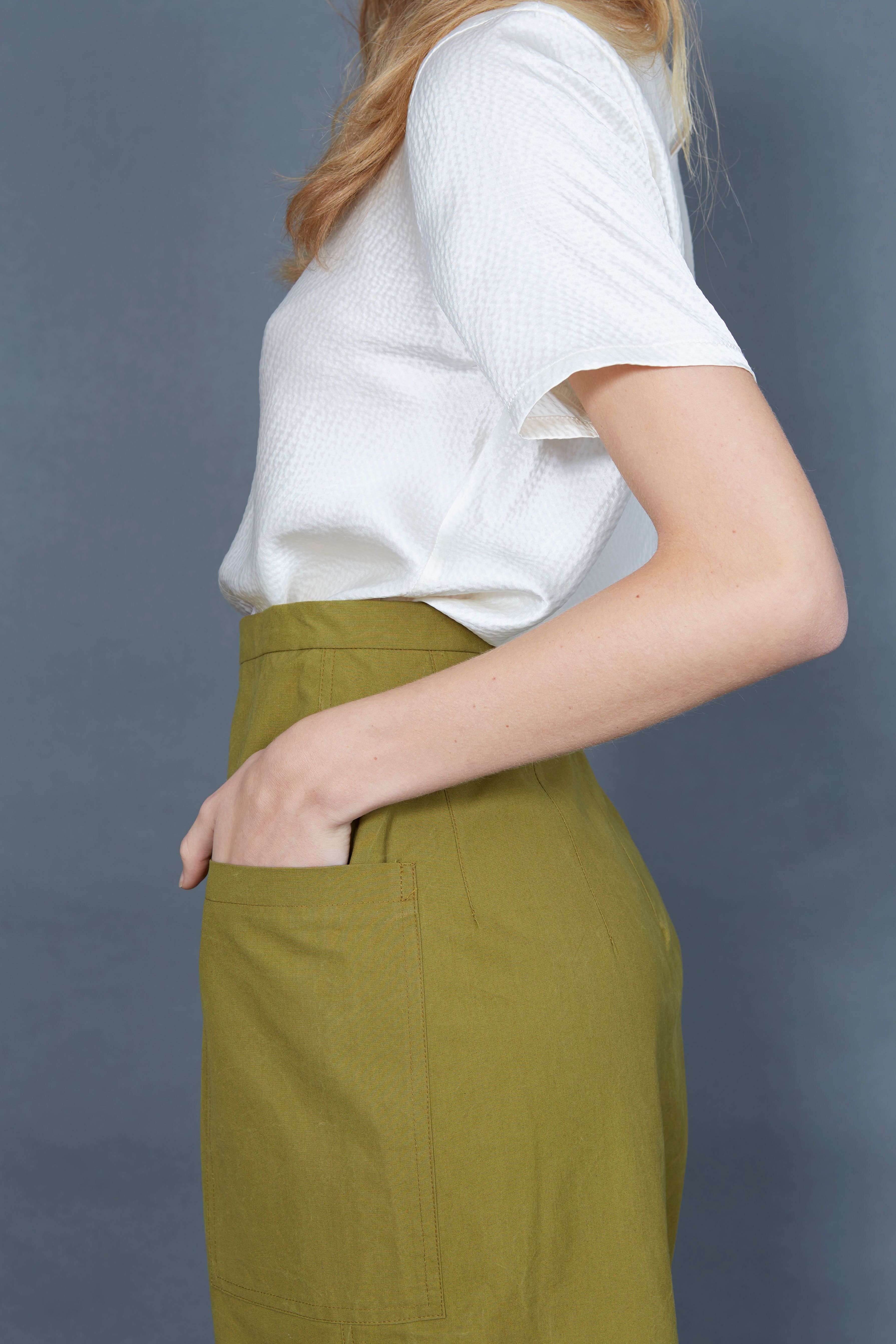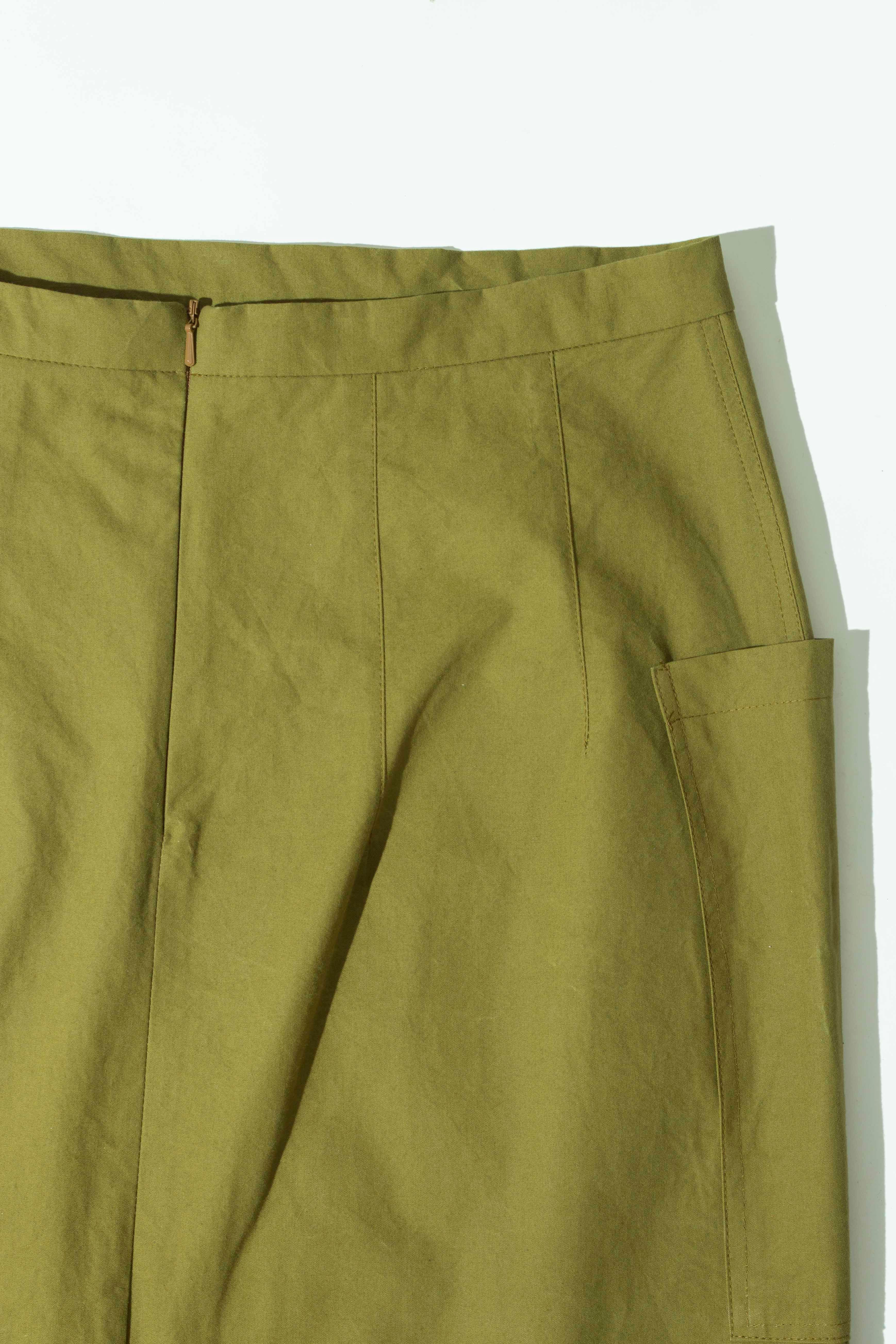 Darts on front and back to create shape Invisible zip at the back Two exposed pockets on the side Kick-pleat at the center back Hem finishes mid-calf