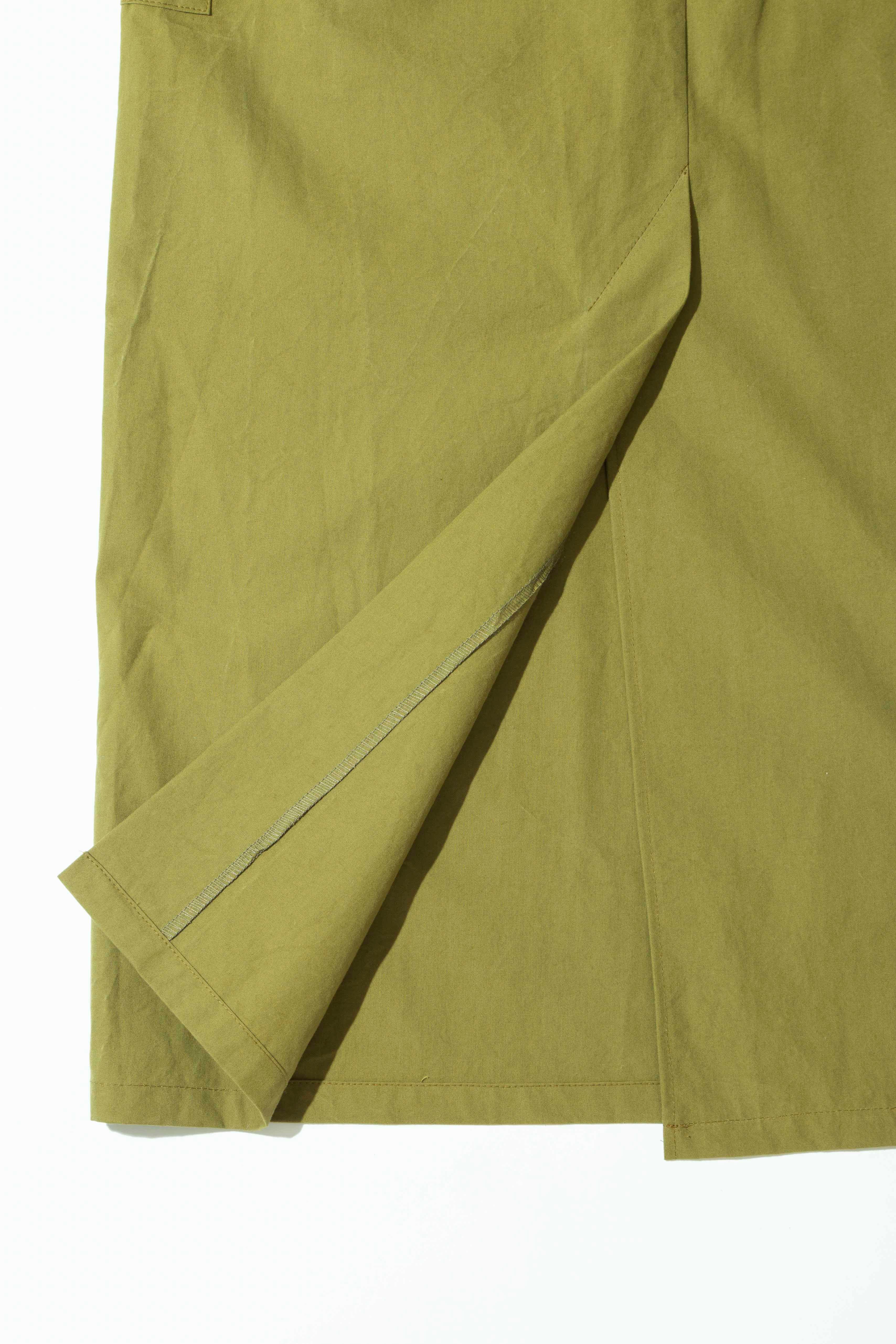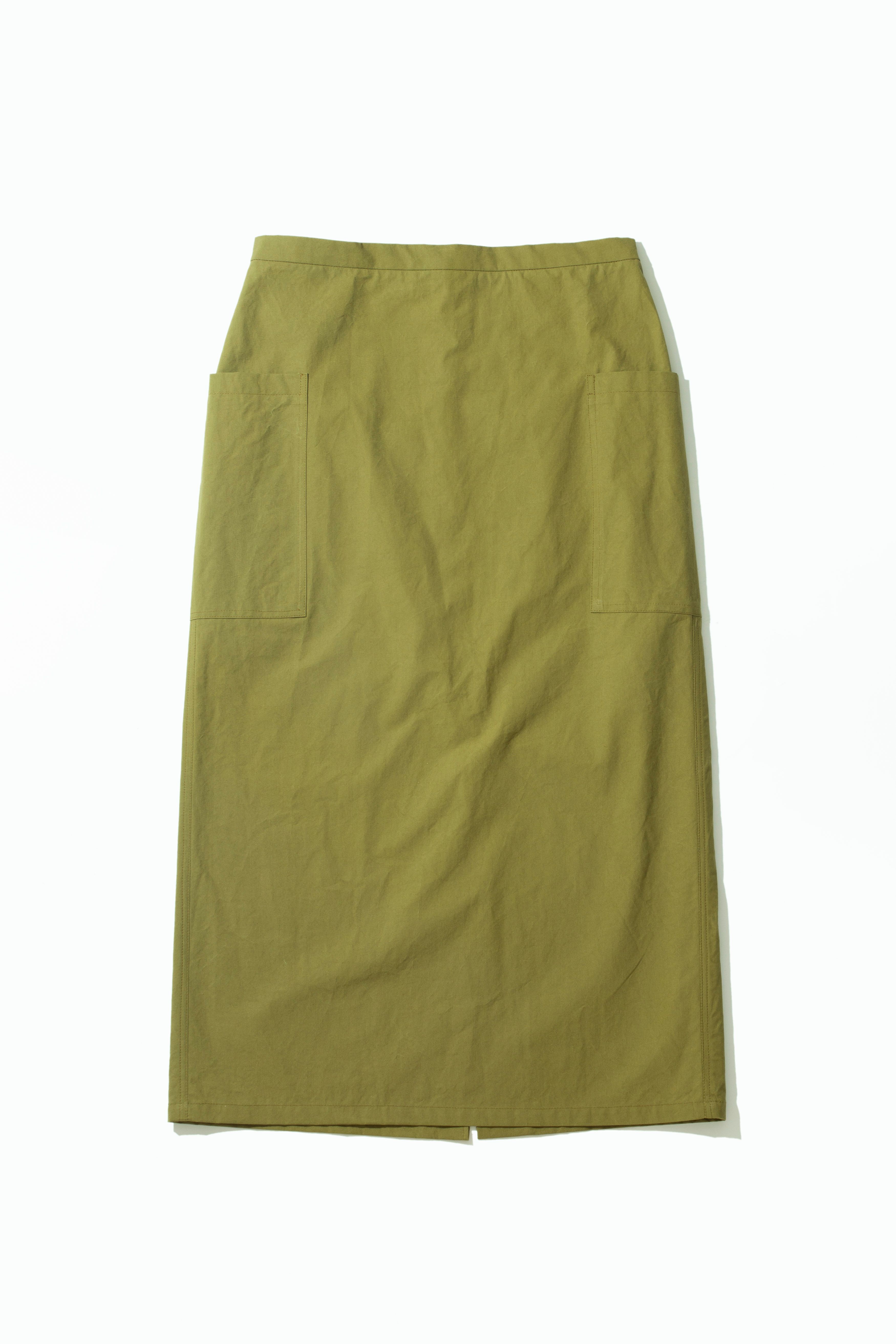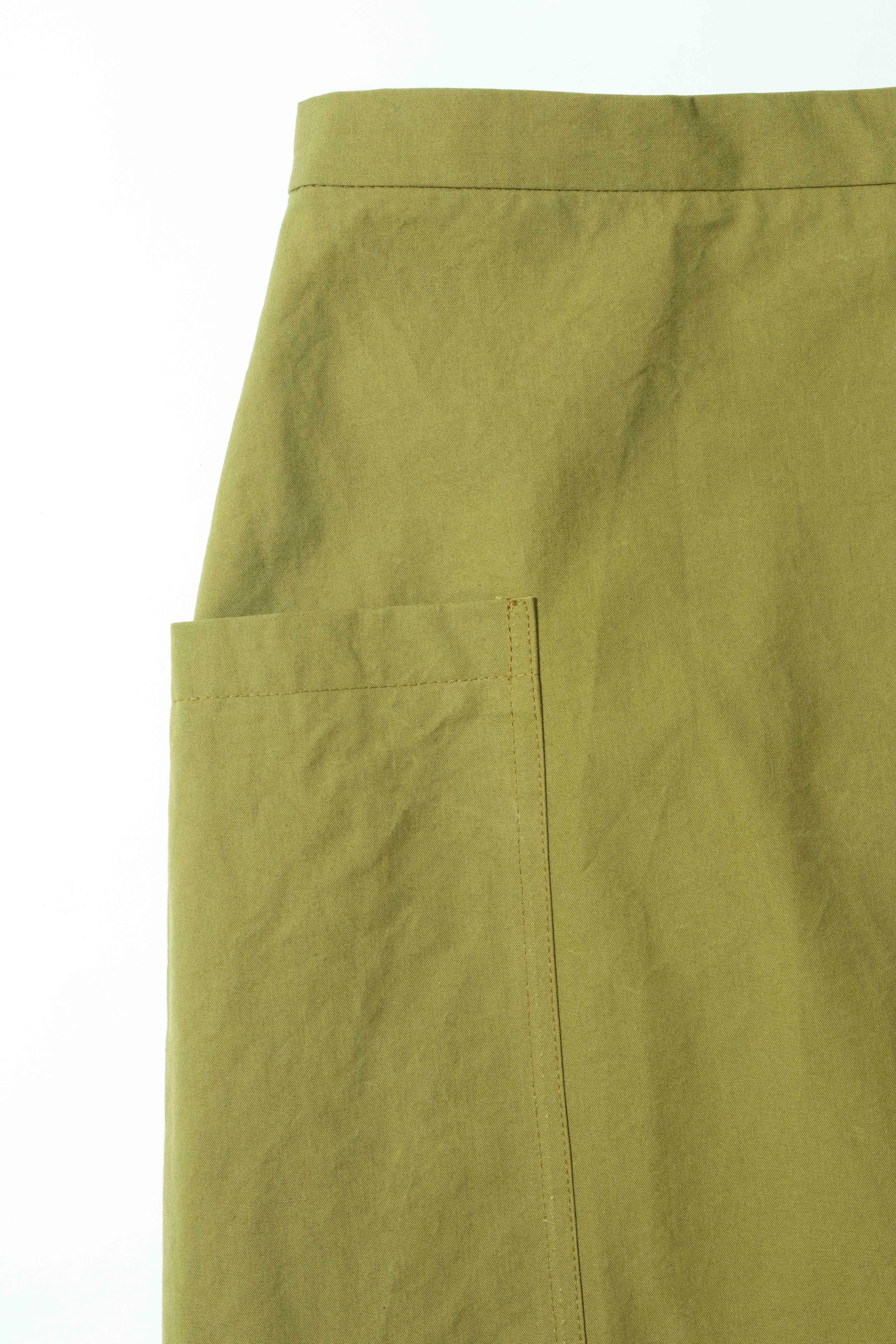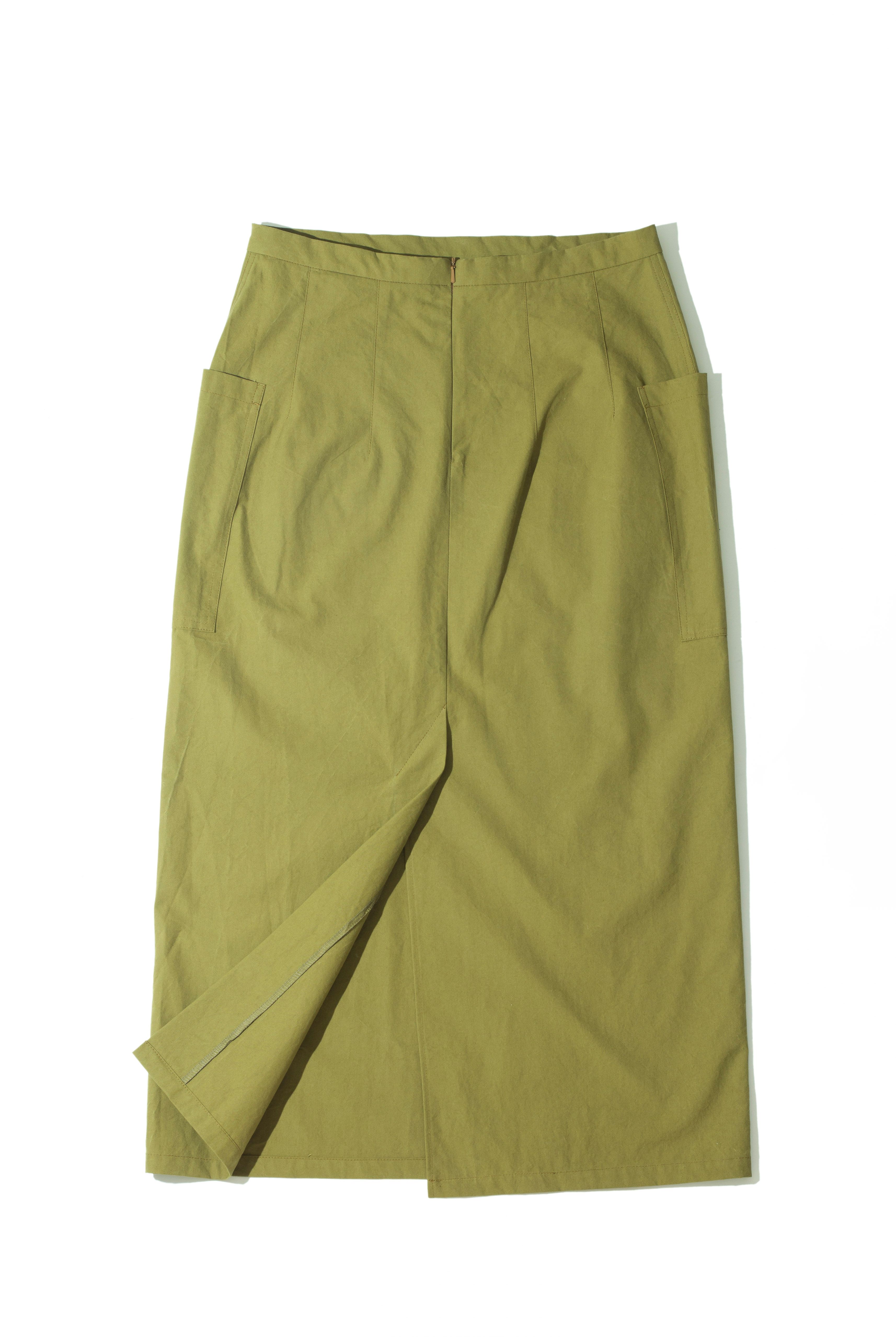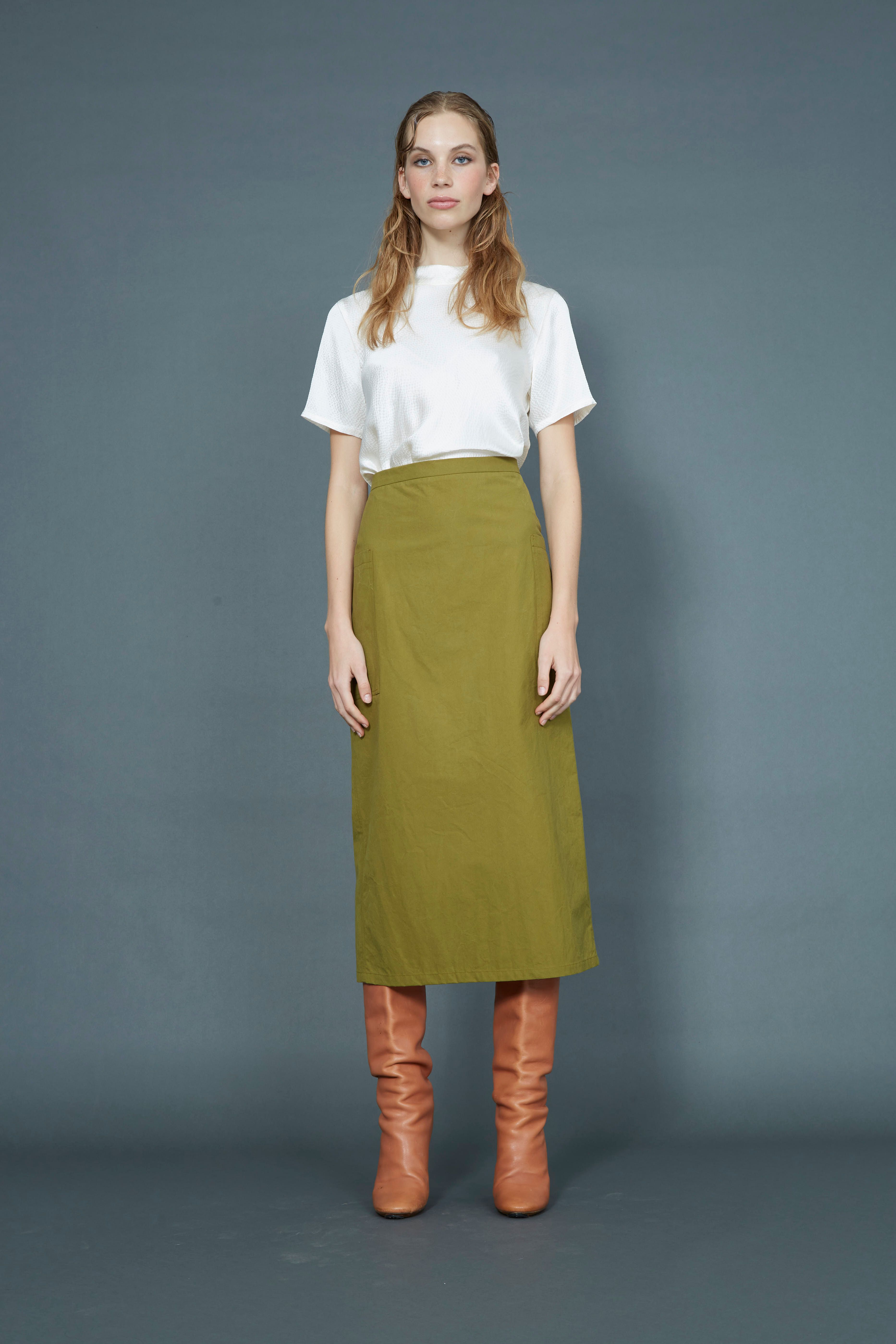 Darts on front and back to create shape Invisible zip at the back Two exposed pockets on the side Kick-pleat at the center back Hem finishes mid-calf