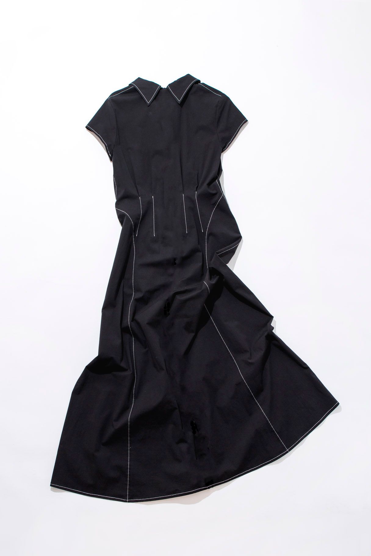 The Reve dress is made from a beautiful cotton elastane mid weight poplin featuring a collar keyhole detail with a front button through placket. Featuring white contrast stitching.