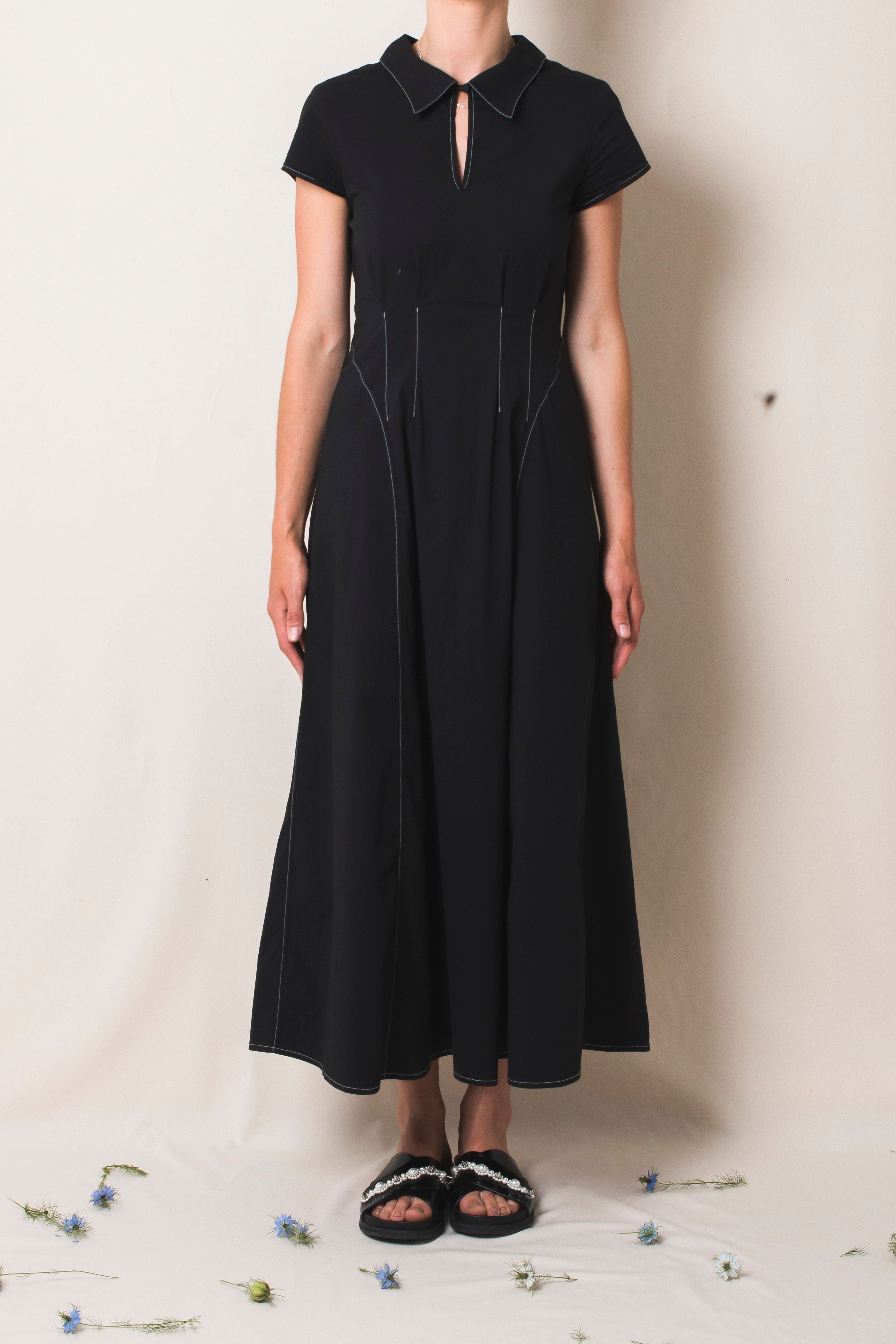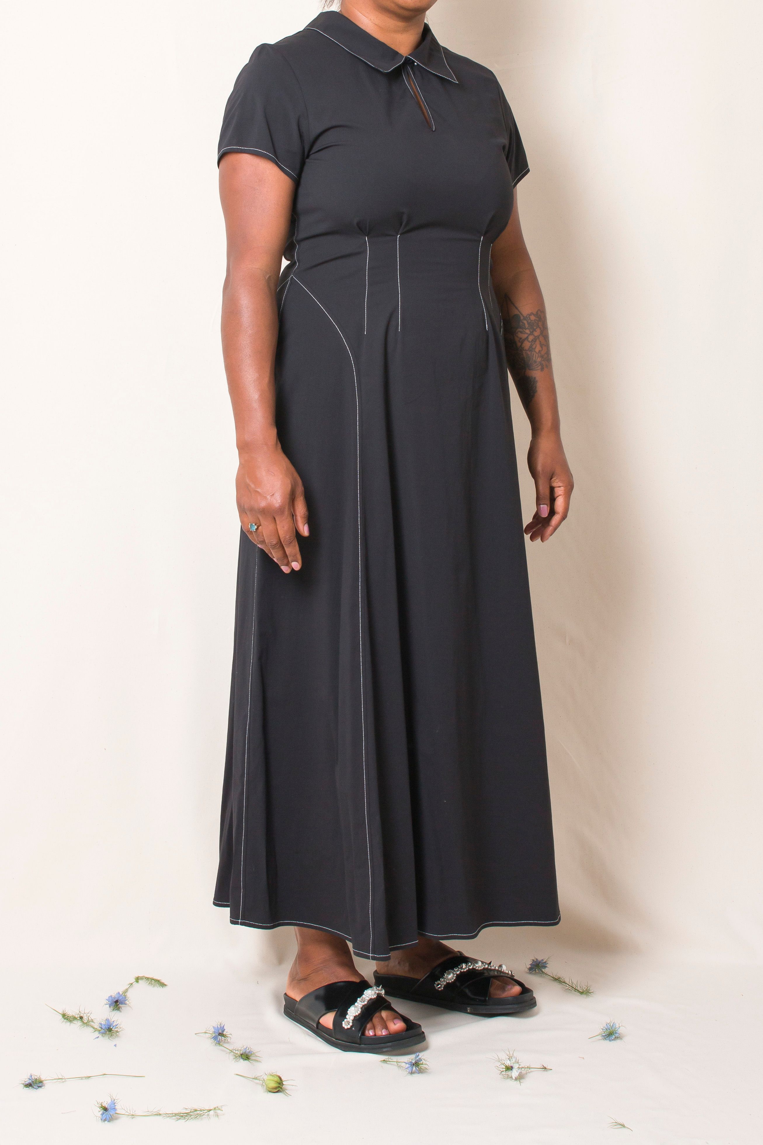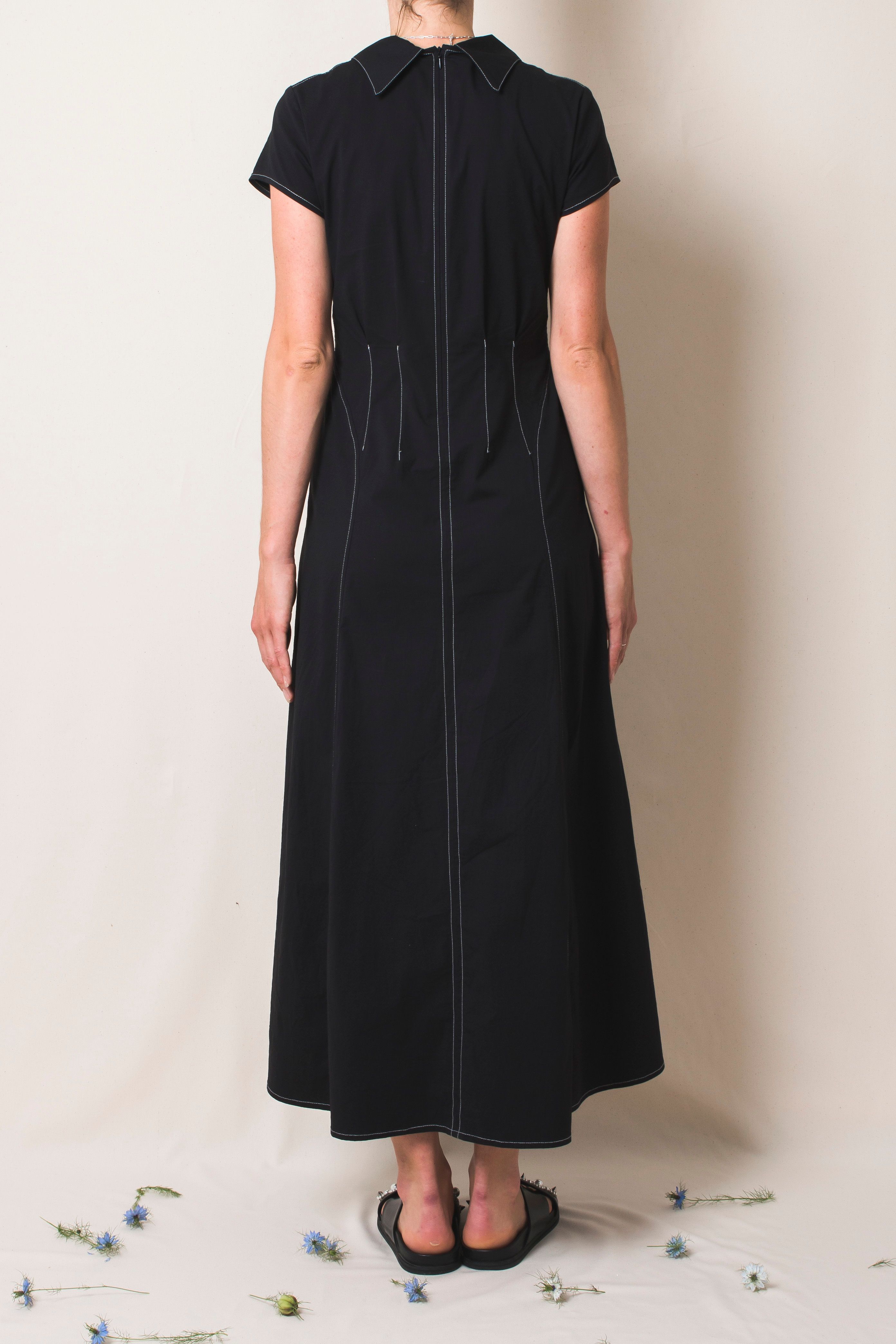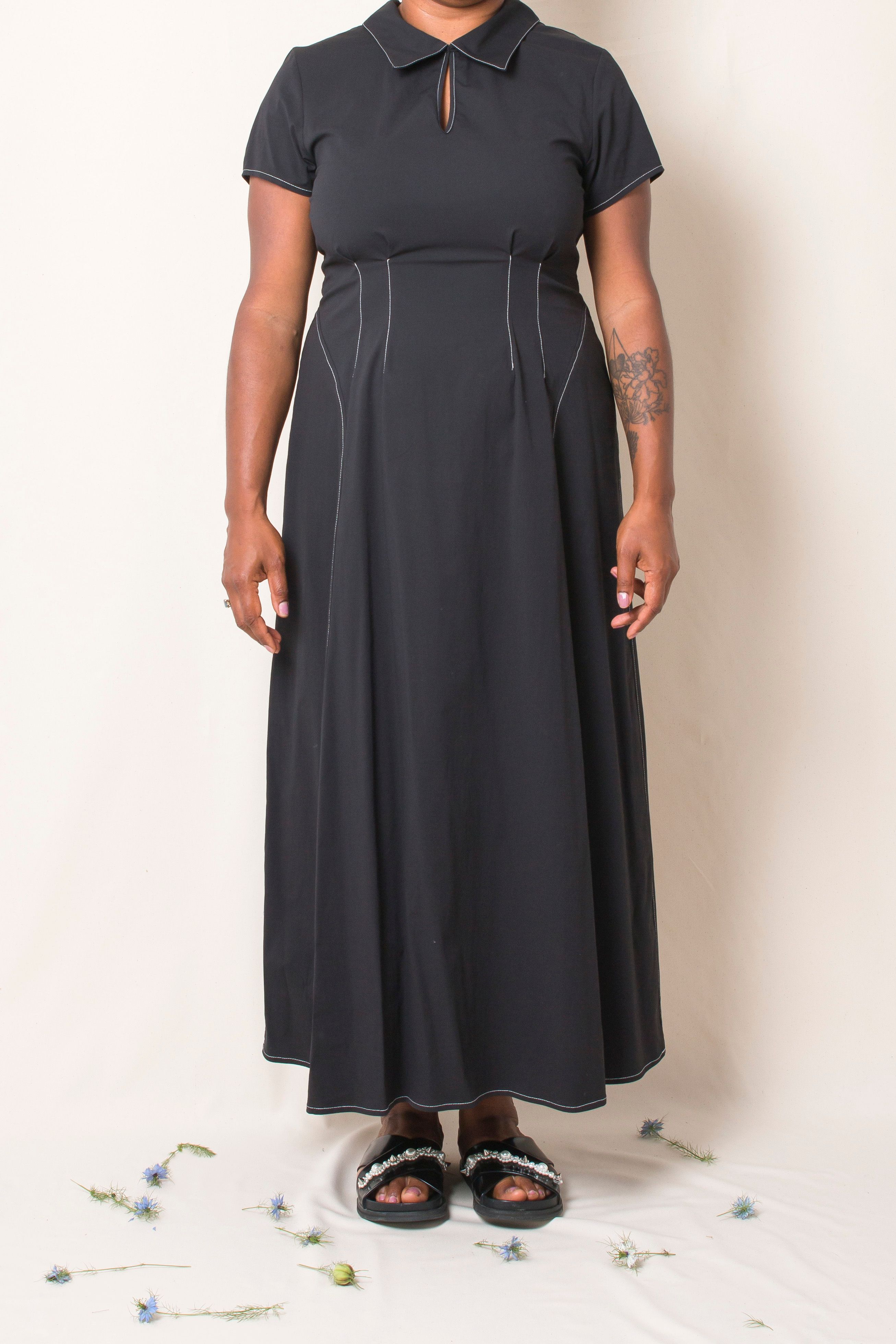 Contrast stitching Keyhole detail with button at top neck Invisible zip up the center back Darts at the waist for shape Cap sleeves Made in Aotearoa