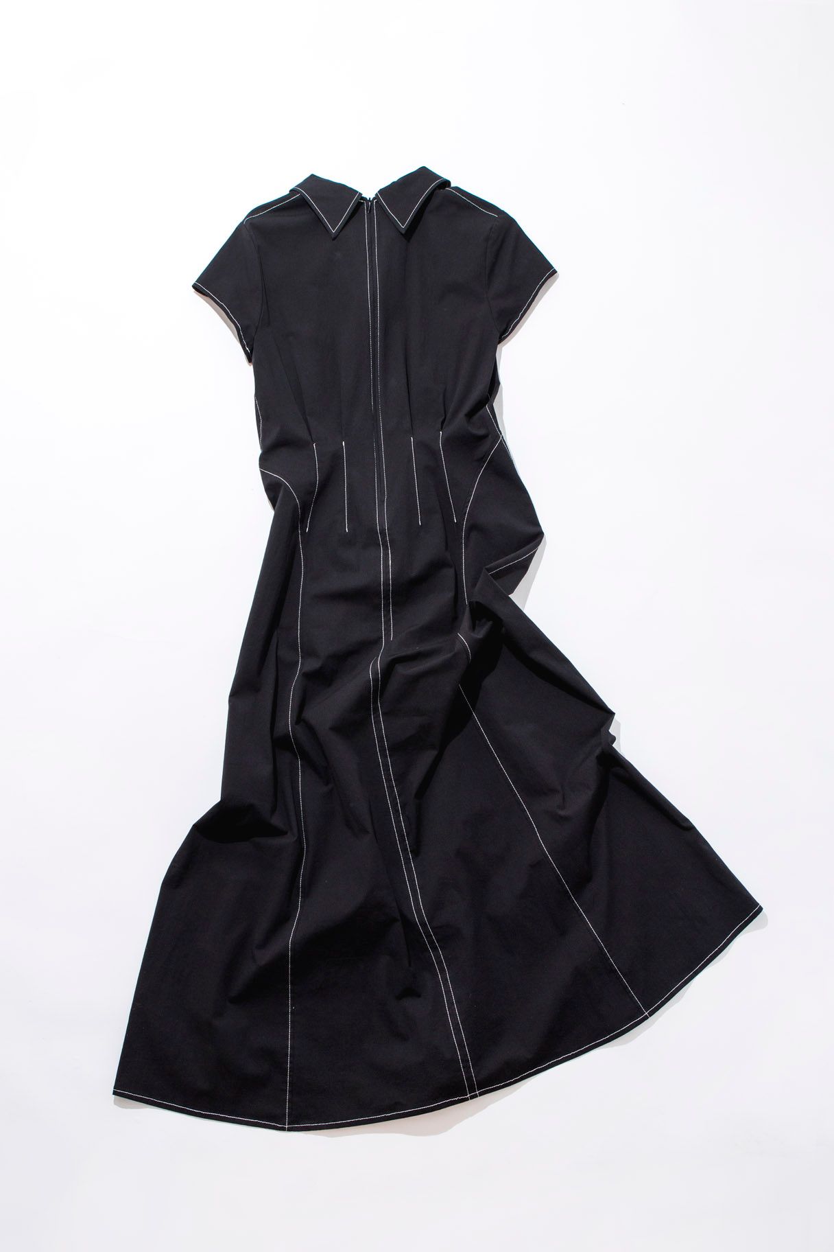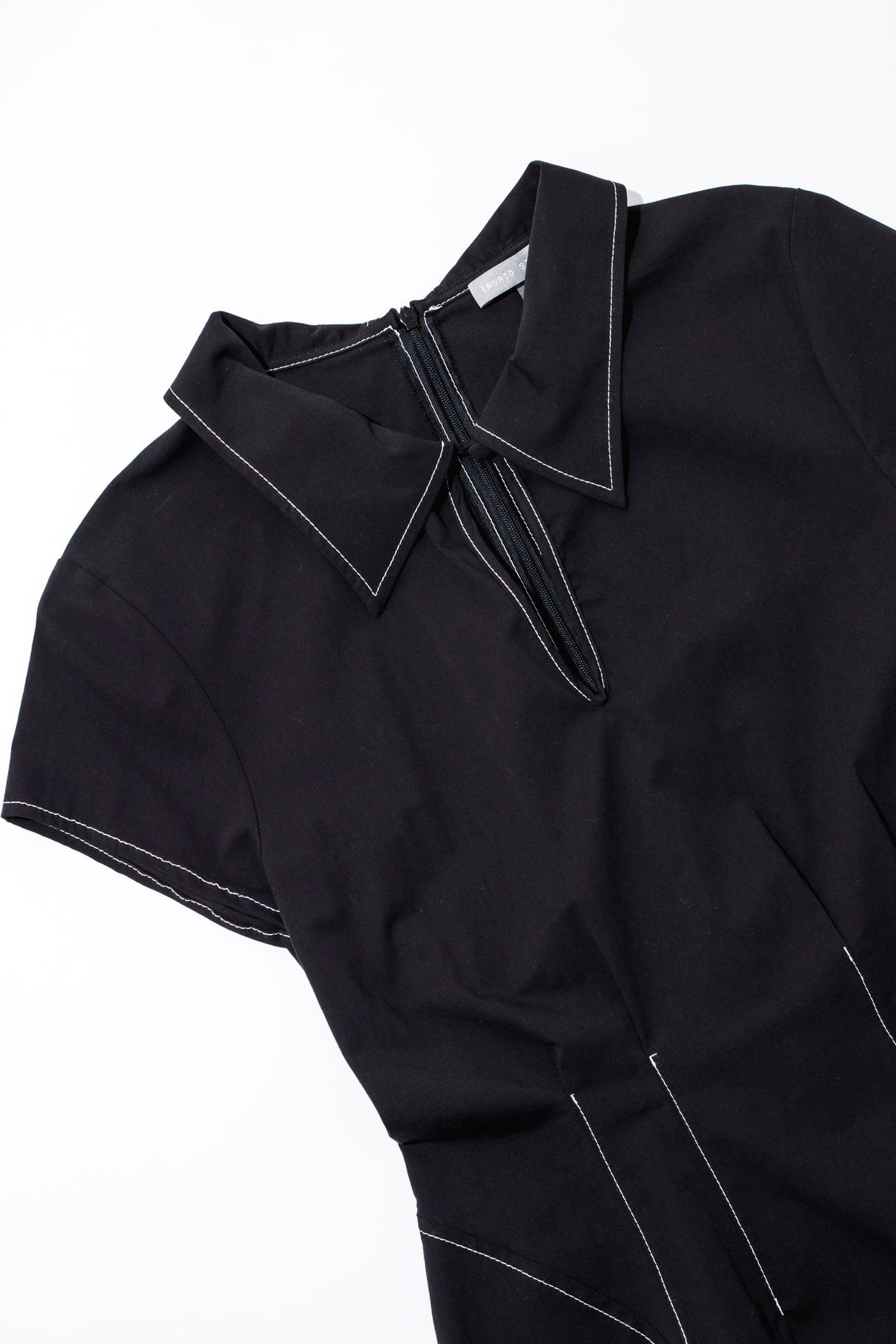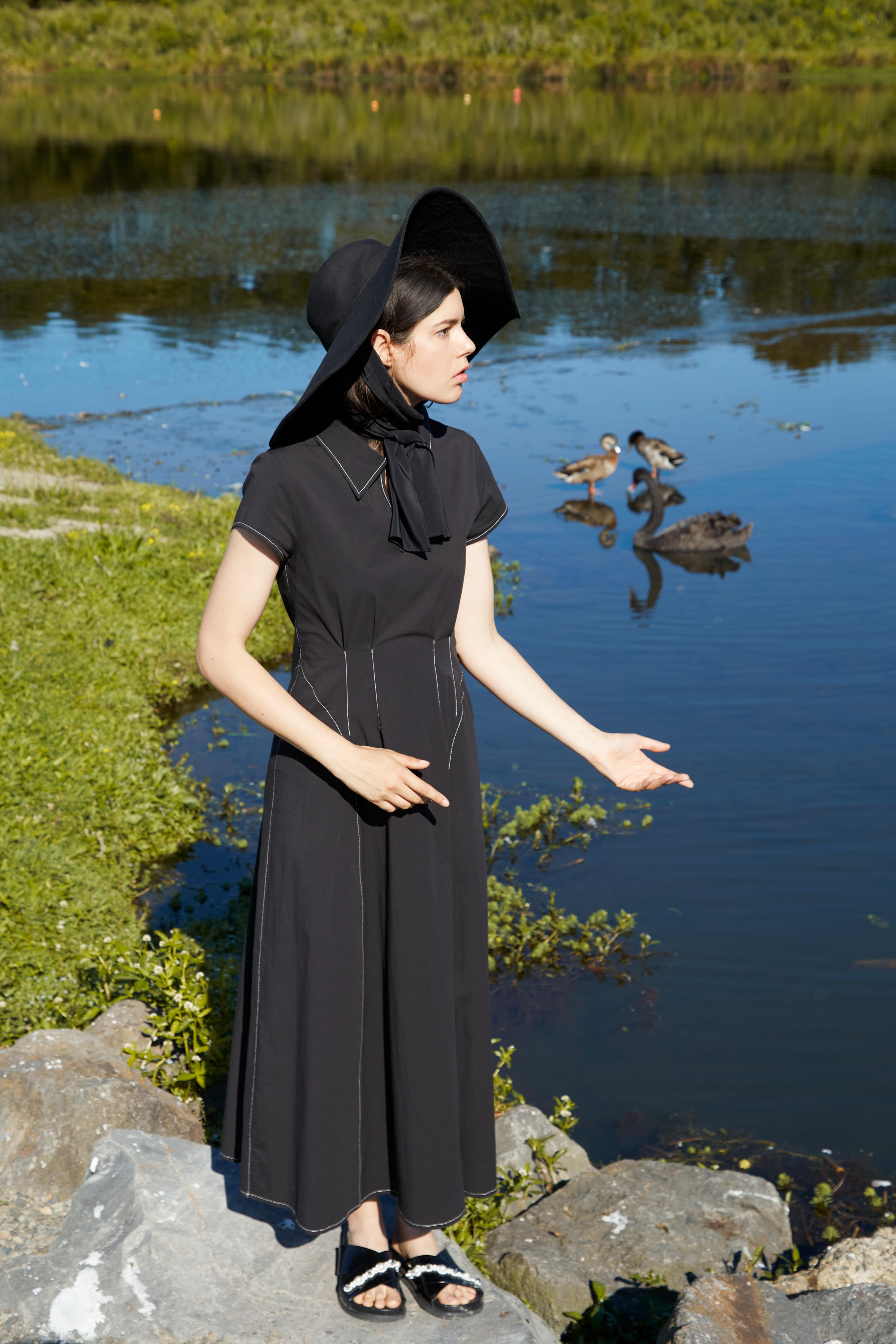 Contrast stitching Keyhole detail with button at top neck Invisible zip up the center back Darts at the waist for shape Cap sleeves Made in Aotearoa