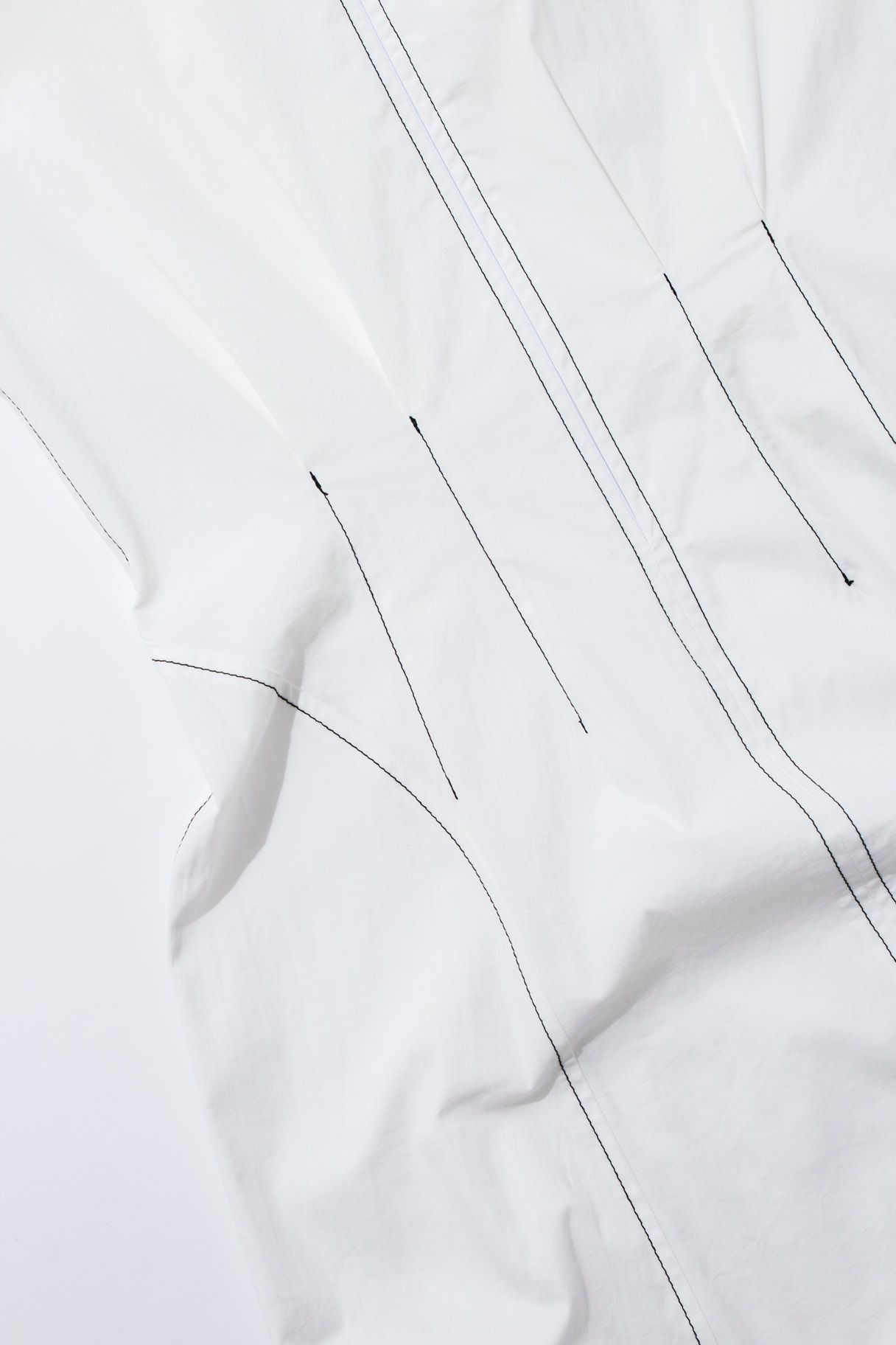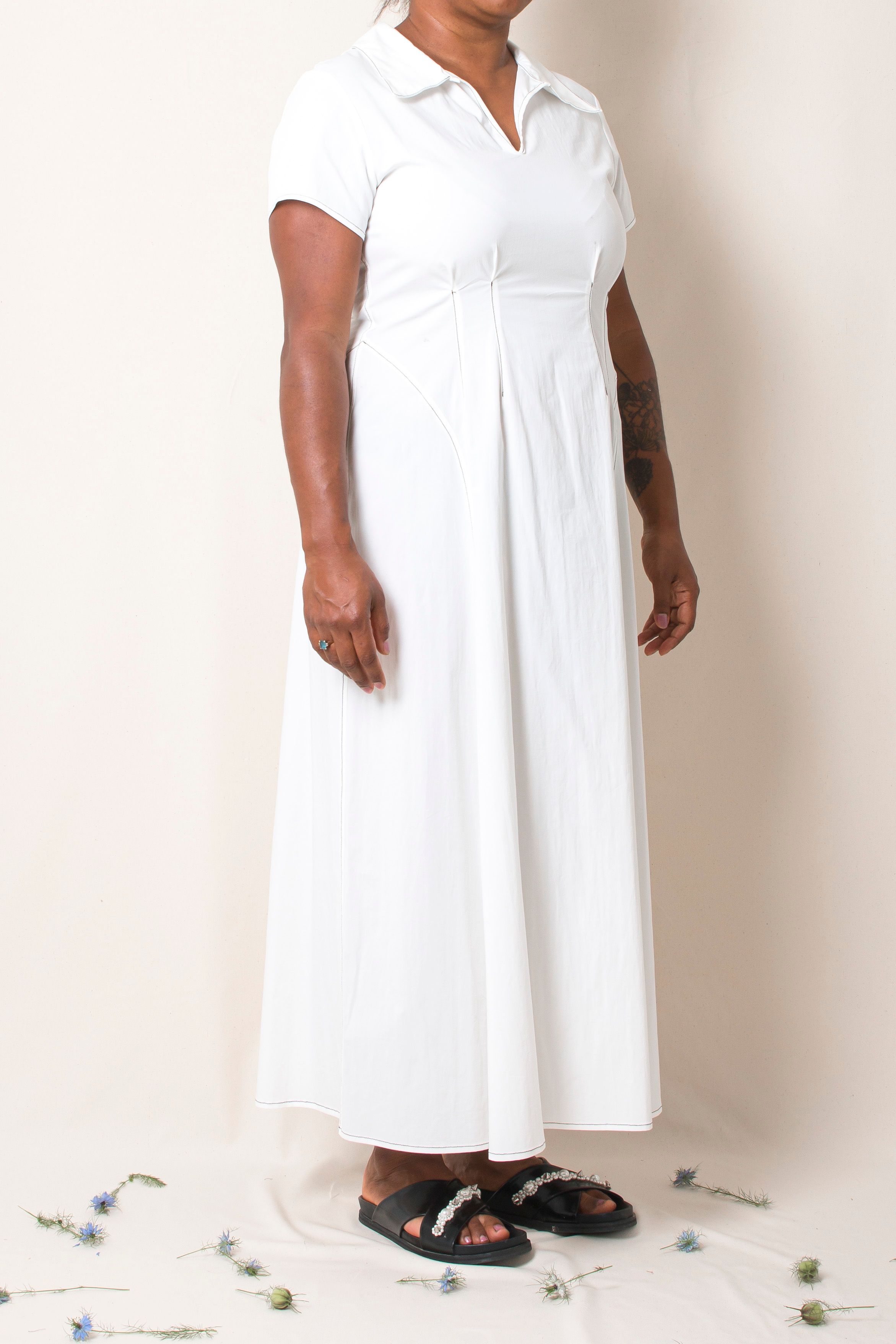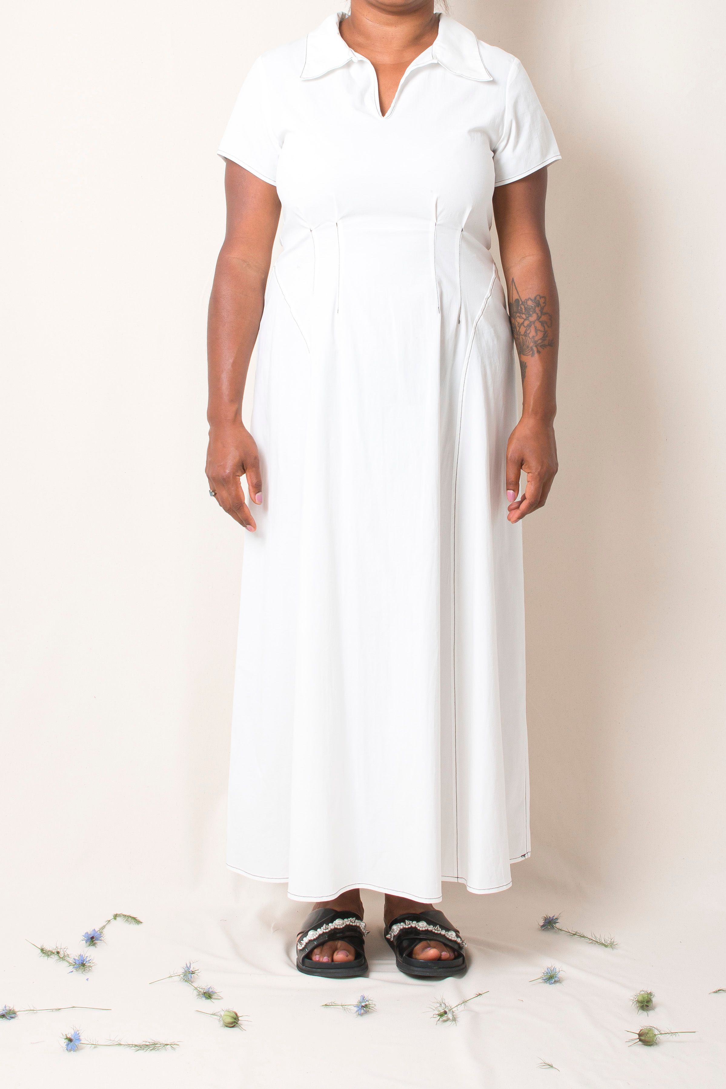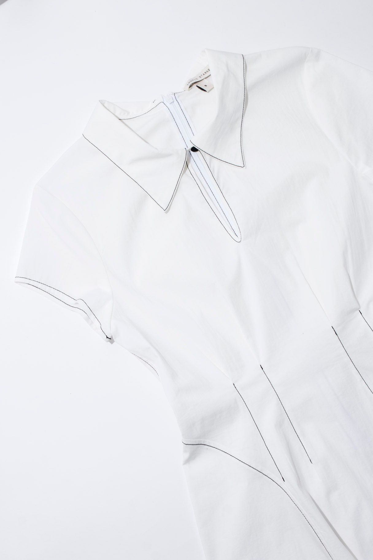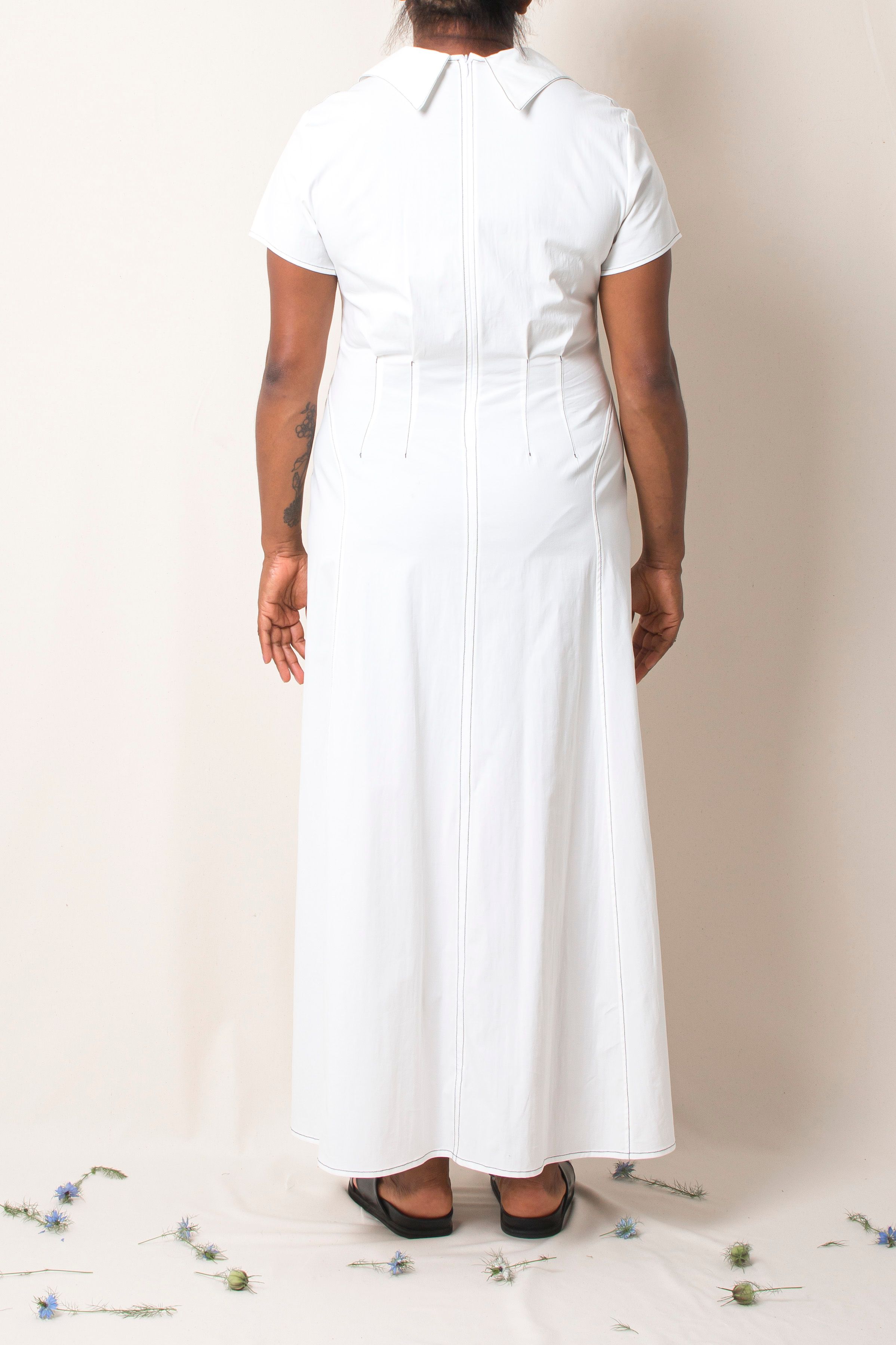 Contrast stitching Keyhole detail with button at top neck Invisible zip up the center back Darts at the waist for shape Cap sleeves Made in Aotearoa