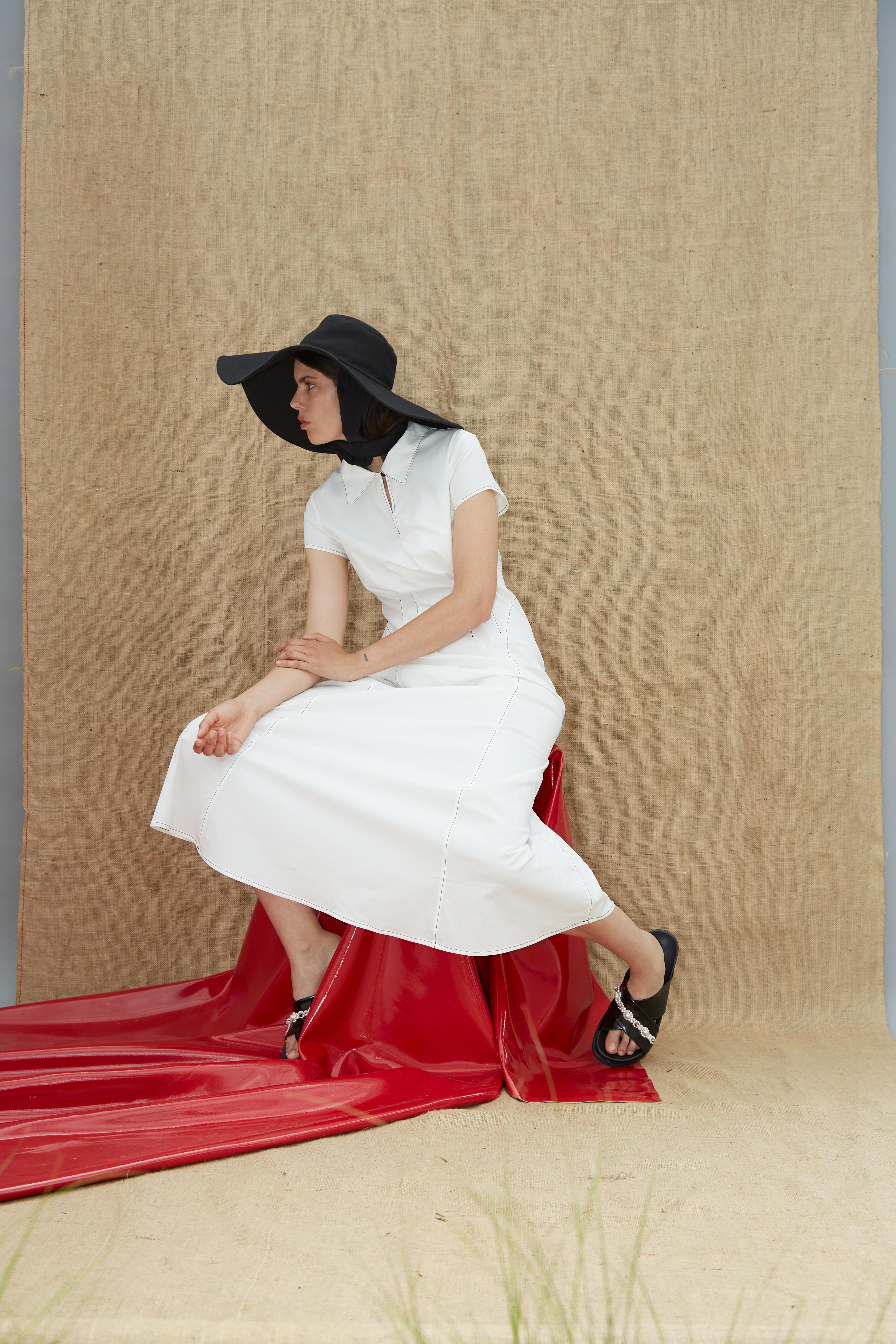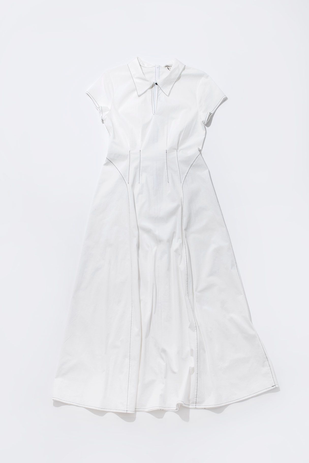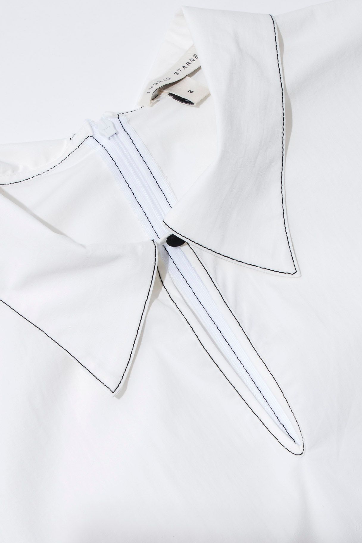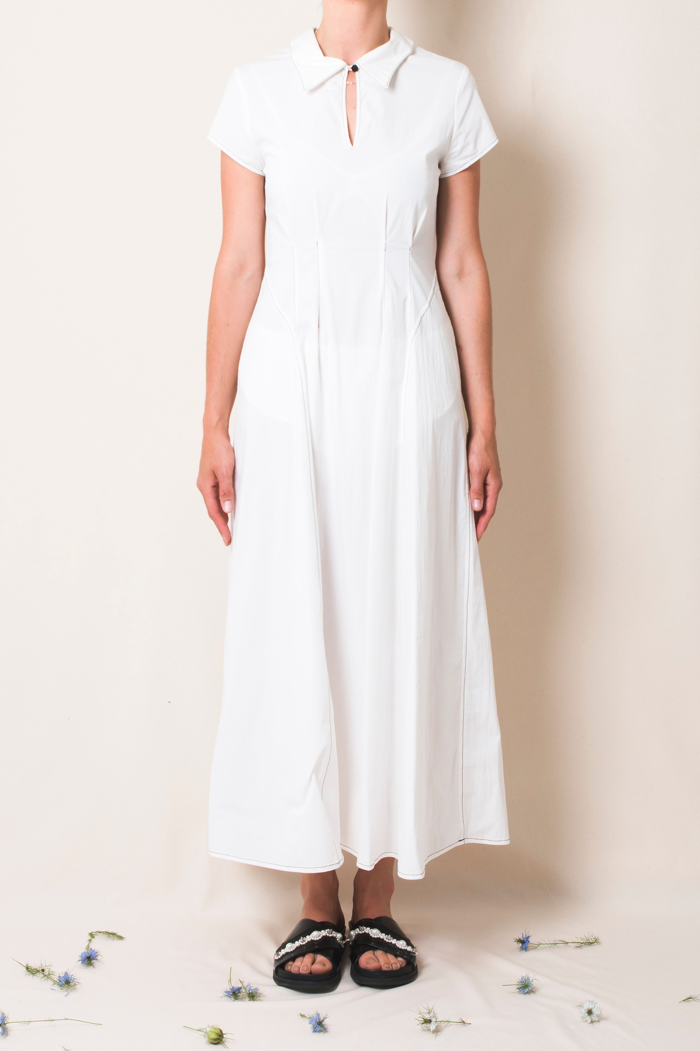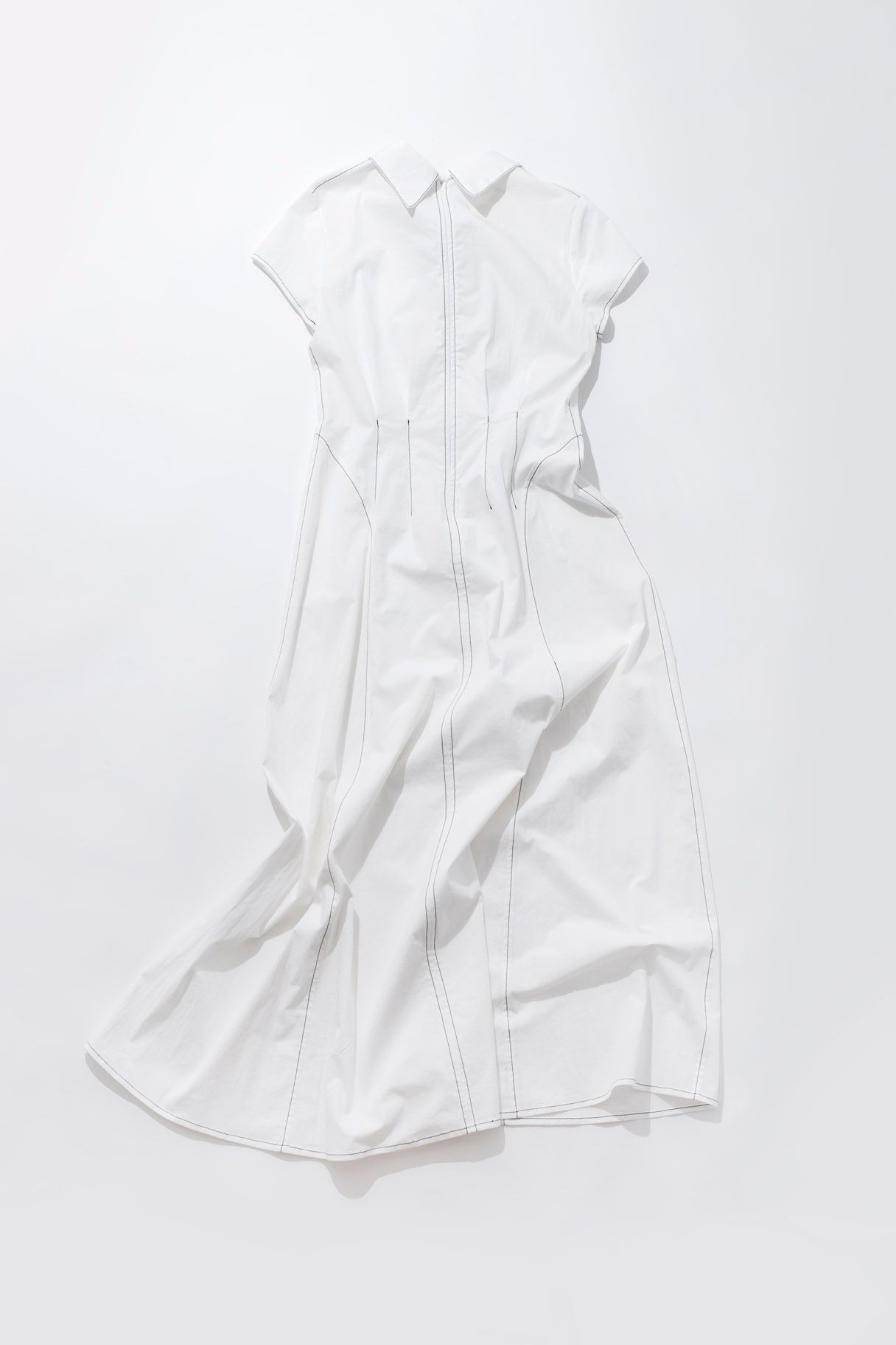 Contrast stitching Keyhole detail with button at top neck Invisible zip up the center back Darts at the waist for shape Cap sleeves Made in Aotearoa