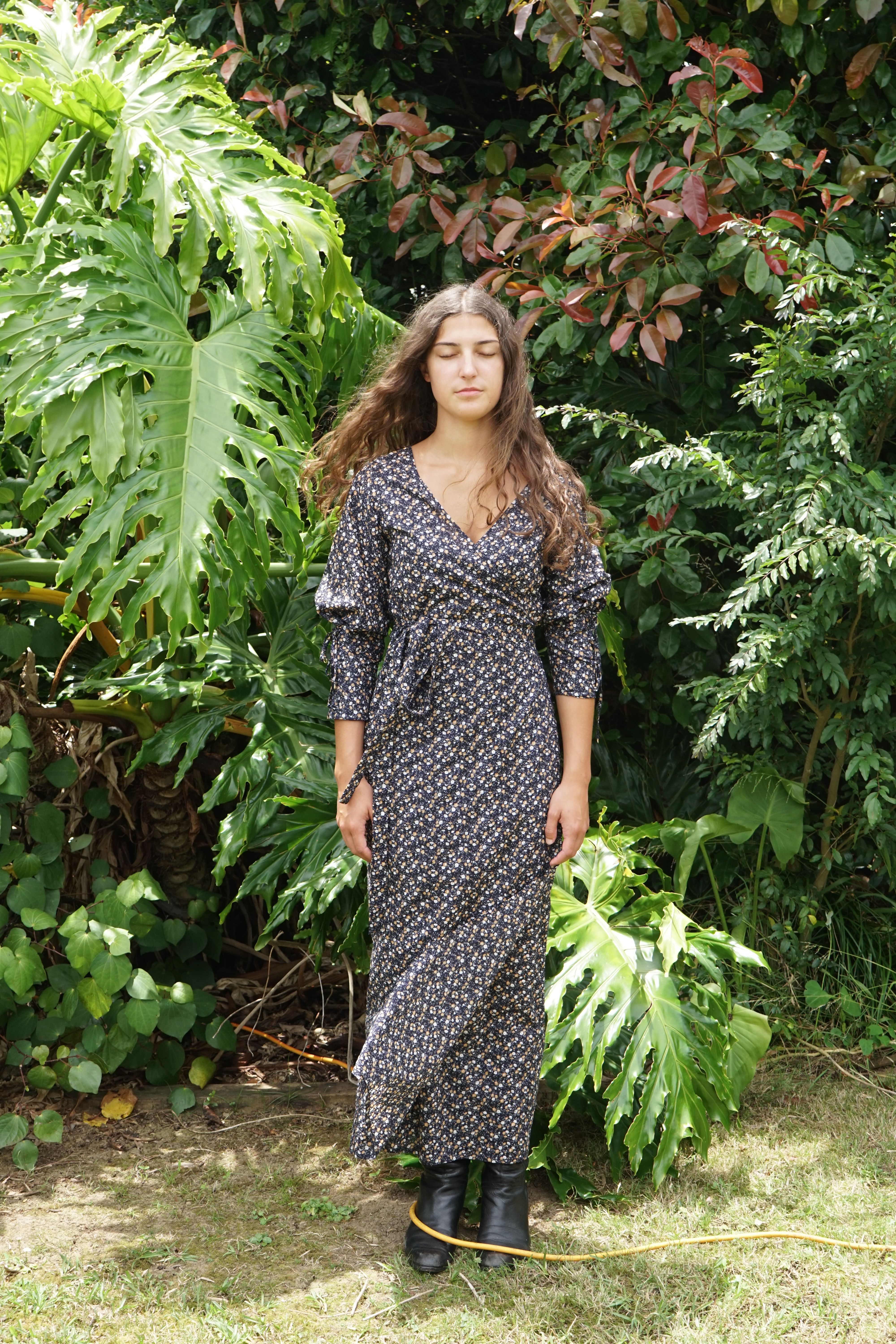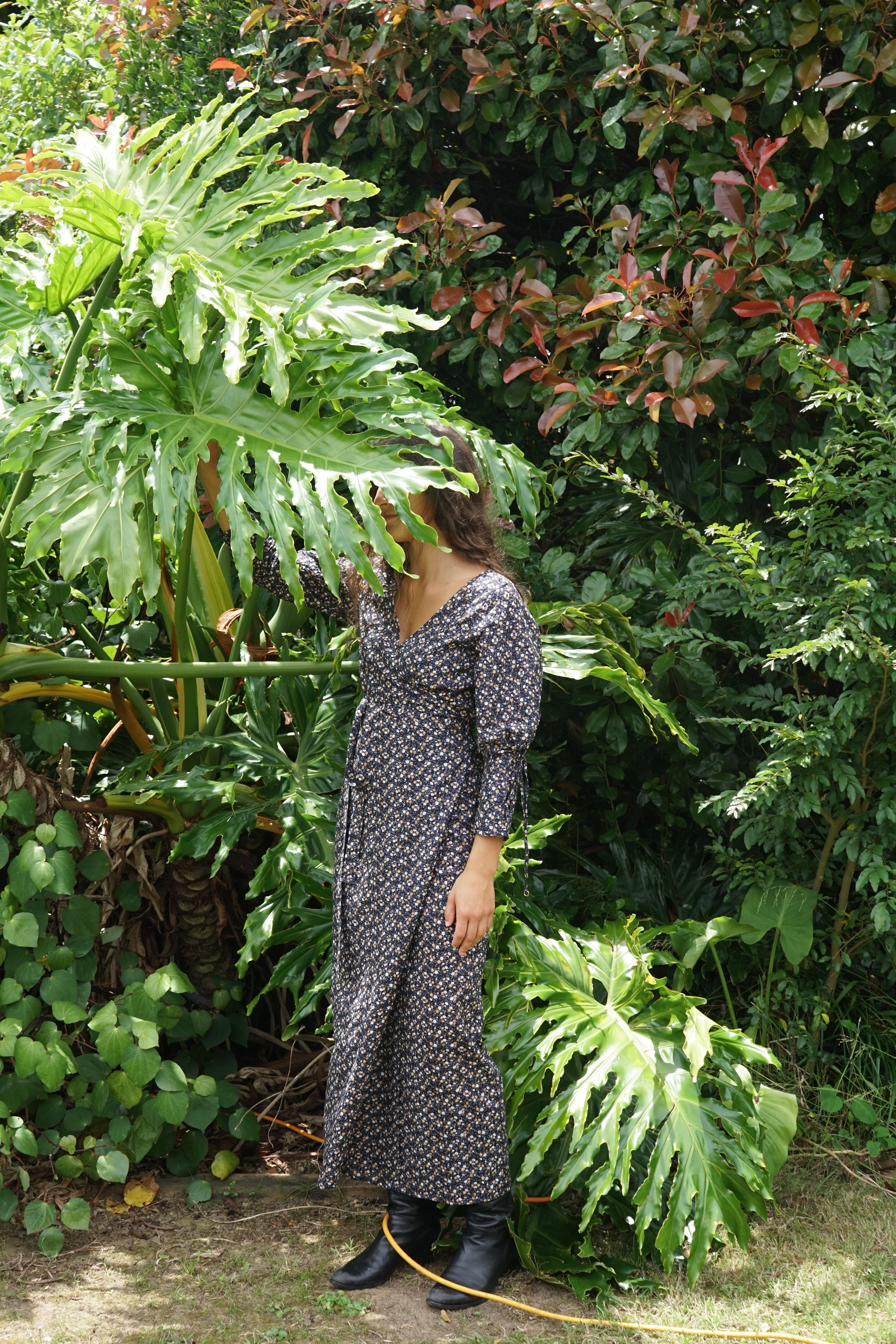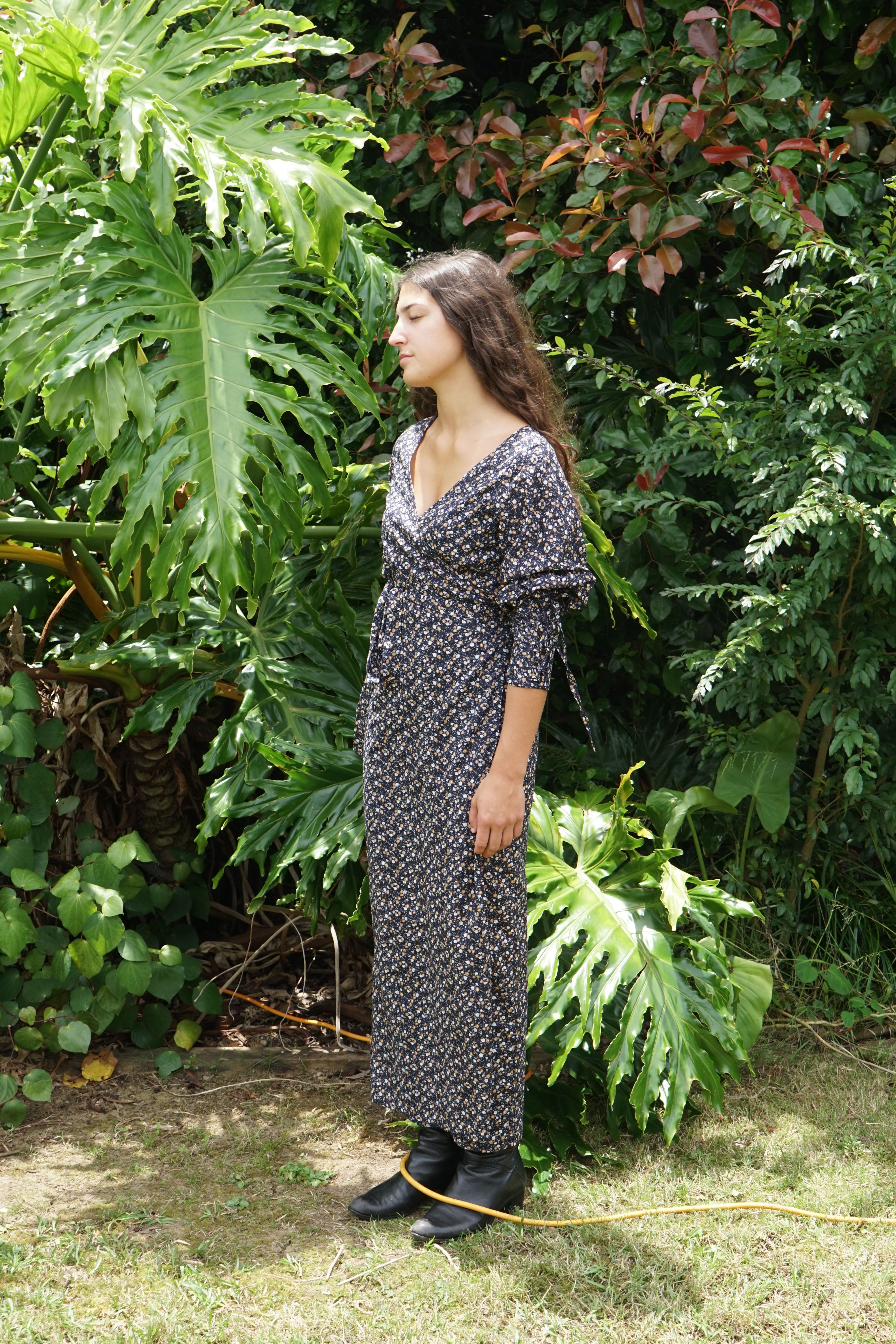 An elegant full length wrap dress made from 100% Japanese waffle cotton. Ties at waist and features a beautiful lace up detailed sleeve.