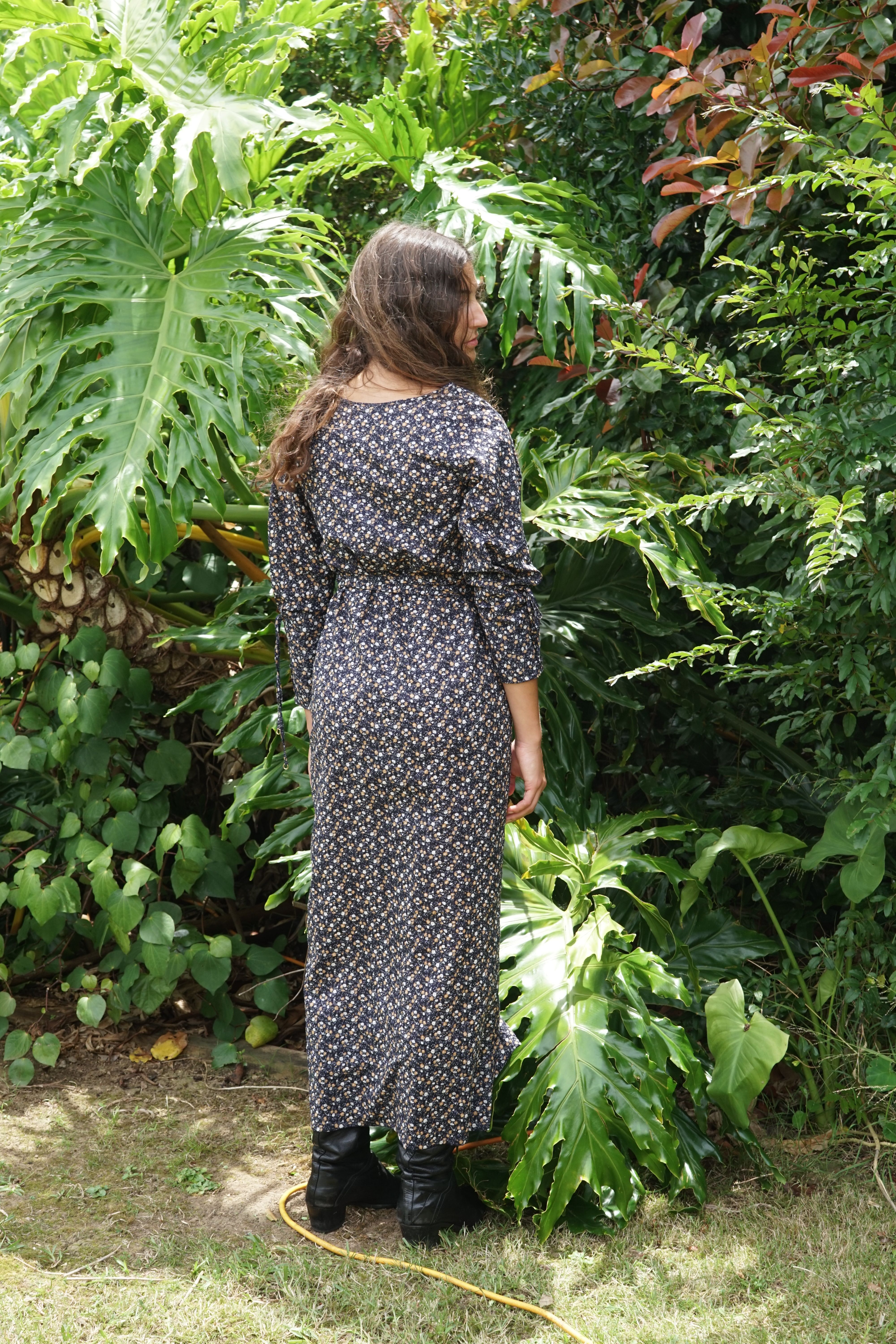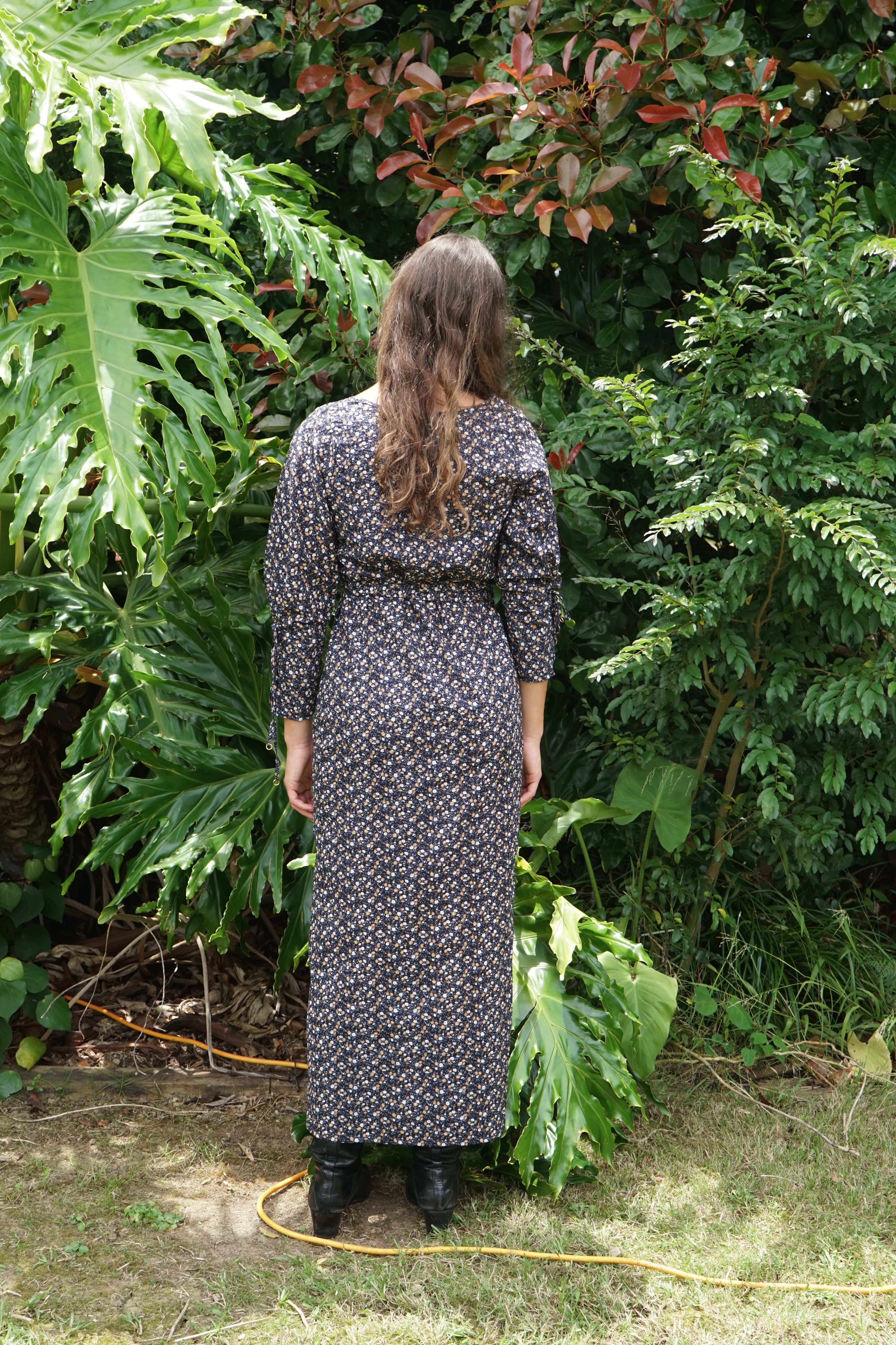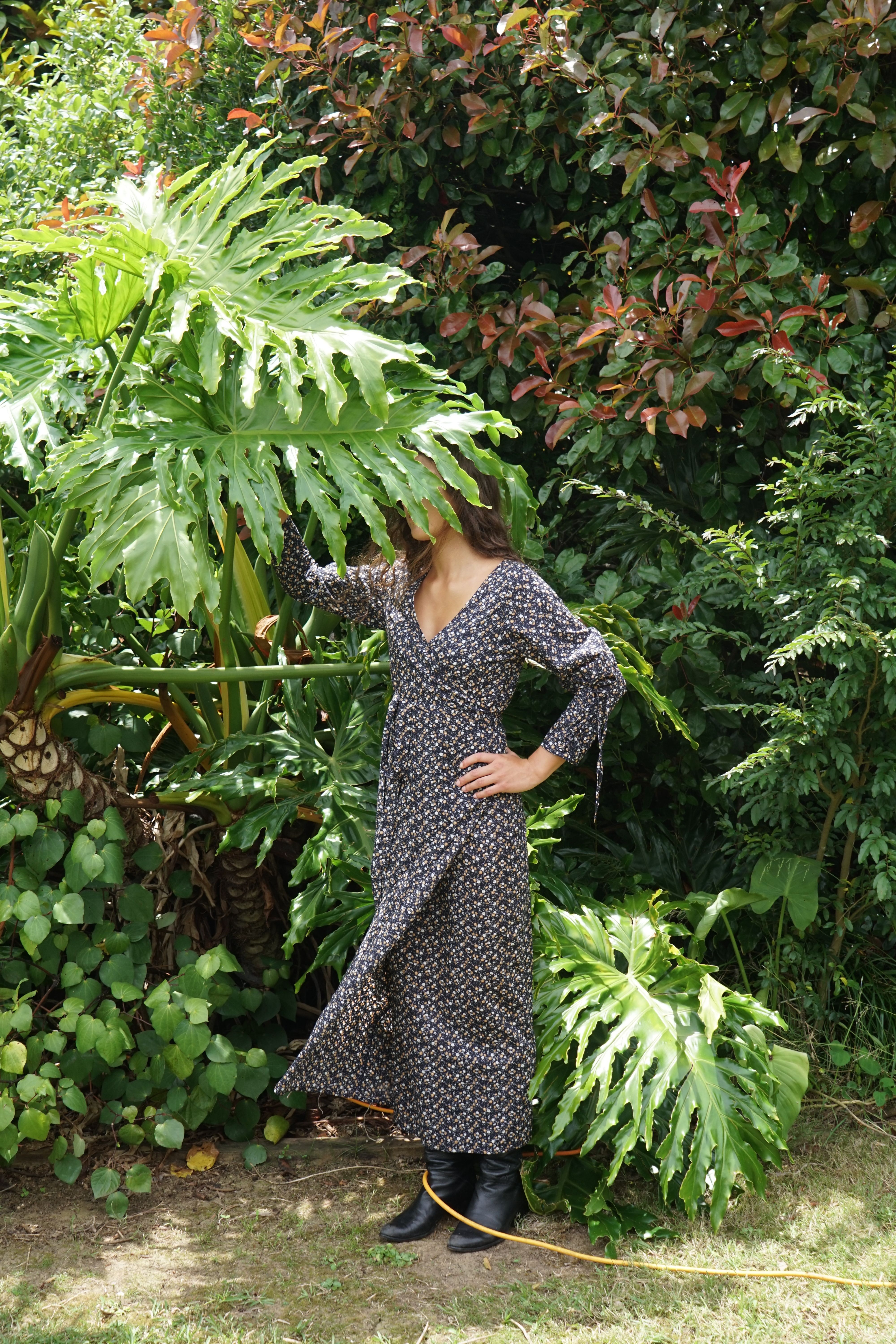 An elegant full length wrap dress made from 100% Japanese waffle cotton. Ties at waist and features a beautiful lace up detailed sleeve.