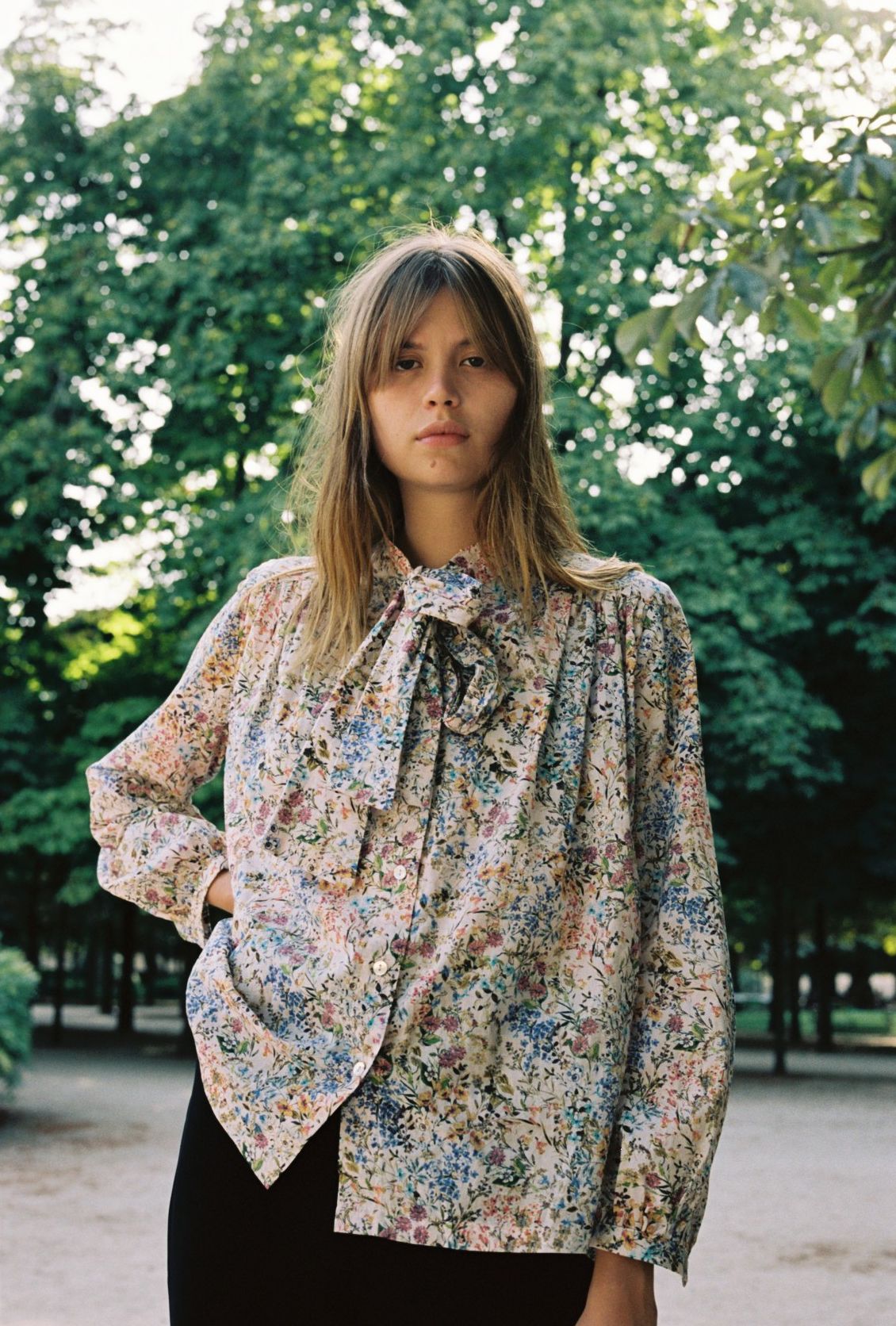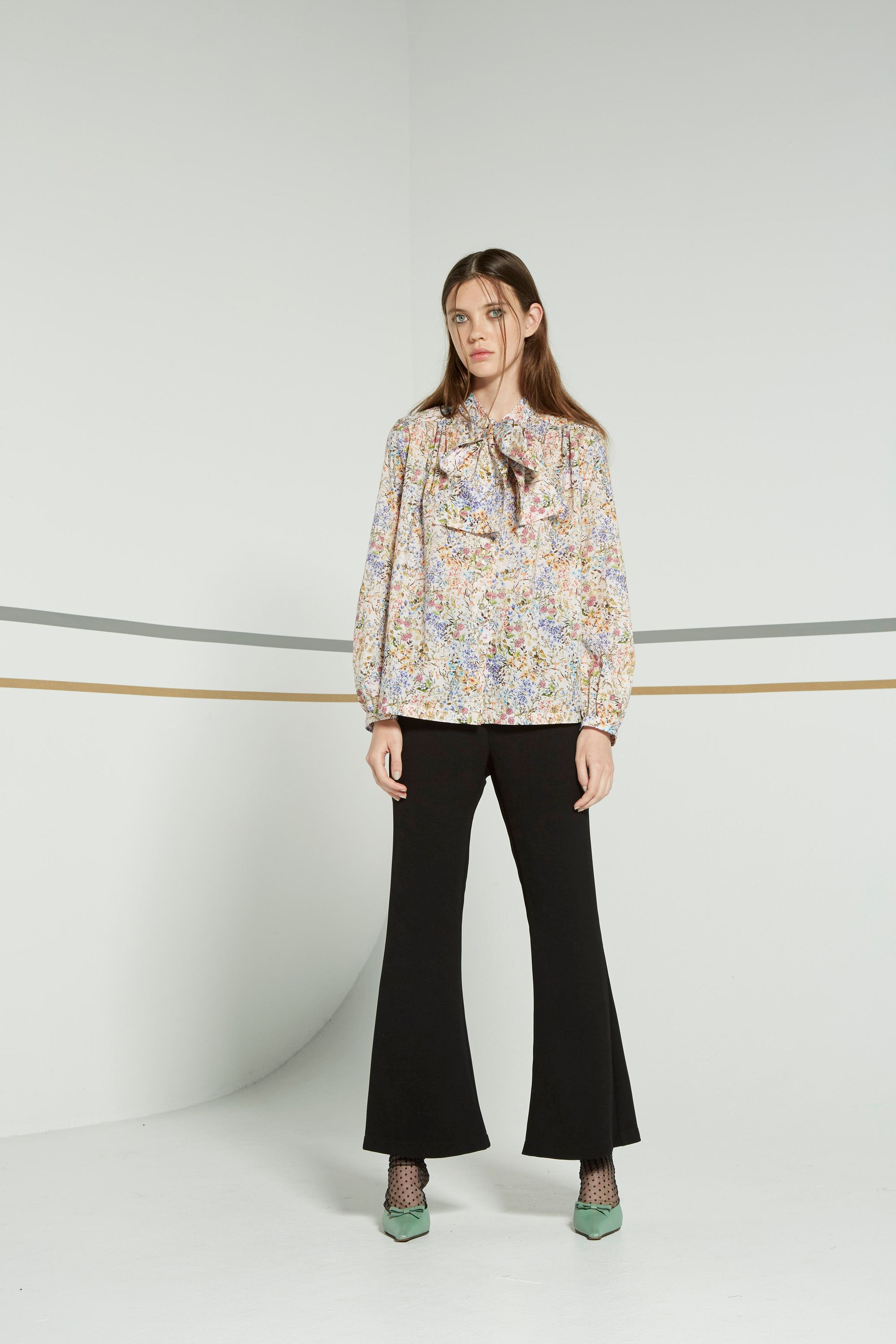 A gorgeous versatile blouse in a delicate summer floral print. Pussy bow at neckline followed by button-up fastening at centre front. Full length lightly billowed sleeve with gather at cuff. Gathering at shoulder. A truly special piece. Made in Aotearoa