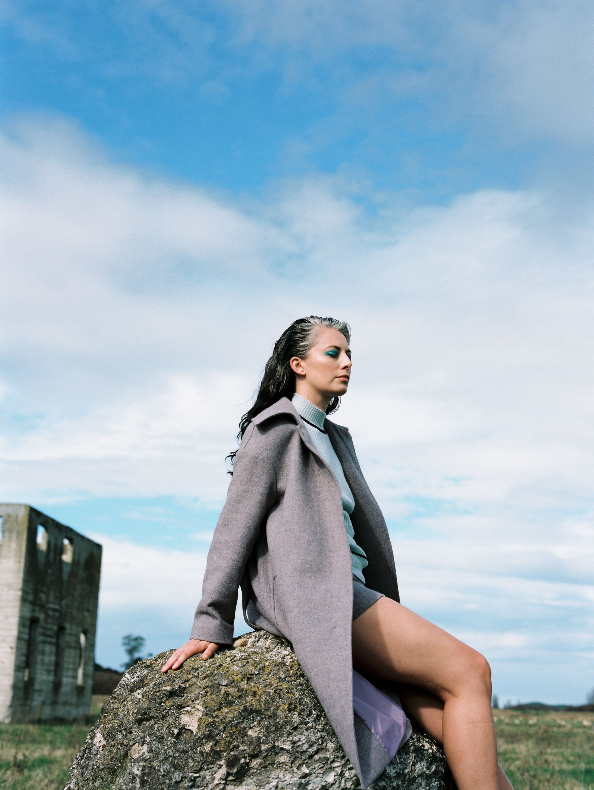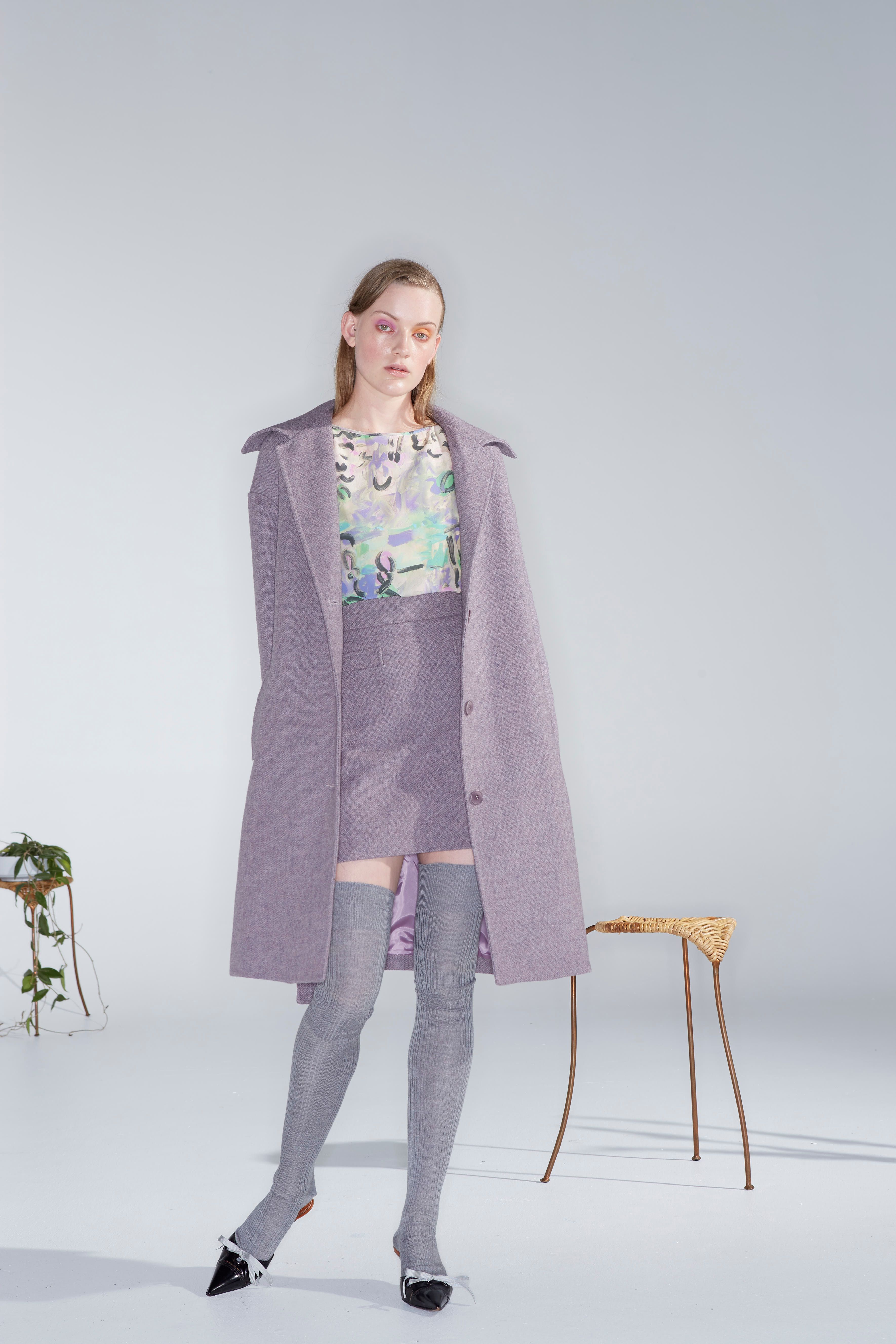 We have created the Cellini coat with wide back collar folding over shoulders, angled lapels that lead to two buttons at waist.