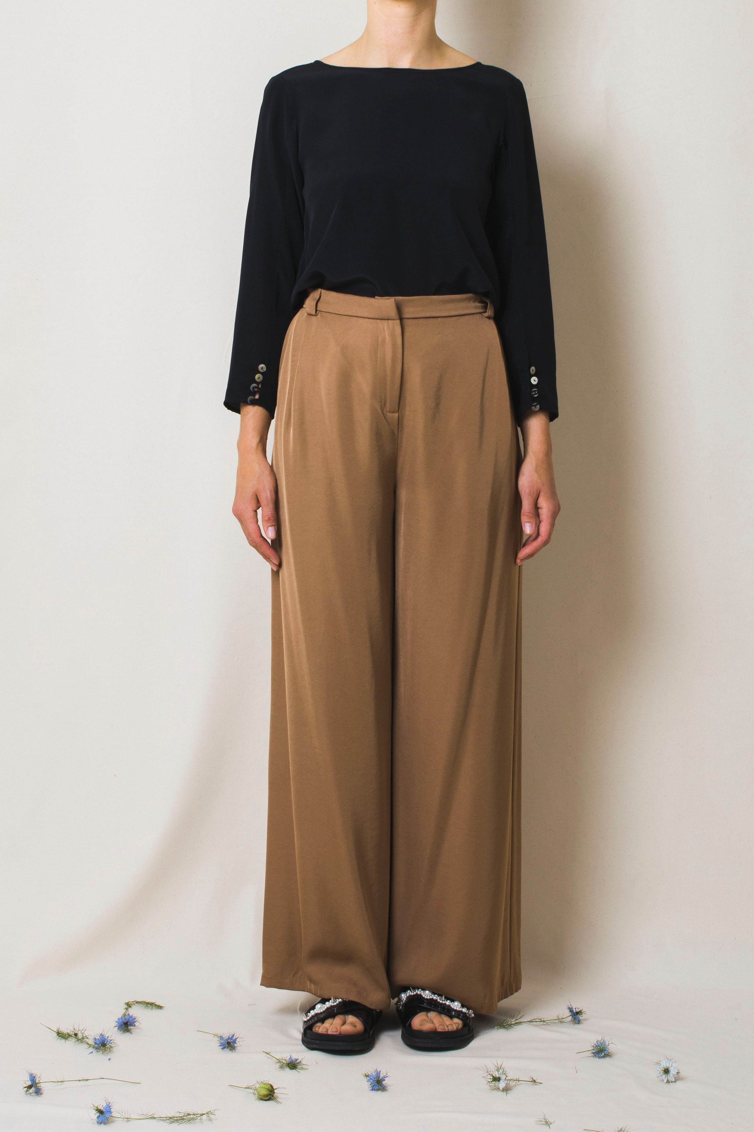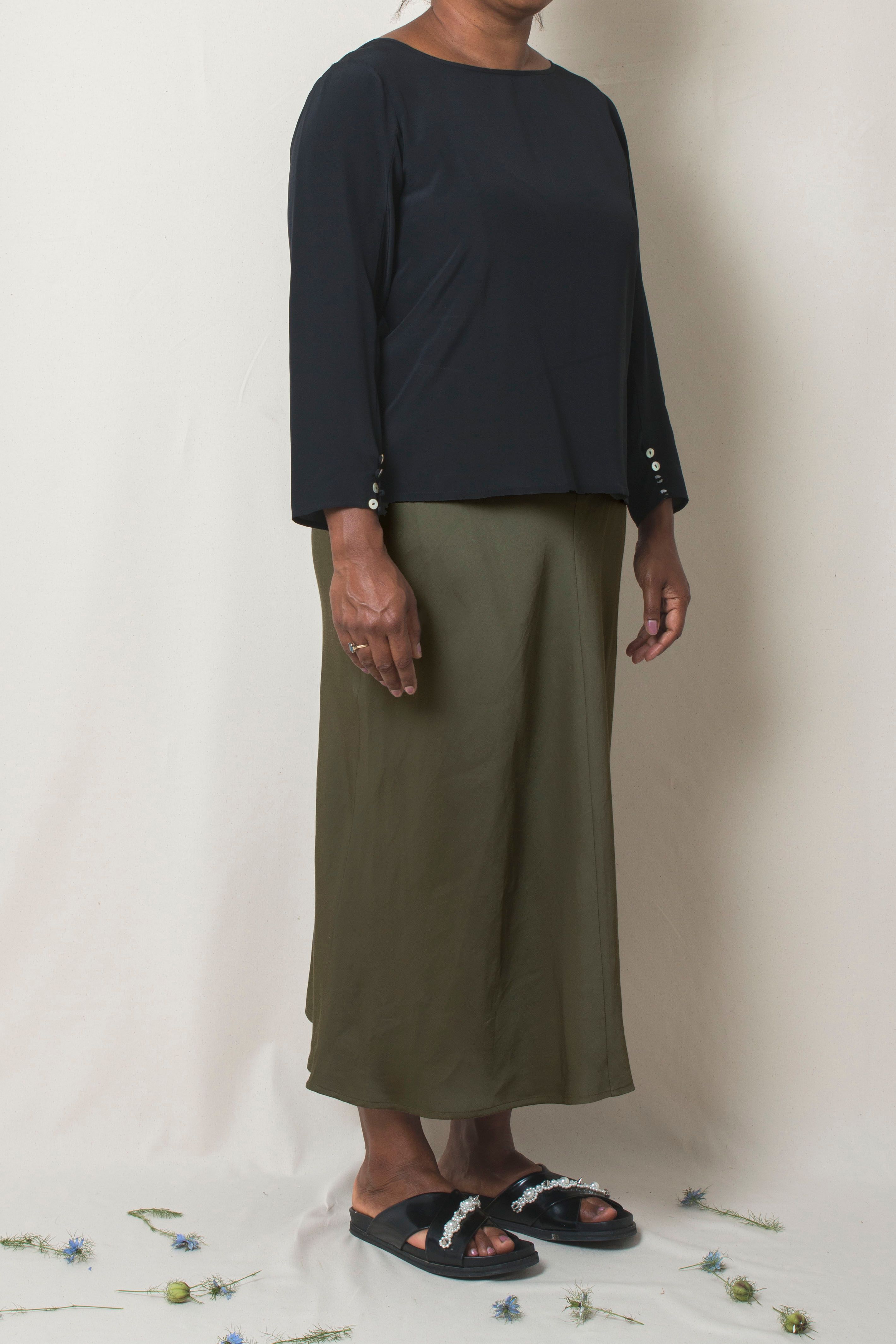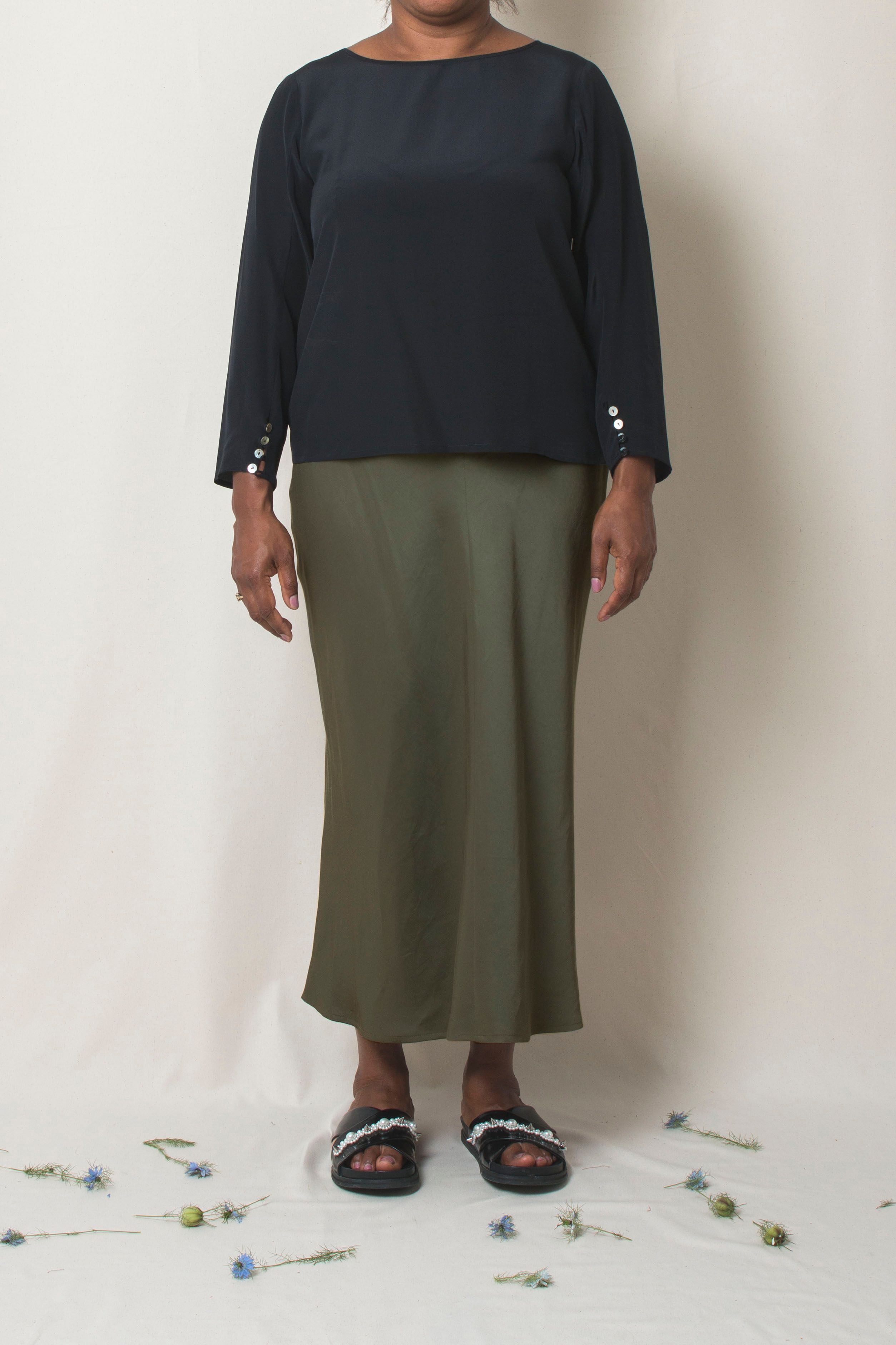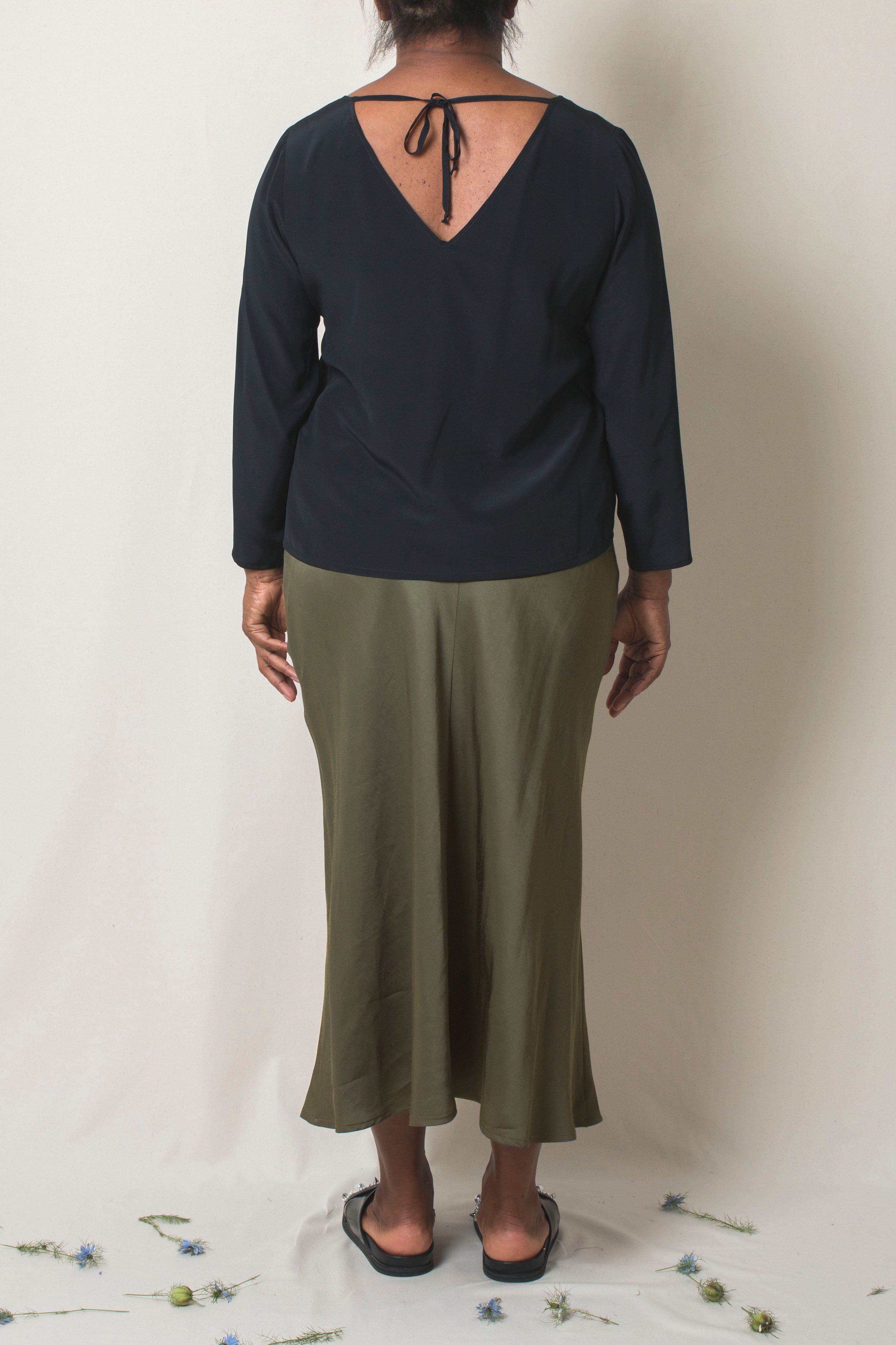 V-back detail with a tie across shoulders Sleeves finish below the elbow Button details on the sleeve Hem falls to the hip